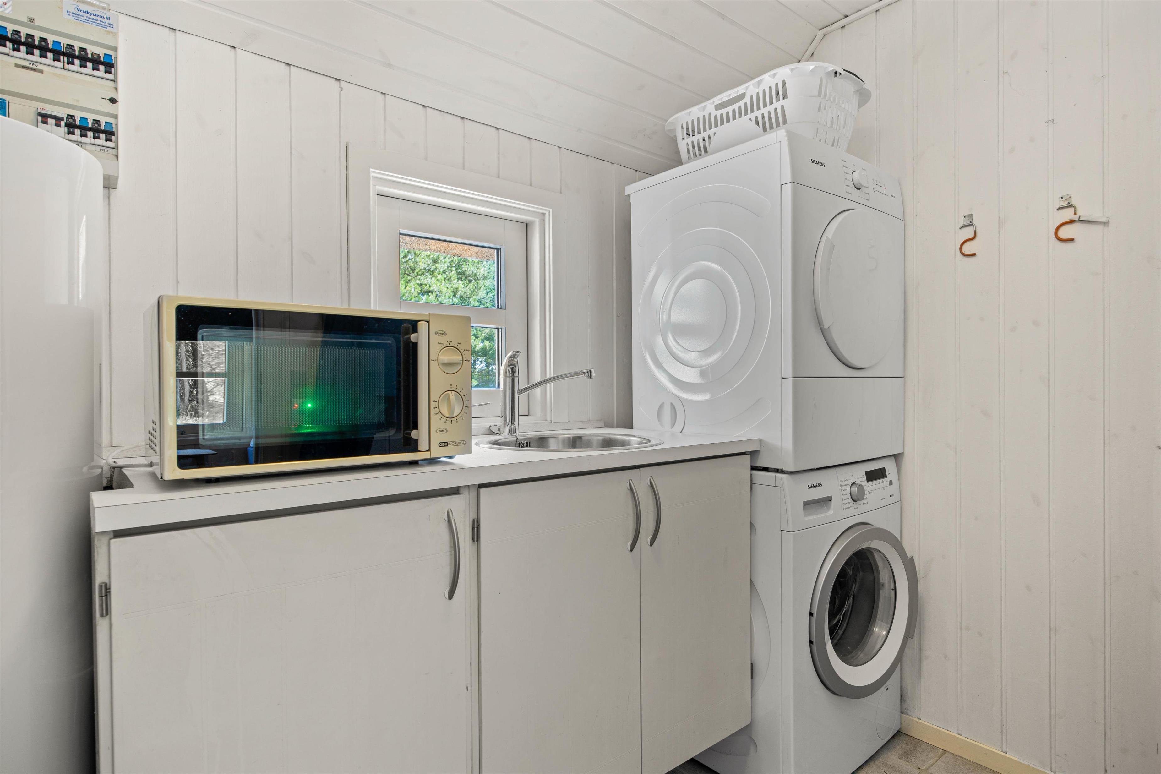 Der er også et bryggers med både vaskemaskine og tørretumbler samt en mikroovn. Et lille sparetip: Brug sommerhusets miljøvenlige og energibesparende varmepumpe.