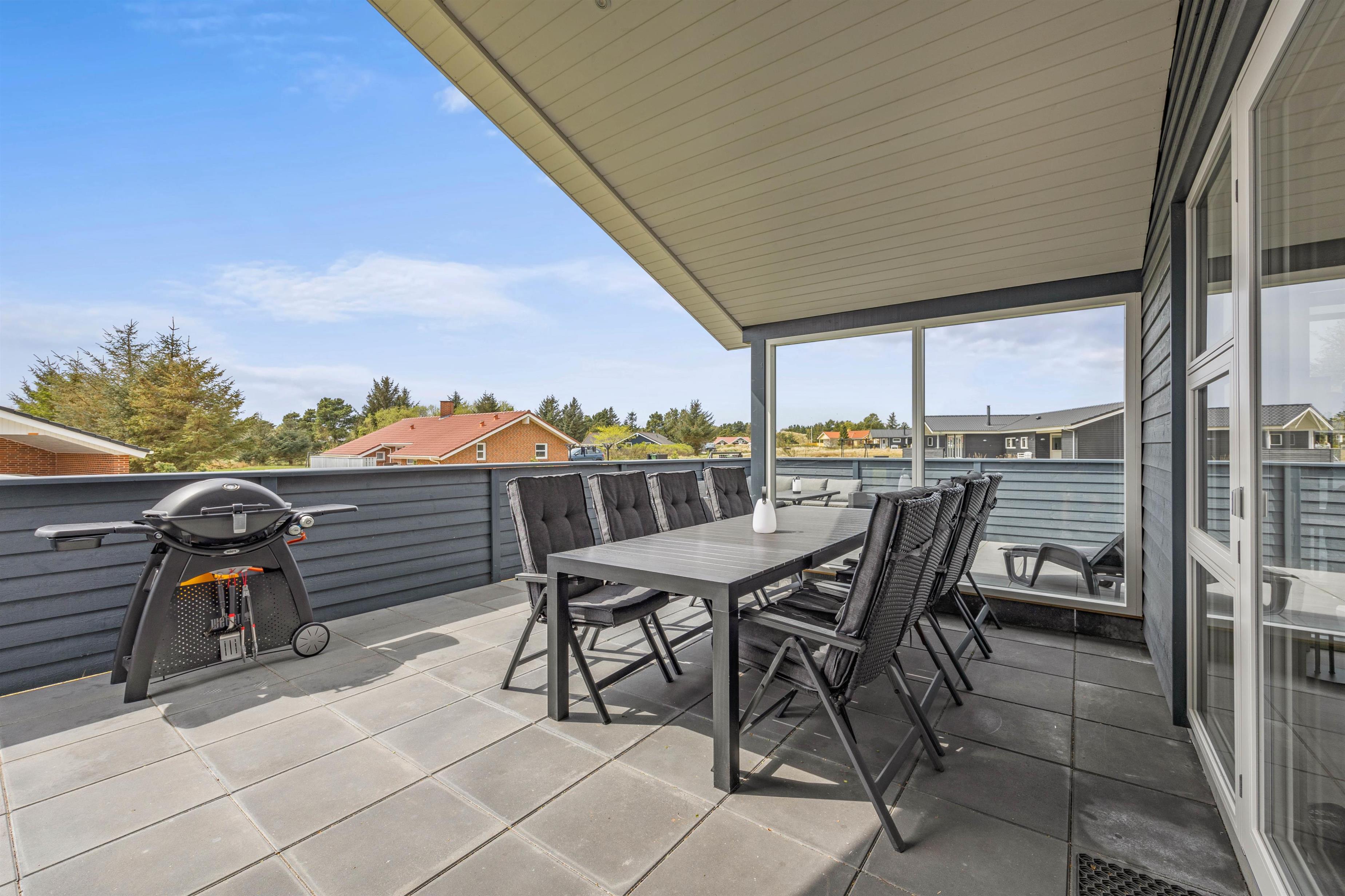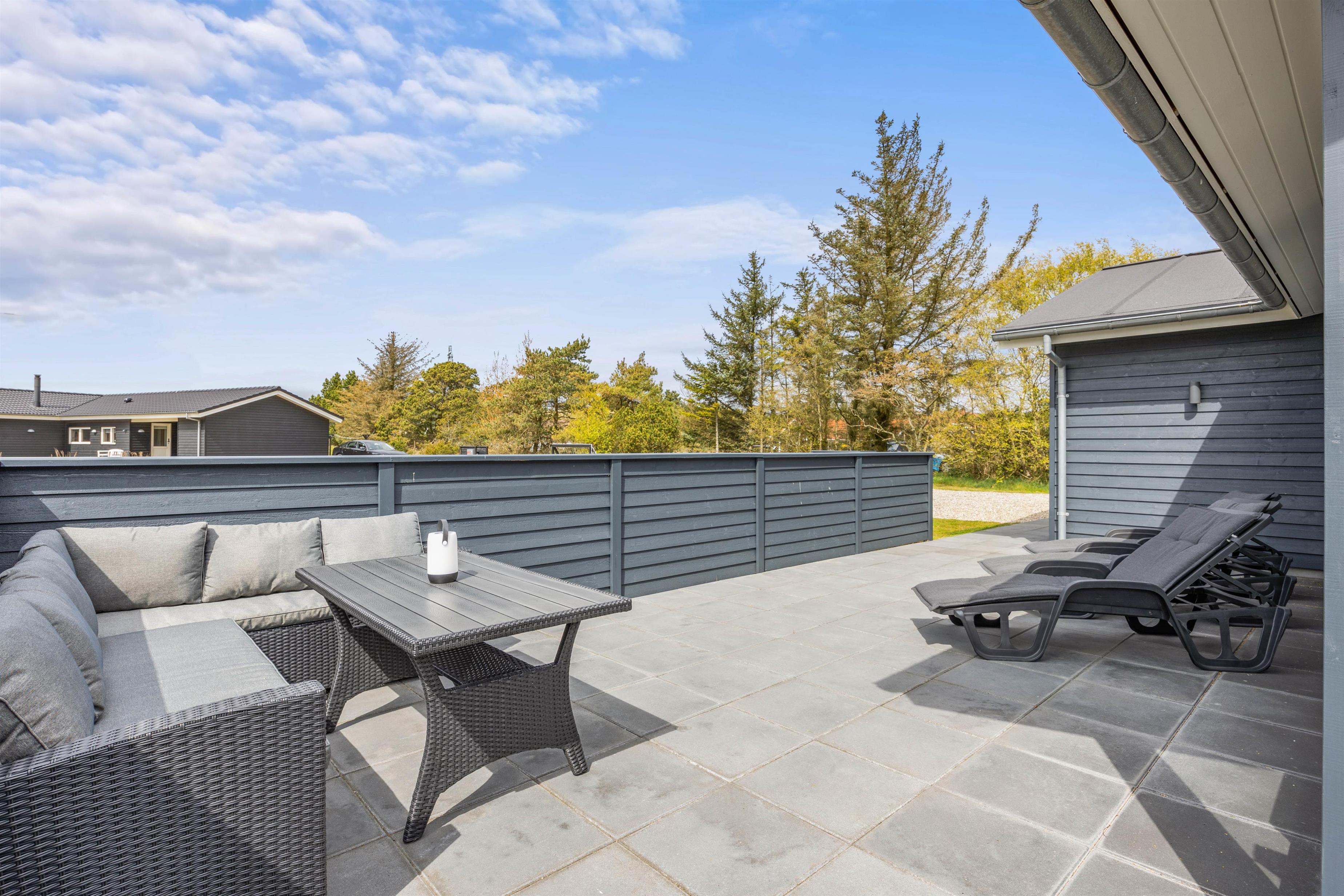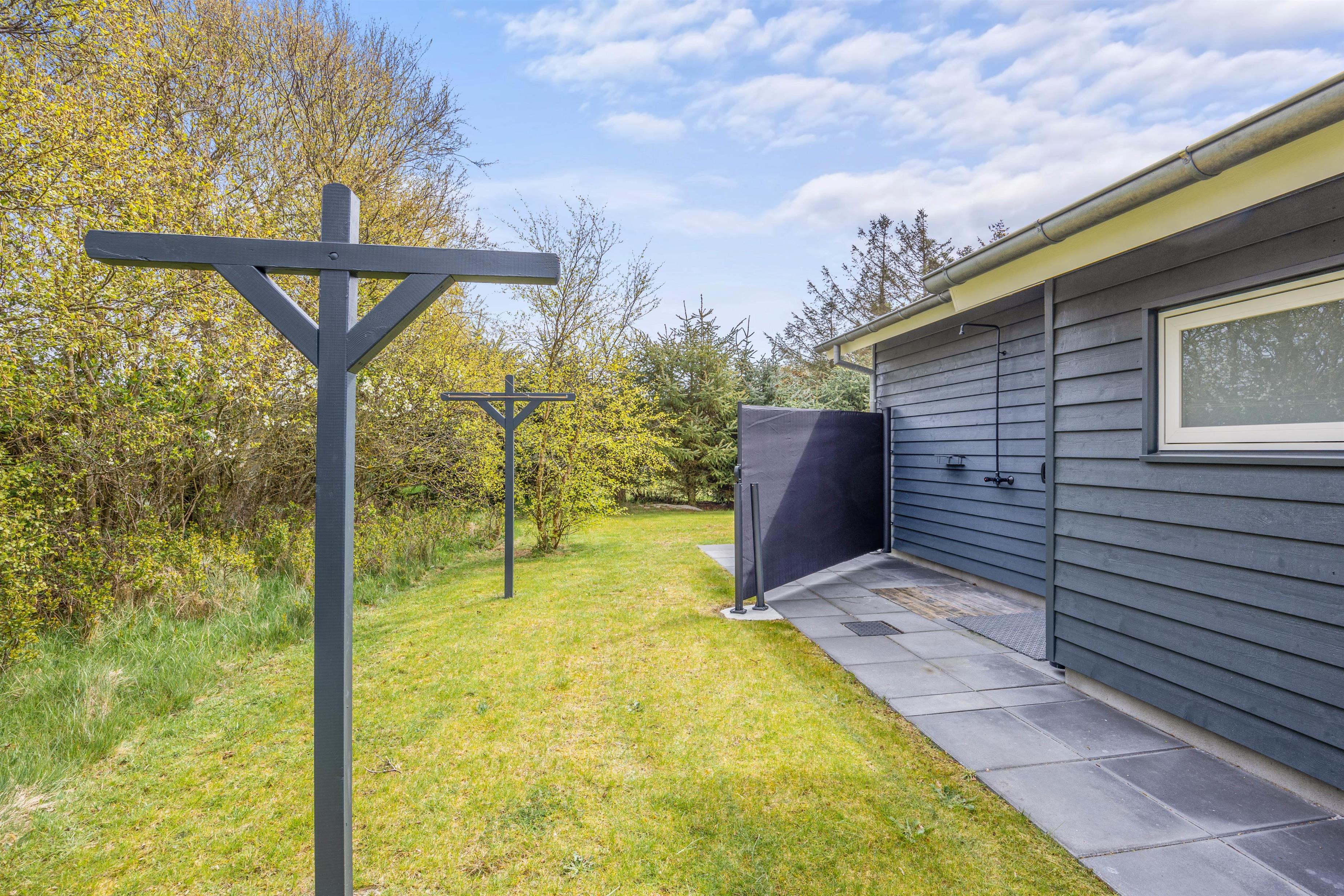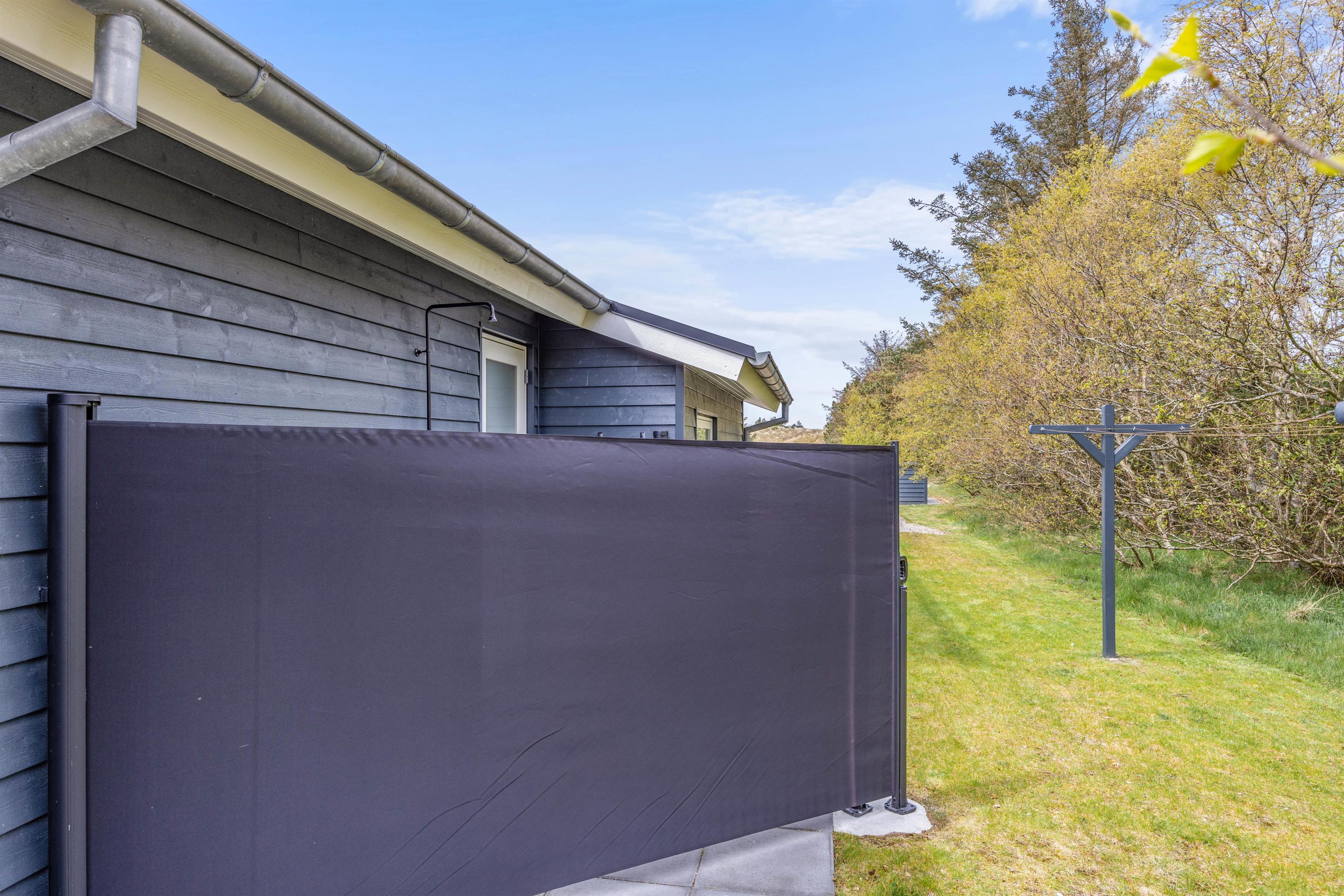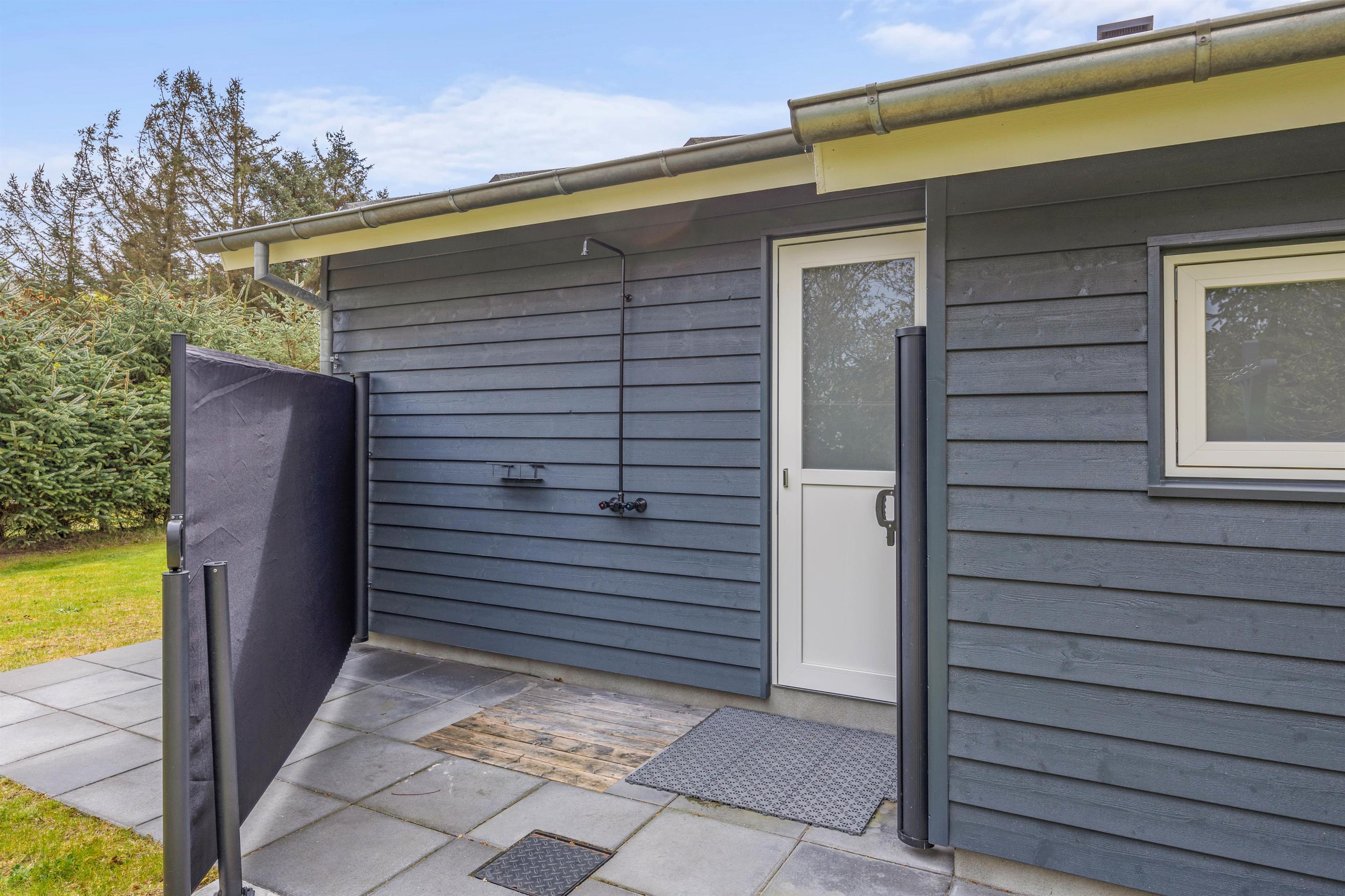 Med til det femstjernede feriehus hører også et skønt uderum med alsidige terrassemuligheder. Terrassen har både en afskærmet, overdækket og åben del, så der er noget for enhver smag, når de solrige dage skal nydes udenfor. I sommerhalvåret står også udebruseren klar til en afskyldning.