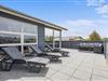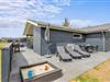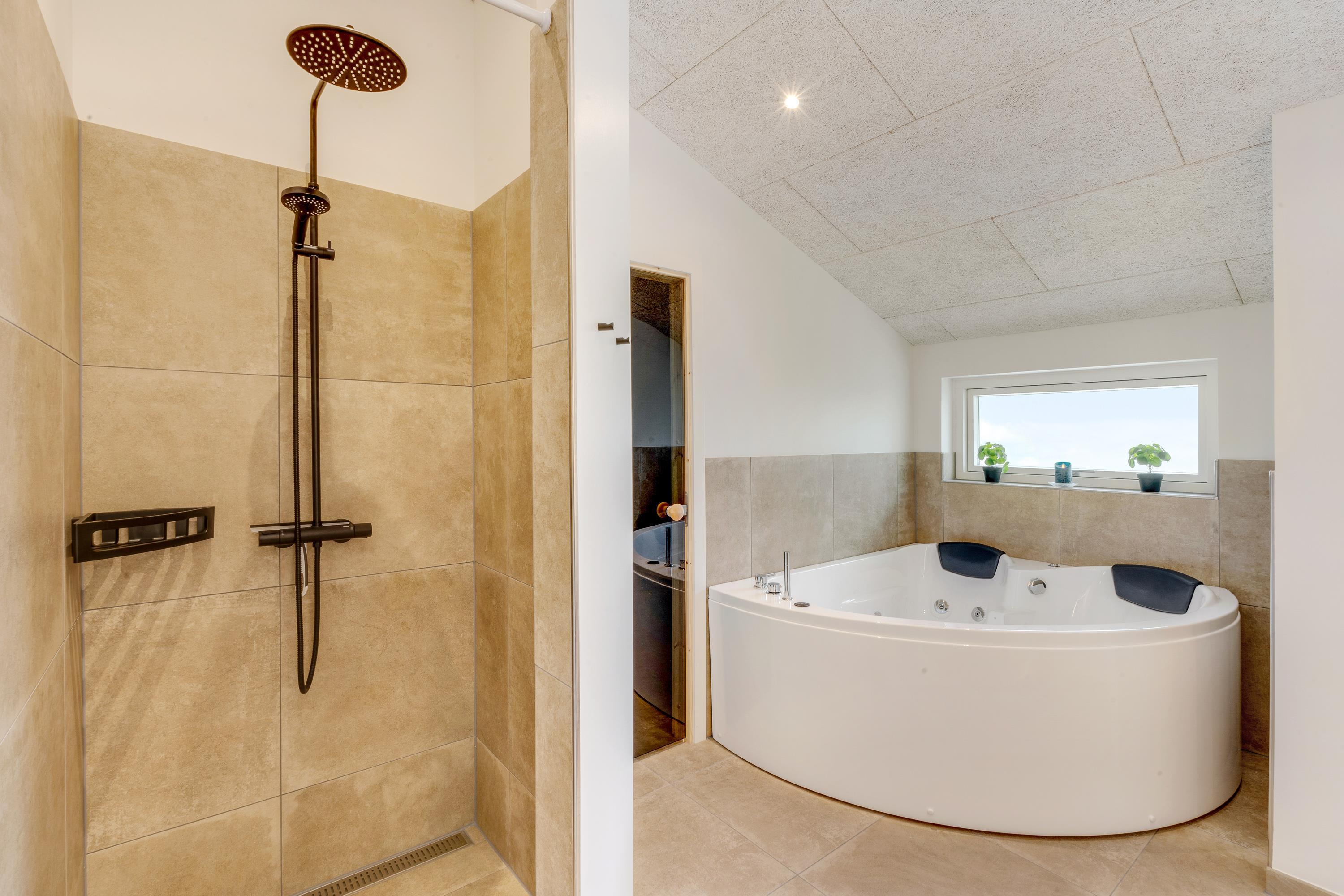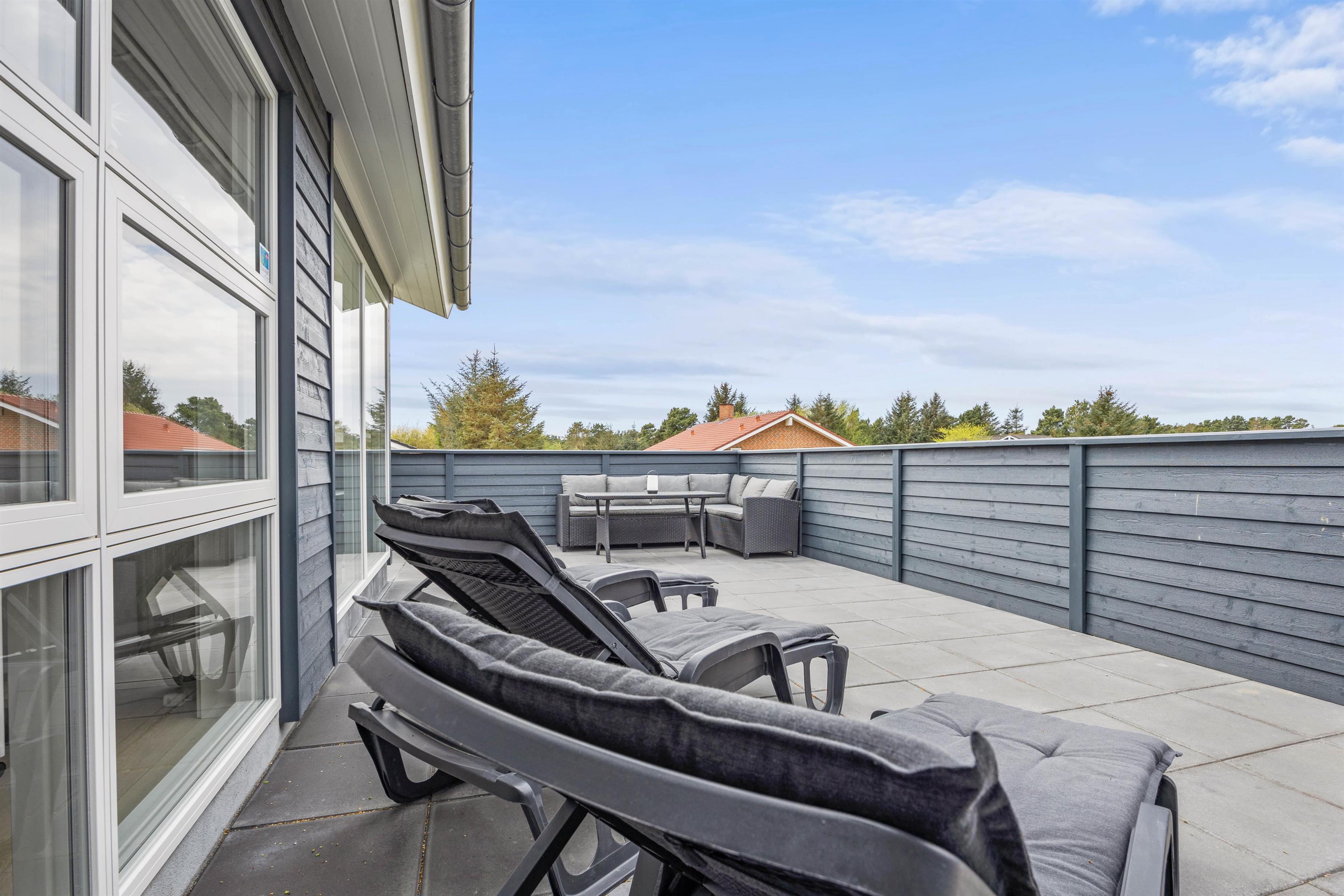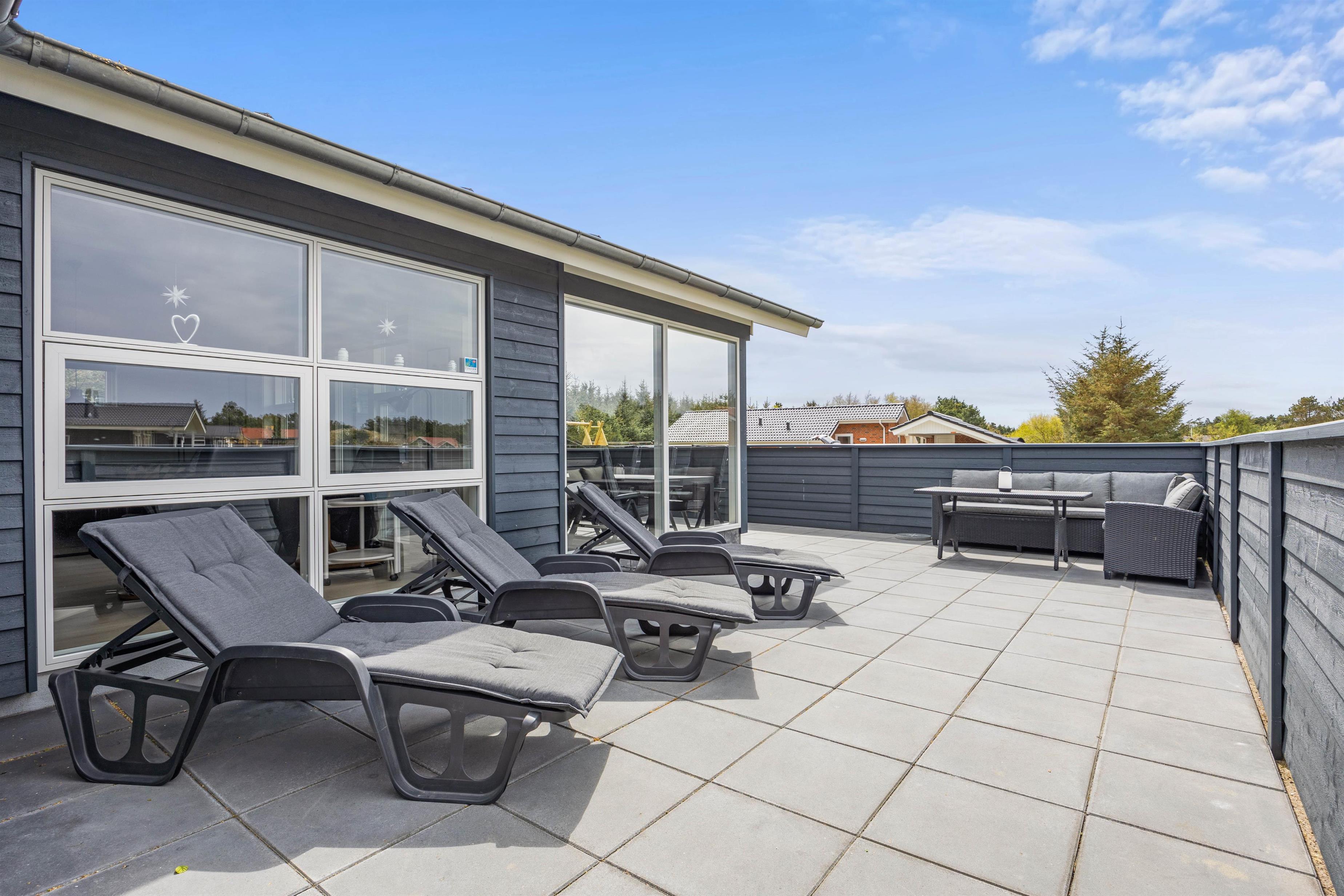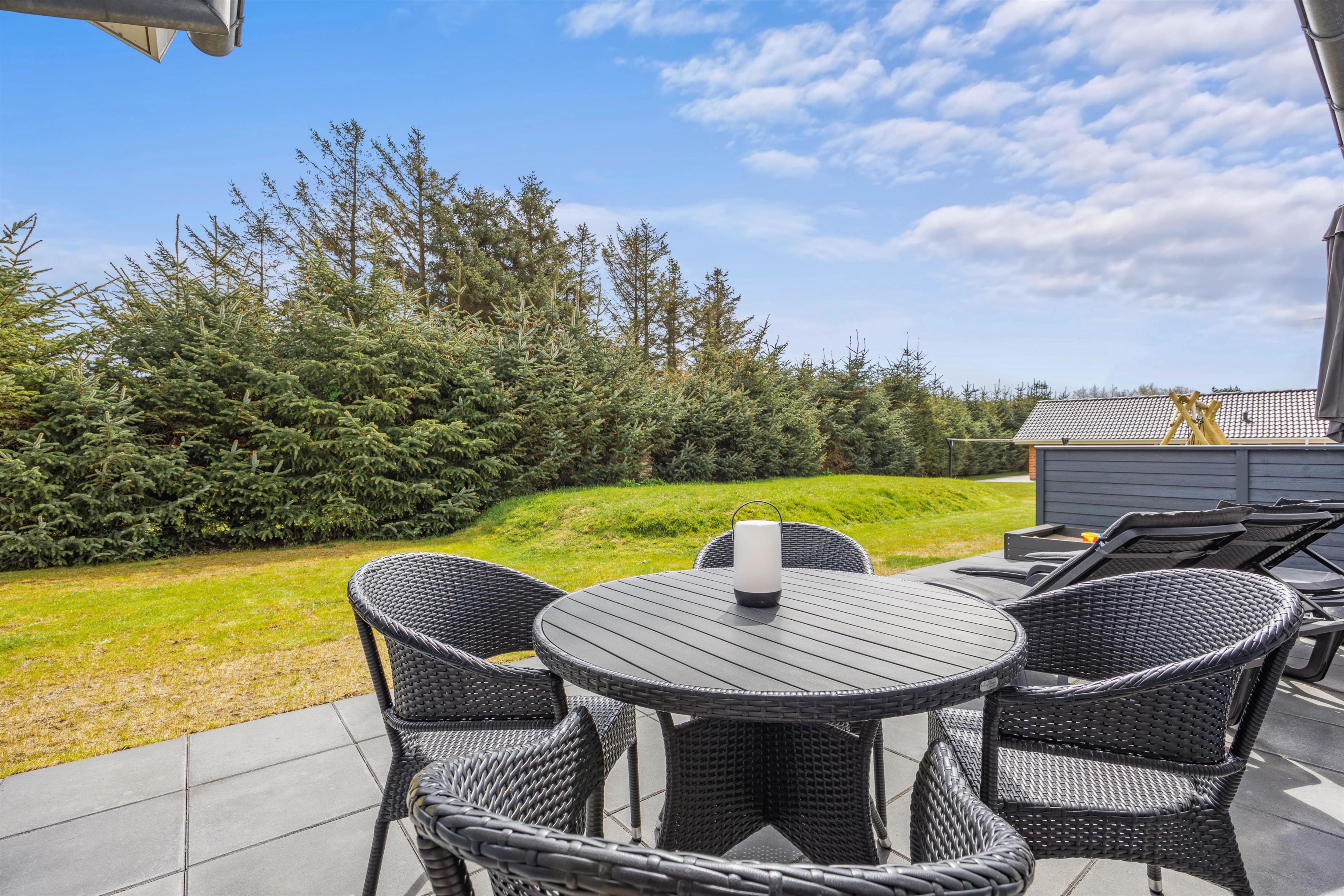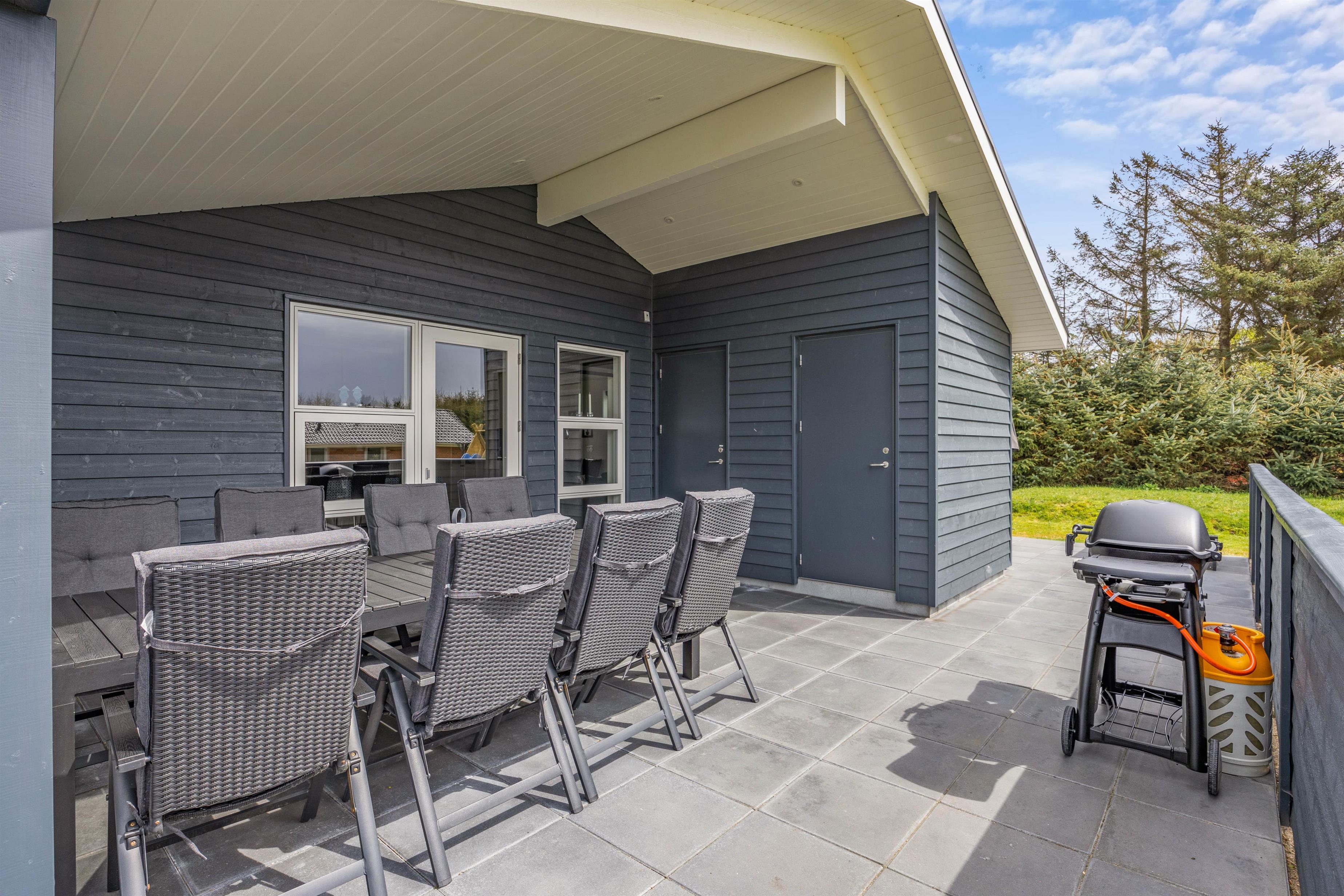 Med til det femstjernede feriehus hører også et skønt uderum med alsidige terrassemuligheder. Terrassen har både en afskærmet, overdækket og åben del, så der er noget for enhver smag, når de solrige dage skal nydes udenfor. I sommerhalvåret står også udebruseren klar til en afskyldning.