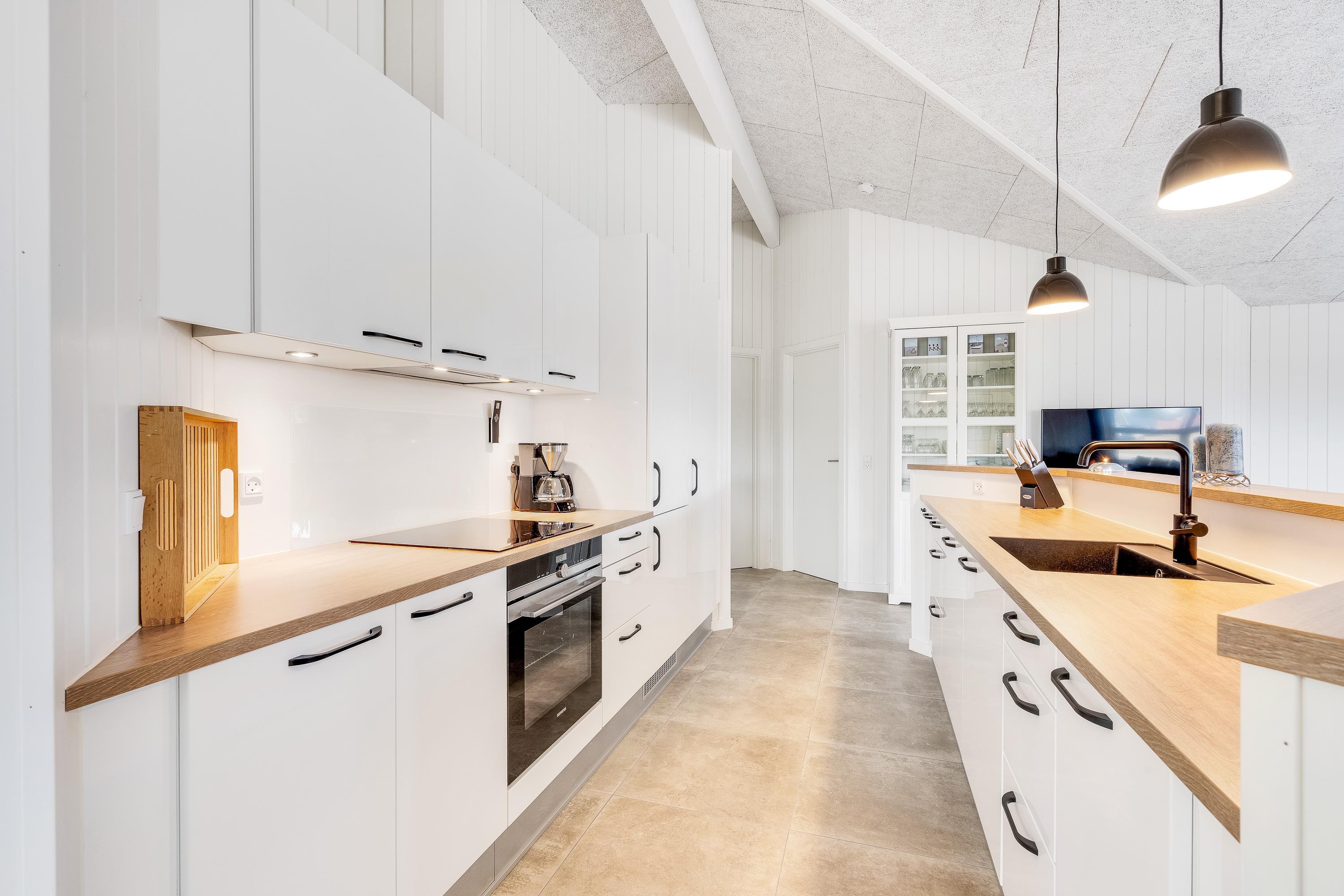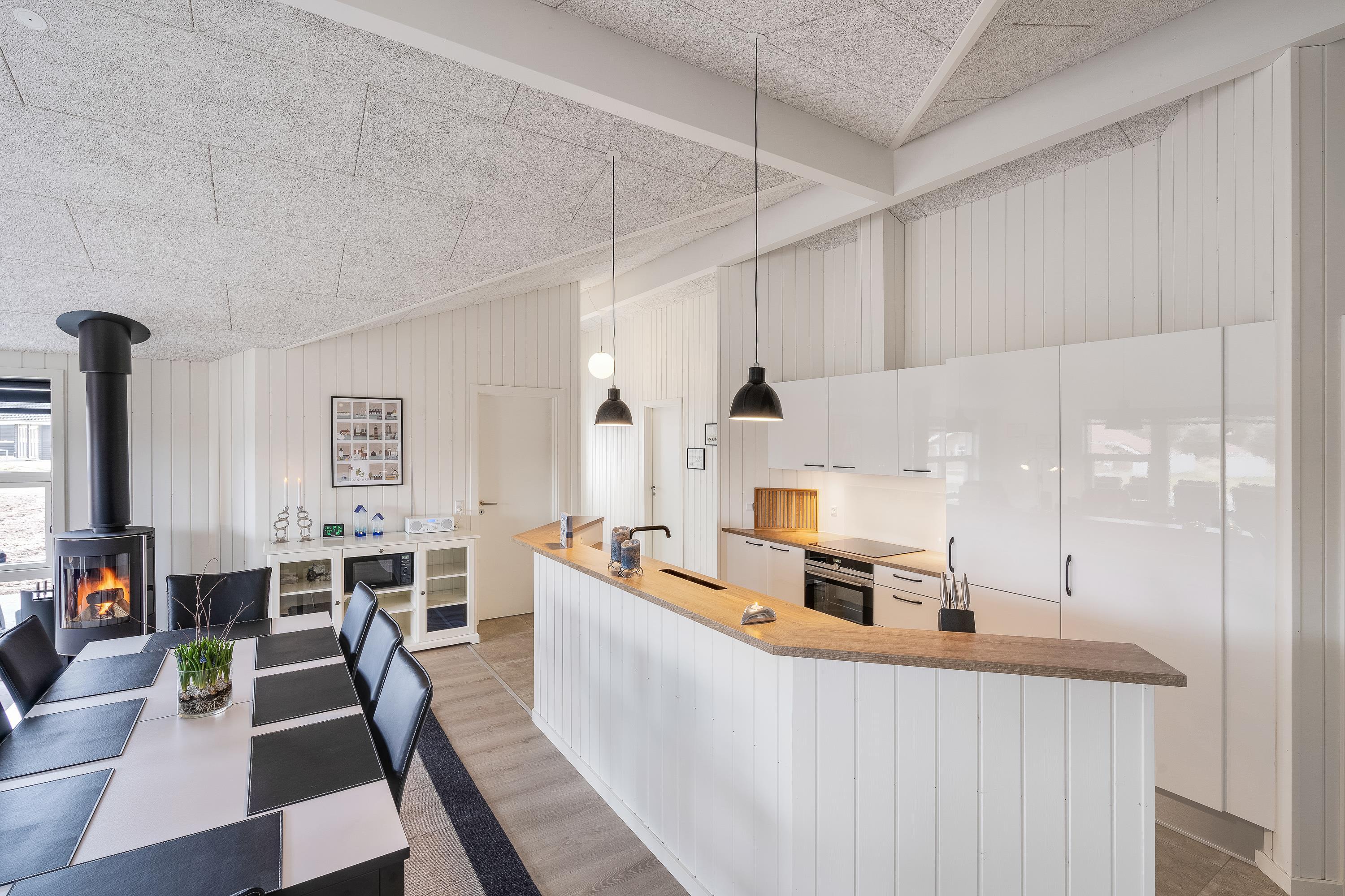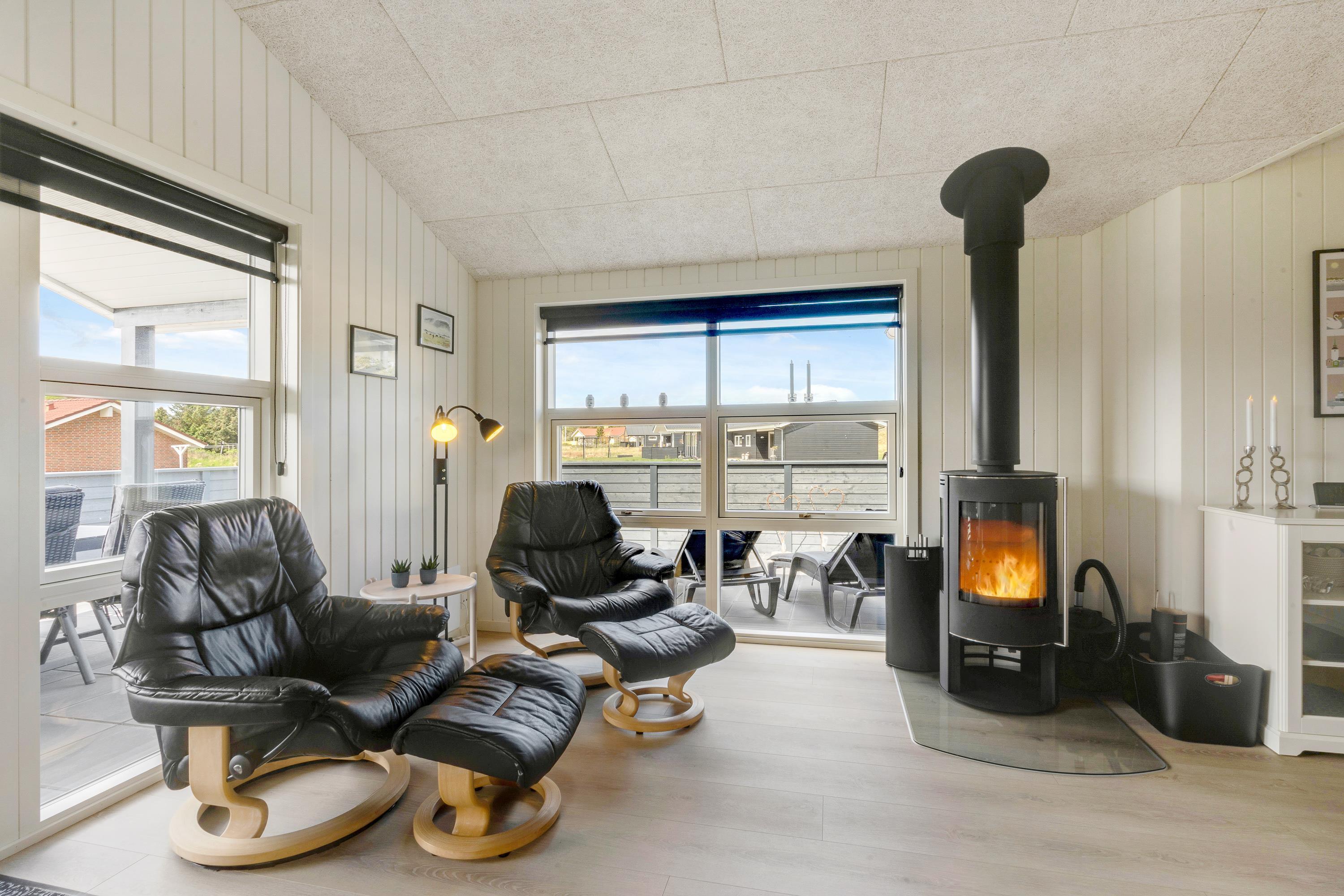 Der er altid en behagelig temperatur i sommerhuset, takket være den energivenlige varmepumpe. TV’et er udstyret med Chromecast, så I kan streame jeres yndlingsfilm og -serier, mens I slapper af på sofaen i skæret fra brændeovnens knitrende ild. Derudover er der en udendørs bruser, som kan benyttes fra 1. april til 31. oktober.