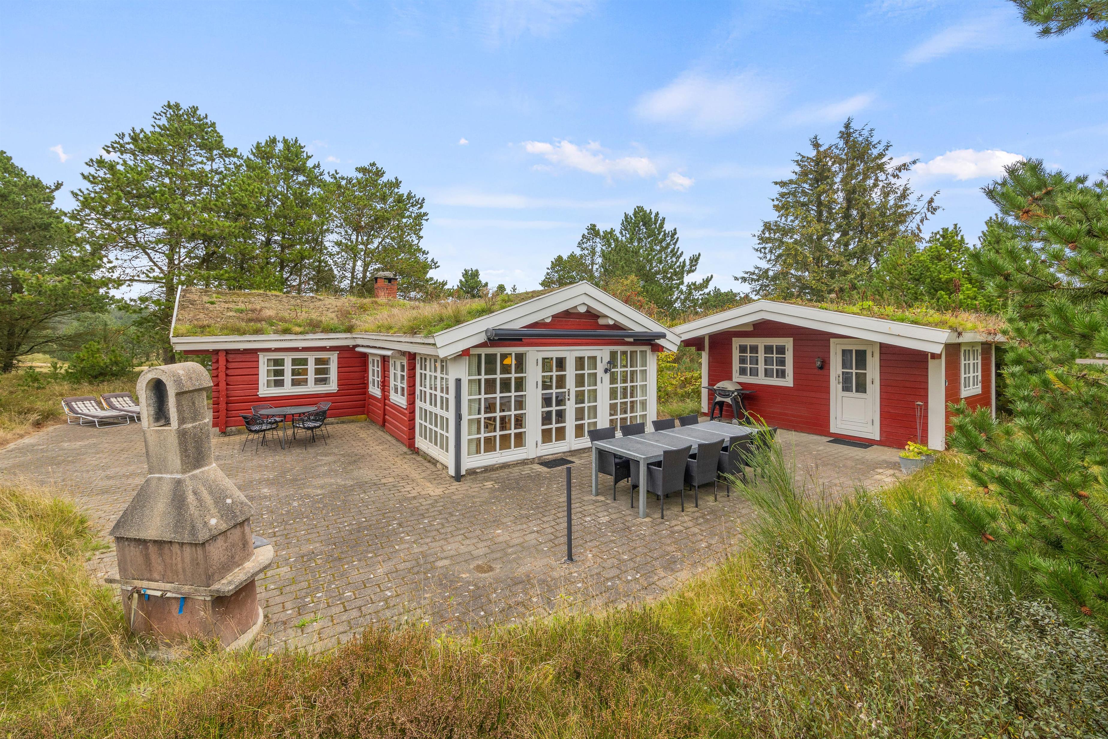 Det lille knaldrøde hus venter bare på, at store som små rykker ind og slapper af på den store naturgrund mellem træerne, hvor der er plads til, at alle kan boltre sig på græsset eller slappe af på terrassen.