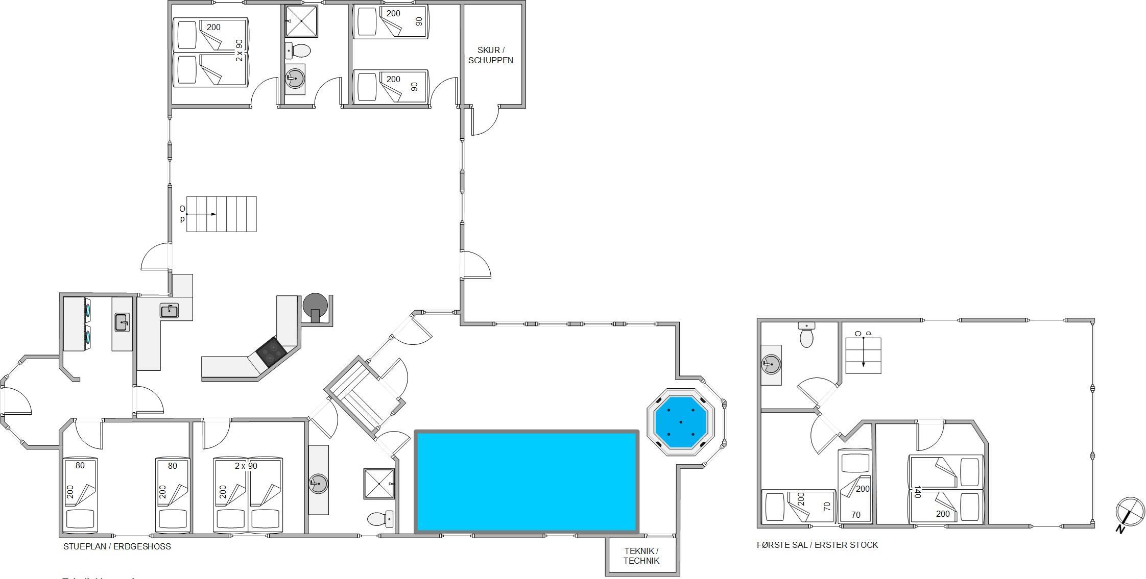 6 soveværelser, 2 badeværelser og 1 gæstetoilet