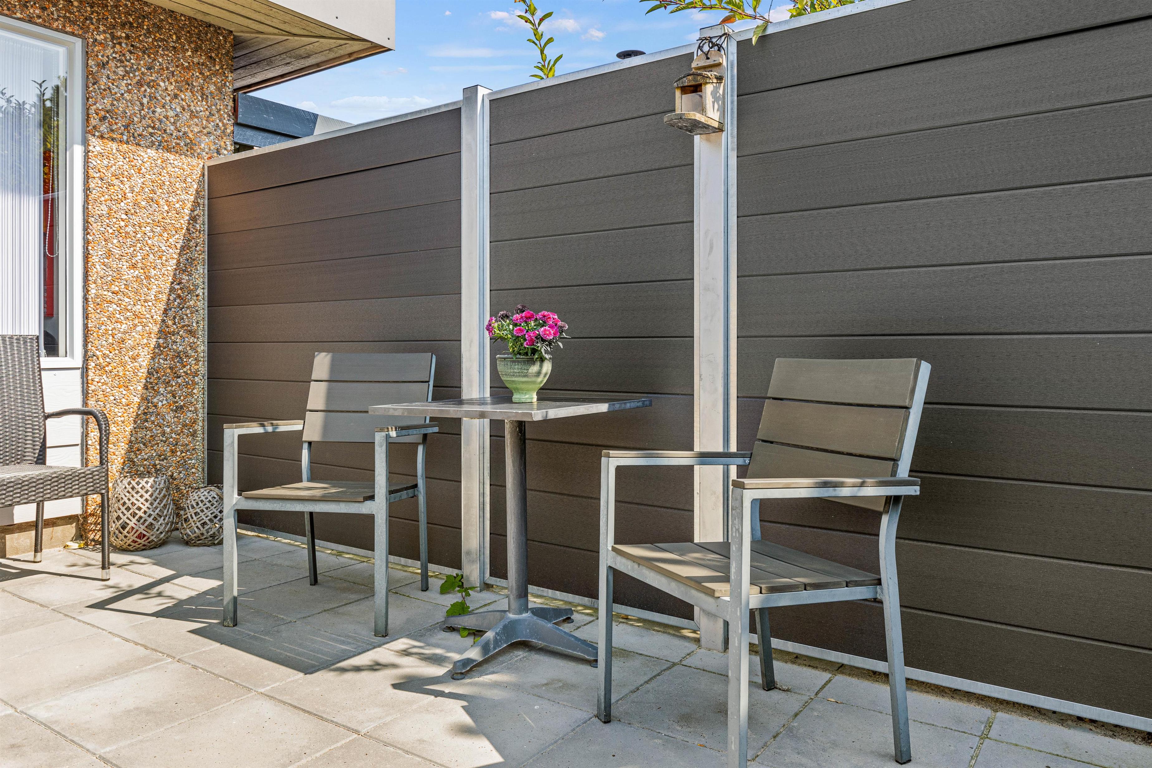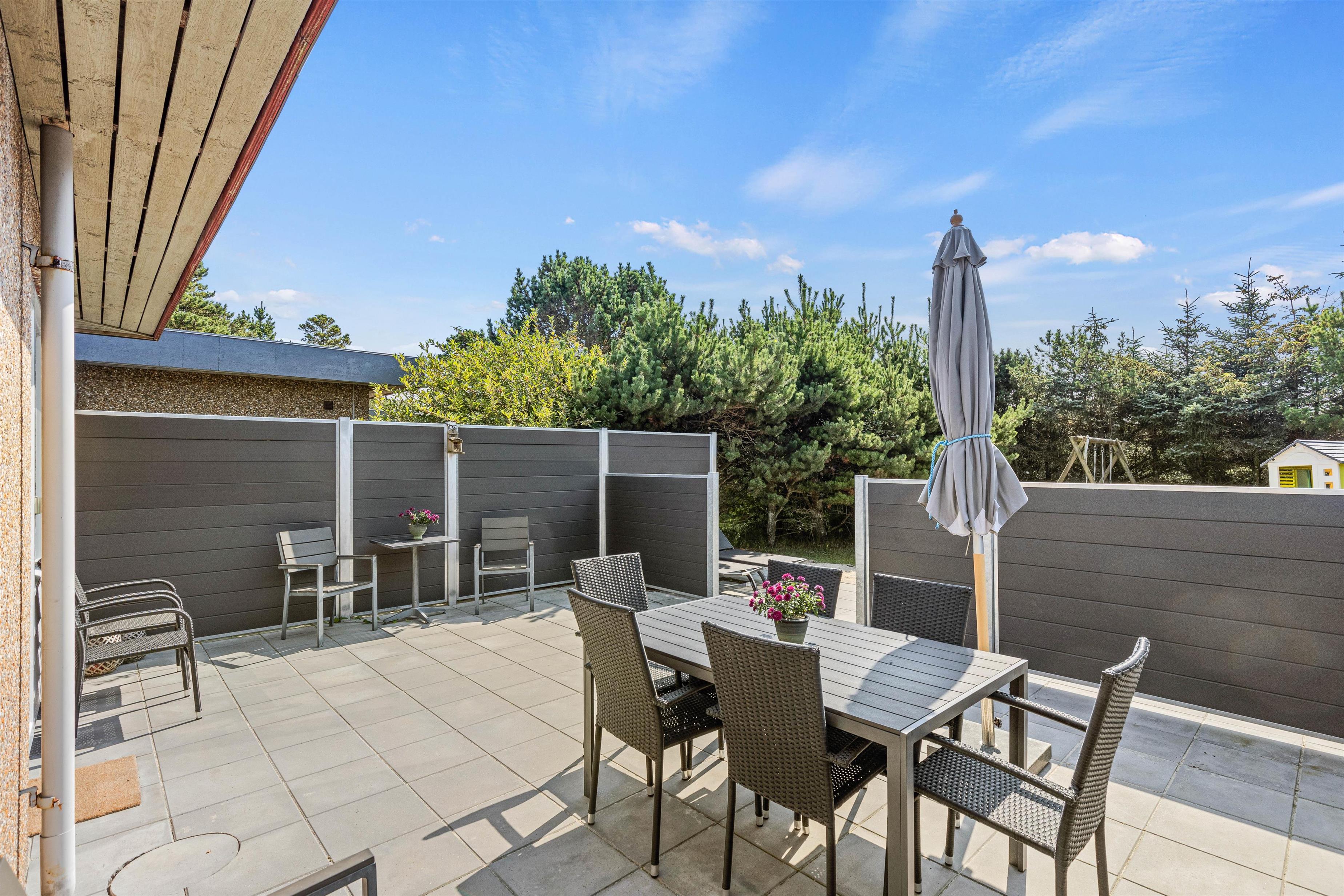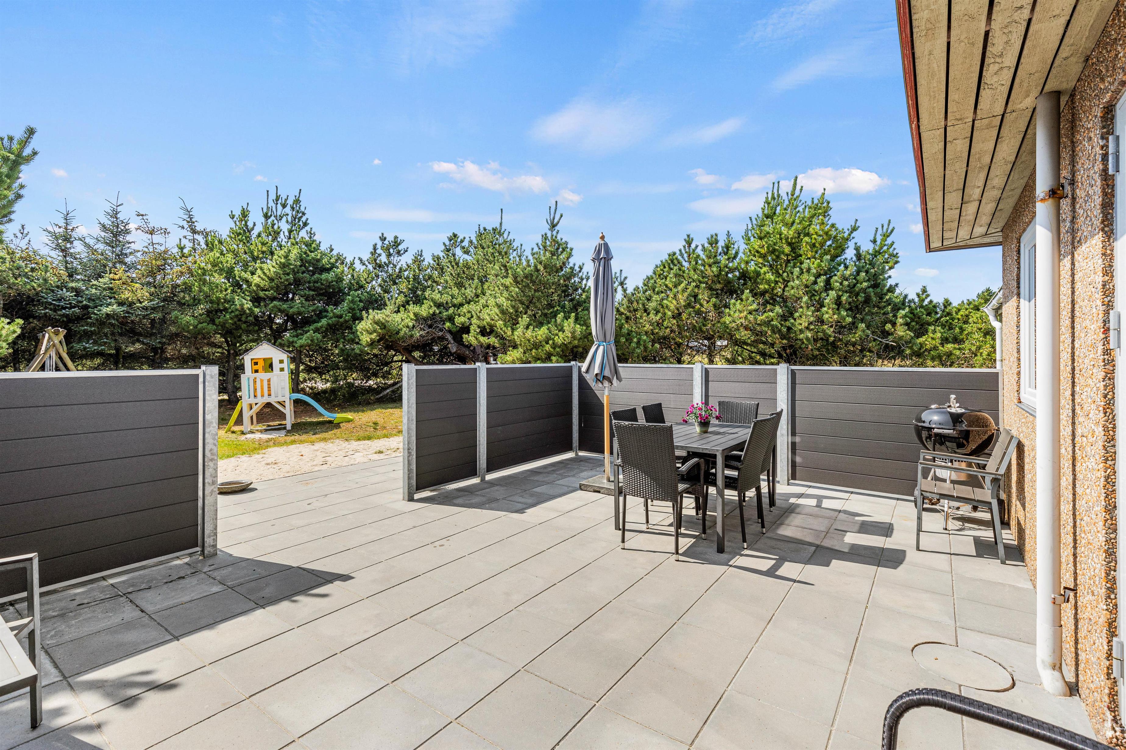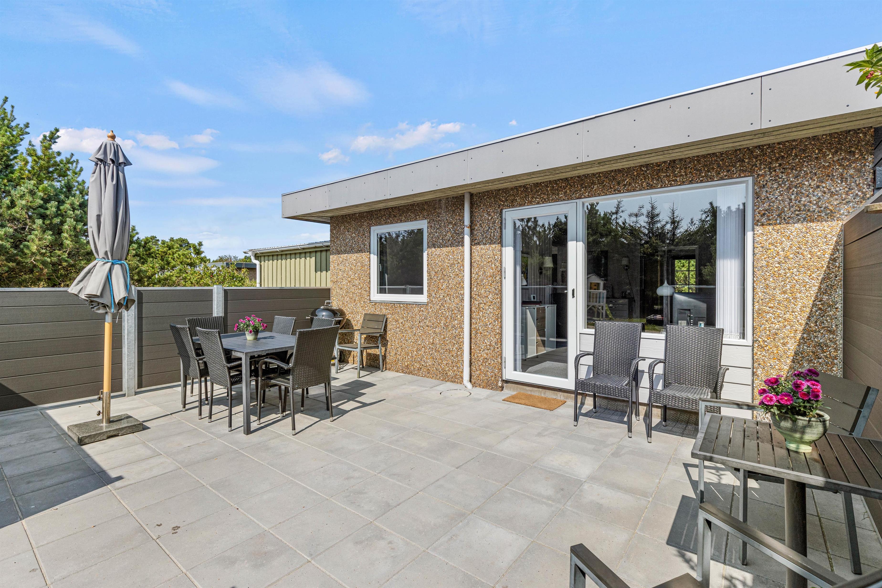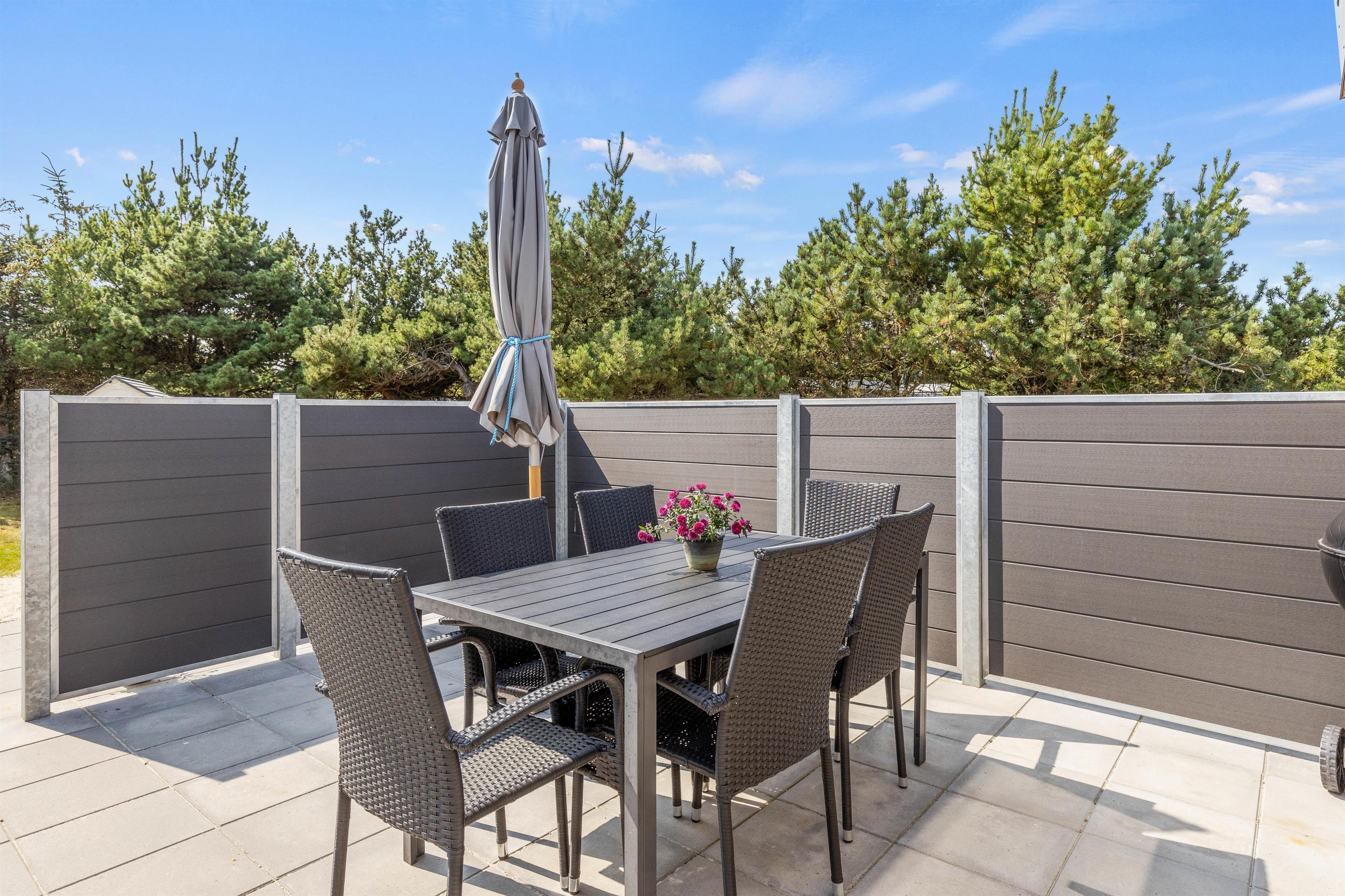 På sommerhusets udeområde venter jer en skøn have og terrasse, som I kan rykke ud på, når ferievejret er i top. På terrassen inviterer havemøbler og liggestole til afslappende stunder i solen. Terrassen er desuden afskærmet, så I kan sidde i læ for vinden.