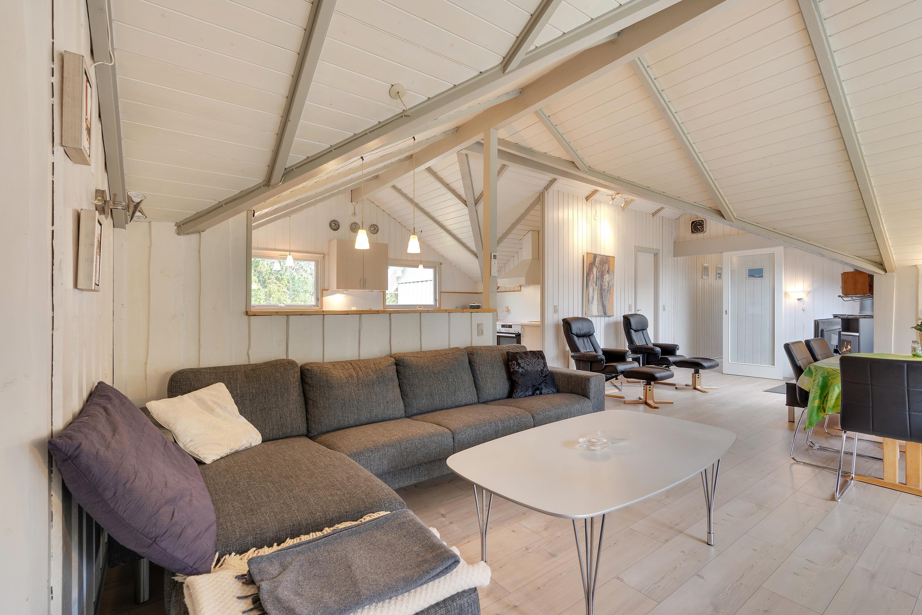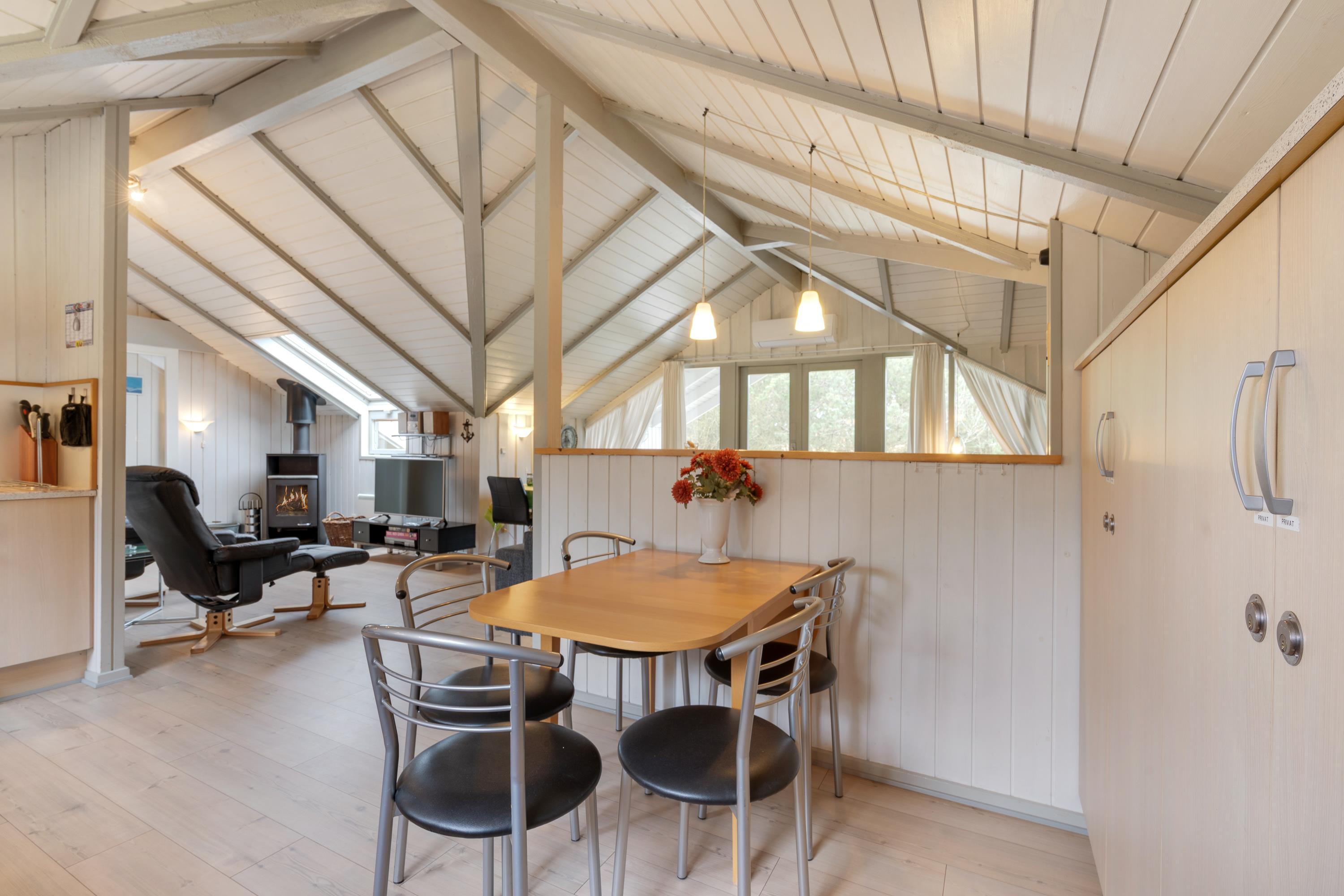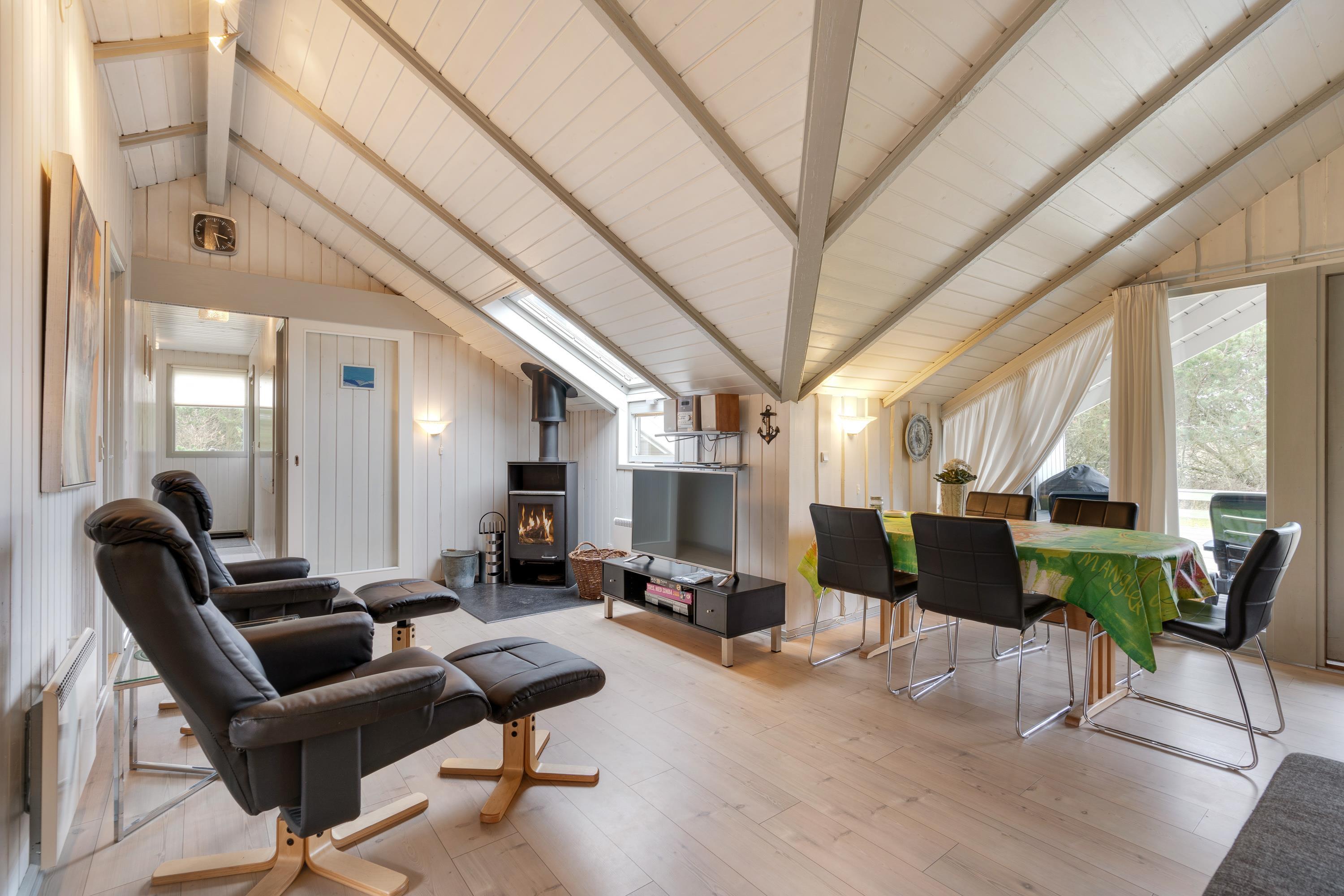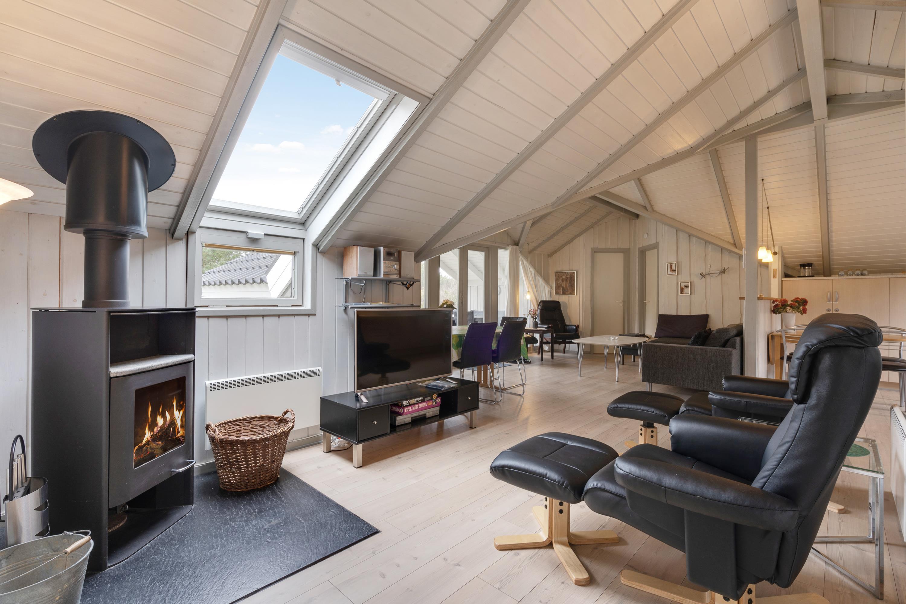 Masser af vinduer og en lys træbeklædning sørger for en behagelig og venlig atmosfære i hele huset. Fra sofaen har I udsigt til den grønne have, og på de kolde dage sørger brændeovnen for god varme og hyggelig feriestemning. Temperaturen kan også reguleres med den energibesparende varmepumpe.