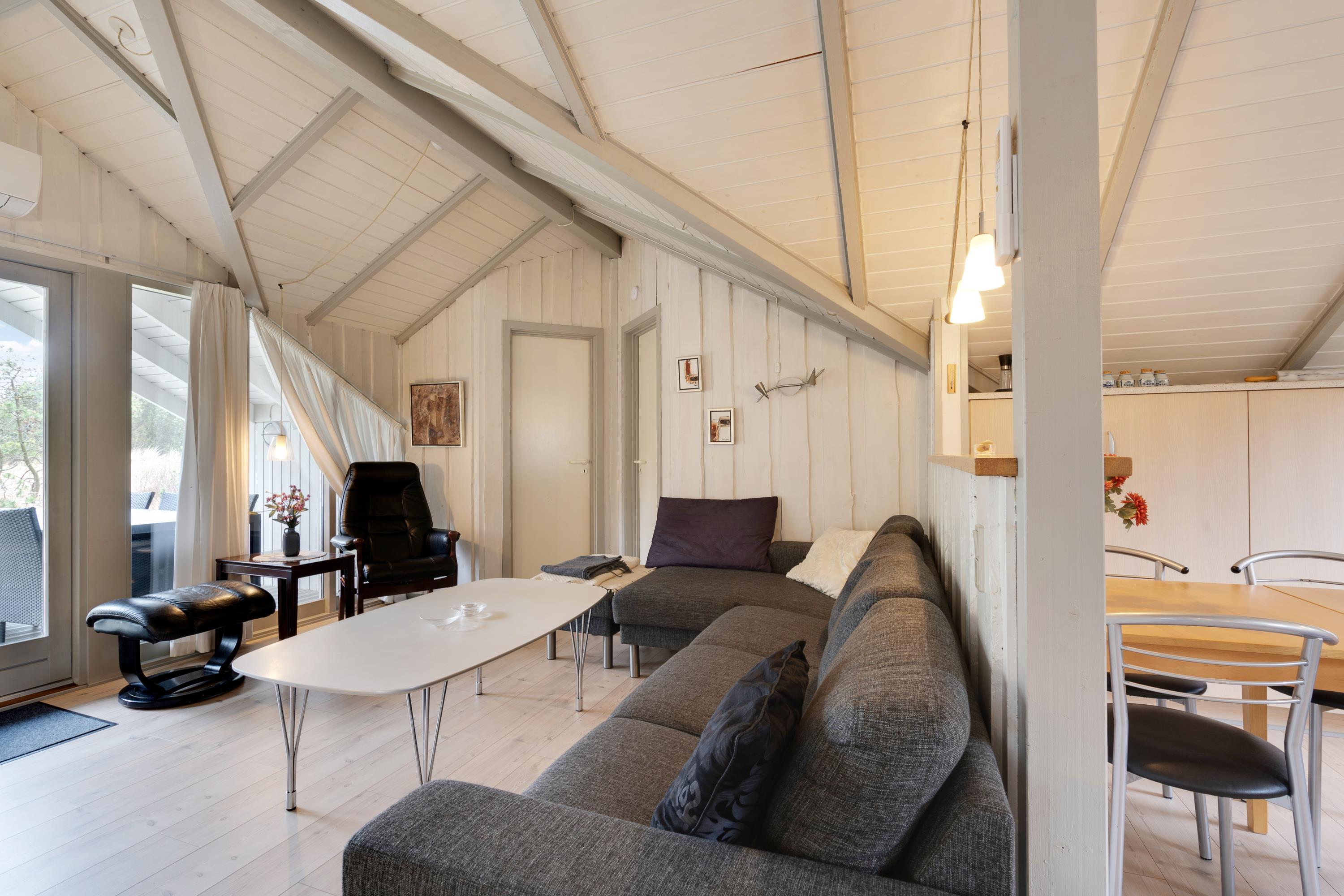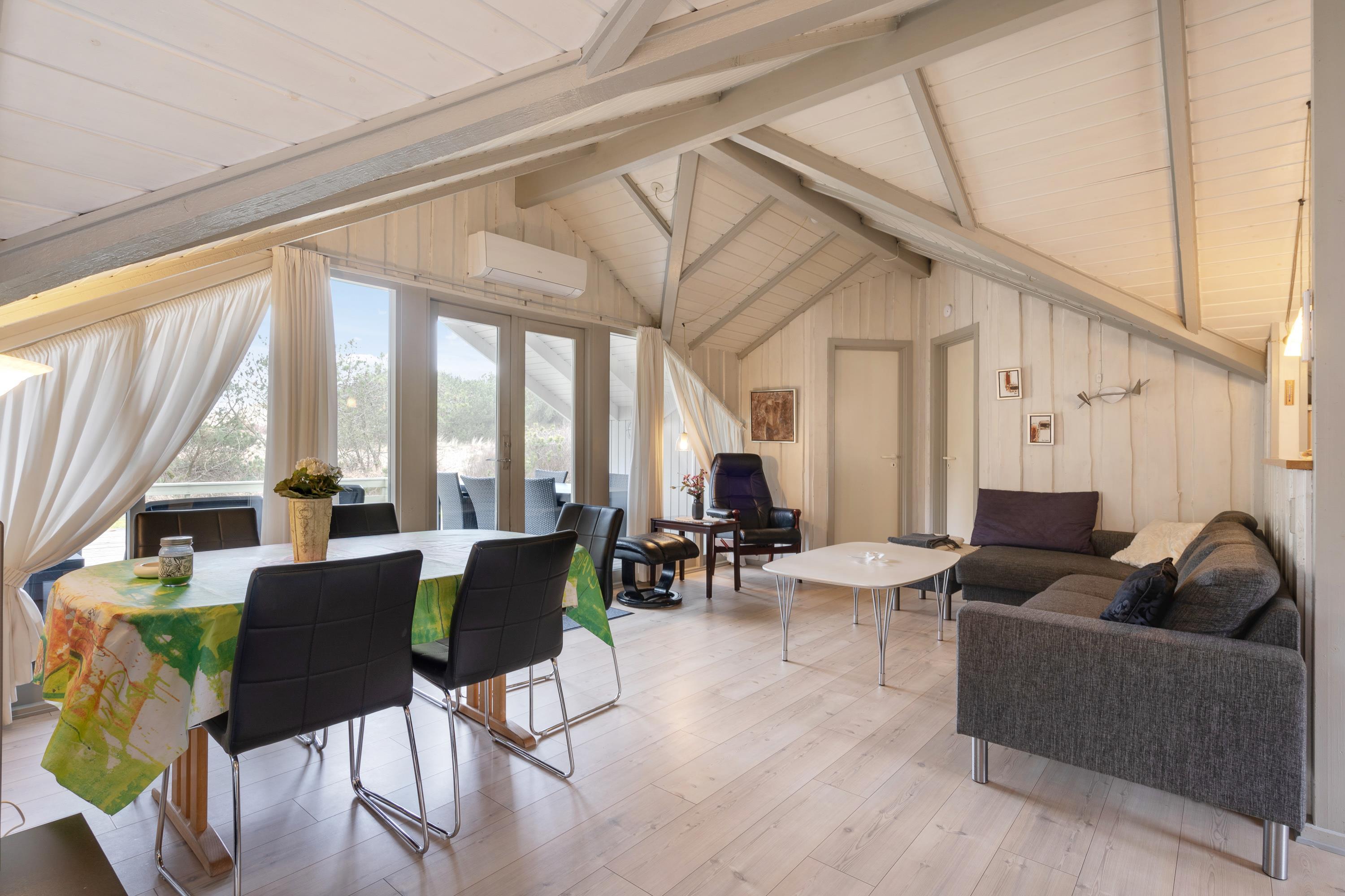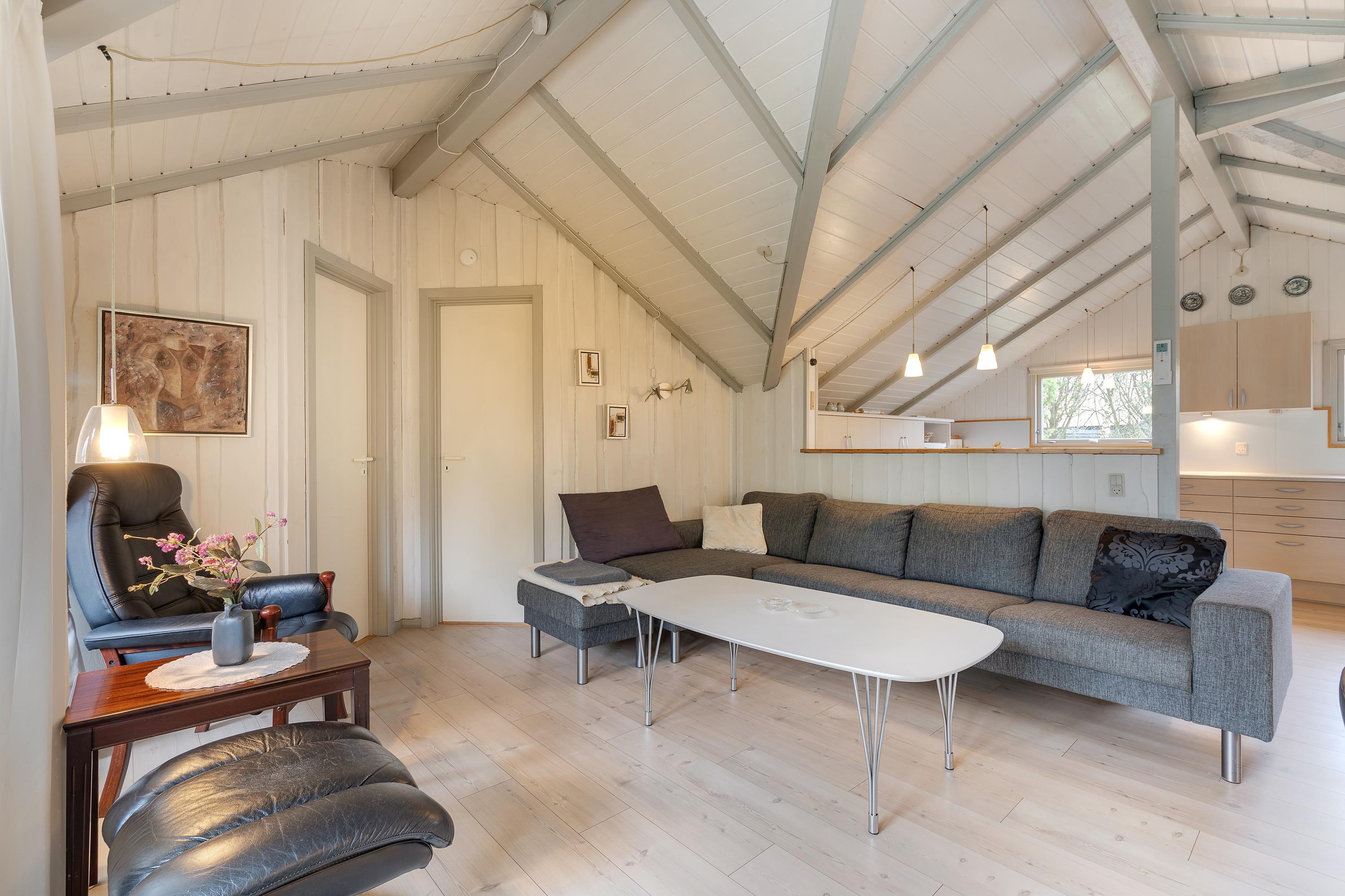 Masser af vinduer og en lys træbeklædning sørger for en behagelig og venlig atmosfære i hele huset. Fra sofaen har I udsigt til den grønne have, og på de kolde dage sørger brændeovnen for god varme og hyggelig feriestemning. Temperaturen kan også reguleres med den energibesparende varmepumpe.