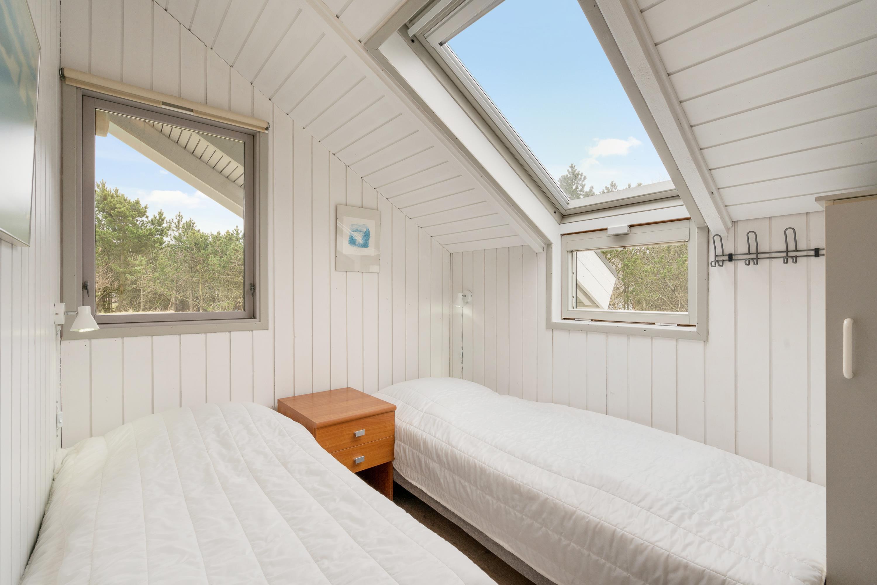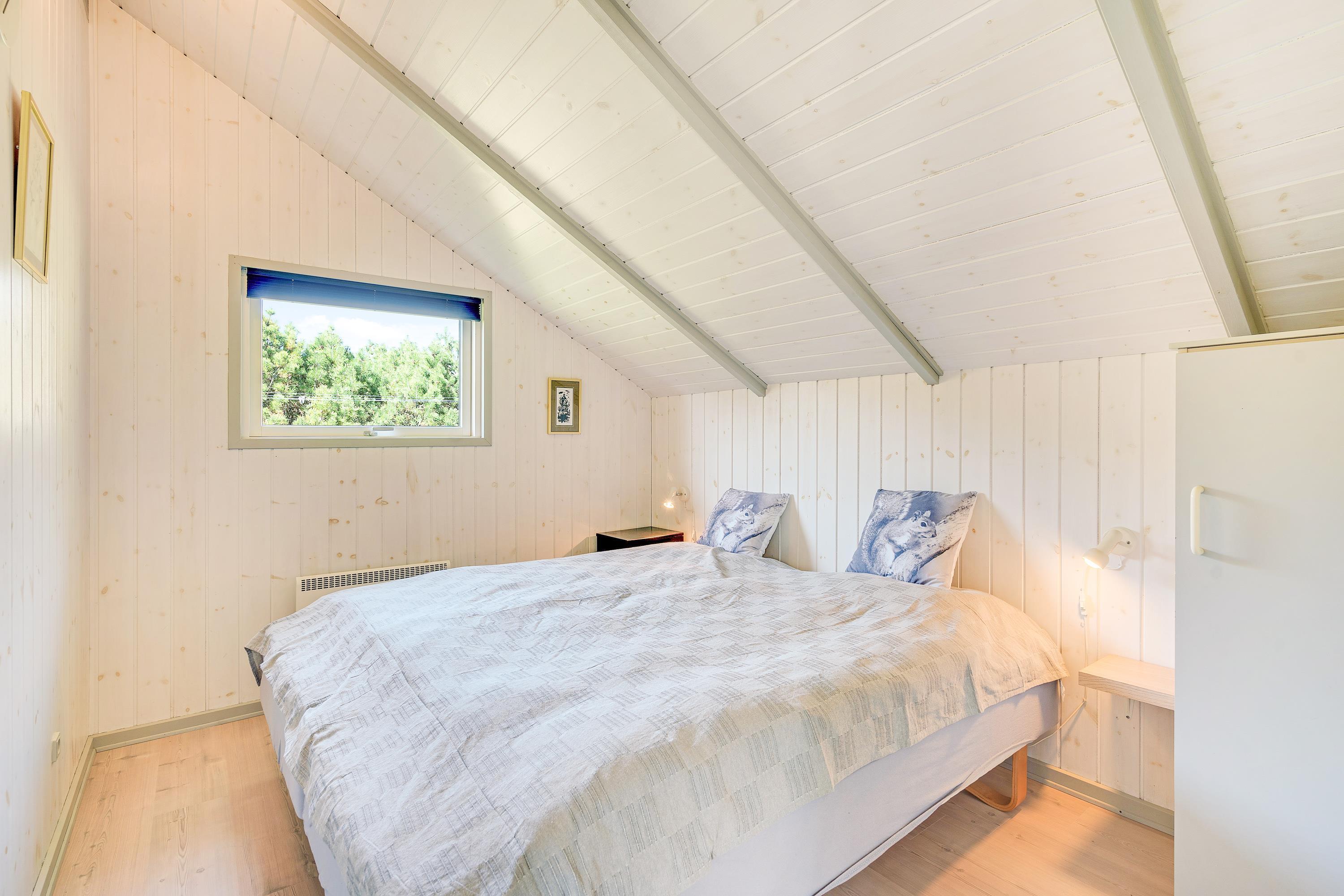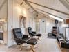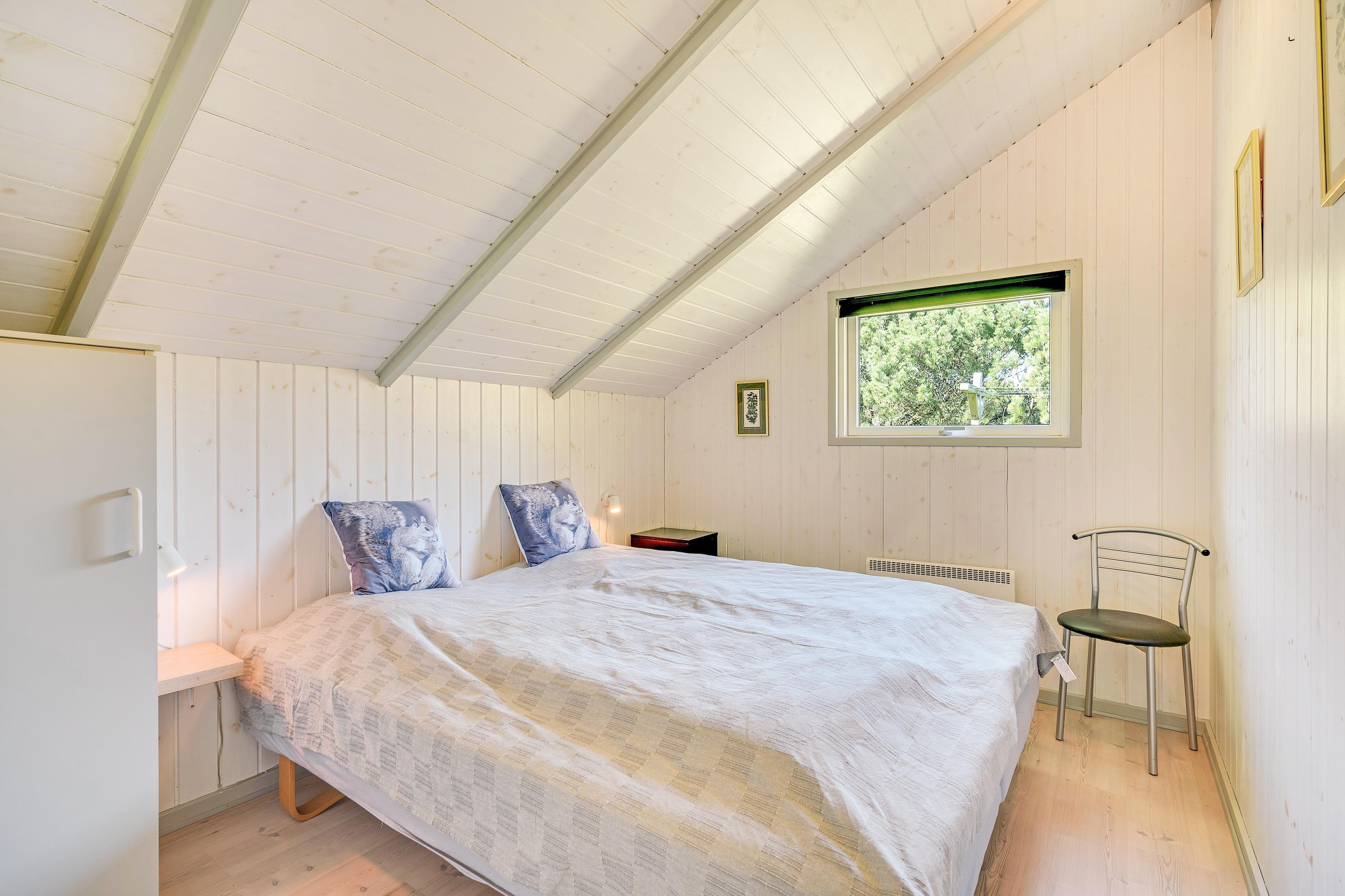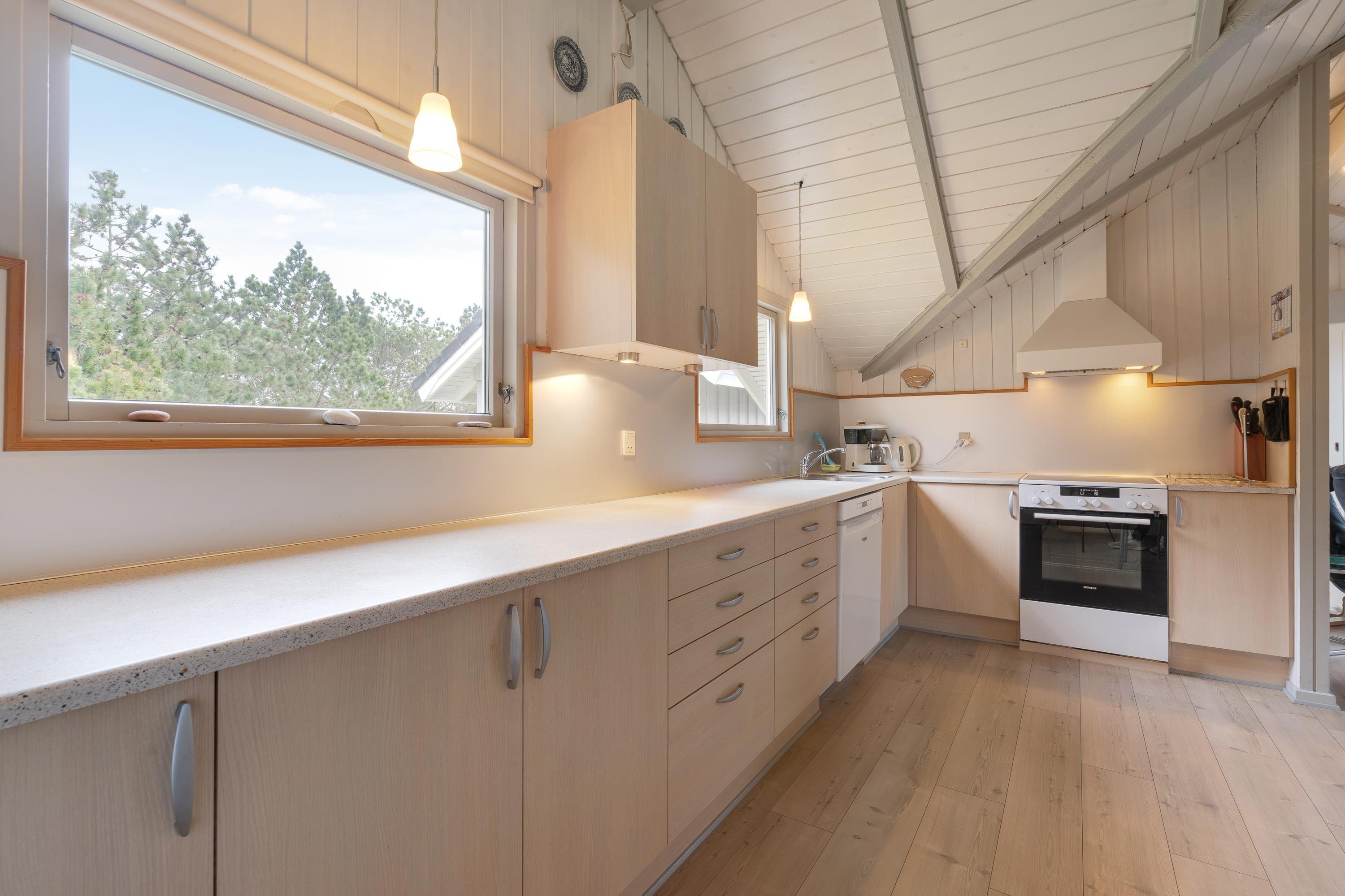 Masser af vinduer og en lys træbeklædning sørger for en behagelig og venlig atmosfære i hele huset. Fra sofaen har I udsigt til den grønne have, og på de kolde dage sørger brændeovnen for god varme og hyggelig feriestemning. Temperaturen kan også reguleres med den energibesparende varmepumpe.