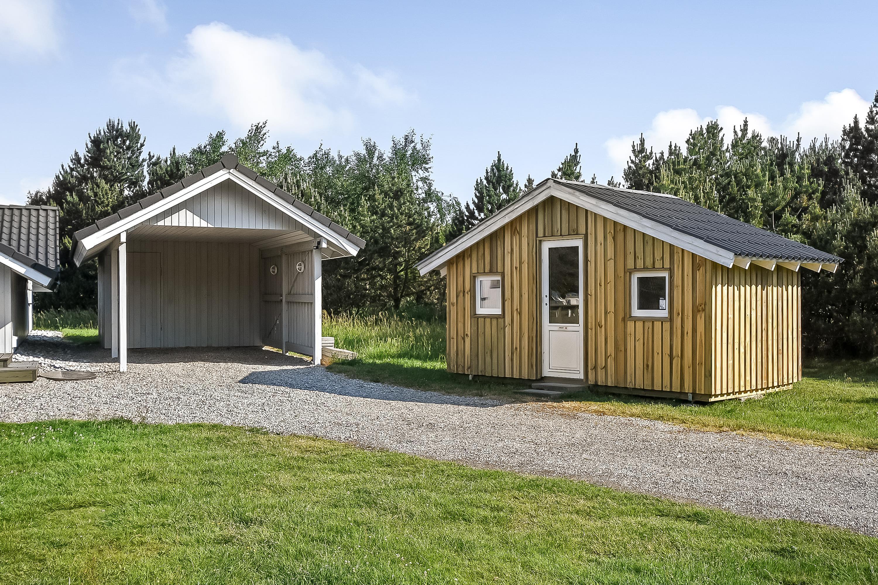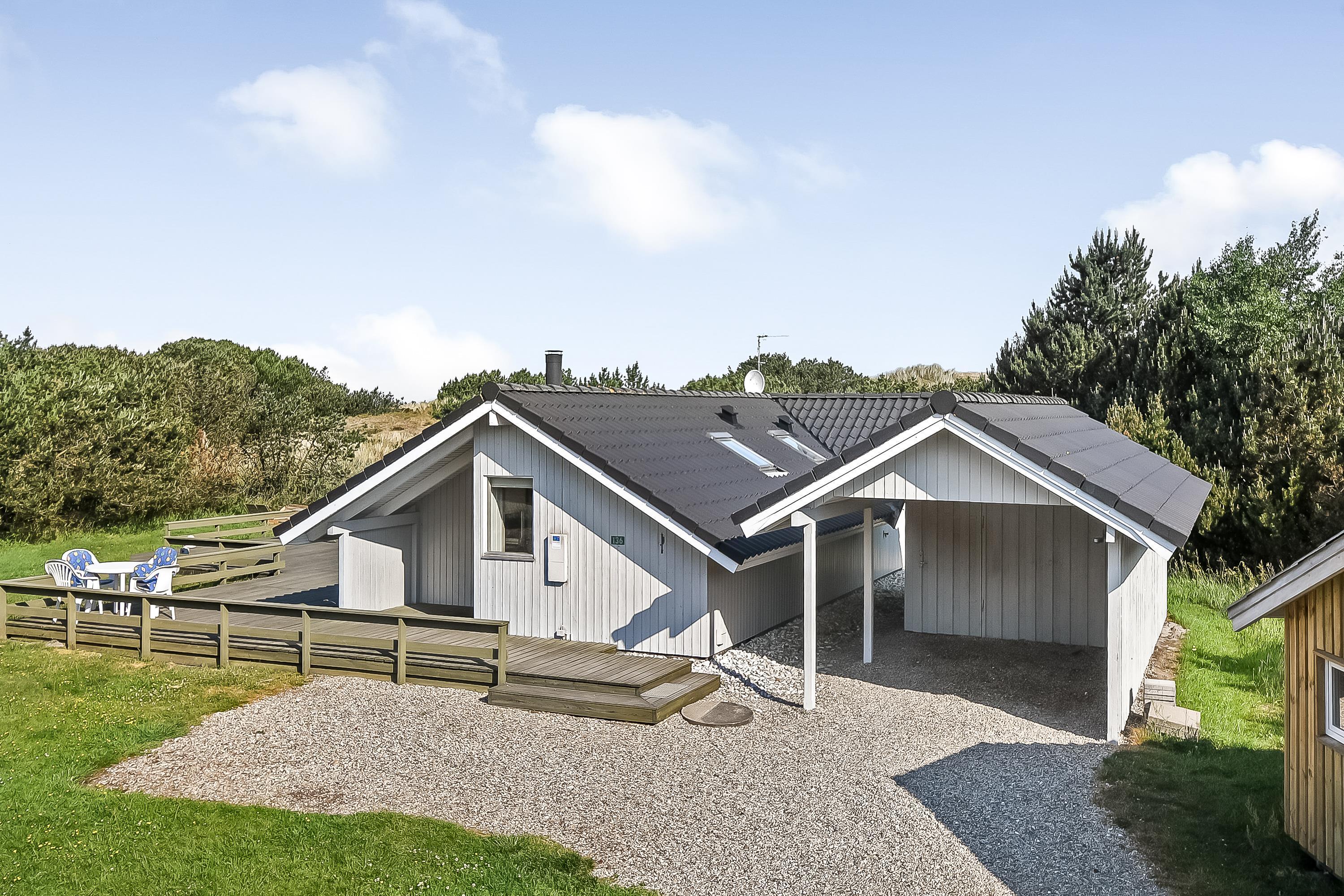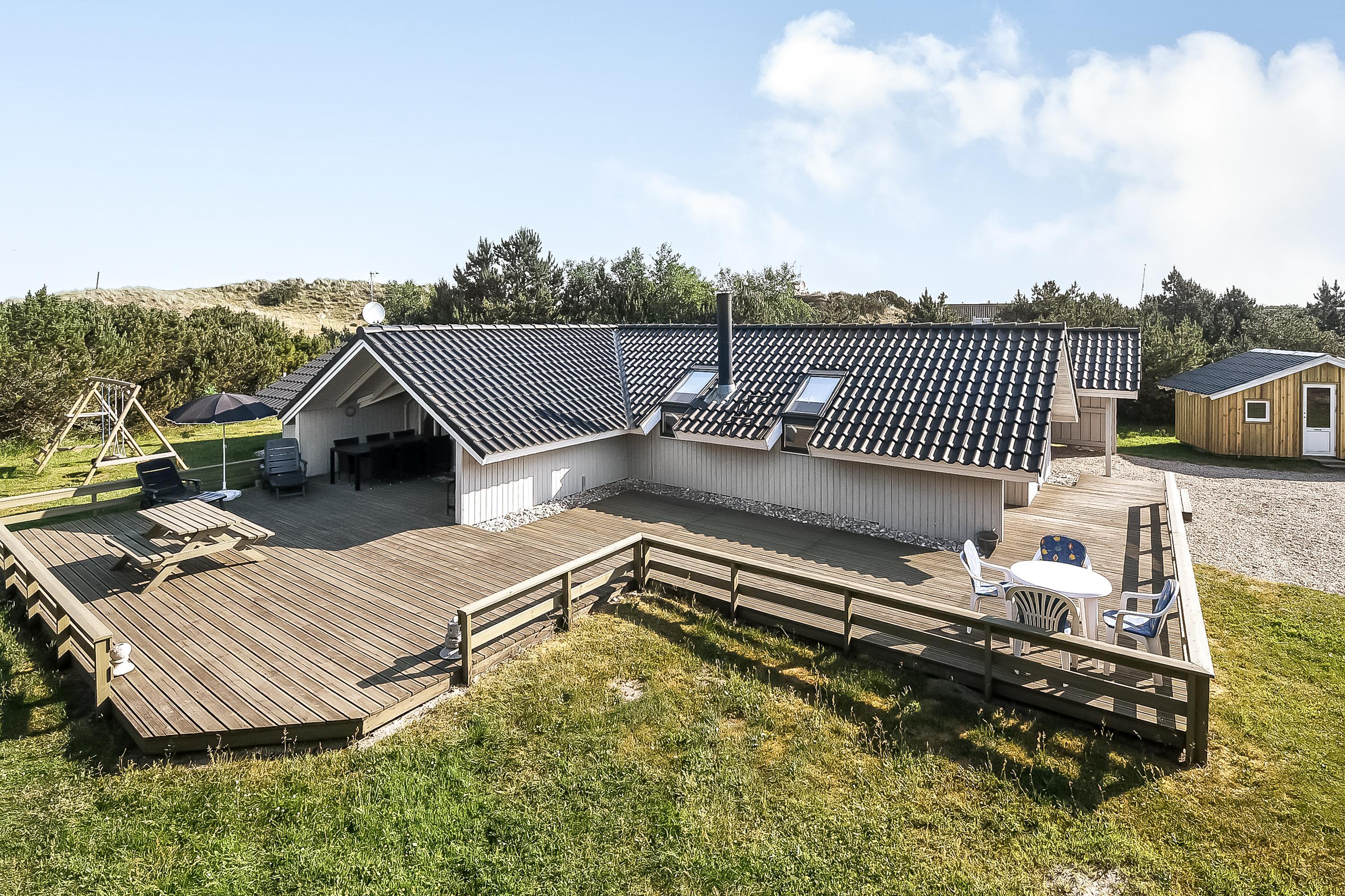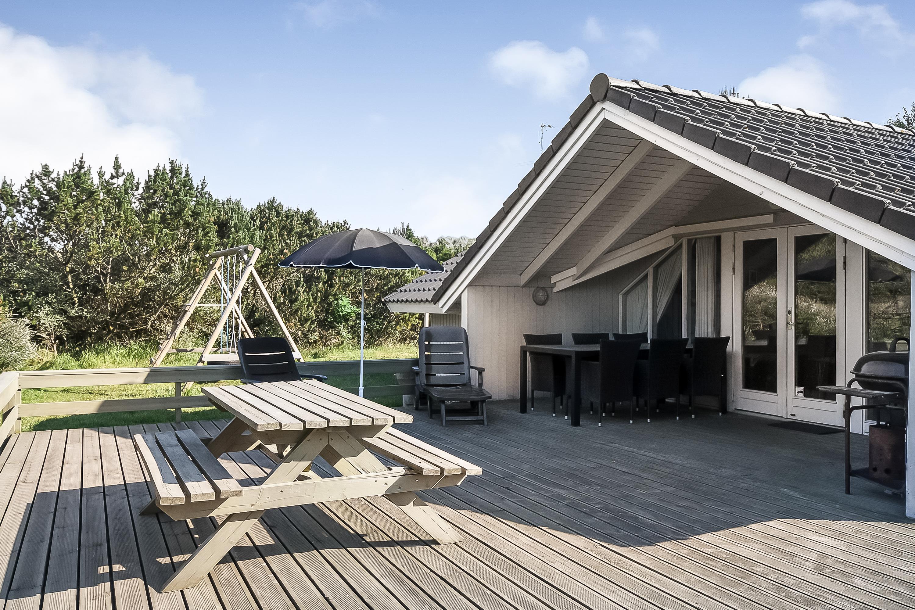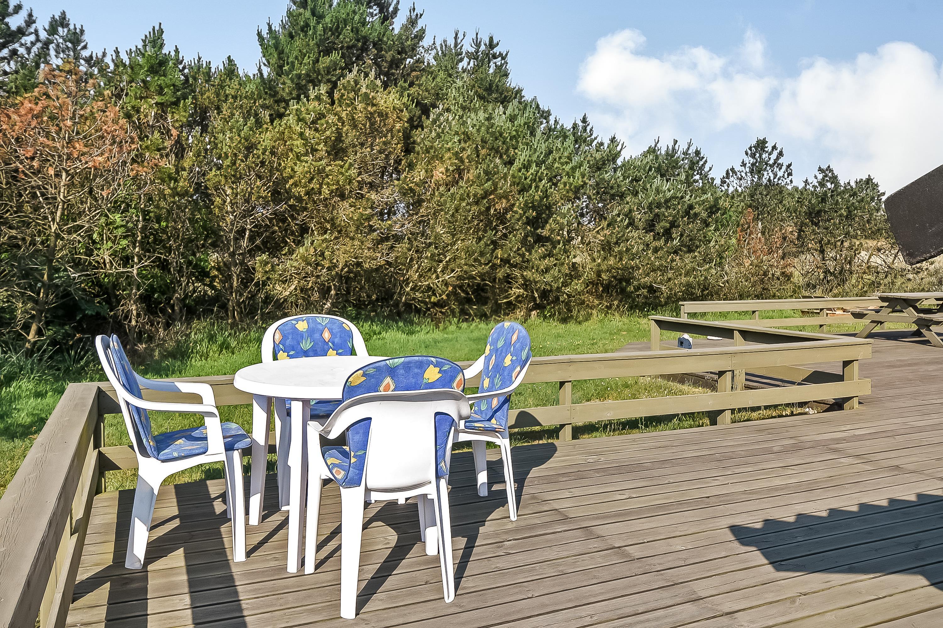 På træterrassen er der rigelig plads til, at alle feriegæster kan dase i solen, og havemøbler og liggestole er der selvfølgelig sørget for. I det lune sommervejr kan I tænde op i grillen og spise en middag under åben himmel, mens I får de dagens sidste solstråler med. På kolde dage kan I sætte jer til rette under den overdækkede del af terrassen og nyde den friske luft.