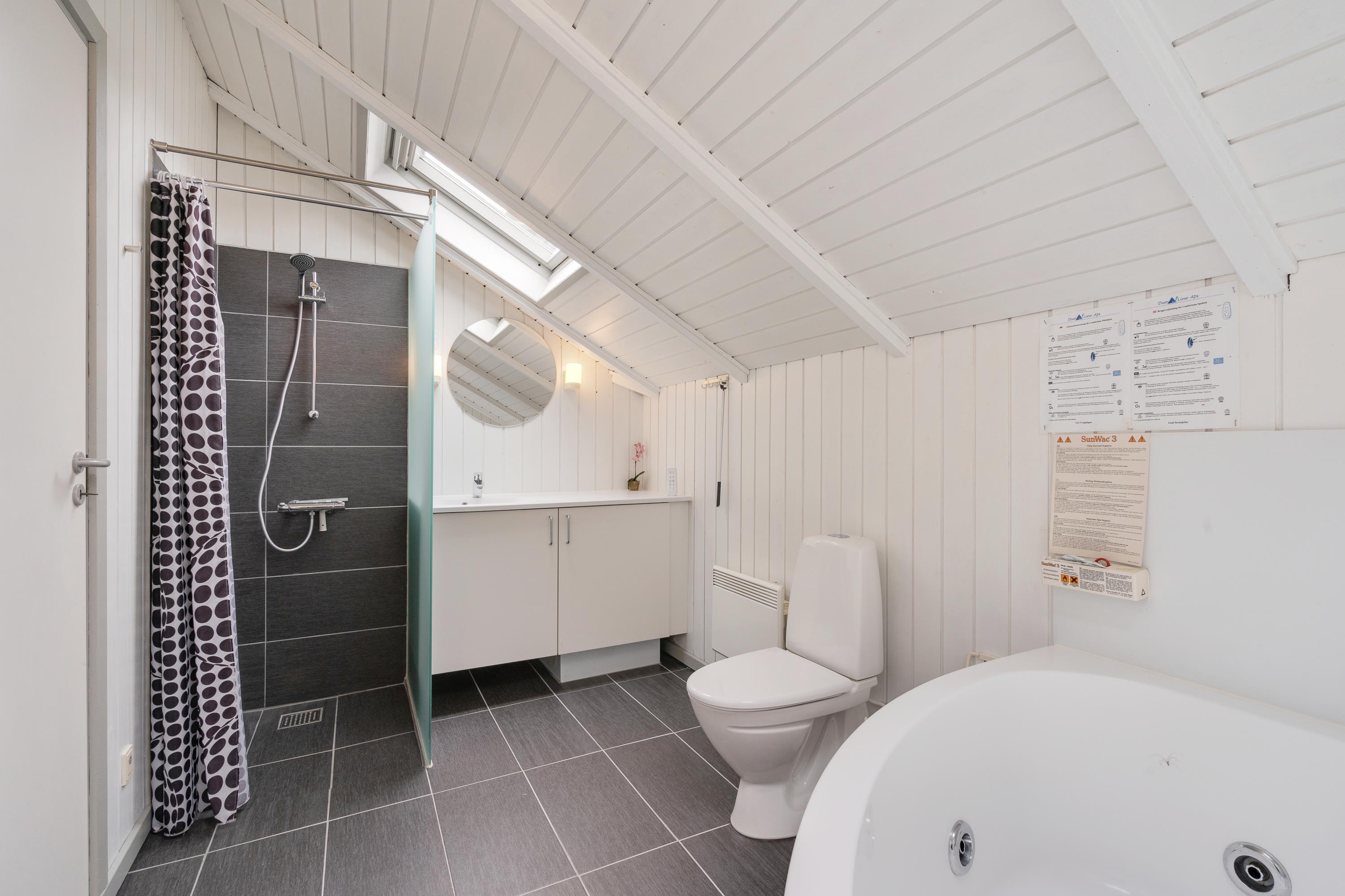 Et highlight ved huset er badeværelset. Det er udstyret med gulvvarme, spabad og sauna. Her kan I rigtig læne jer tilbage i varmen og glemme hverdagens stress og jag.