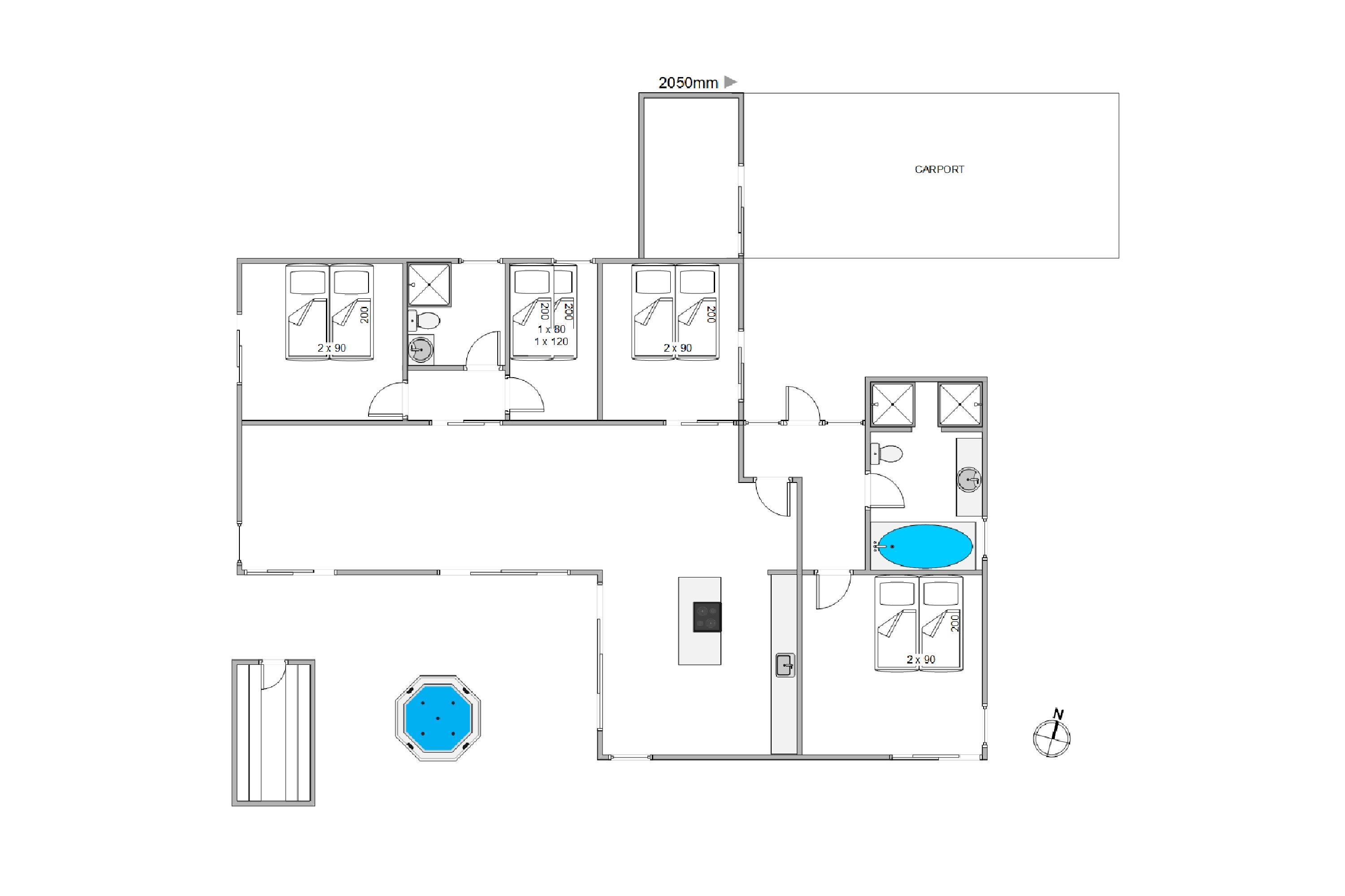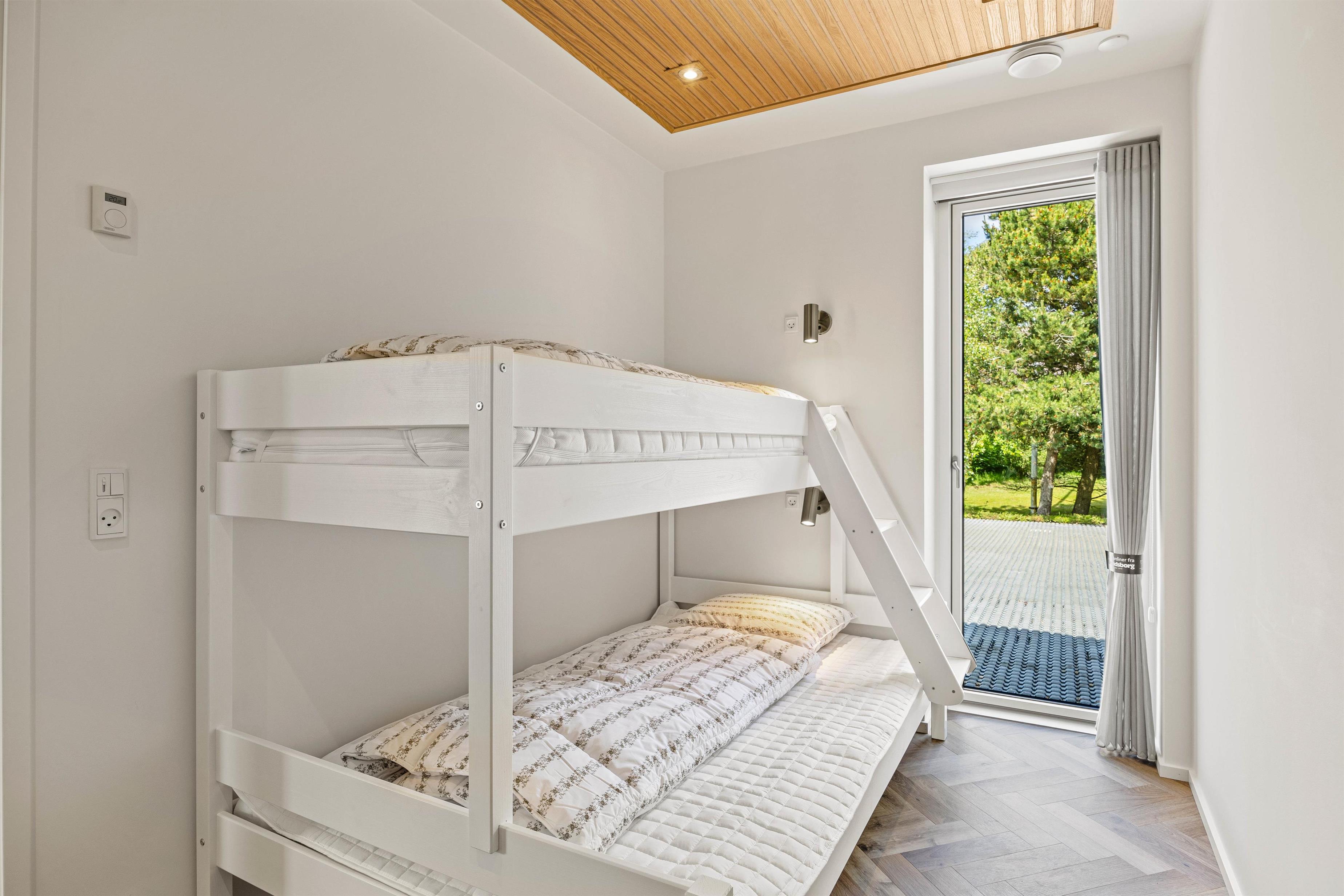 Dette skønne sommerhus har en imponerende størrelse på 153 m2 og byder på moderne og komfortable faciliteter. I feriehuset finder I alle hverdagens hjælpere såsom opvaskemaskine, vaskemaskine og tørretumbler. Her er 3 rummelige soveværelser med dobbeltsenge og 1 værelse med køjesenge, og med 2 badeværelser undgår I morgenkøen – også superpraktisk, hvis flere familier holder ferie sammen. Der er desuden gulvvarme i hele huset.