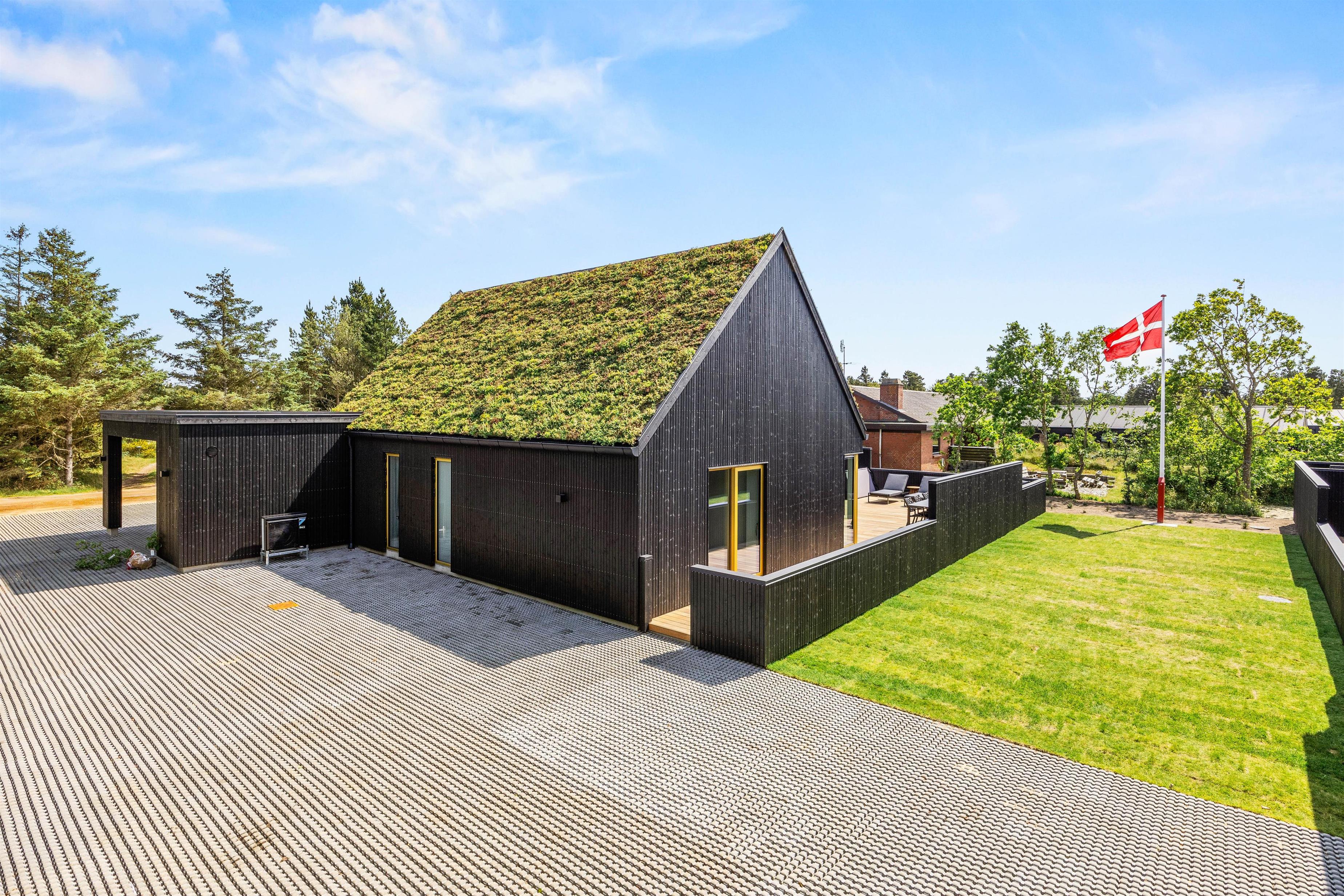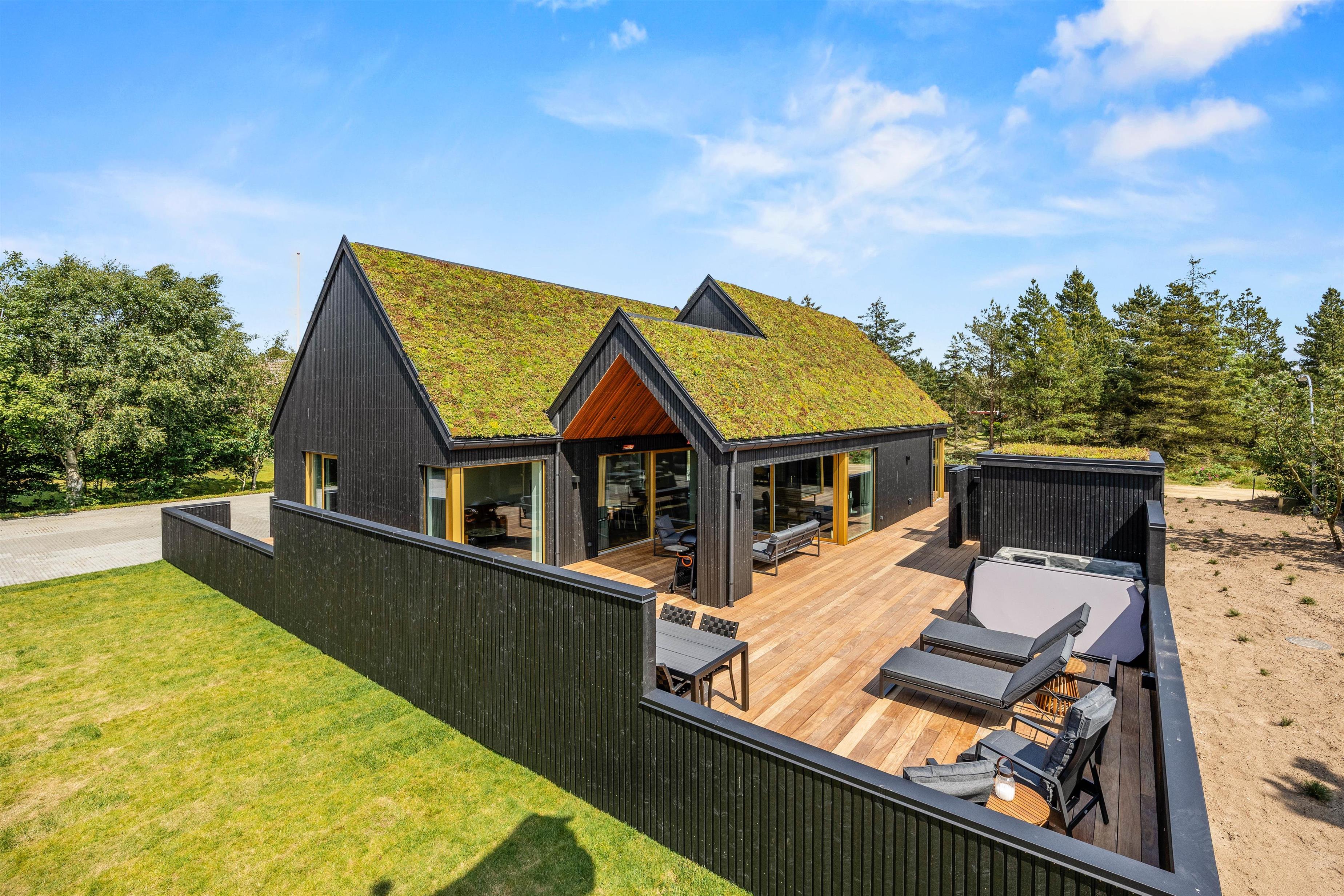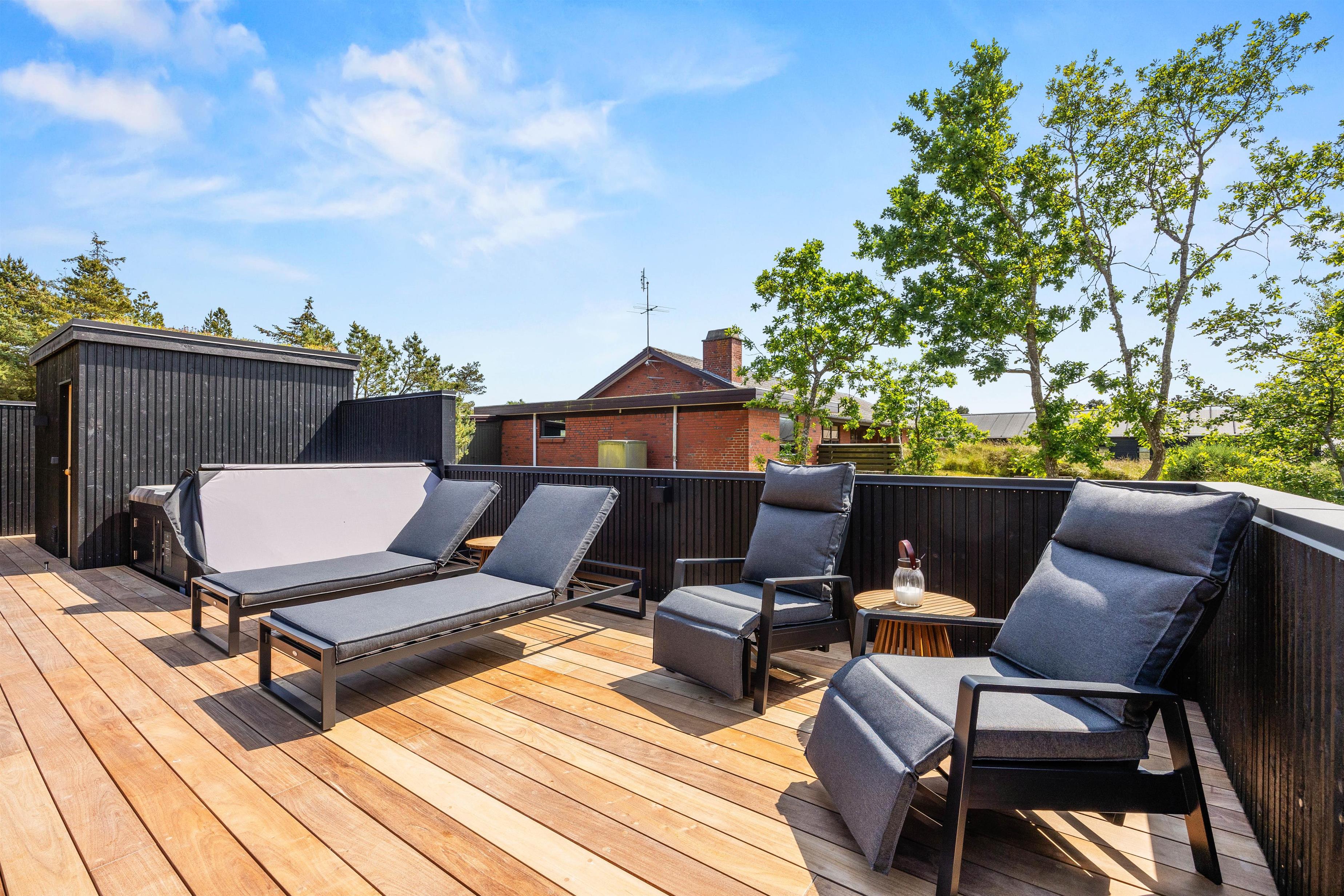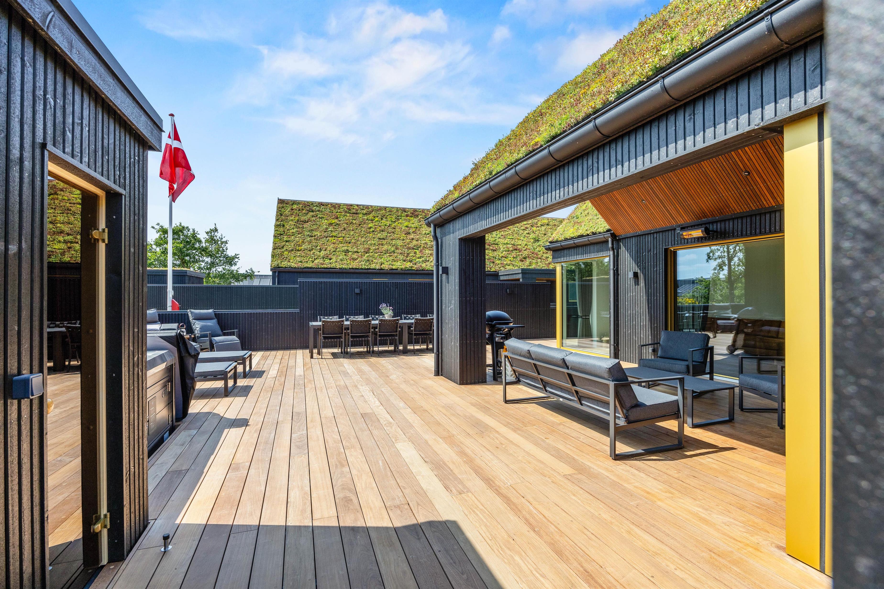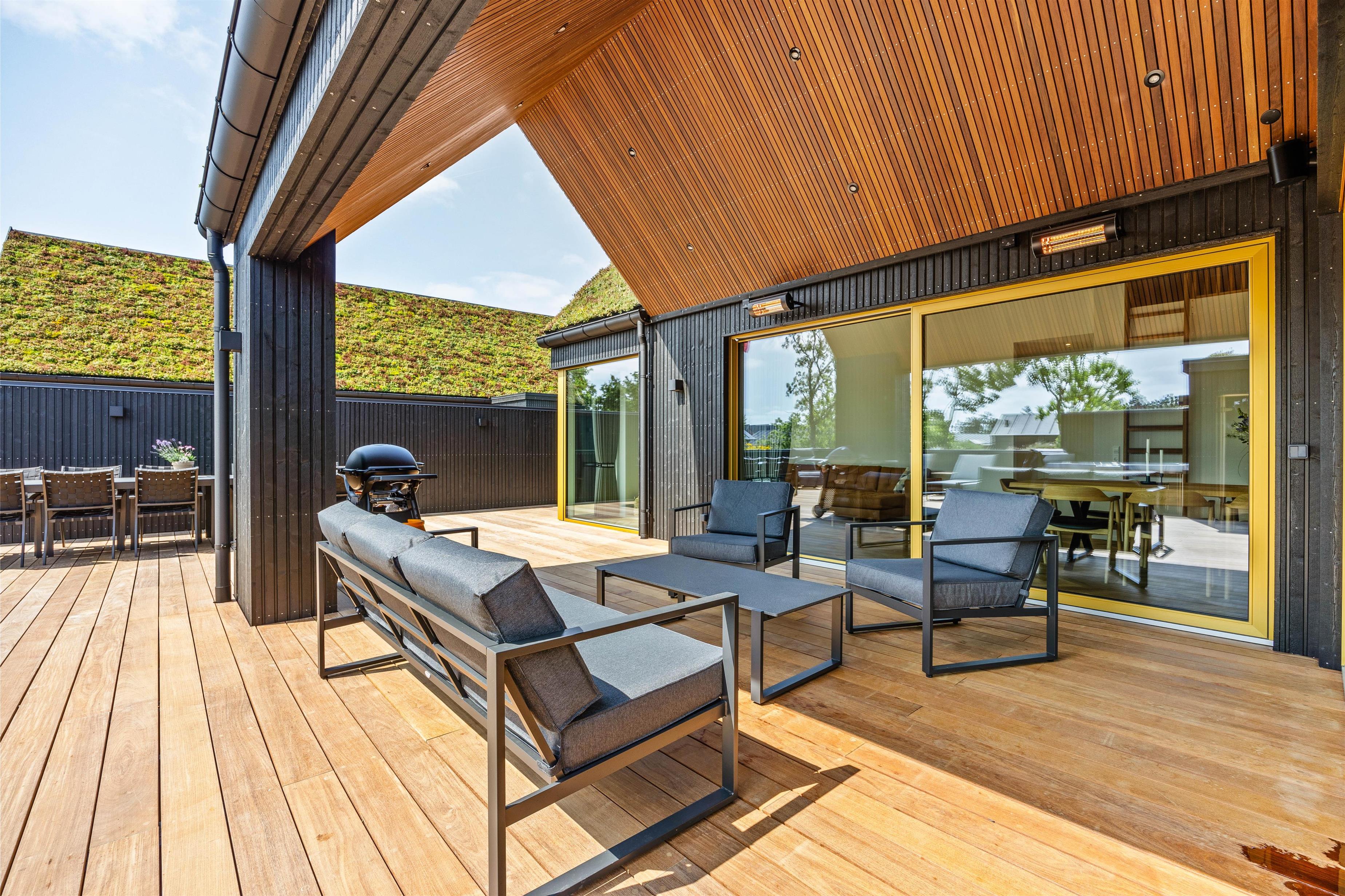 Det er ikke kun indvendigt, at feriehuset på Midtbyvej 8B står knivskarpt. Udenfor venter jer et lækkert, delvist overdækket terrasseområde. Her kan I nyde den danske sommer, uanset om I skal dase i solen, nyde morgenkaffe eller læse en god bog. Havemøbler, liggestole og gasgrillen står klar til jer.