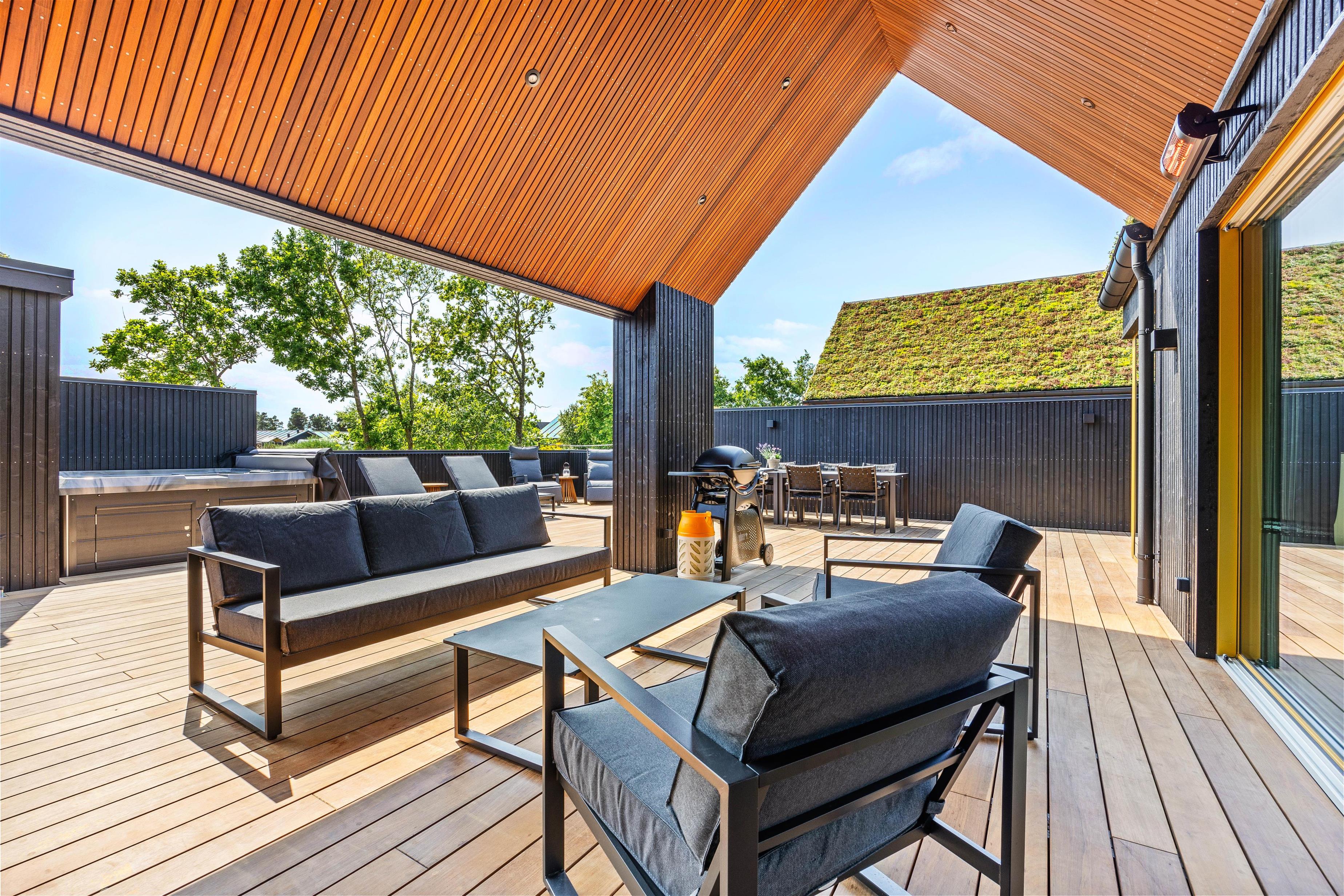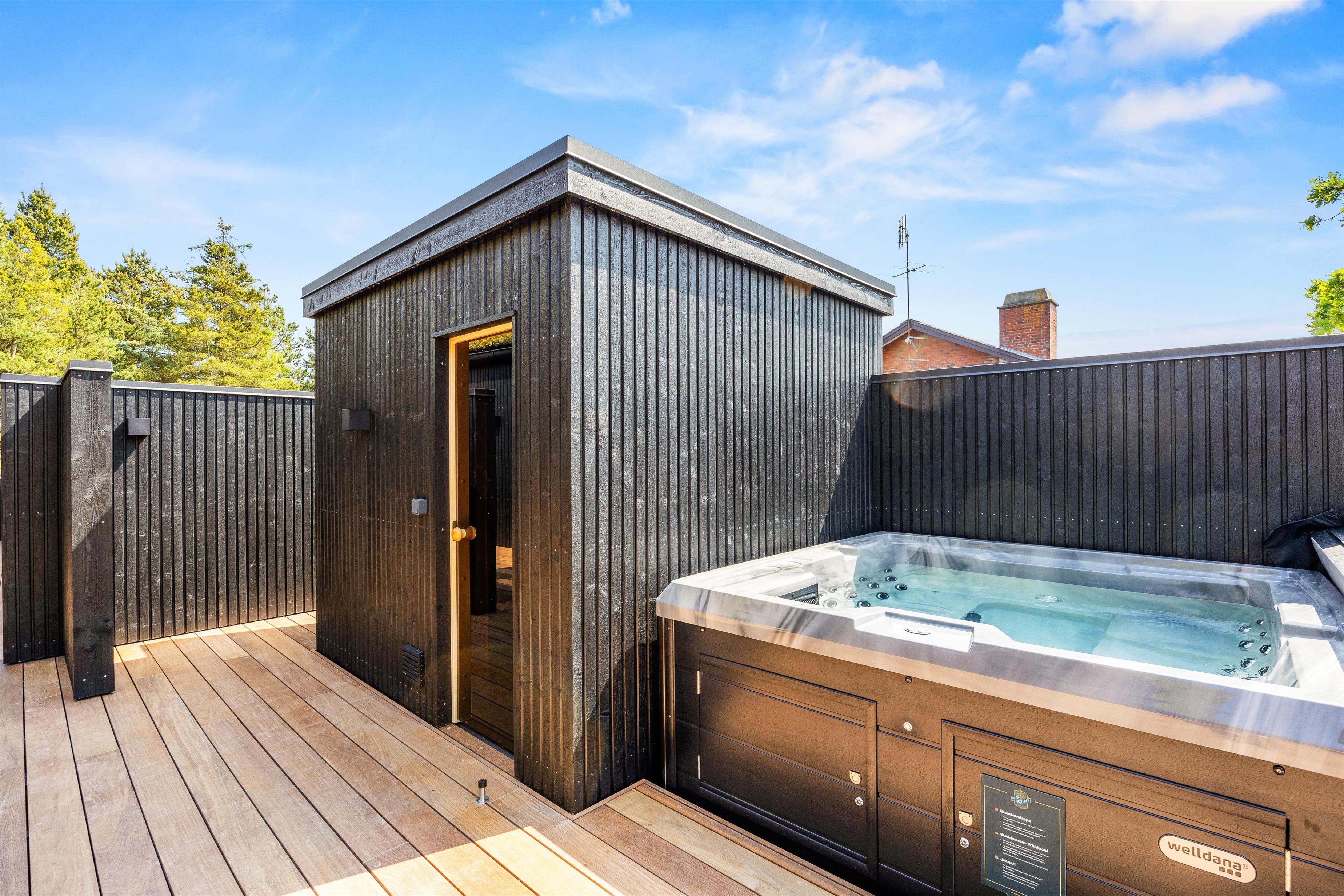 På de lune sommeraftner skal I naturligvis tænde op i gasgrillen. Tilbered et lækkert måltid og nyd hertil et køligt glas rosé. Fuldend aftenen med en tur i den varme udespa, som står klar til at give jer en afslappende wellnessoplevelse. Skal I varmes ekstra godt igennem er her også en udendørssauna. Fra 1. april til 31. oktober er der også en udebruser, perfekt til at skylle kroppen efter en saunasession eller til at skylle sandet af efter en dag på stranden.