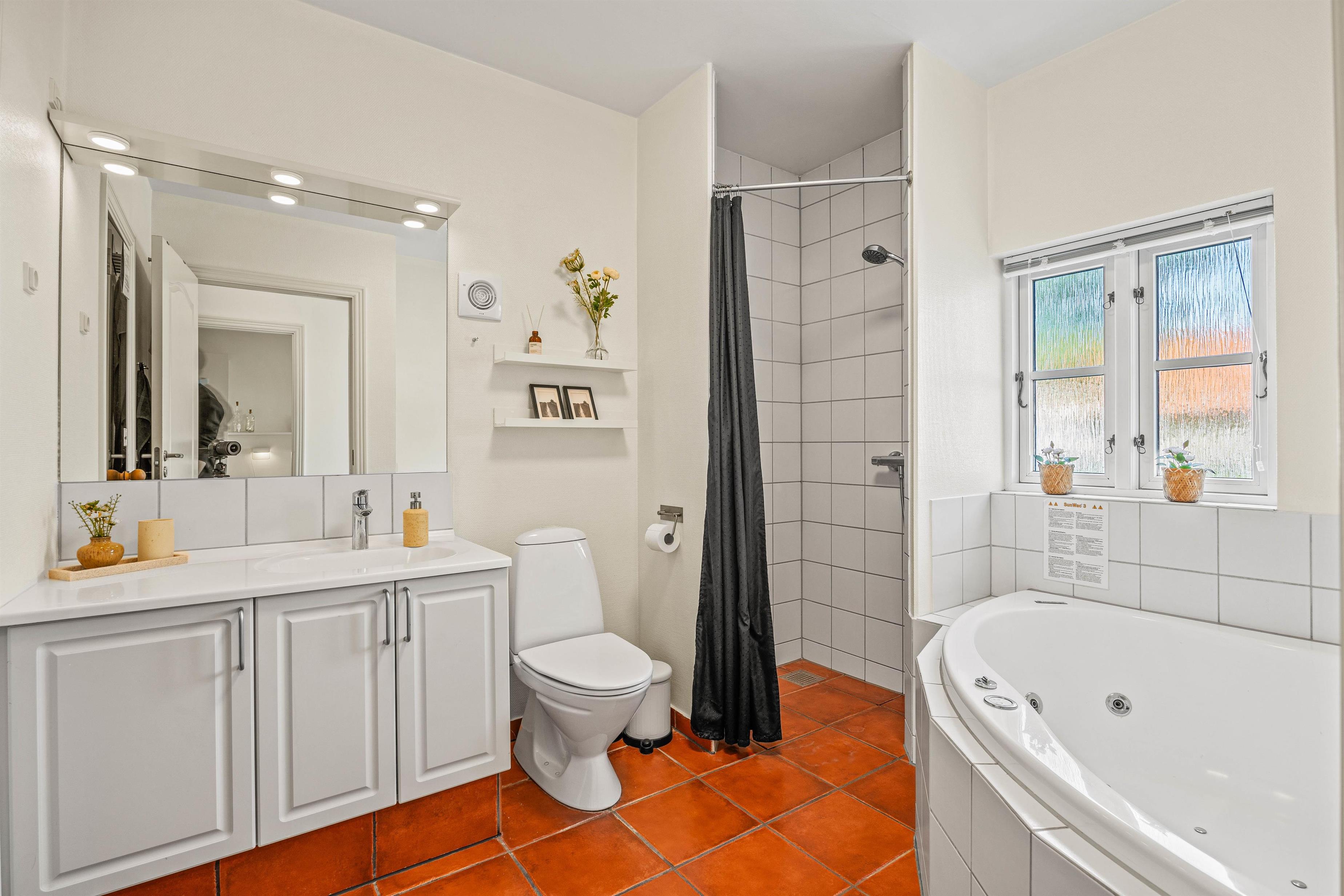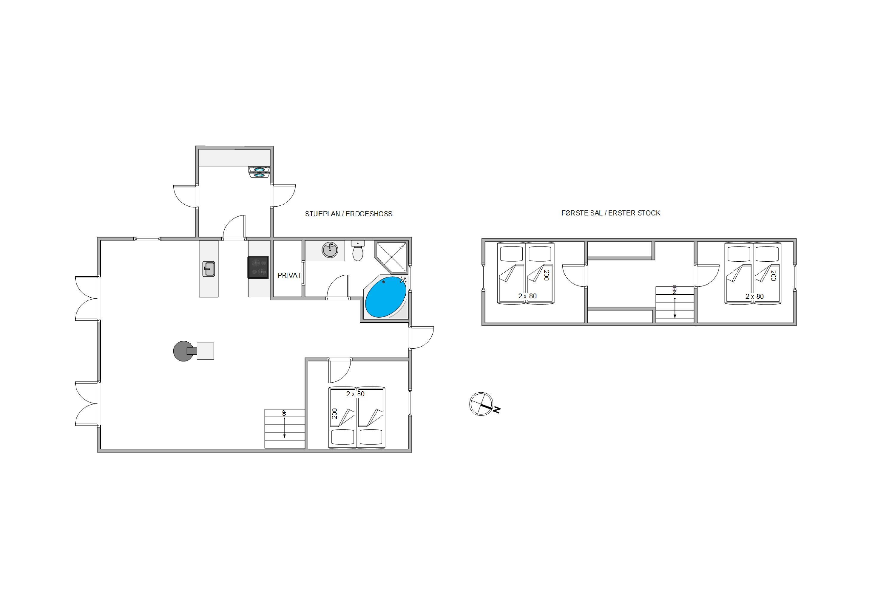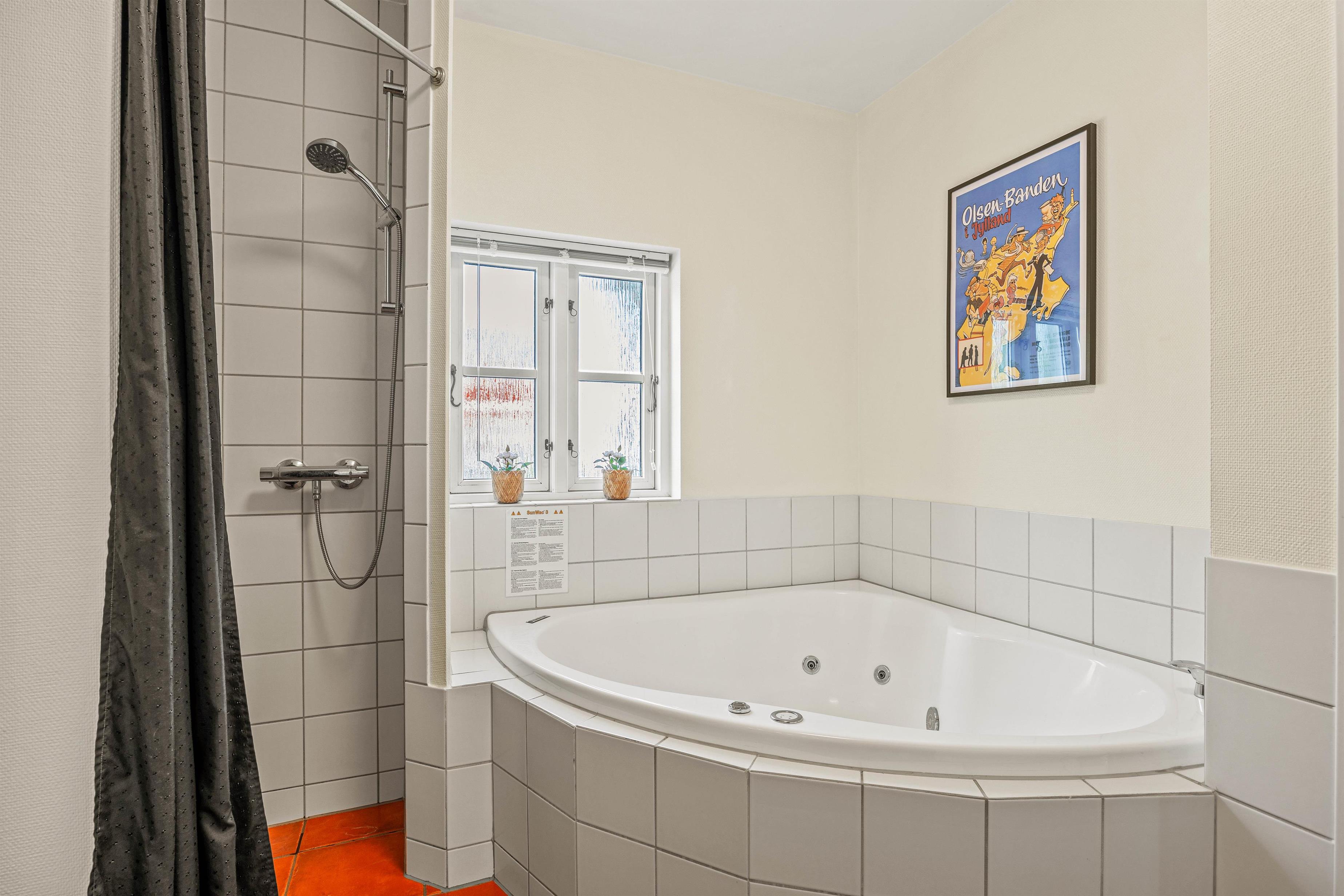 Sommerhusets 124 kvadratmeter fordeler sig på to plan. På førstesalen ligger 2 af de 3 soveværelser, mens det tredje soveværelse ligger i stueetagen. På soveværelserne er der sisaltæpper på gulvet. I stueetagen ligger også badeværelset, hvor spabadet står klar til at forkæle jer med afslapning.