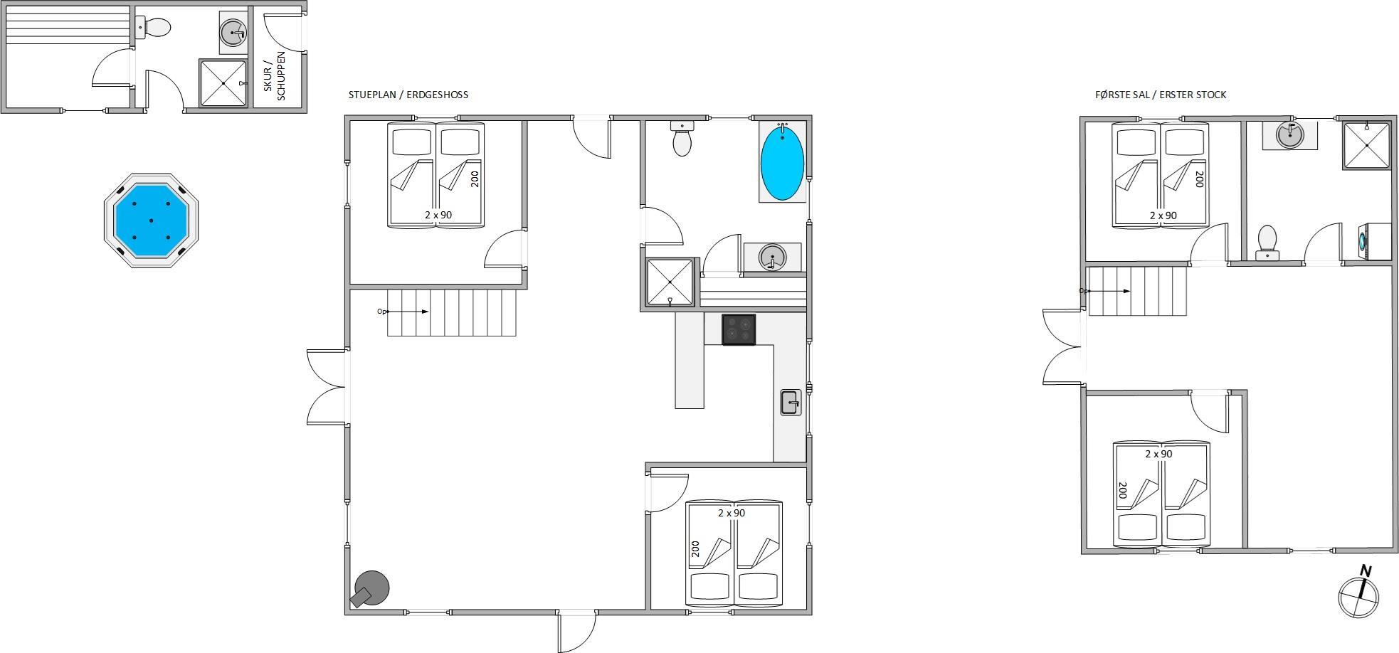 Med en rummelig boligareal på 177 m2 byder sommerhuset i Blåvand på nok plads til op til otte personer. De fire veludstyrede soveværelser med komfortable dobbeltsenge sikrer en god nats søvn, og de tre stilfulde badeværelser, hvoraf det ene har gulvvarme, gør jeres ophold endnu mere bekvemt. Hvert rum giver rig mulighed for at finde fredfyldte øjeblikke til sig selv.