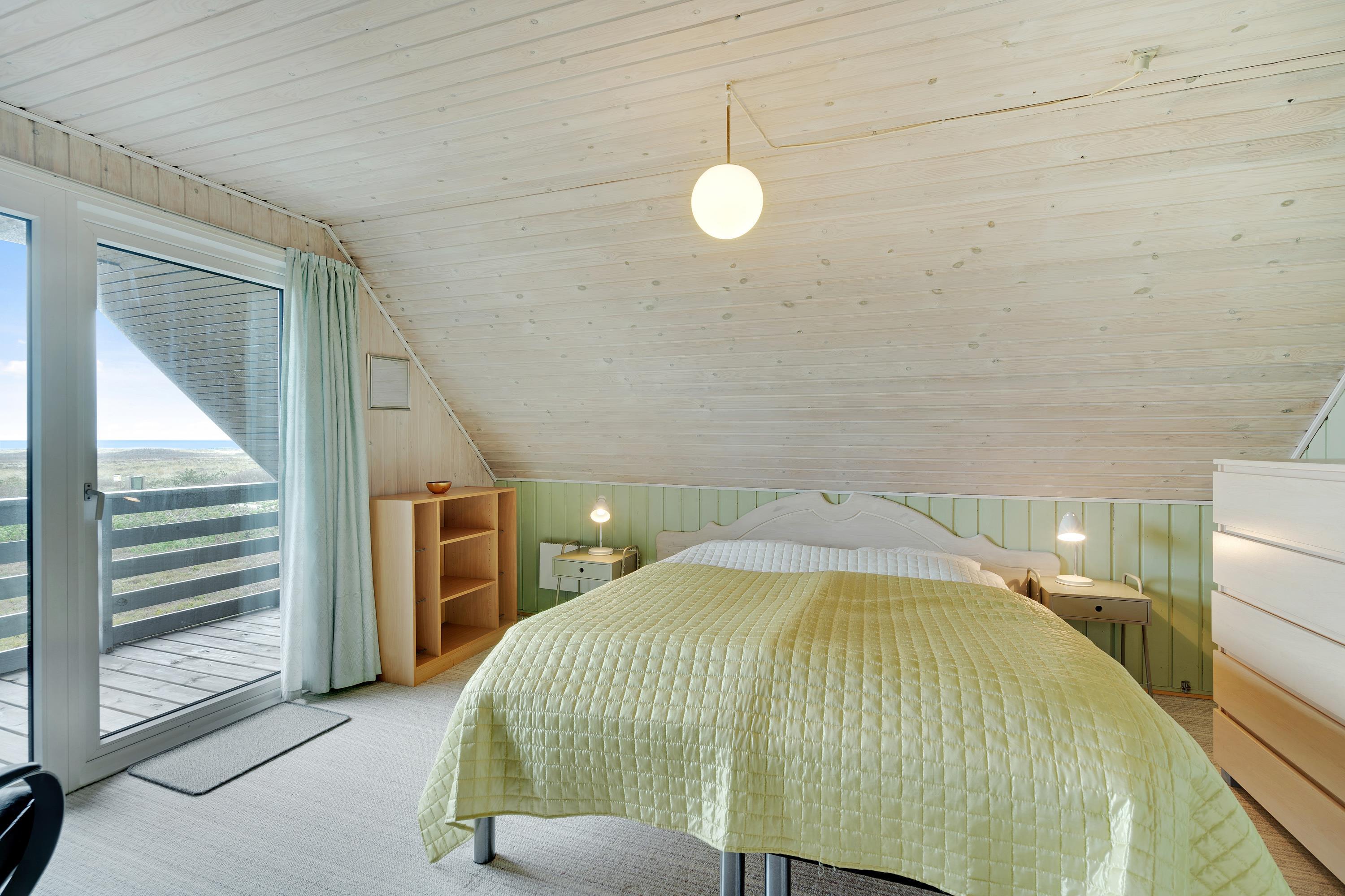 To af sommerhusets 3 soveværelser ligger på førstesalen, og fra det sydlige soveværelse er der udgang til en balkon med havudsigt.