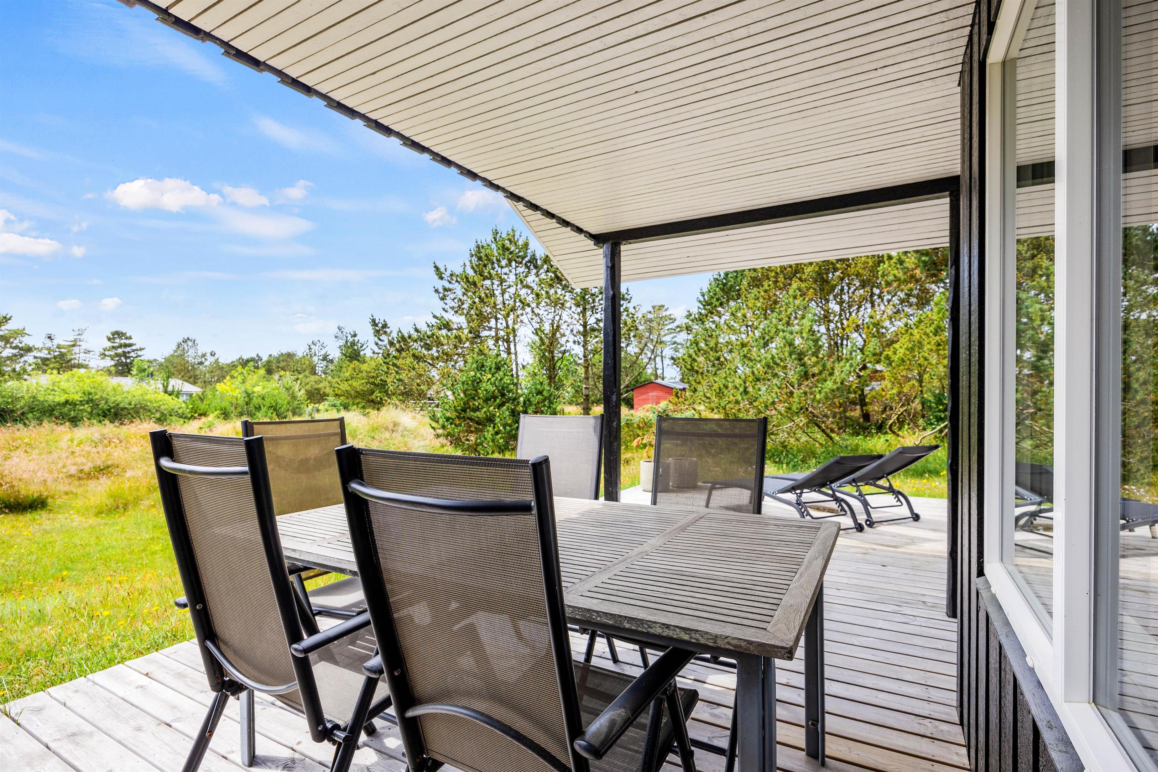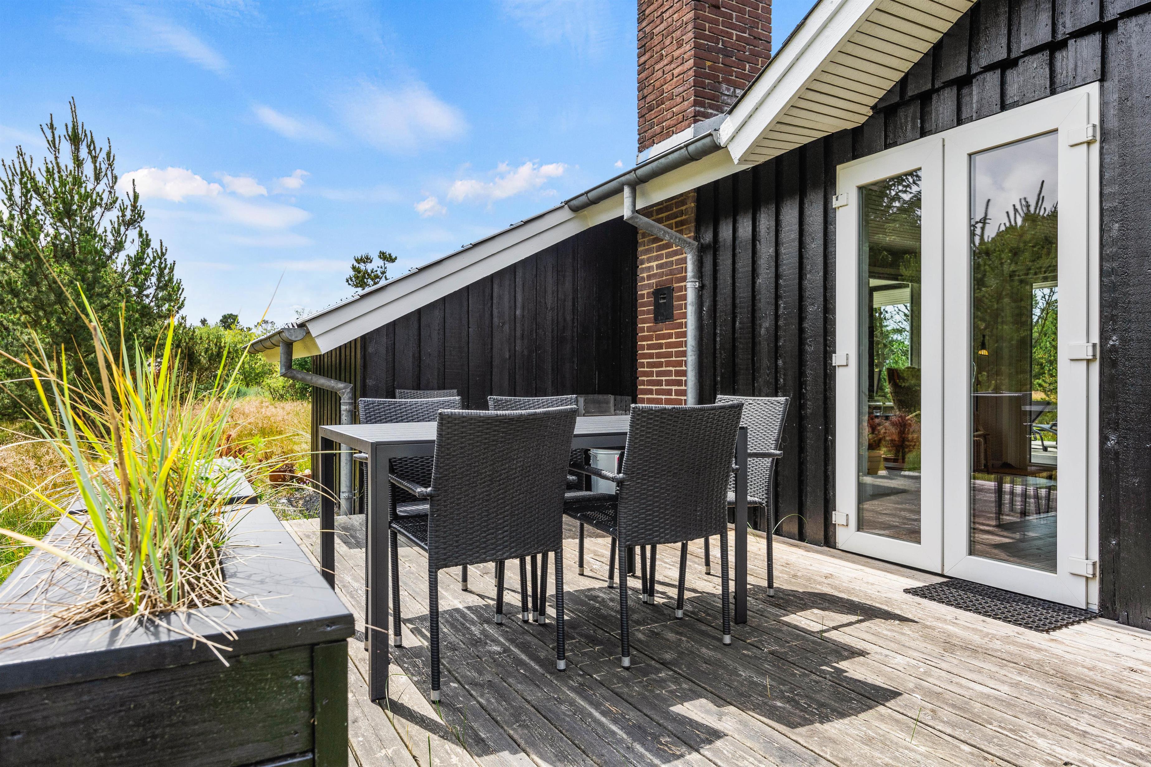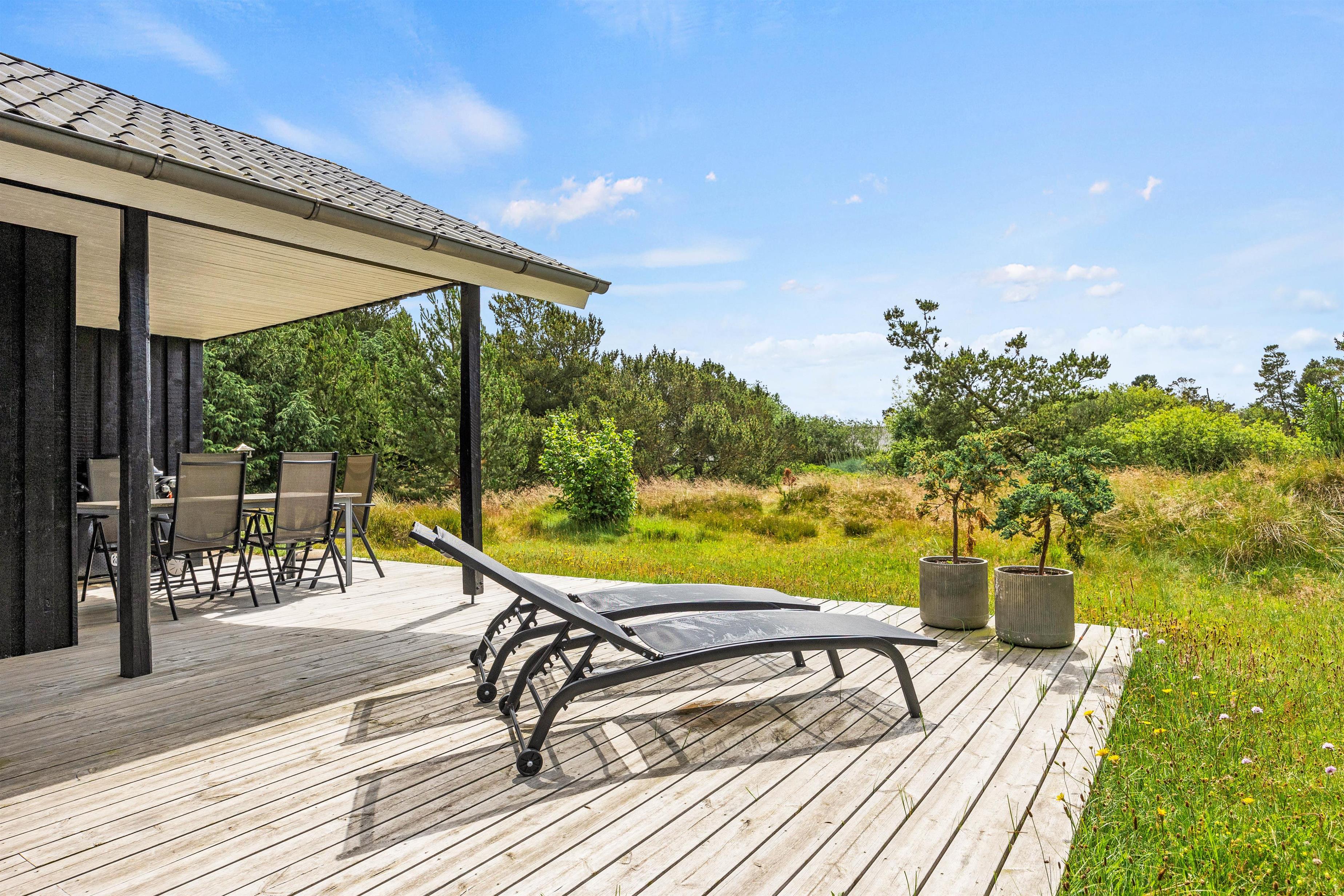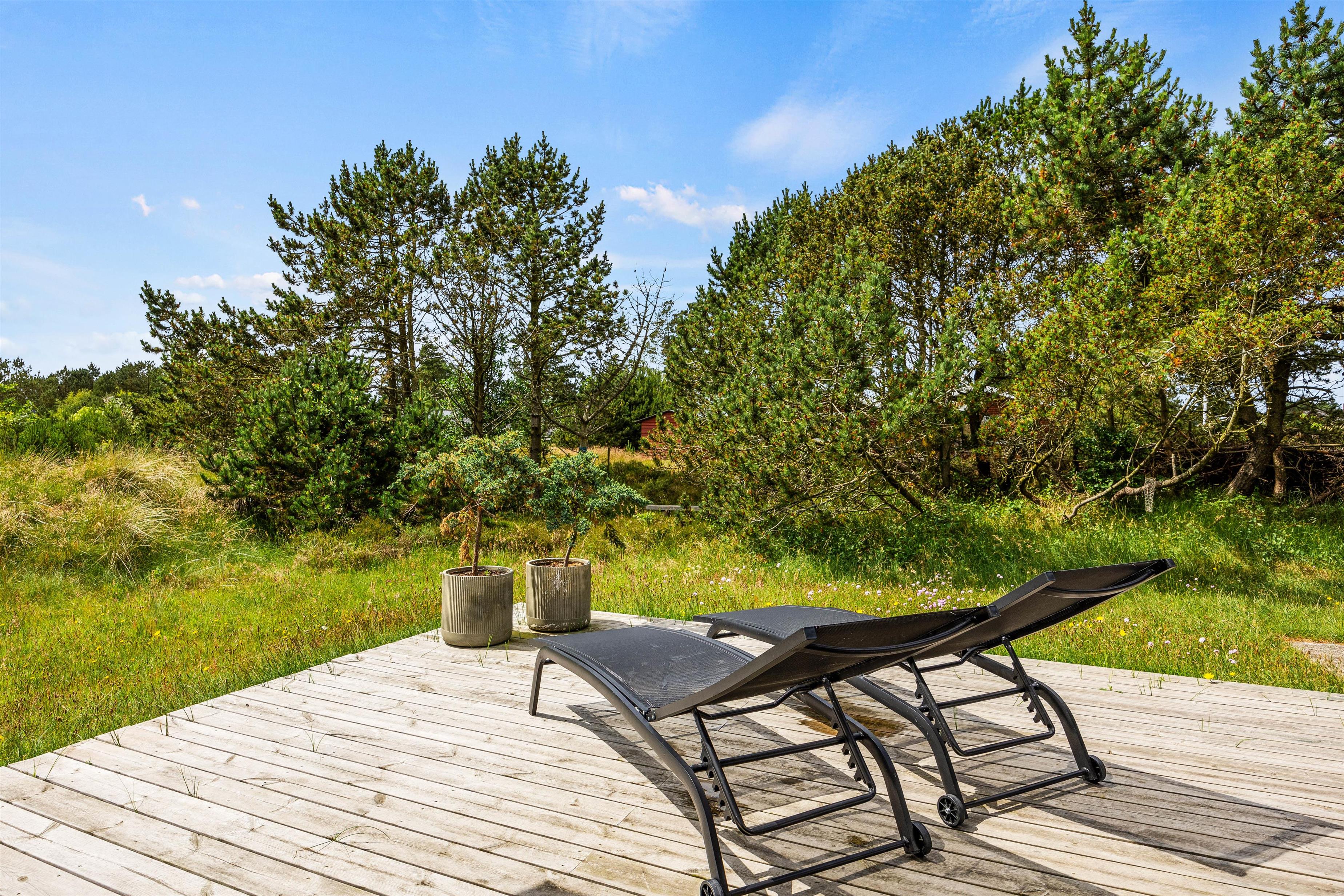 På de solrige dage kan I flytte ferien ud på sommerhusets terrasser. Her har I både havemøbler og liggestole til rådighed, så I kan finde jer godt til rette på en plads i solen, hvor I virkelig kan nyde varmen og lyden af fuglefløjt i baggrunden.