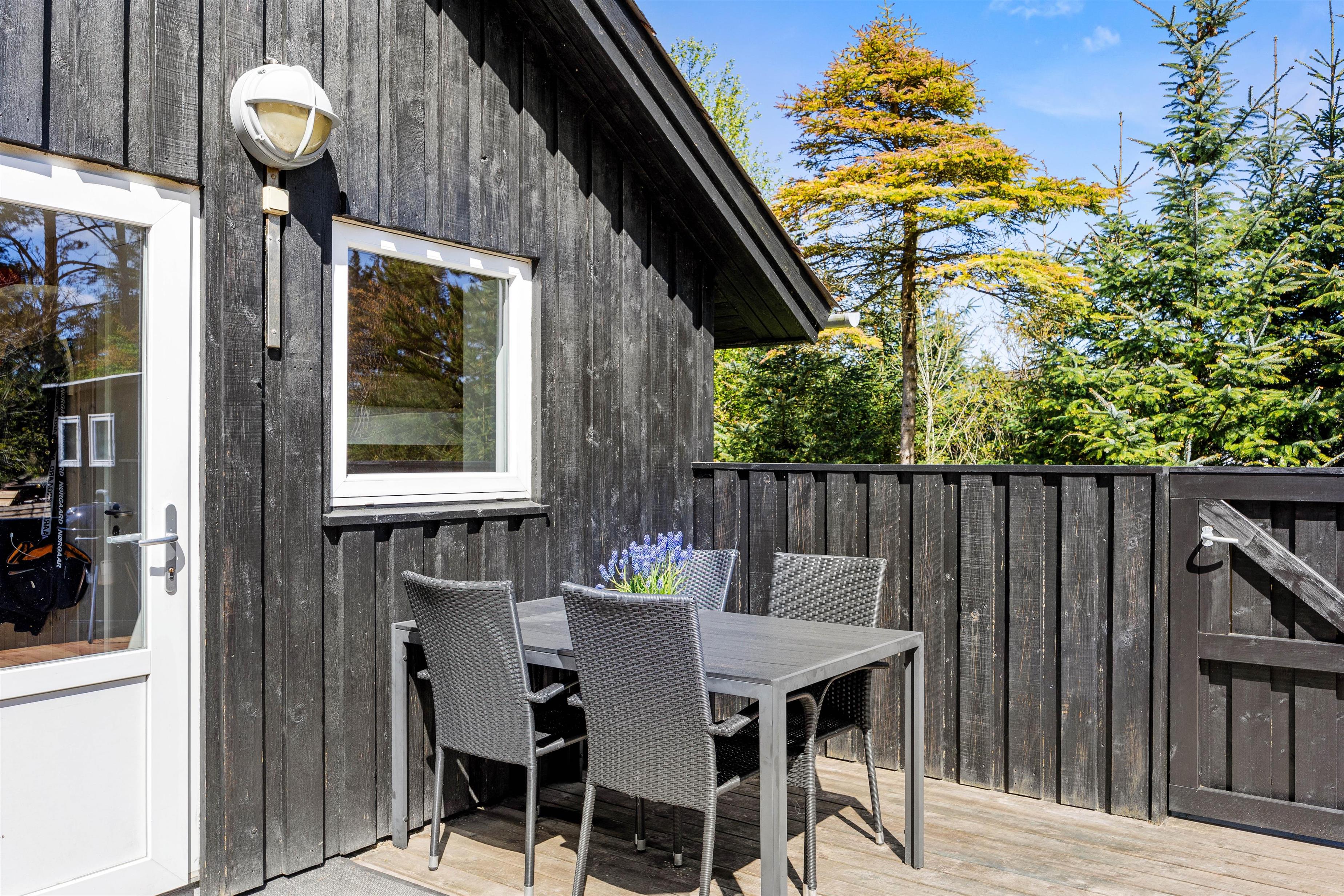 På sommerhusets terrasser står havemøbler og grill klar, så I kan nyde den friske luft og de smukke, vestjyske omgivelser i fulde drag, og hvis I er heldige, kigger de lokale, vilde dyr forbi i haven - alene det at betragte fuglenes leg ved foderautomaten nær stuevinduerne gør én glad i sjælen. Fra baghaven er der nem og direkte gennemgang til hundeskoven, som ligger lige på den anden side af grunden, kun 160 meter derfra, og blot 500 meter fra huset finder I en almindelig skov til en velgørende gåtur mellem høje grantræer.