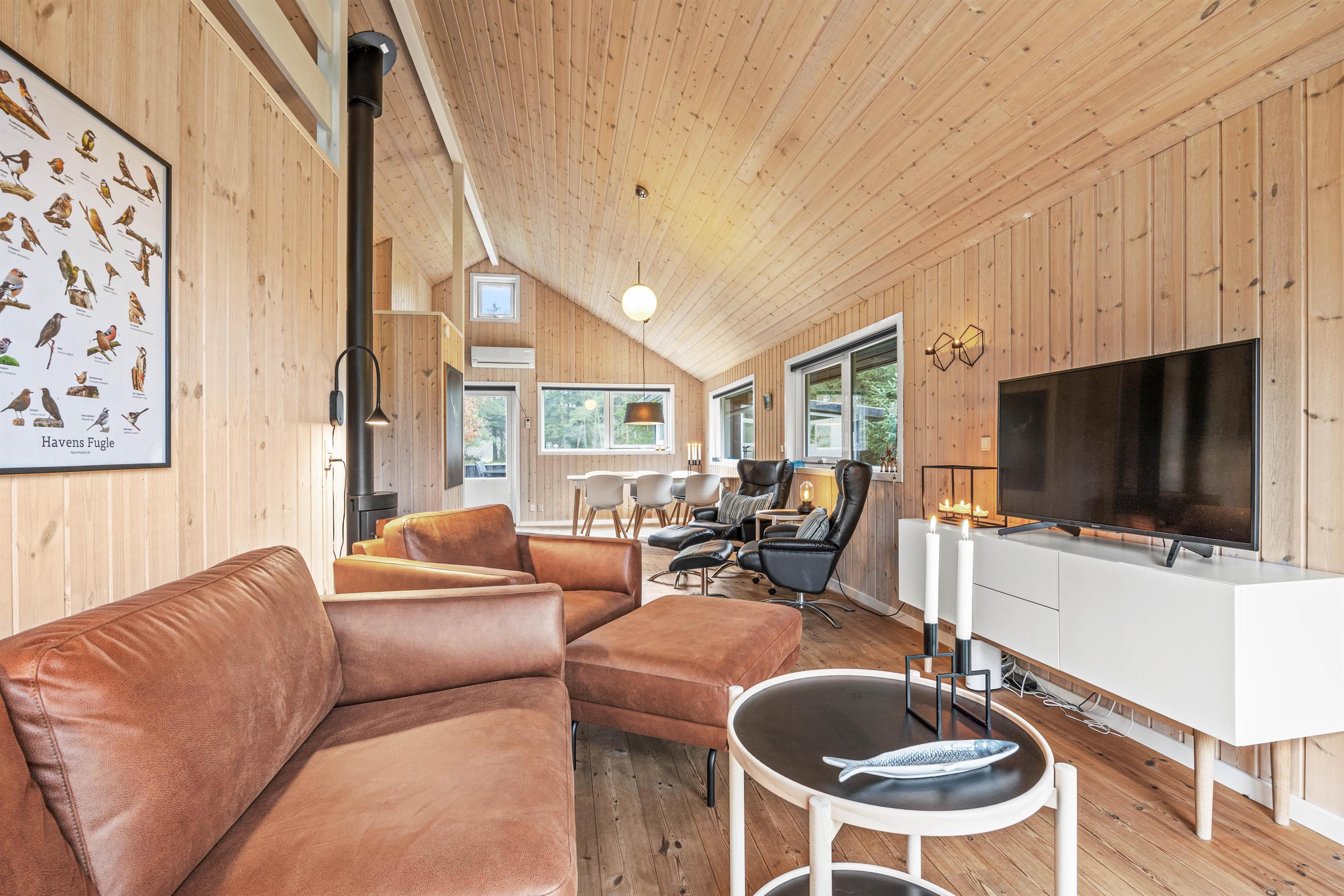 Sommerhusets hjerte er opholdsrummet bygget op i kip for en god rumfølelse. Her er samvær og nærvær i fokus - her kan I alle samles, uanset om I er 6 eller 2 personer afsted, i fredelige omgivelser langt væk fra hverdagens stress. Flad ud i den behagelige sofa eller læn jer tilbage i lænestolen med en god bog, mens brændeovnens flammer knitrer og på alle måder fylder huset med varme. Det er ferie, når det er bedst.