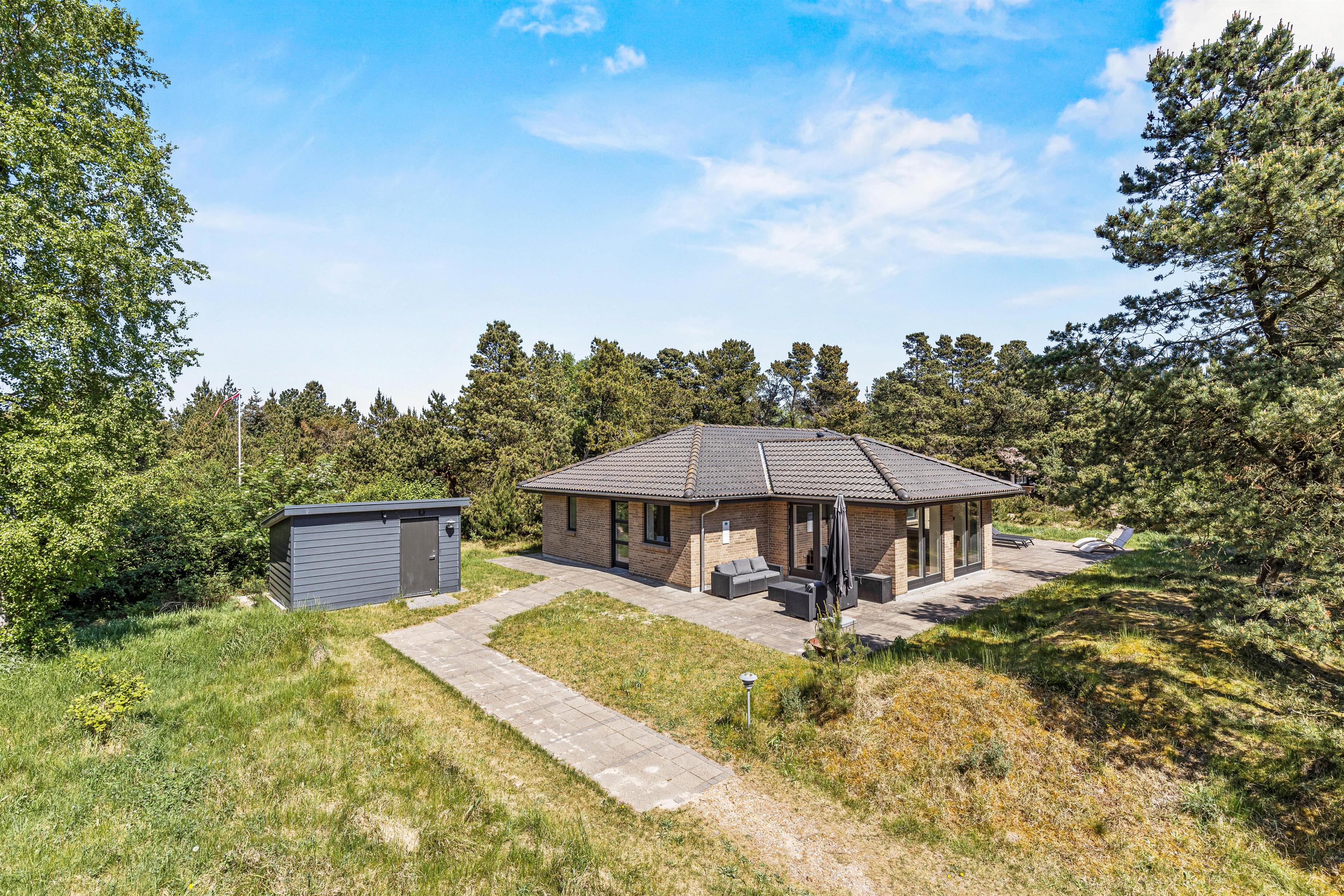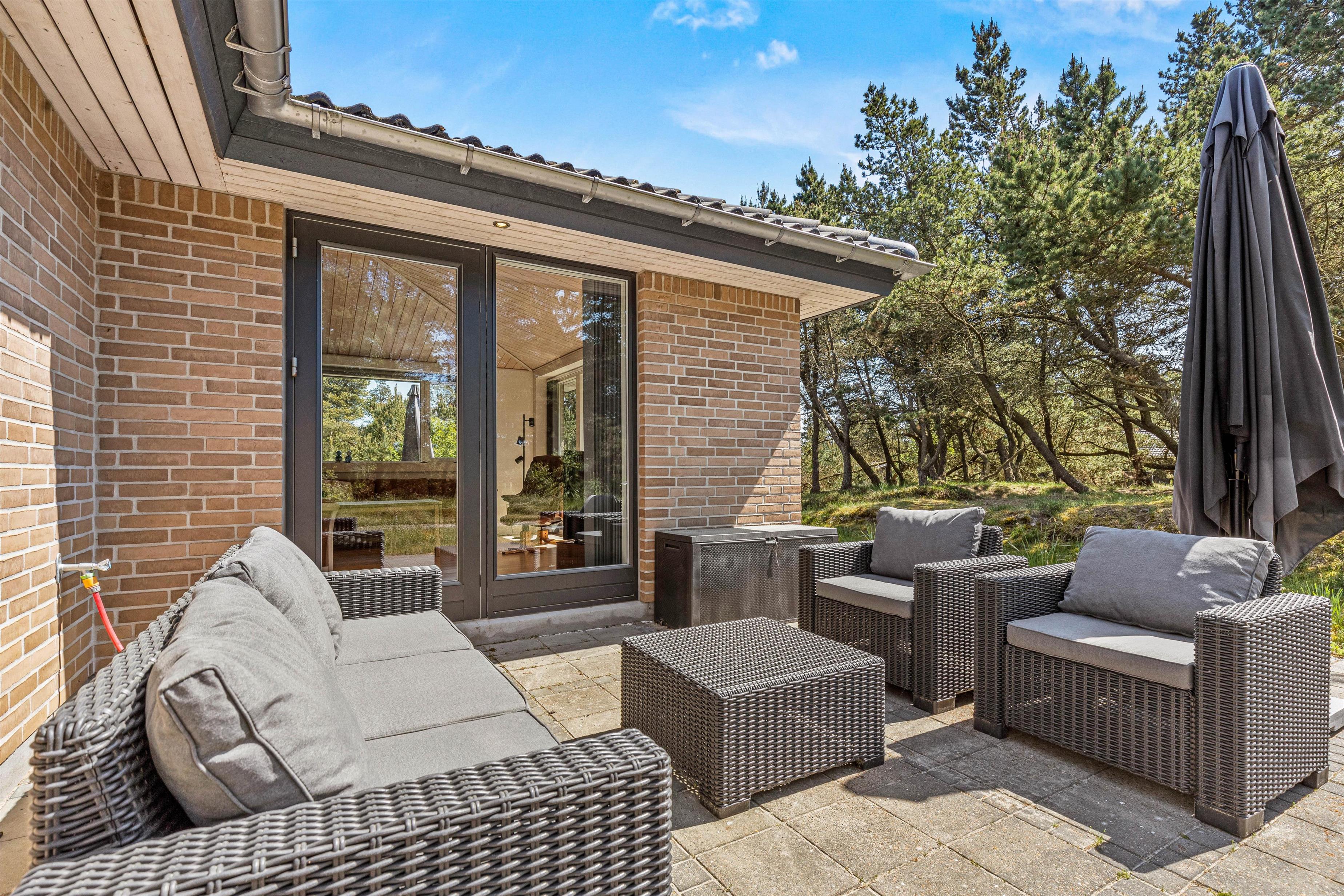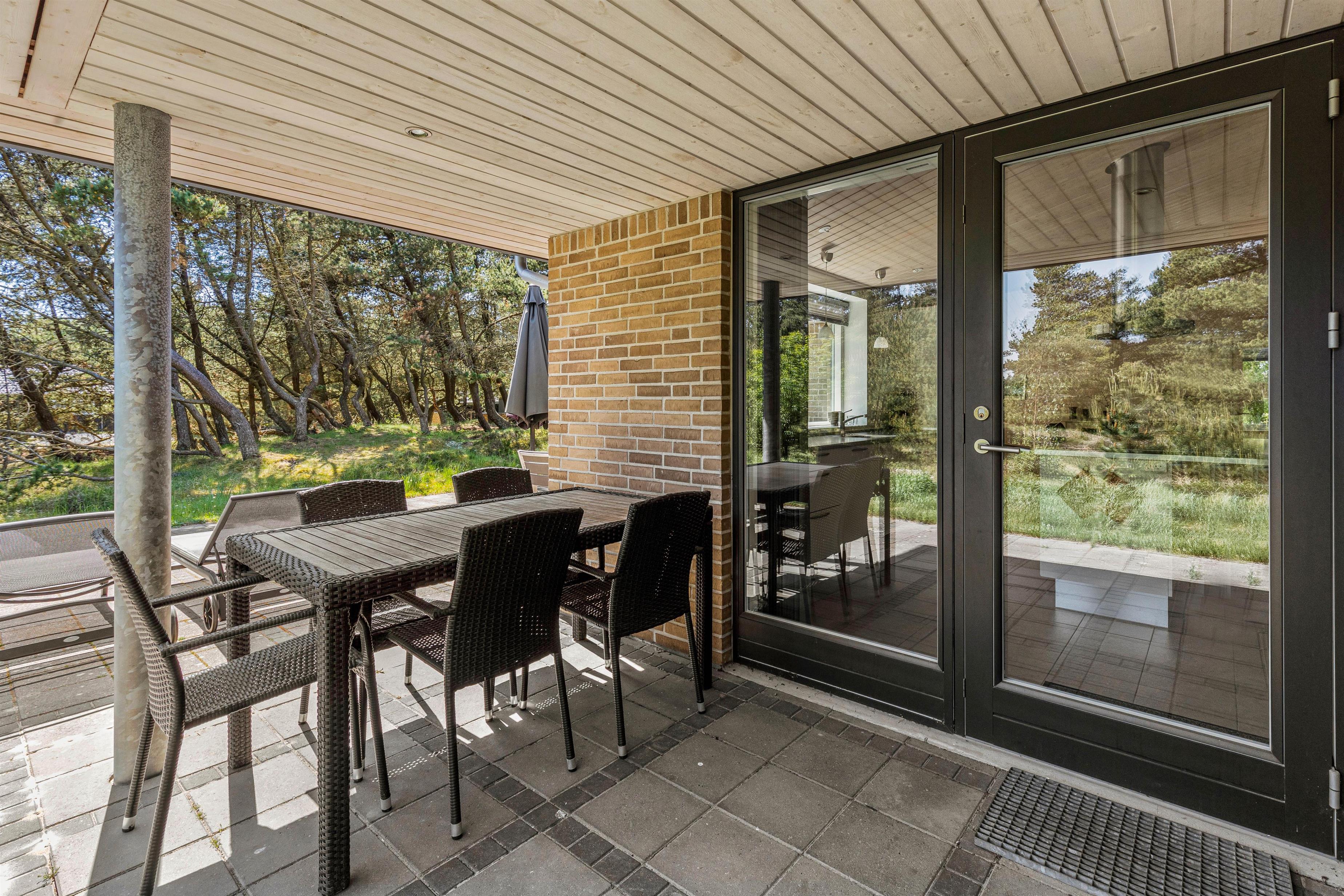 Fra sommerhuset kan I træde ud på den skønne, delvist overdækkede terrasse, som er det oplagte sted for jer at tilbringe de solrige dage af jeres ferie. På terrassen kan I finde jer til rette i havemøbler og liggestole, mens I nyder solen og lyden af fuglefløjt i baggrunden.