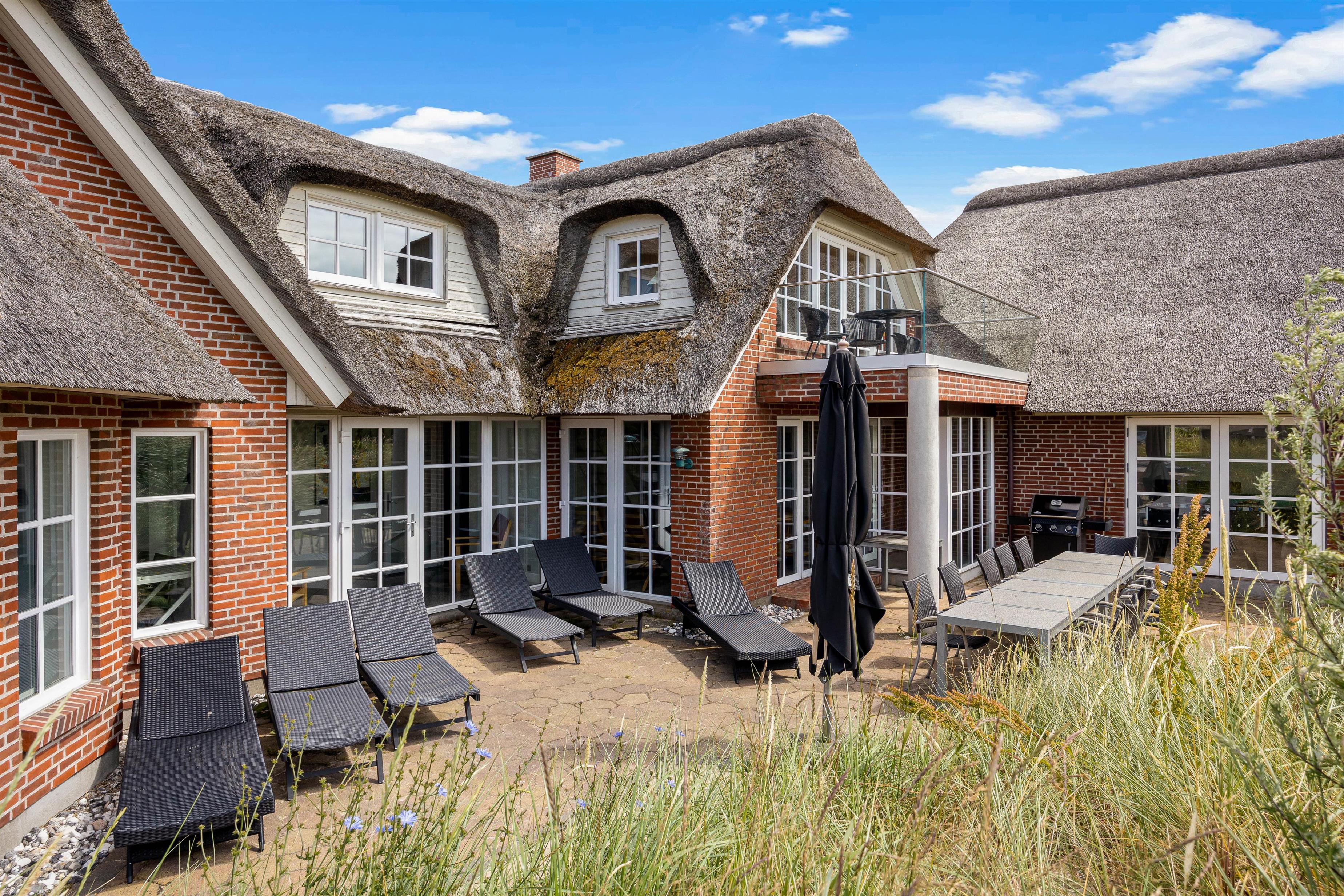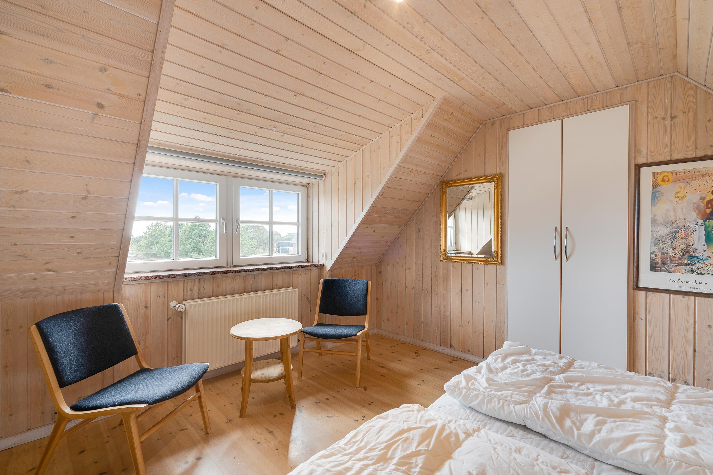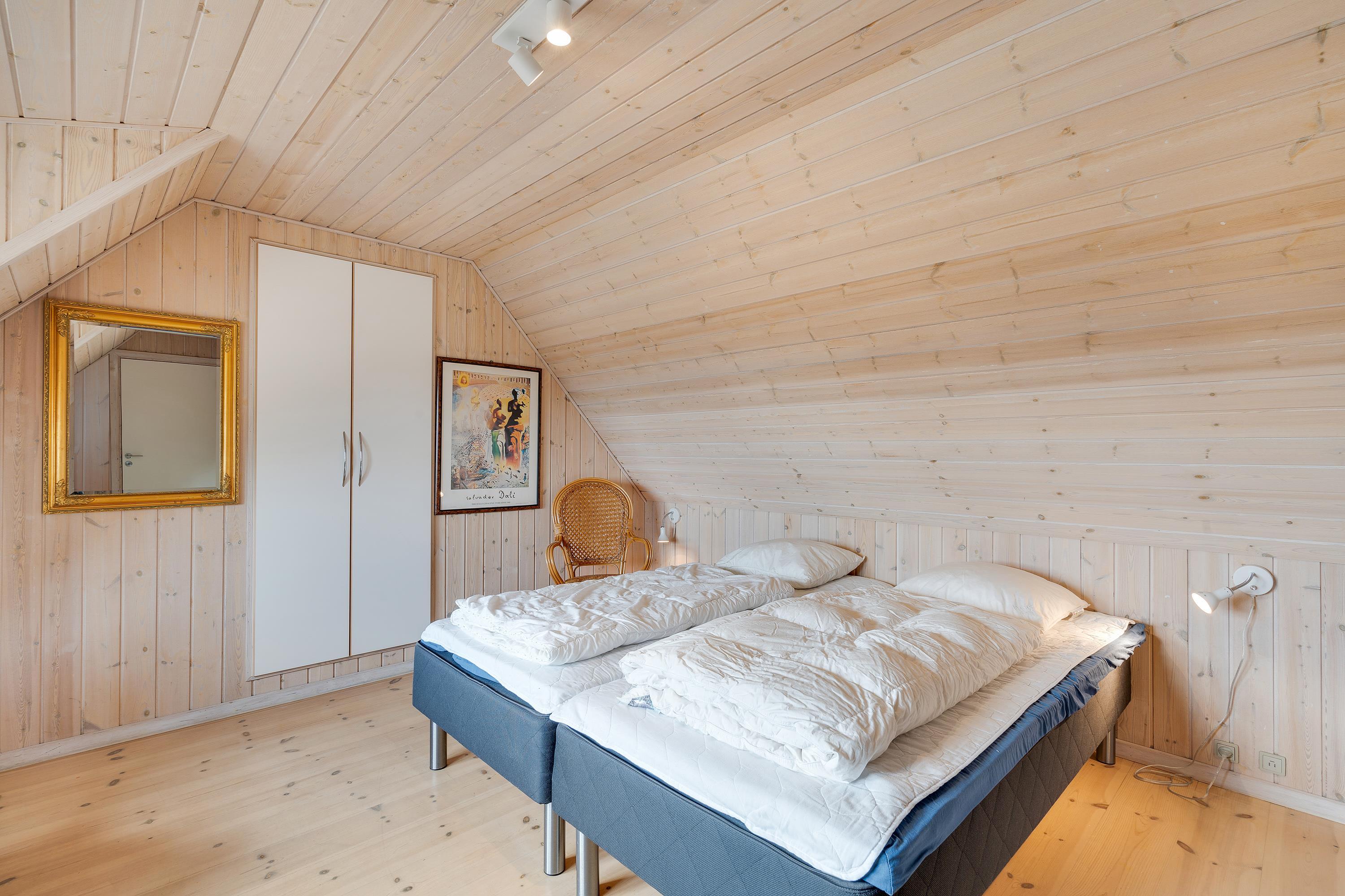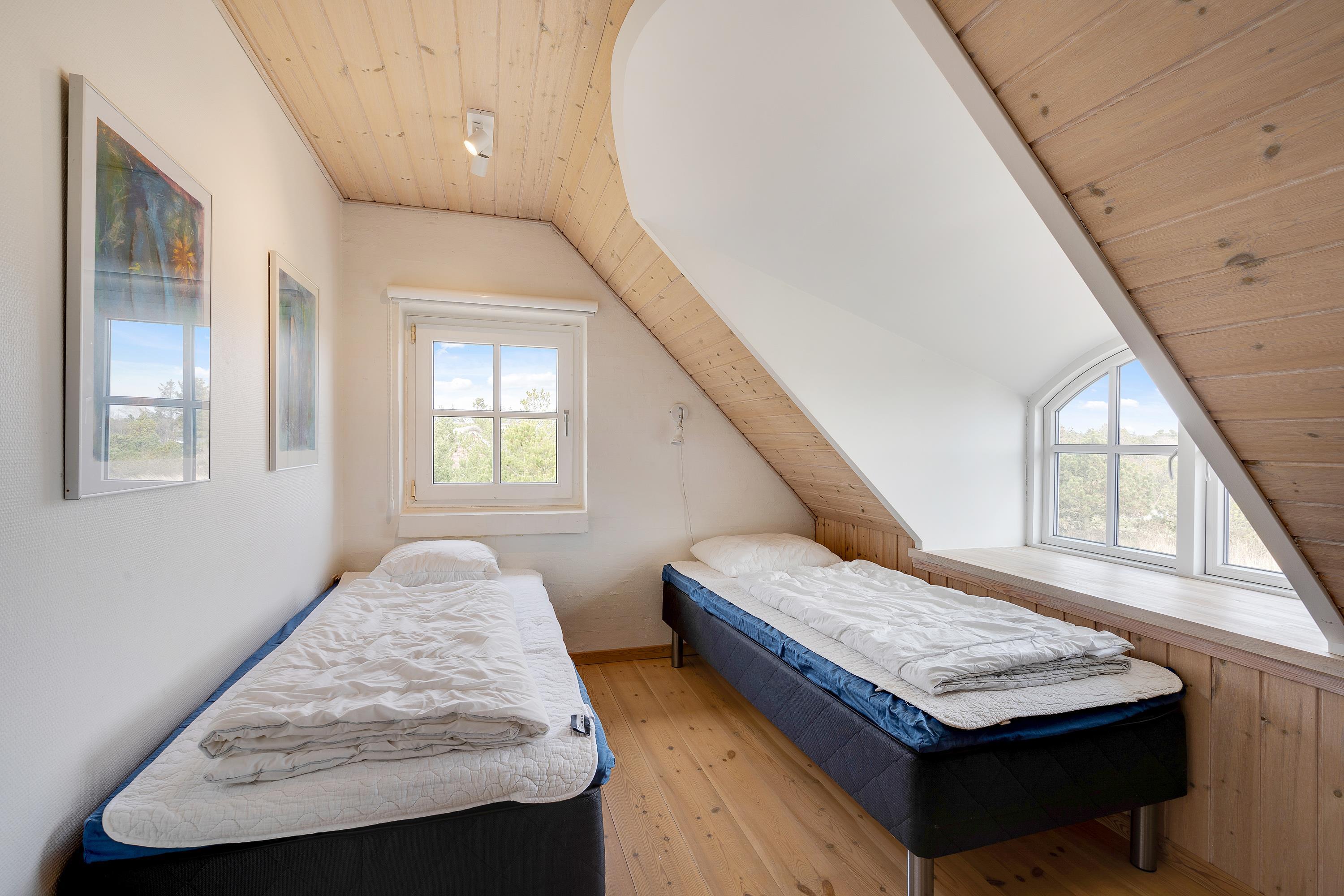 Sommerhuset er særdeles velindrettet, så der er god plads til alle 12 feriegæster. På feriehusets 2 etager finder I 6 soveværelser, 2 badeværelser med gulvvarme og 1 gæstetoilet. Fra stuen på førstesalen kan I træde ud på en altan, hvorfra I kan nyde en dejlig udsigt over området.