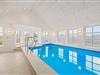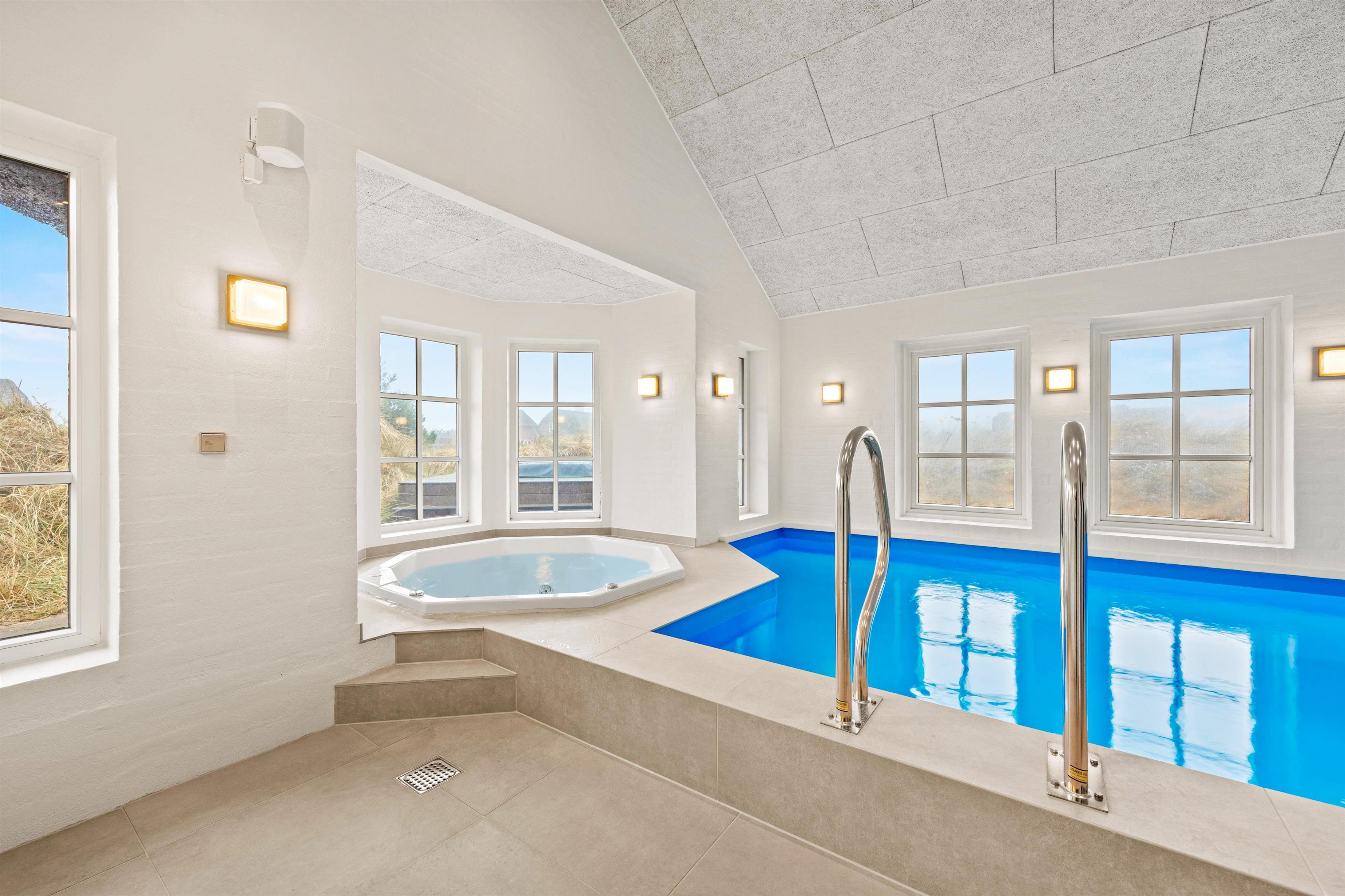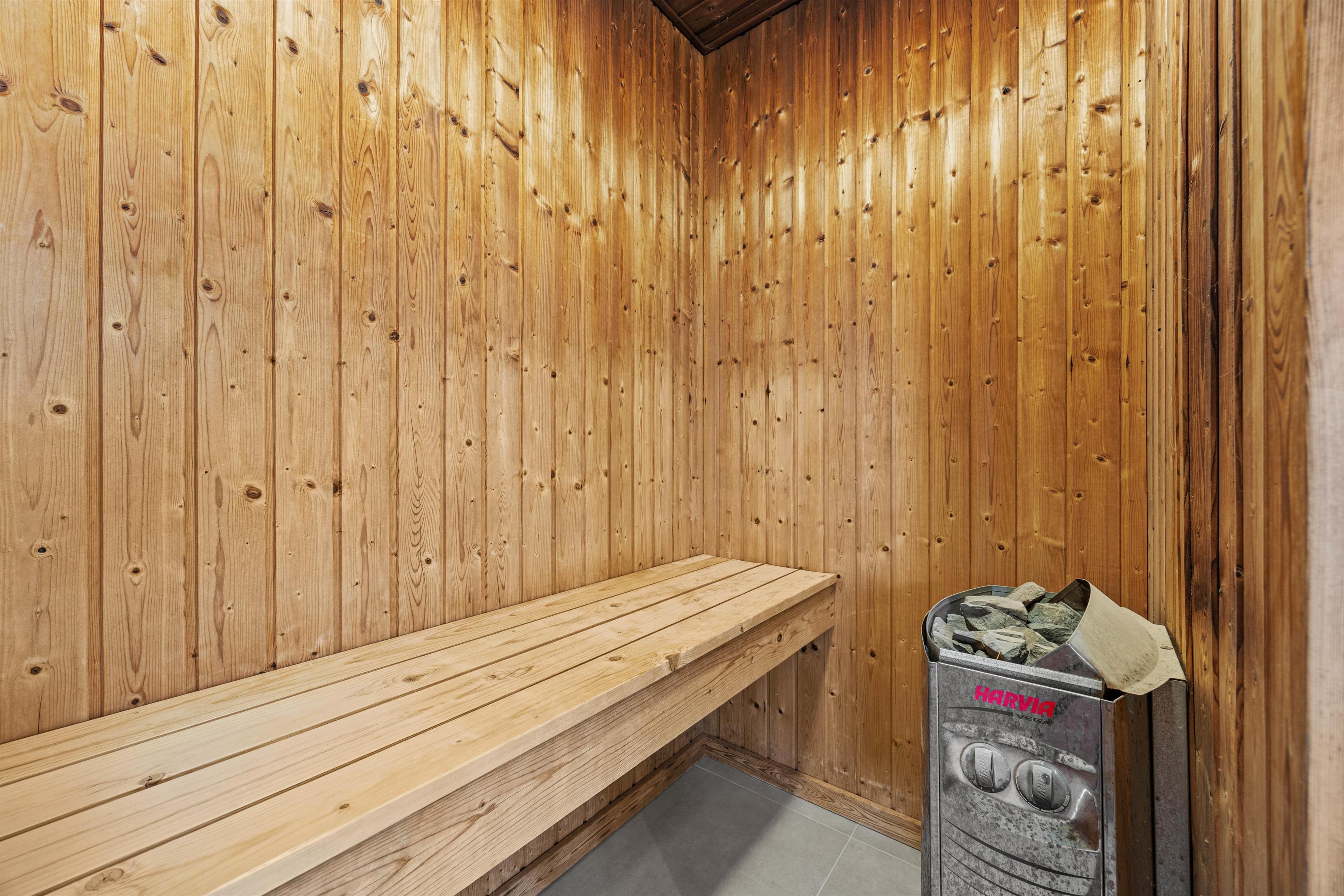 Et af de store højdepunkter i sommerhuset er det store poolrum. Her står den 20 kvadratmeter store swimmingpool med svømmetræner klar til de friske vandhunde. Her er der lagt op til mange timers sjov og leg i vandet. Poolen er udstyret med automatisk klorreguleringssystem for et bedre bademiljø og dermed en bedre oplevelse. Efterfølgende kan I hoppe en tur i saunaen for at komme helt ned i gear igen.