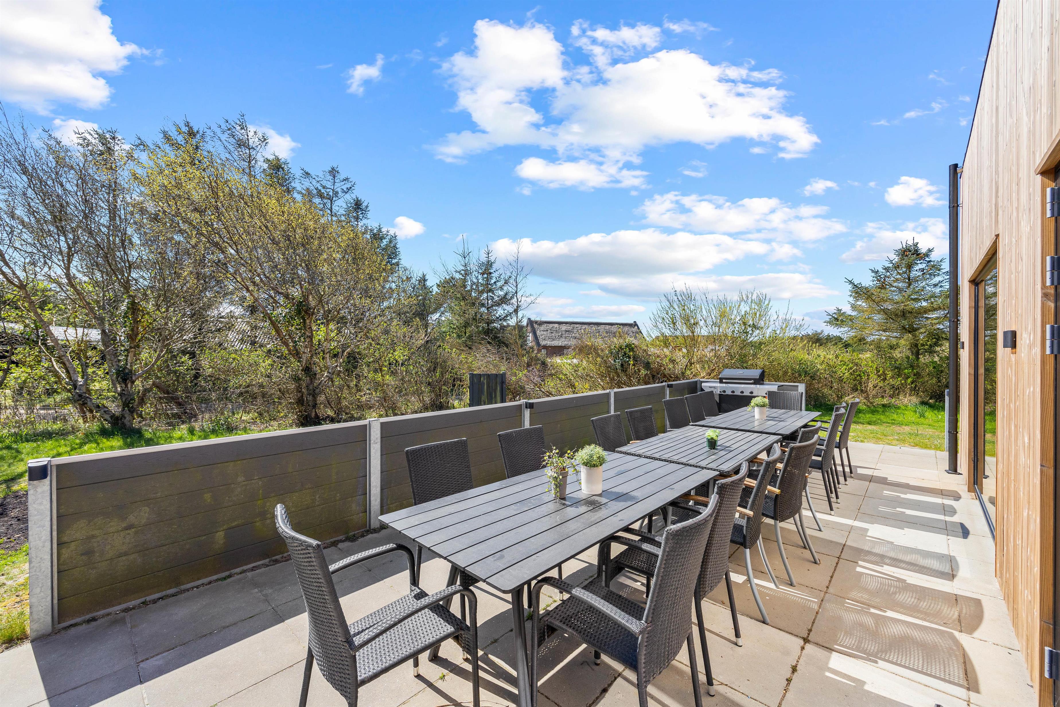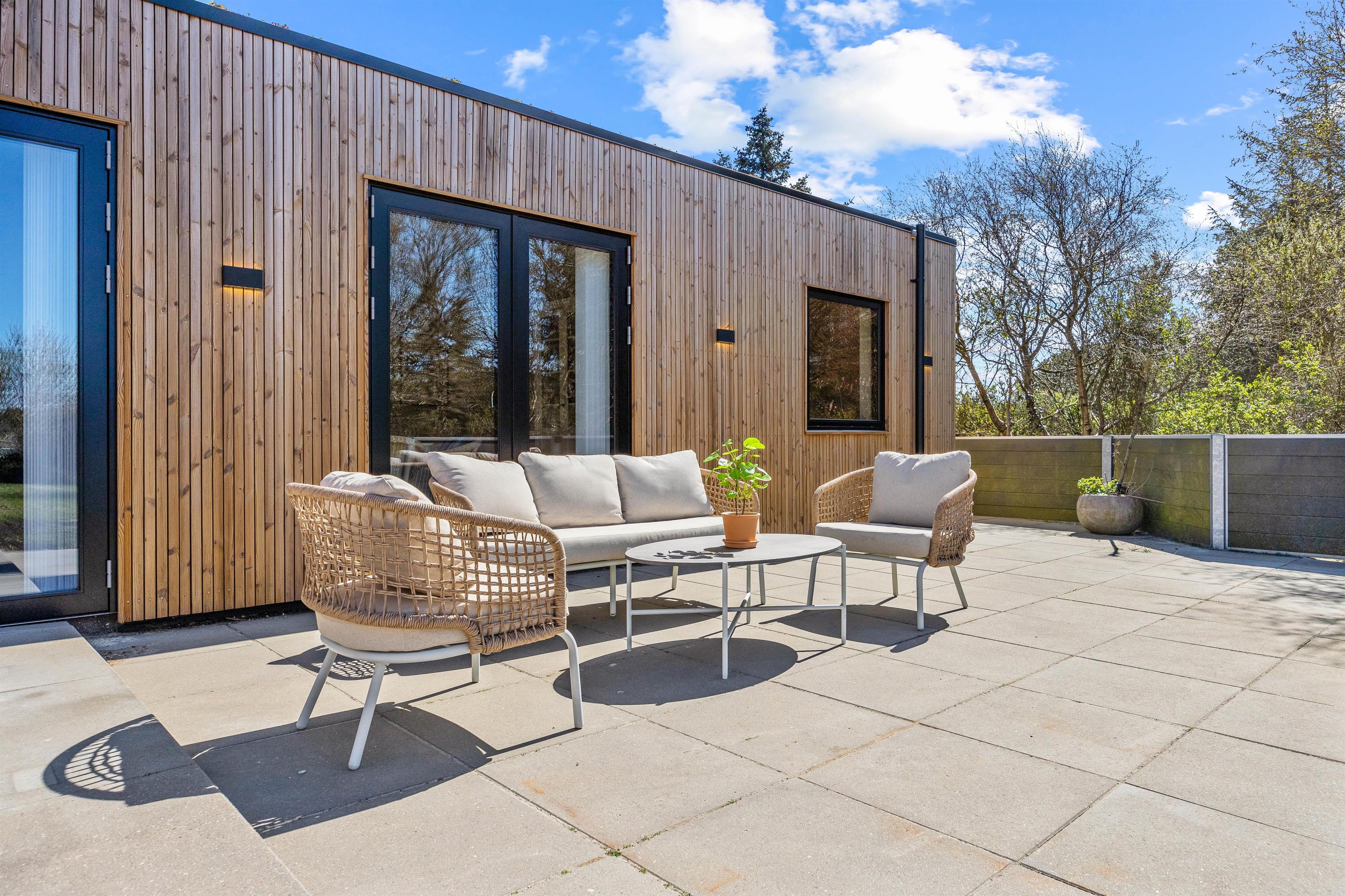 På sommerhusets udeområde kan både store og små se frem til at tilbringe nogle skønne, solrige feriedage. Her venter jer en stor terrasse, hvor I kan nyde ferien fra havemøblerne og liggestolene.