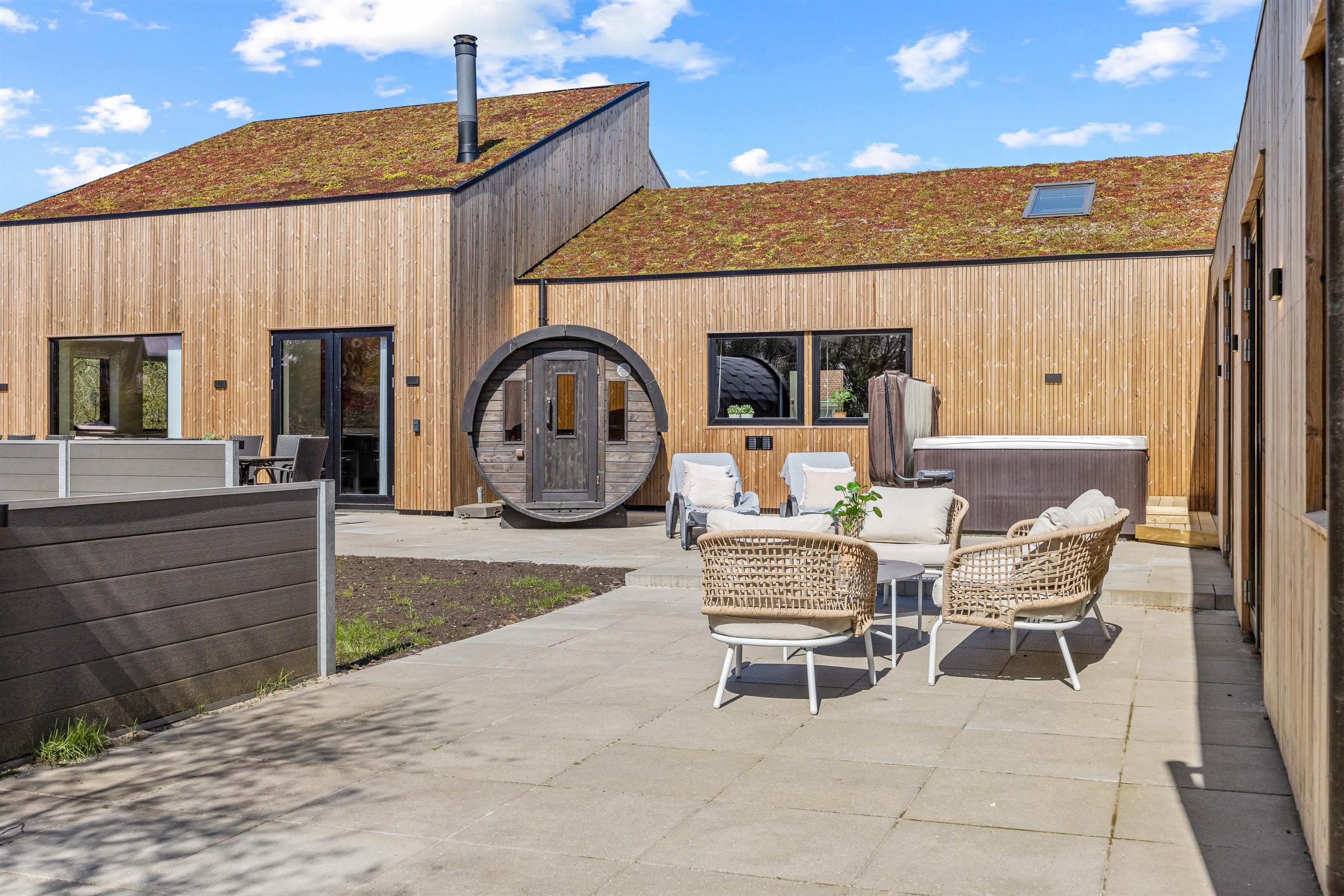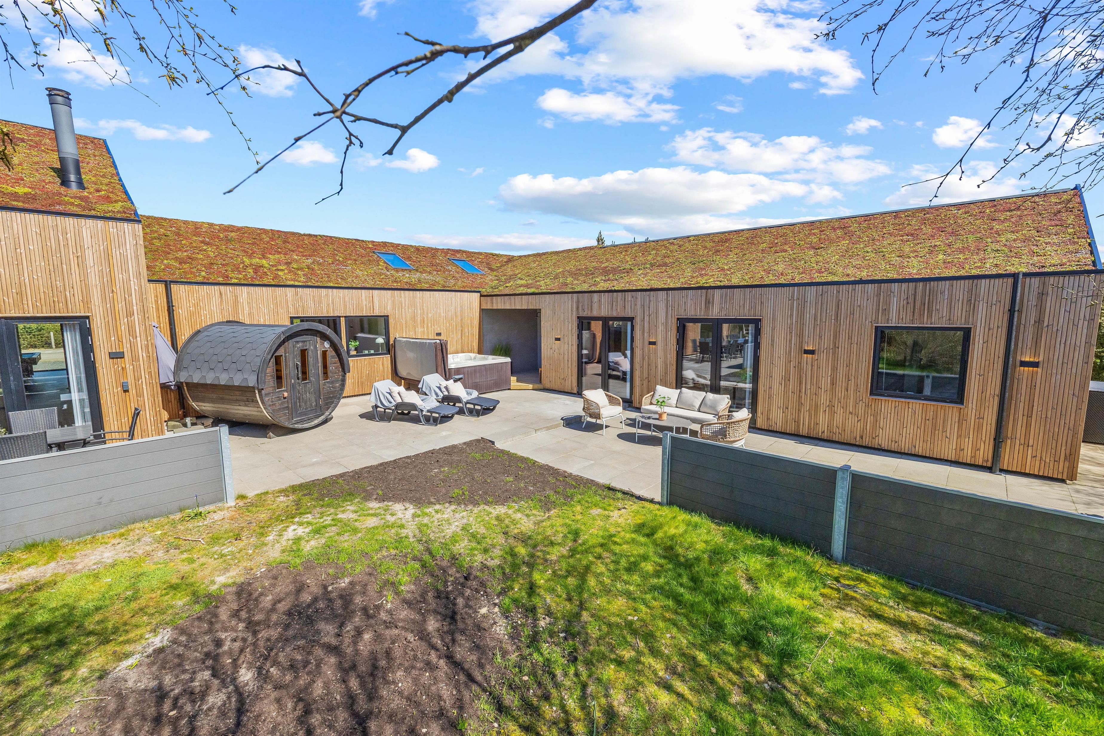 Terrasse, udesauna, udespa, udebruser, sandkasse og gyngestativ