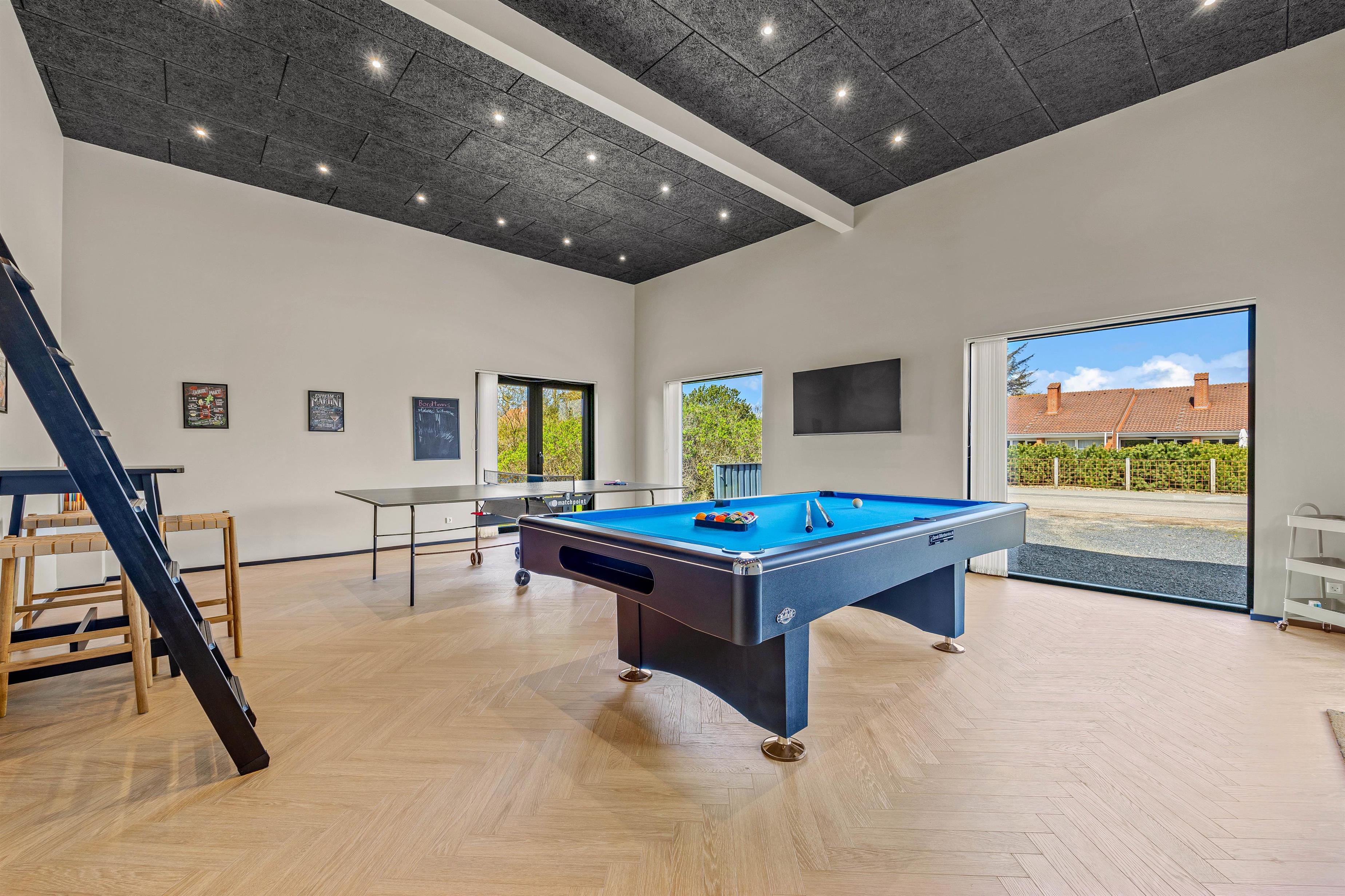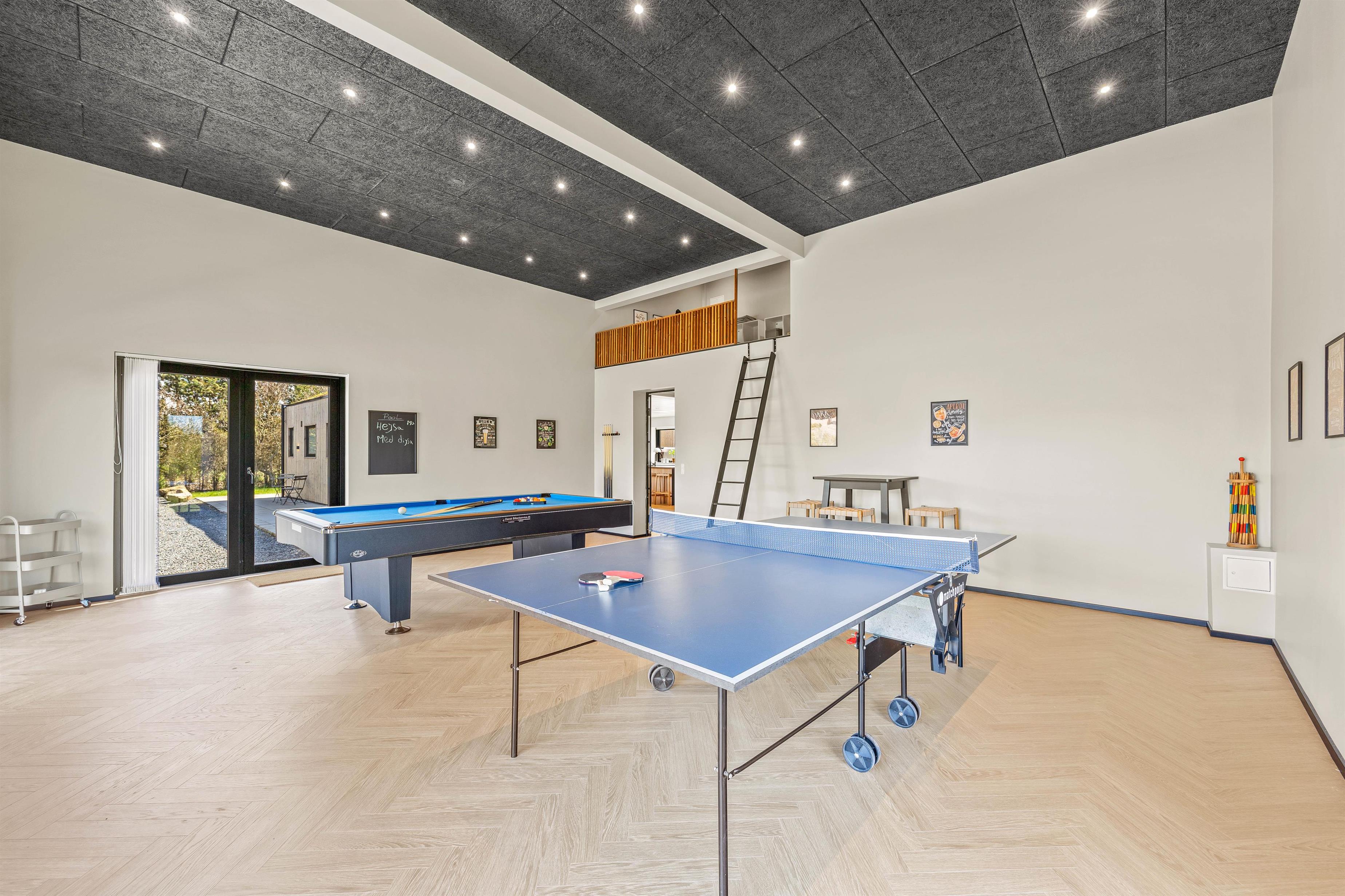 Et af sommerhusets højdepunkter er aktivitetsrummet, hvor I helt sikkert kommer til at tilbringe mange sjove timer sammen i løbet af ferien. Her kan I både spille billard og bordtennis, og I kan også afholde en spilaften med turneringer for at finde ud af, hvem der er den bedste til billard og bordtennis.