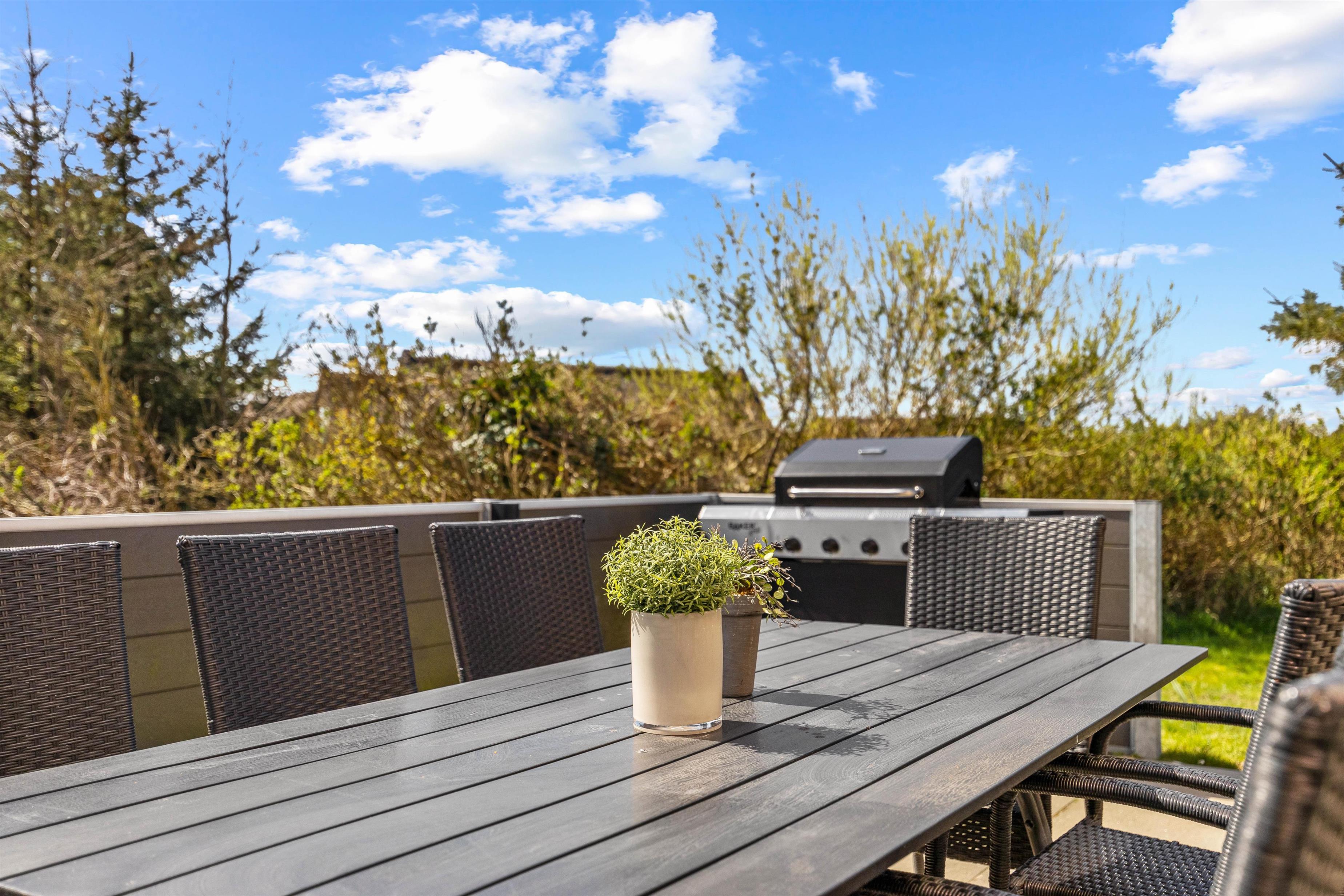 Som aftenen så småt begynder at nærme sig, kan I samle hele ferieflokken på terrassen, hvor I kan tilberede aftensmaden på sommerhusets gasgrill.