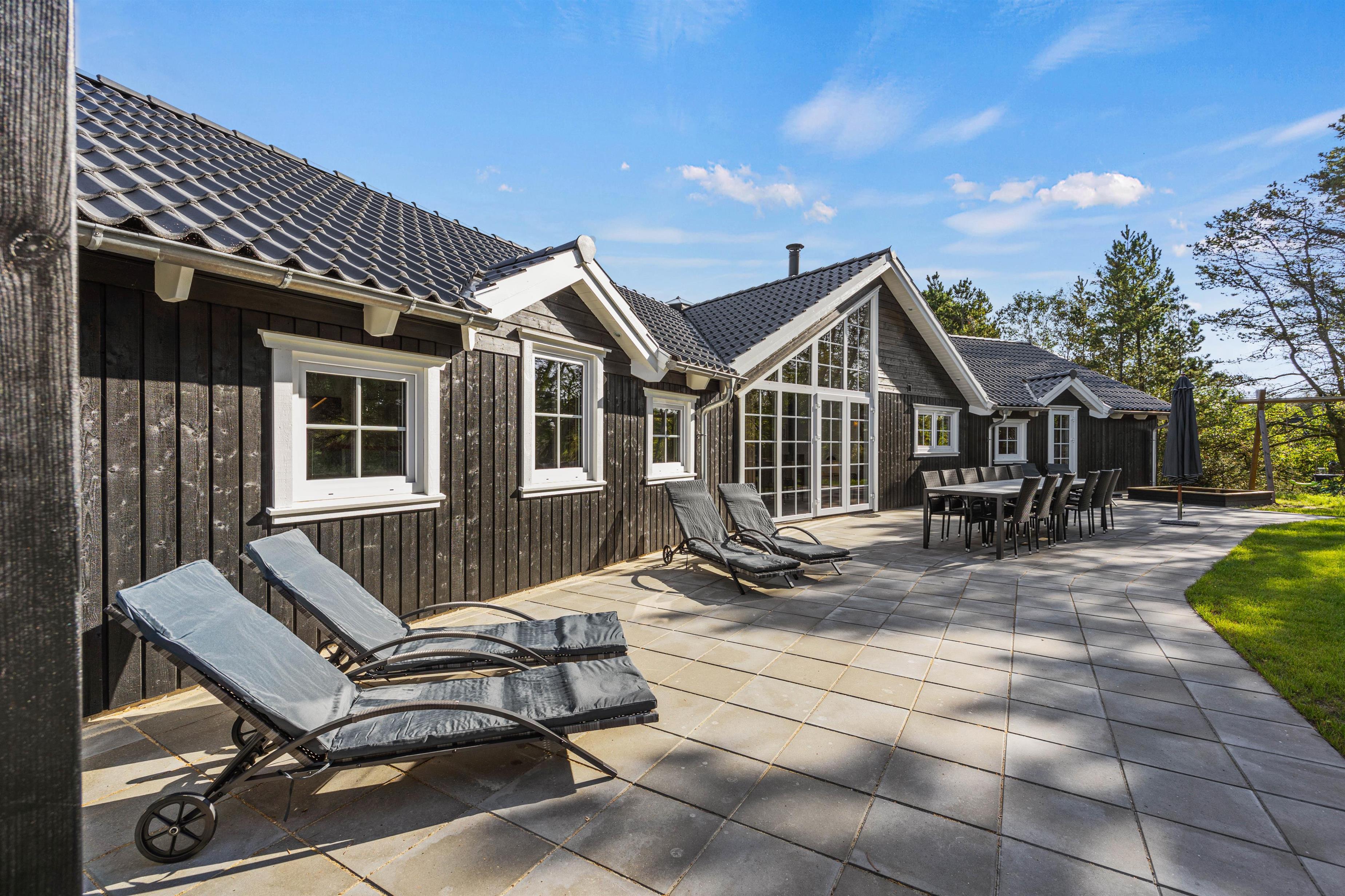 Sommerhusets udeområde er det oplagte sted at tilbringe feriens solrige dage. Her venter jer en åben terrasse, hvor I kan sætte jer i havemøbler og liggestole, mens I slapper af i solen. På lune ferieaftener kan I samle hele ferieflokken på terrassen til en lækker middag, som I kan tilberede på sommerhusets gasgrill.