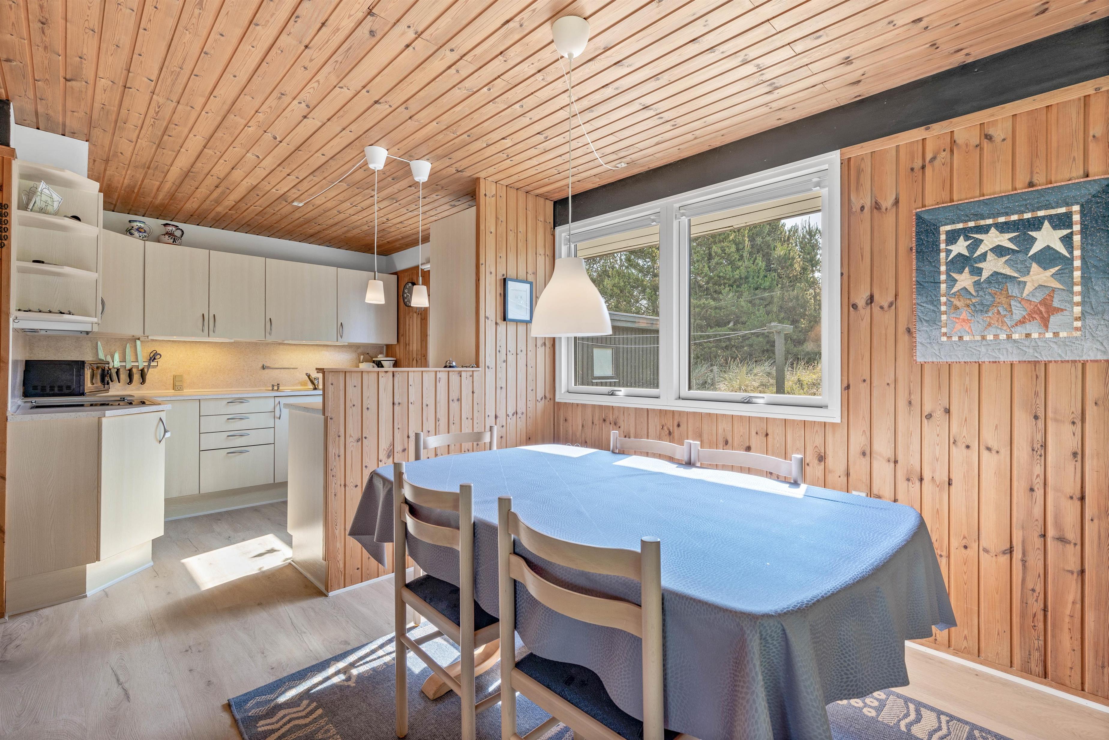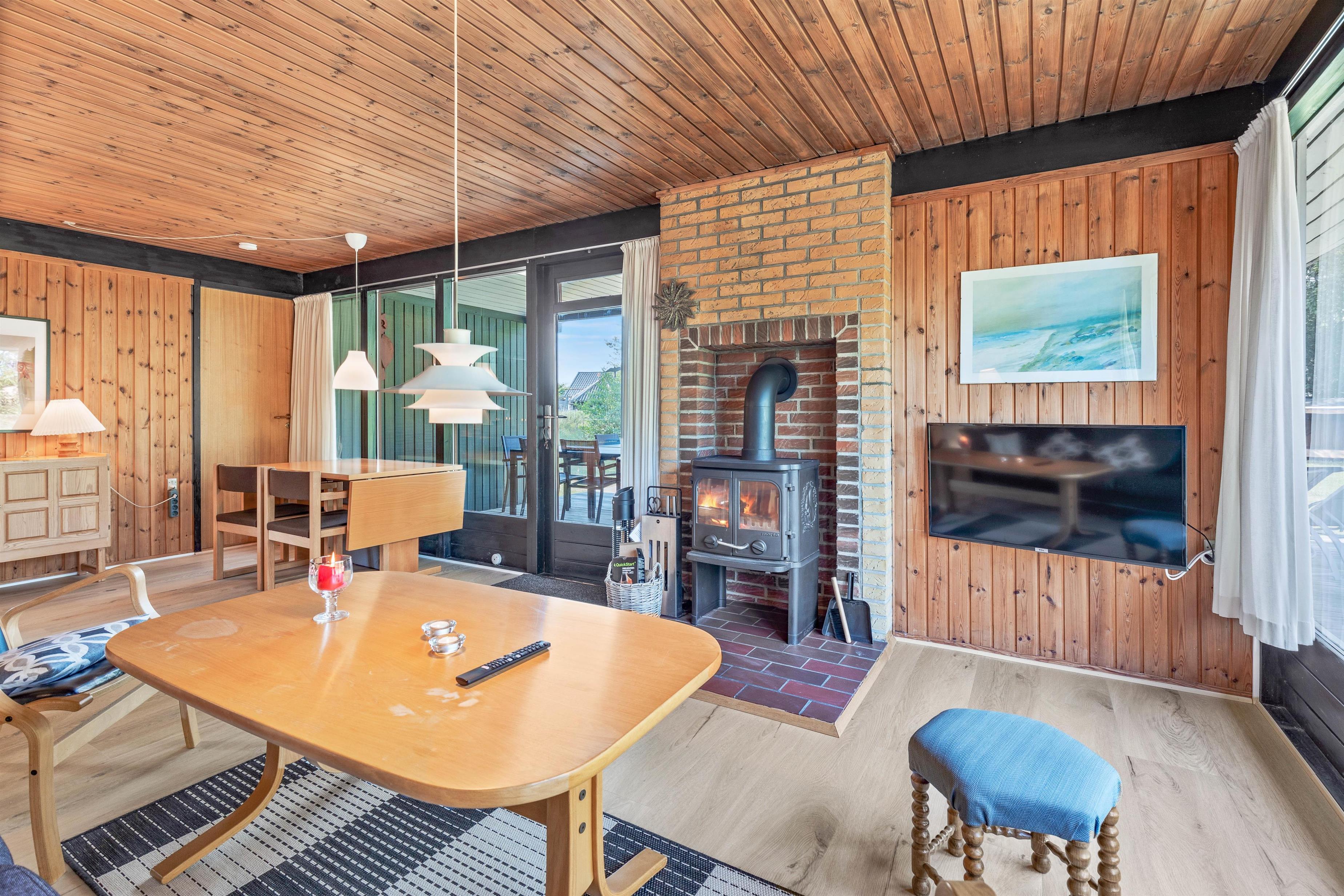 Hjertet i det 74 kvadratmeter store sommerhus er uden tvivl alrummet, der forener køkken, spiseplads og stue. Her vil I helt sikkert tilbringe mange gode feriestunder med mad, spil og film til lyden af brændeovnens knitren i baggrunden, der fuldender den hyggelige stemning, mens den også spreder dejlig varme i rummet. Der er desuden gratis brænde.