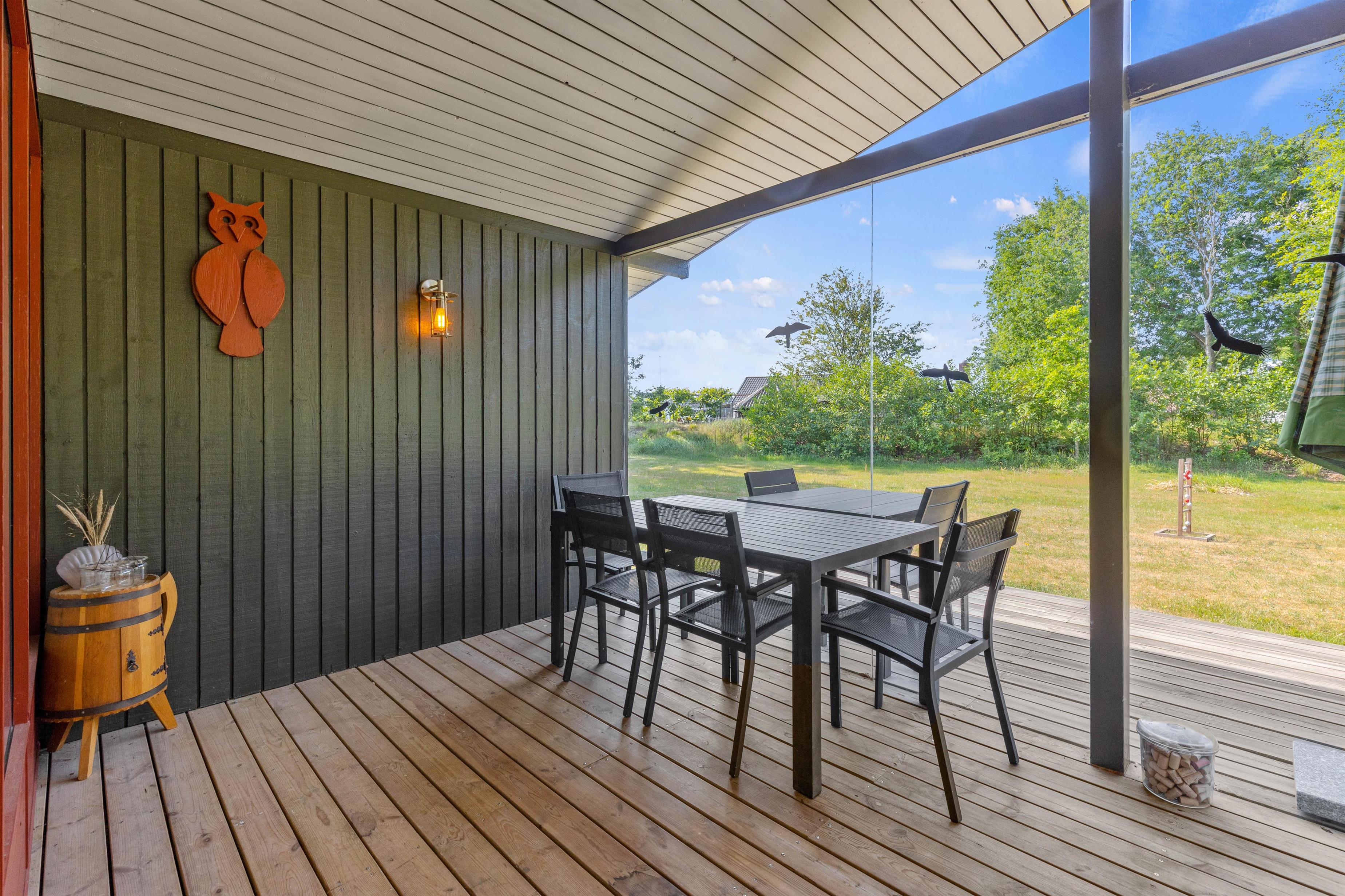Terrassen er delvist overdækket, og I kan derfor også sætte jer i skyggen, hvis I får brug for at holde en pause fra solen. På terrassen kan I desuden samles til en lækker middag om aftenen, som I kan tilberede på sommerhusets grill.