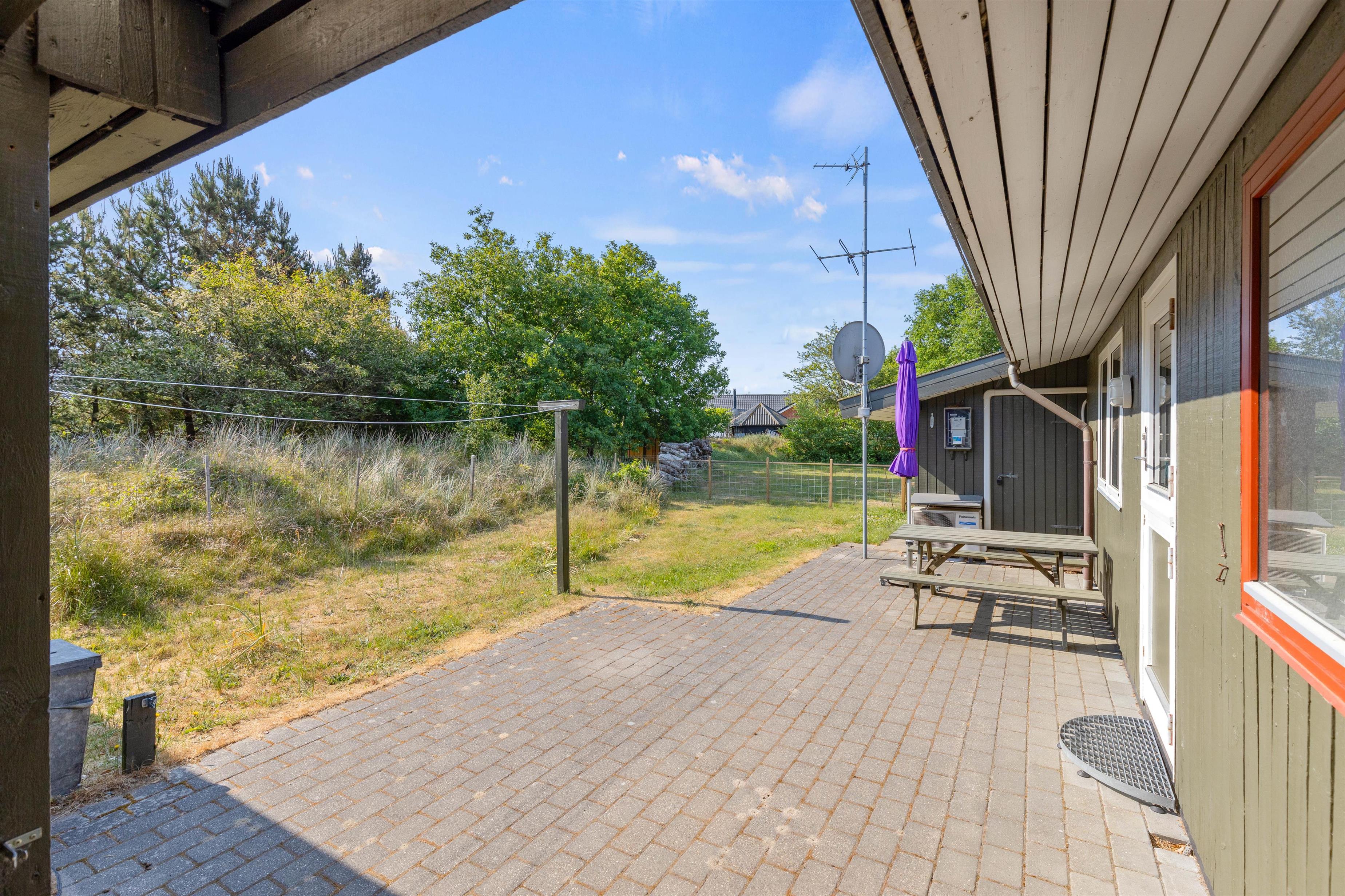 På sommerhusets udeområde kan I slappe af på varme og solrige feriedage. Her har I blandt andet en terrasse, der vender mod sydvest, hvor I kan sætte jer godt til rette i havemøbler og liggestole, mens I bare nyder solen.