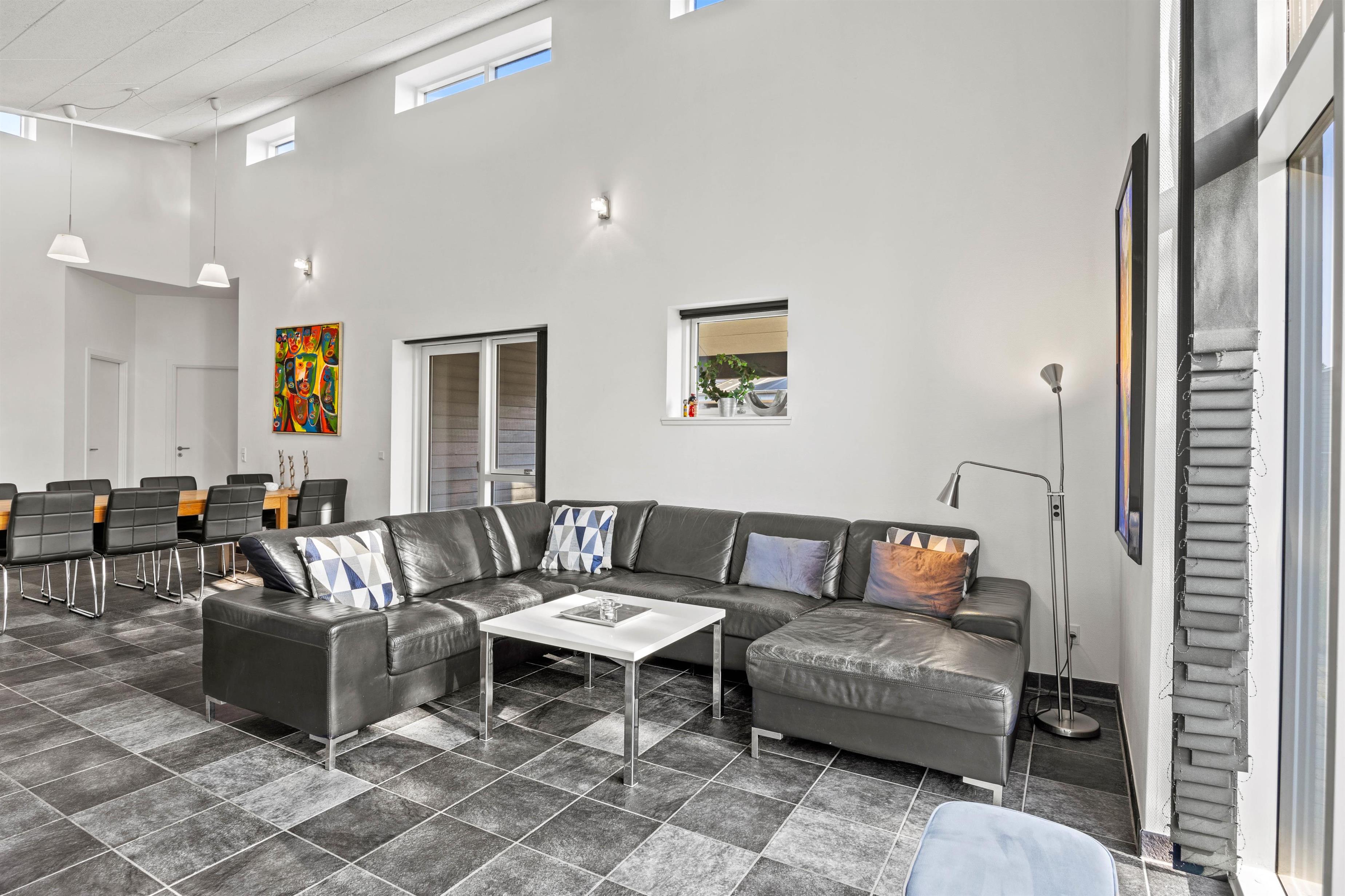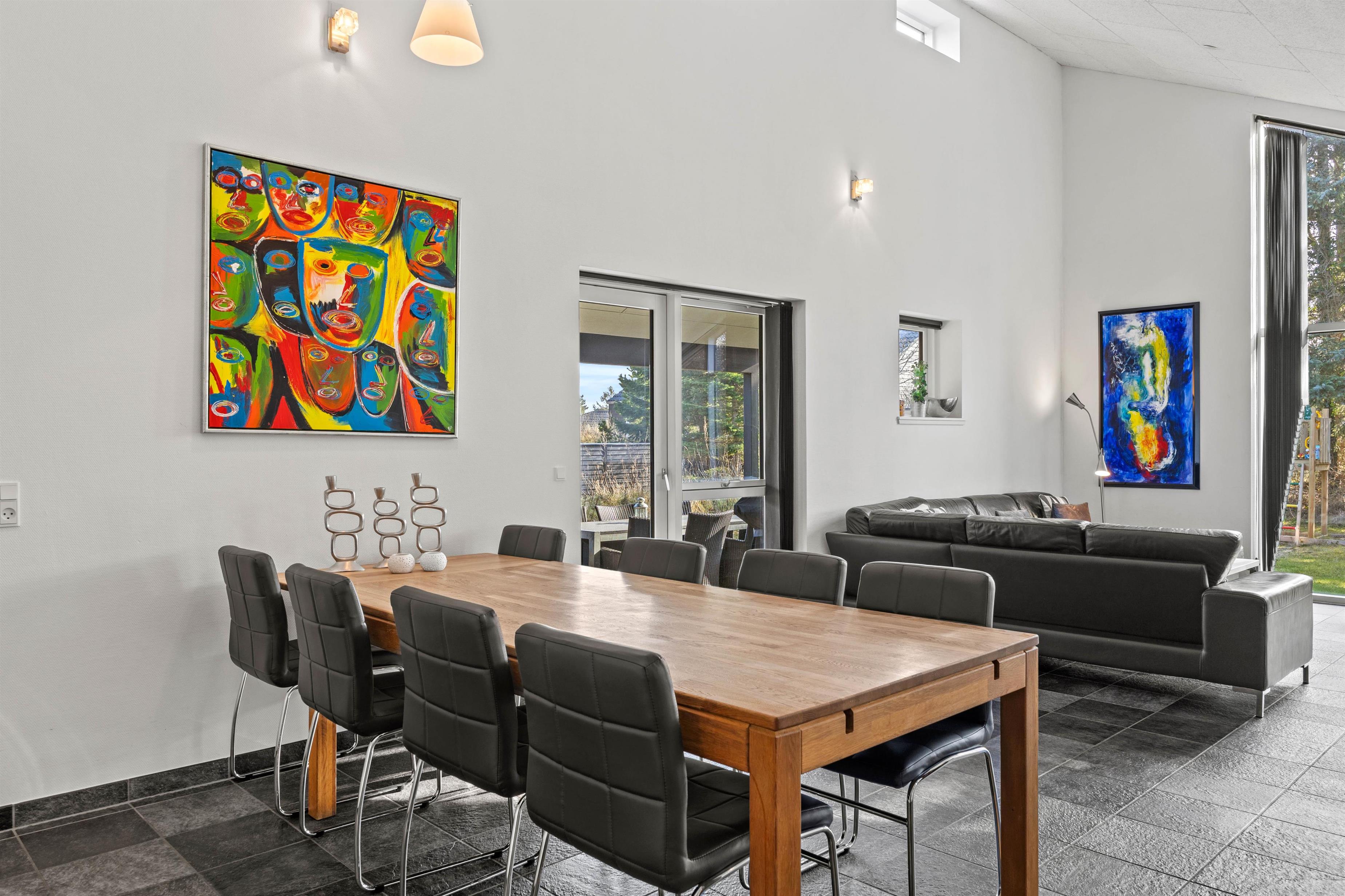 På grund af de ekstra ovenlysvinduer kommer der meget lys ind i det åbne opholds- og spisestue. Det moderne, lyse og veludstyrede køkken inviterer dig til at prøve nye kulinariske kreationer - her er plads til at alle kan hjælpe og efterfølgende nyde maden sammen enten indendørs eller udendørs. På kølige aftener kan det være meget hyggeligt med et glas rødvin foran pejsen.
