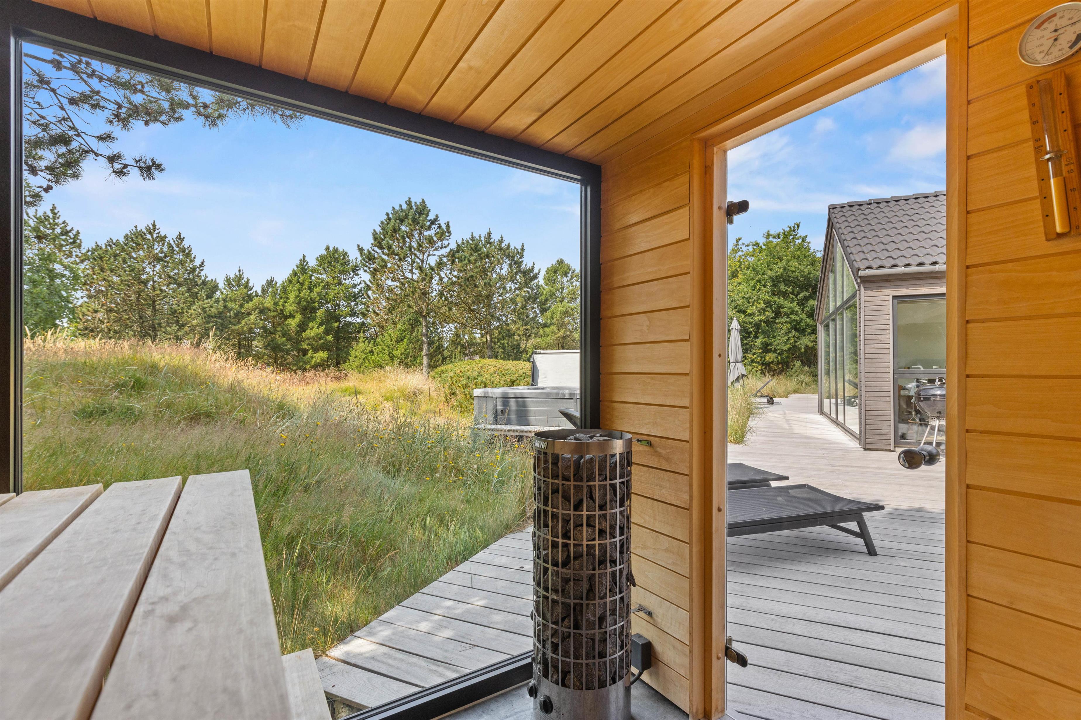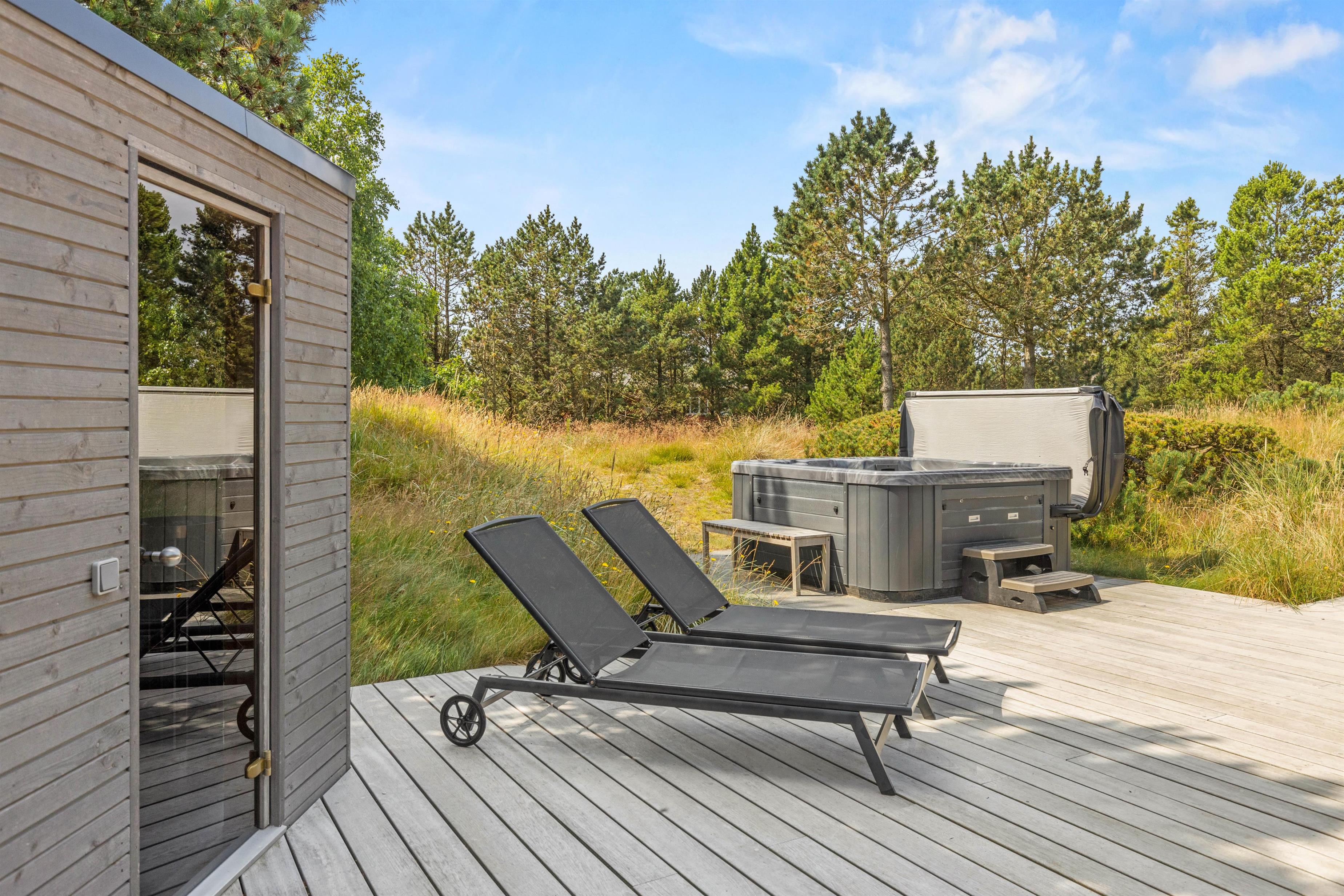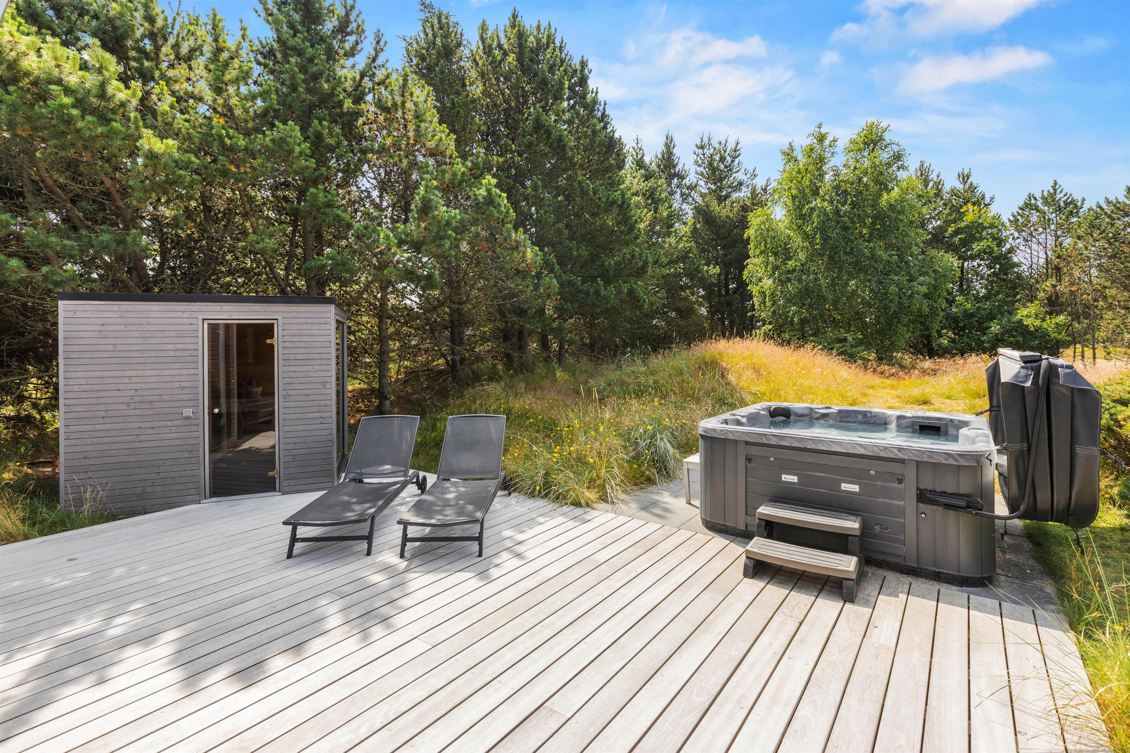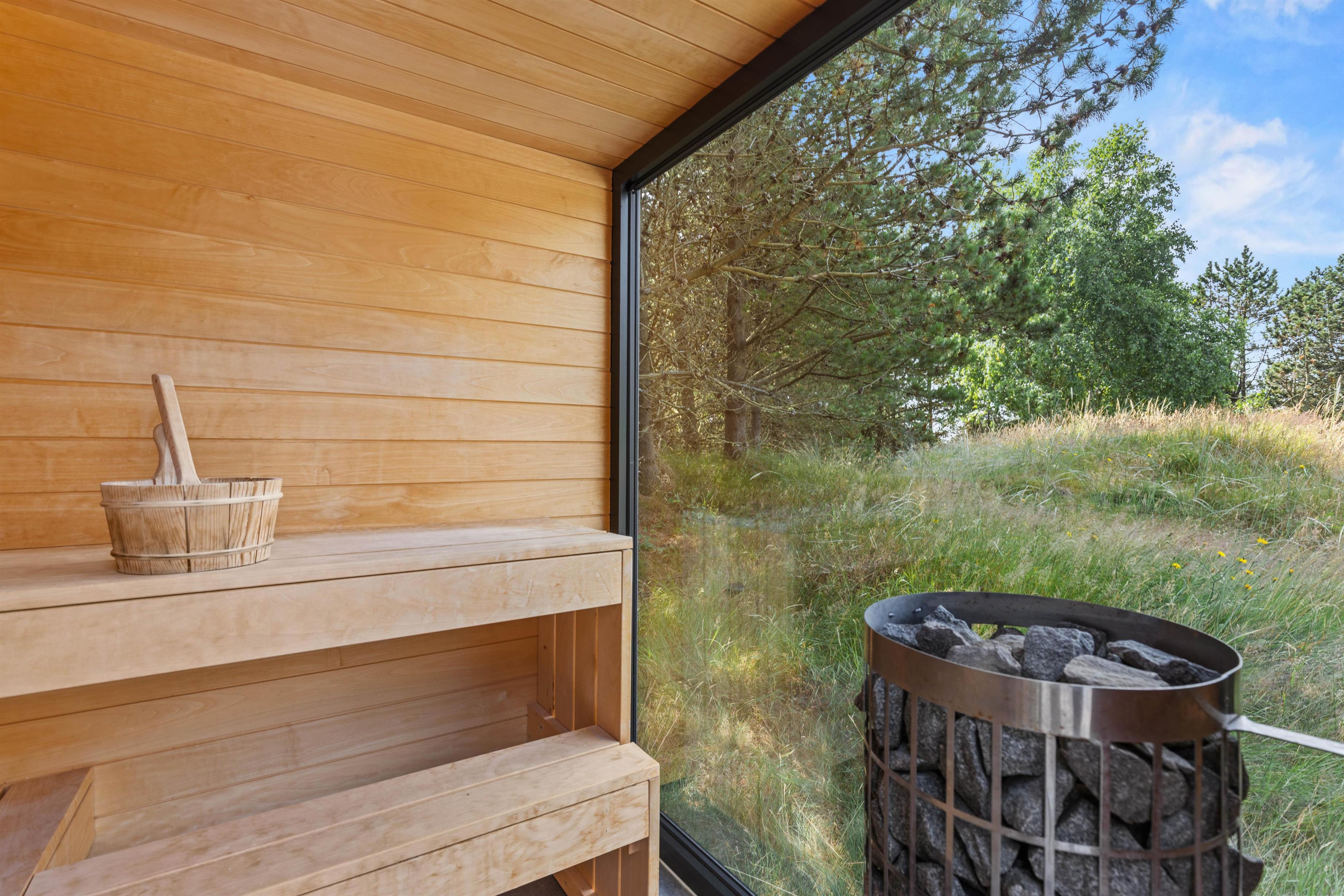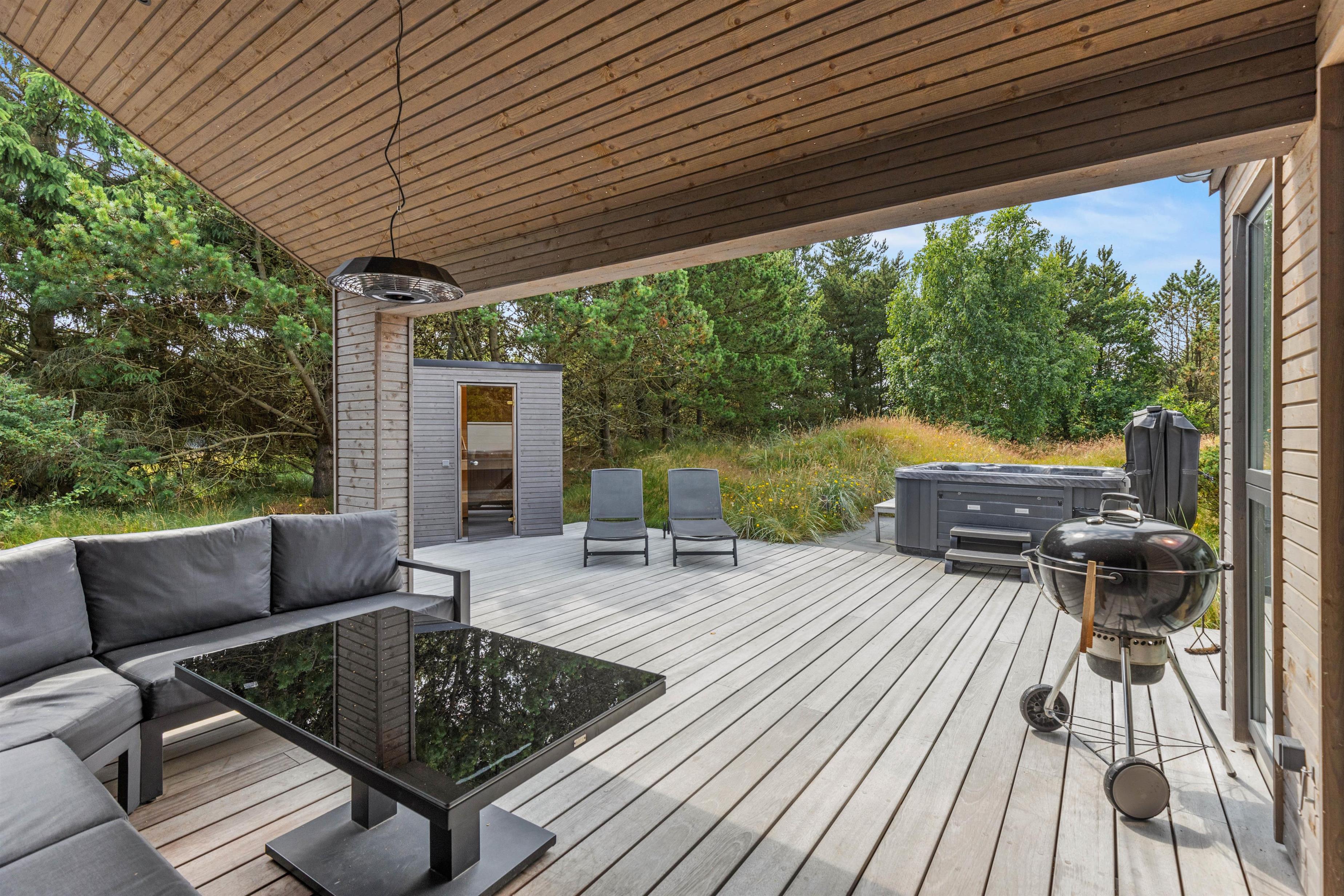 Et af feriehusets højdepunkter er det fantastiske uderum. Den store terrasse er delvist overdækket og er indrettet med en lækker udendørs sauna og udespa. Her kan I rigtig få lov til at koble af og nyde fridagene. Nyd et glas bobler under åben himmel – i god ro og fred, eftersom den store naturgrund er omgivet af høje træer, der skærmer af til naboerne. I sommerhalvåret kan I tilmed blive afkølet under udebruseren, som kan benyttes fra 1. april til 31. oktober.