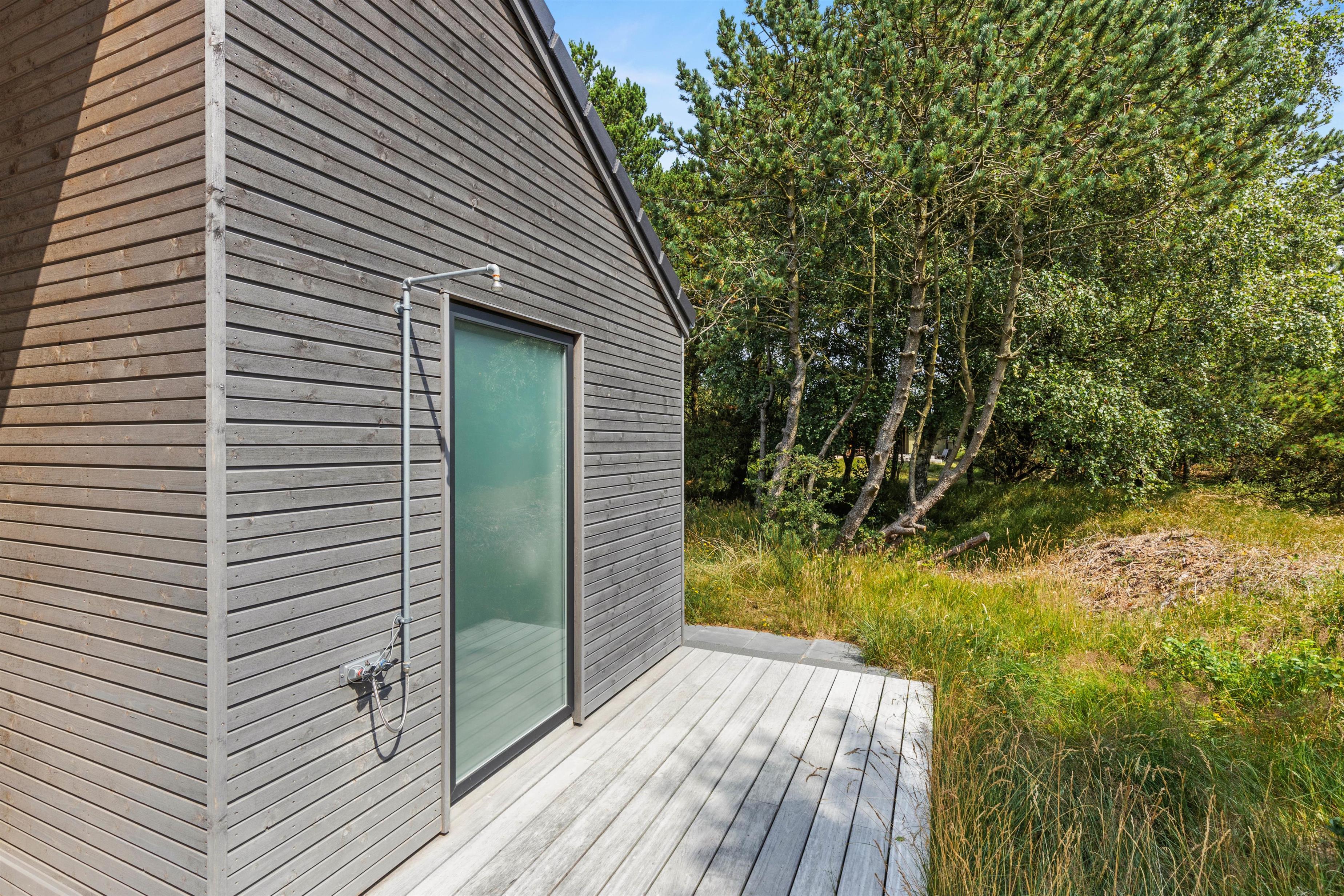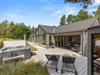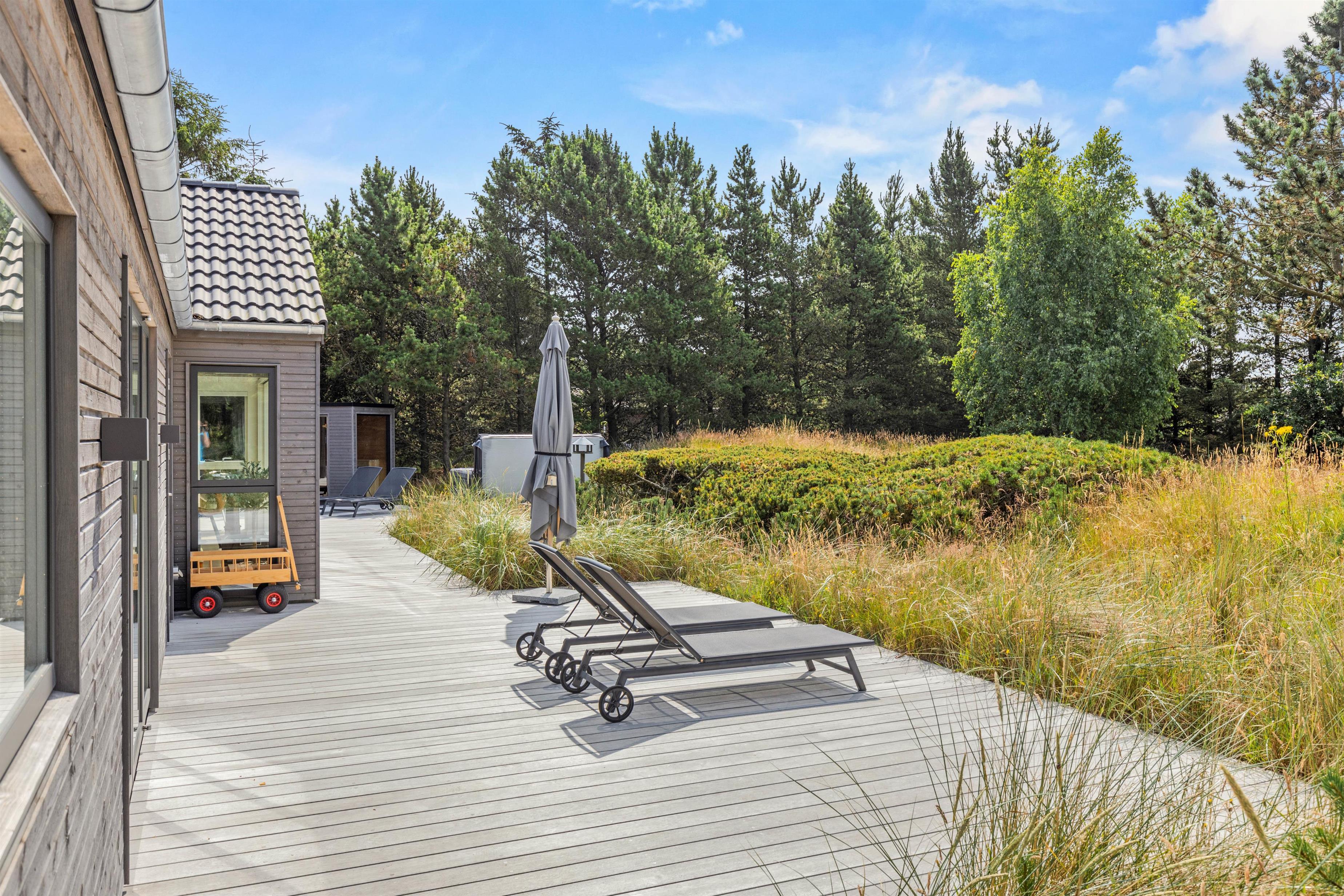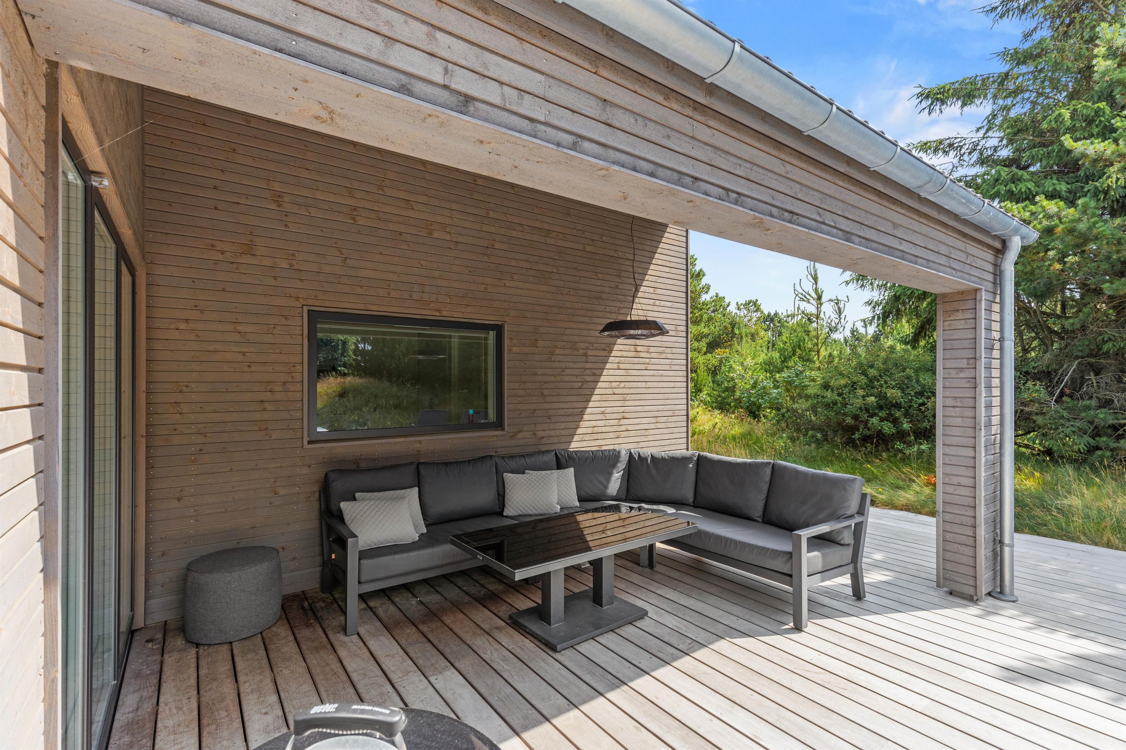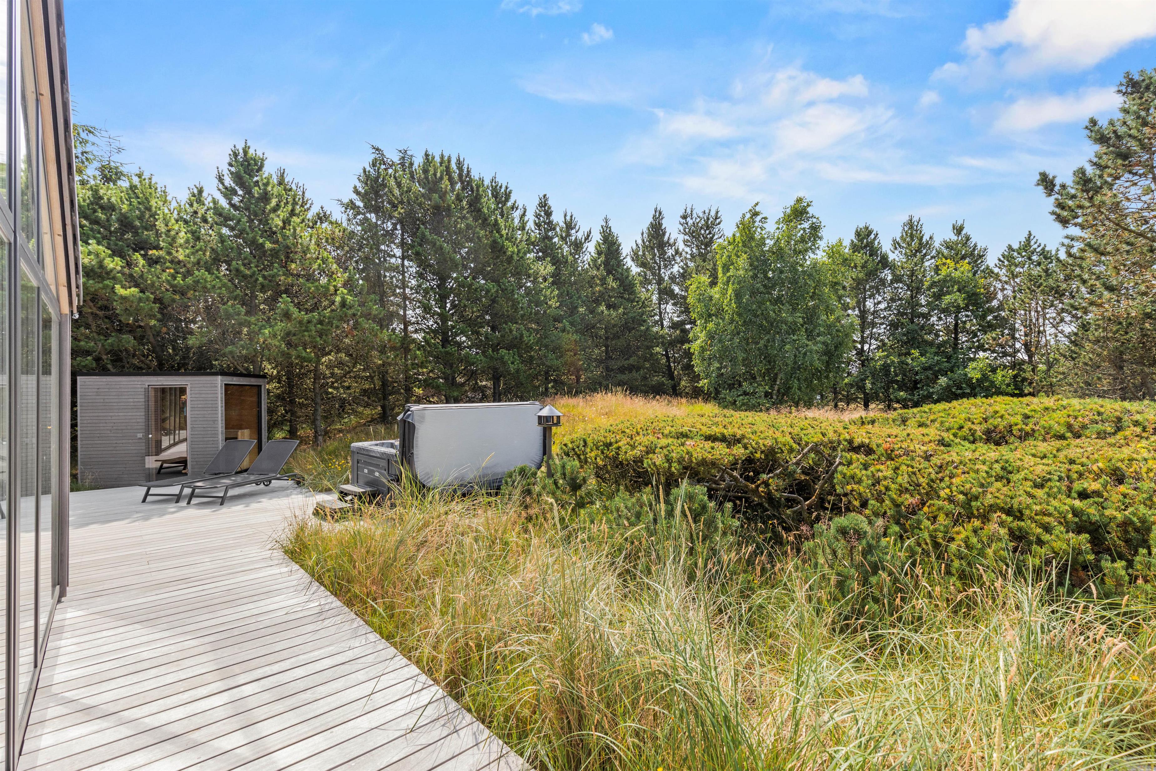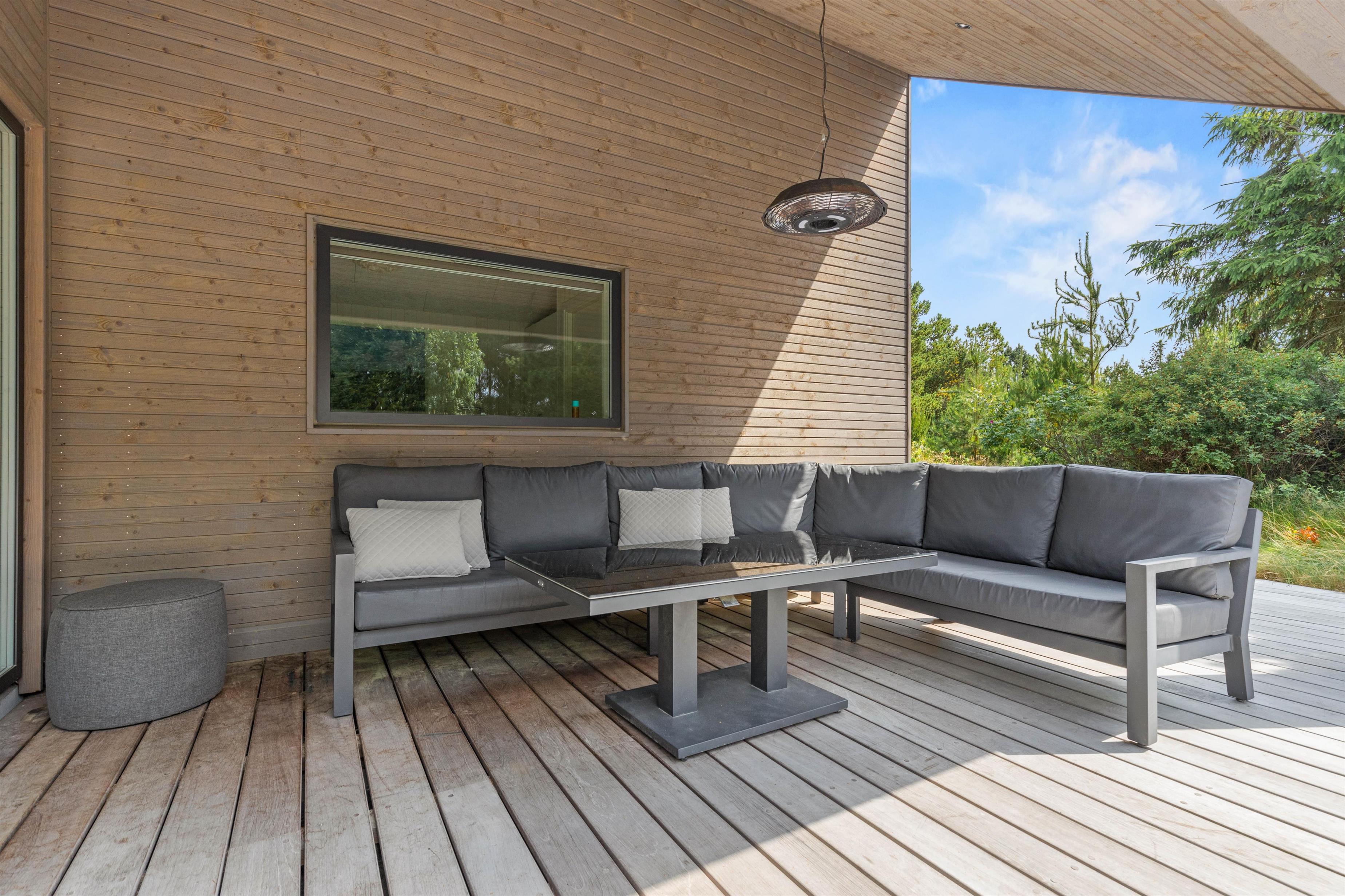 Et af feriehusets højdepunkter er det fantastiske uderum. Den store terrasse er delvist overdækket og er indrettet med en lækker udendørs sauna og udespa. Her kan I rigtig få lov til at koble af og nyde fridagene. Nyd et glas bobler under åben himmel – i god ro og fred, eftersom den store naturgrund er omgivet af høje træer, der skærmer af til naboerne. I sommerhalvåret kan I tilmed blive afkølet under udebruseren, som kan benyttes fra 1. april til 31. oktober.