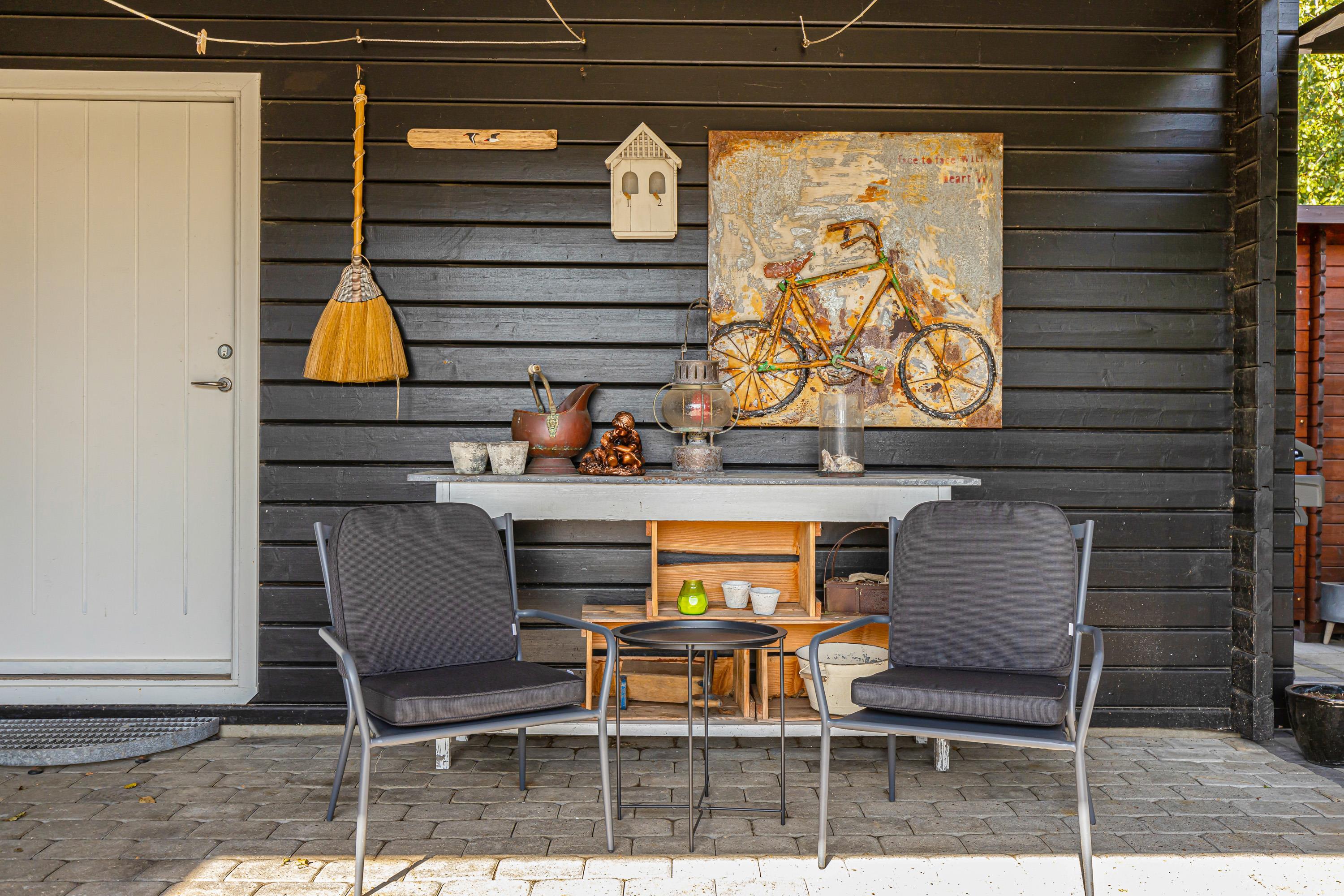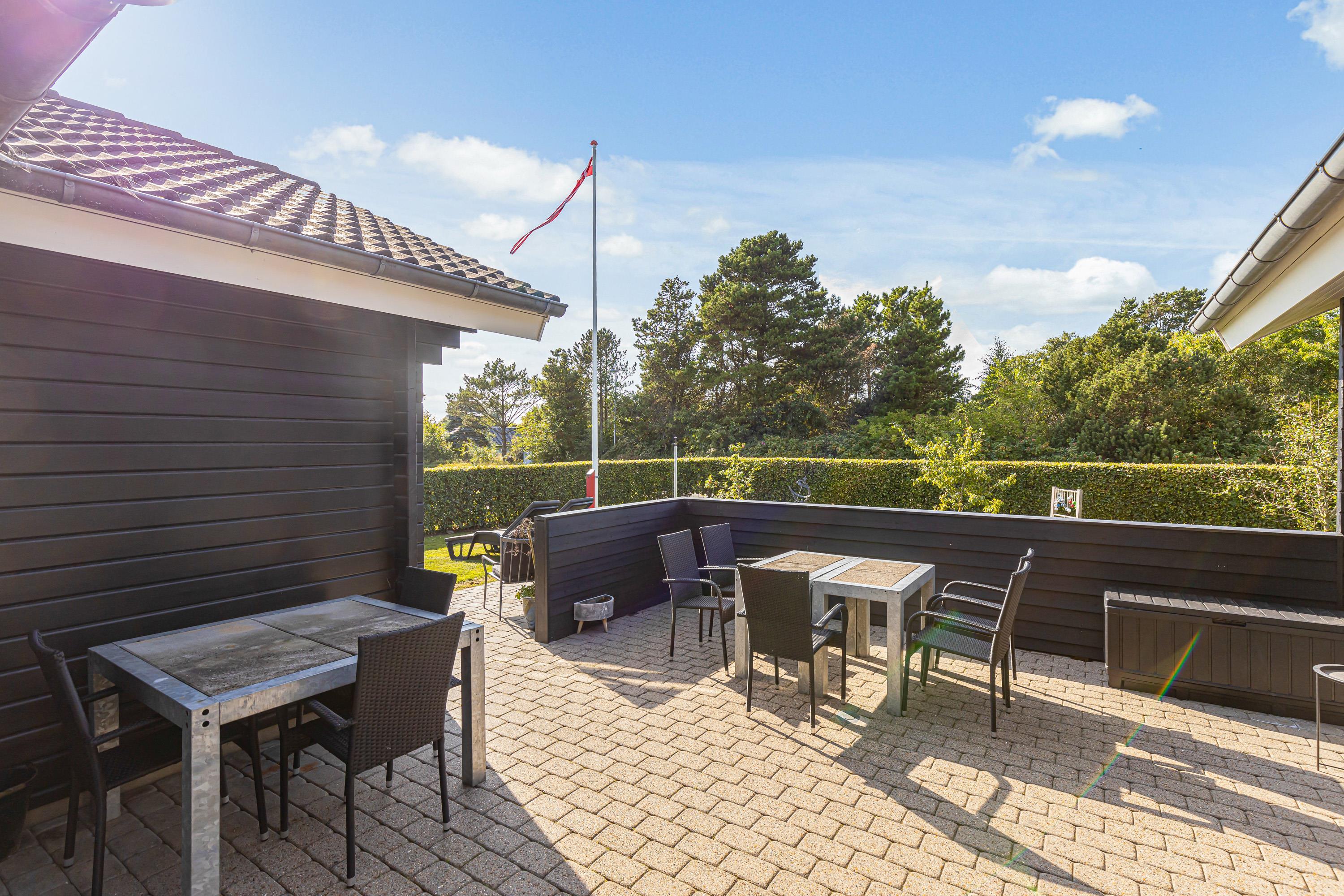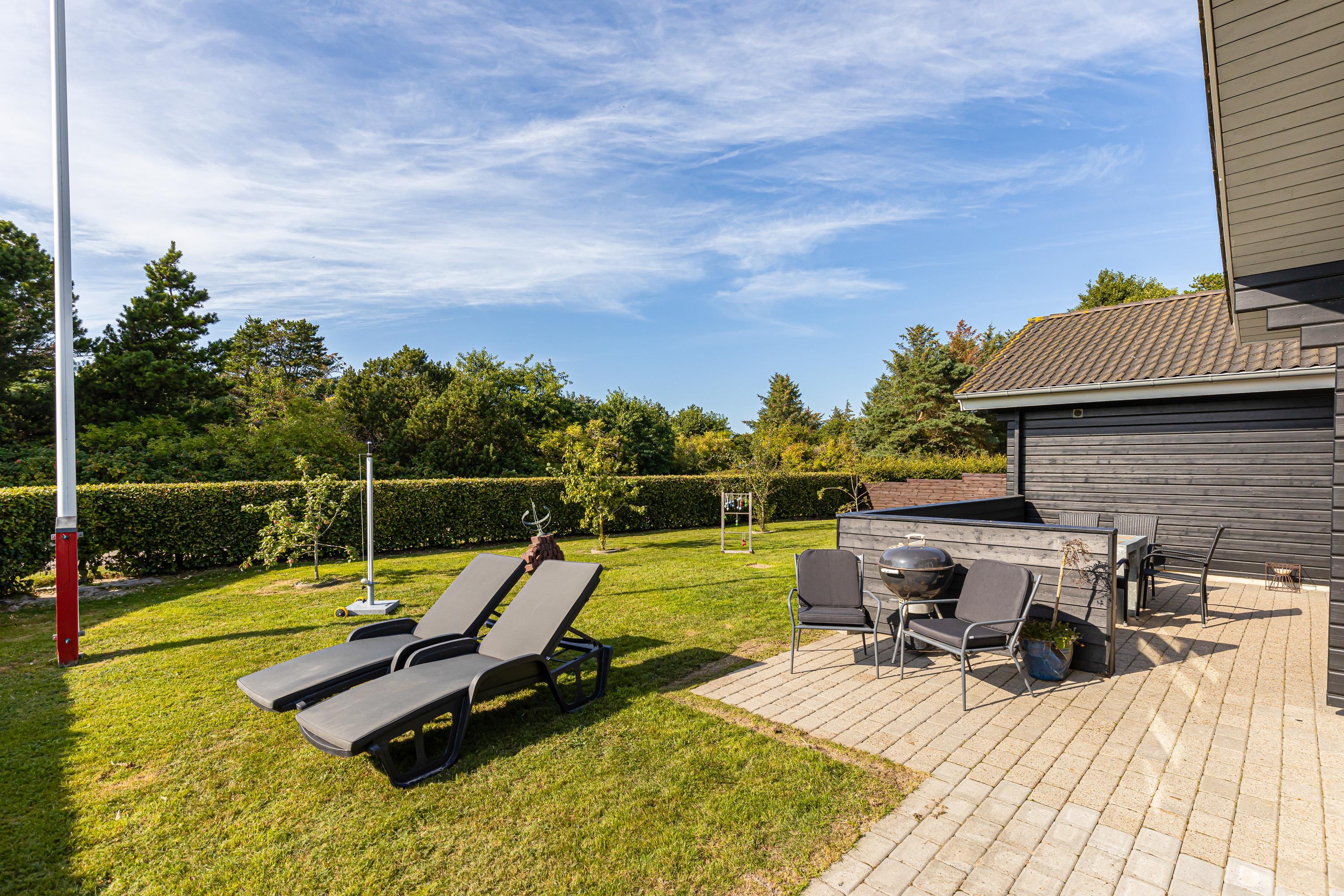 Sommerhuset har 2 terrasser, som begge er udstyret med diverse havemøbler. Hvad enten solen befinder sig på østsiden eller vestsiden, har I altid mulighed for at finde læ og et solspot. Så læn jer tilbage i sommerhusets liggestole med en god bog i hånden eller et glas vin og nyd ferien!