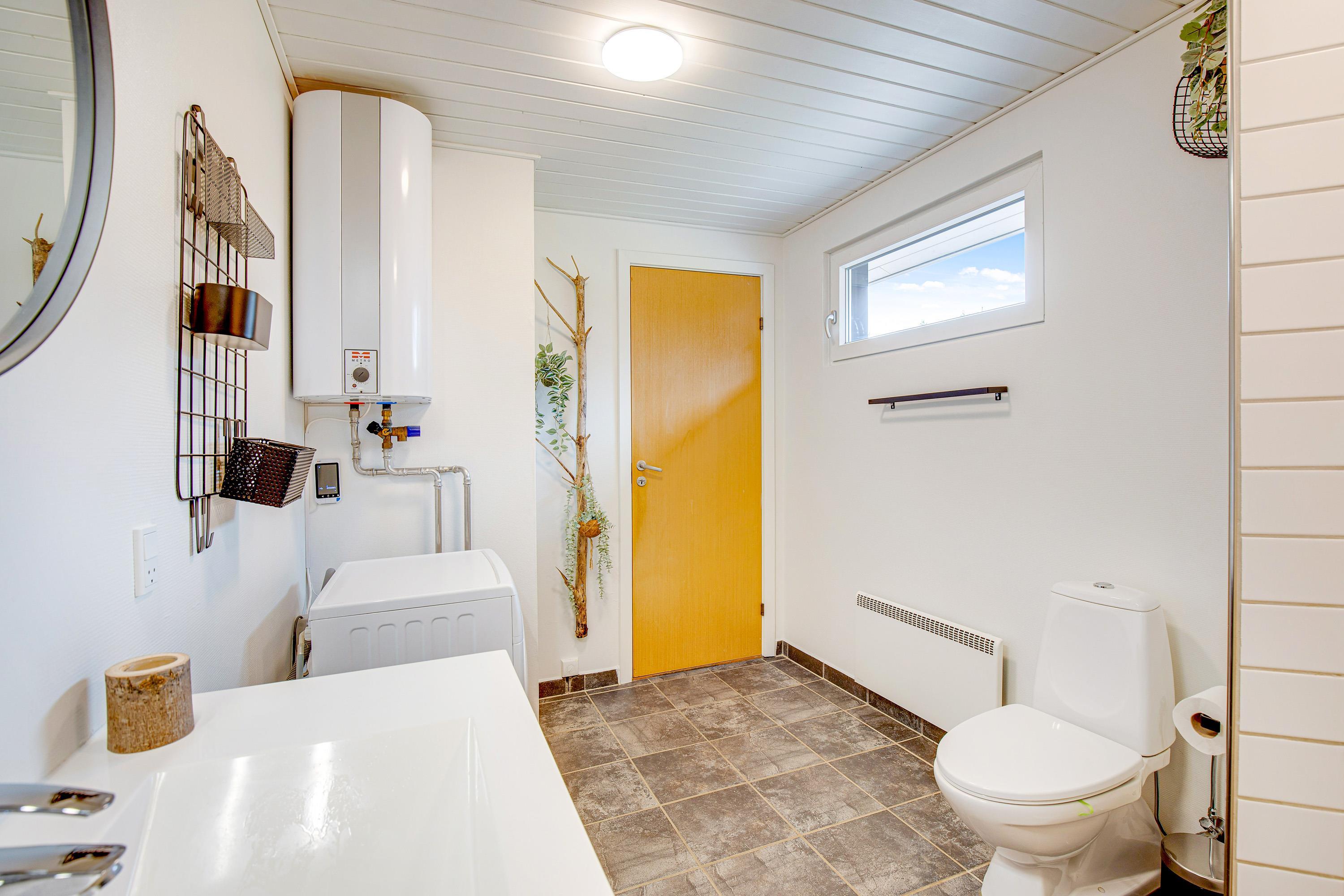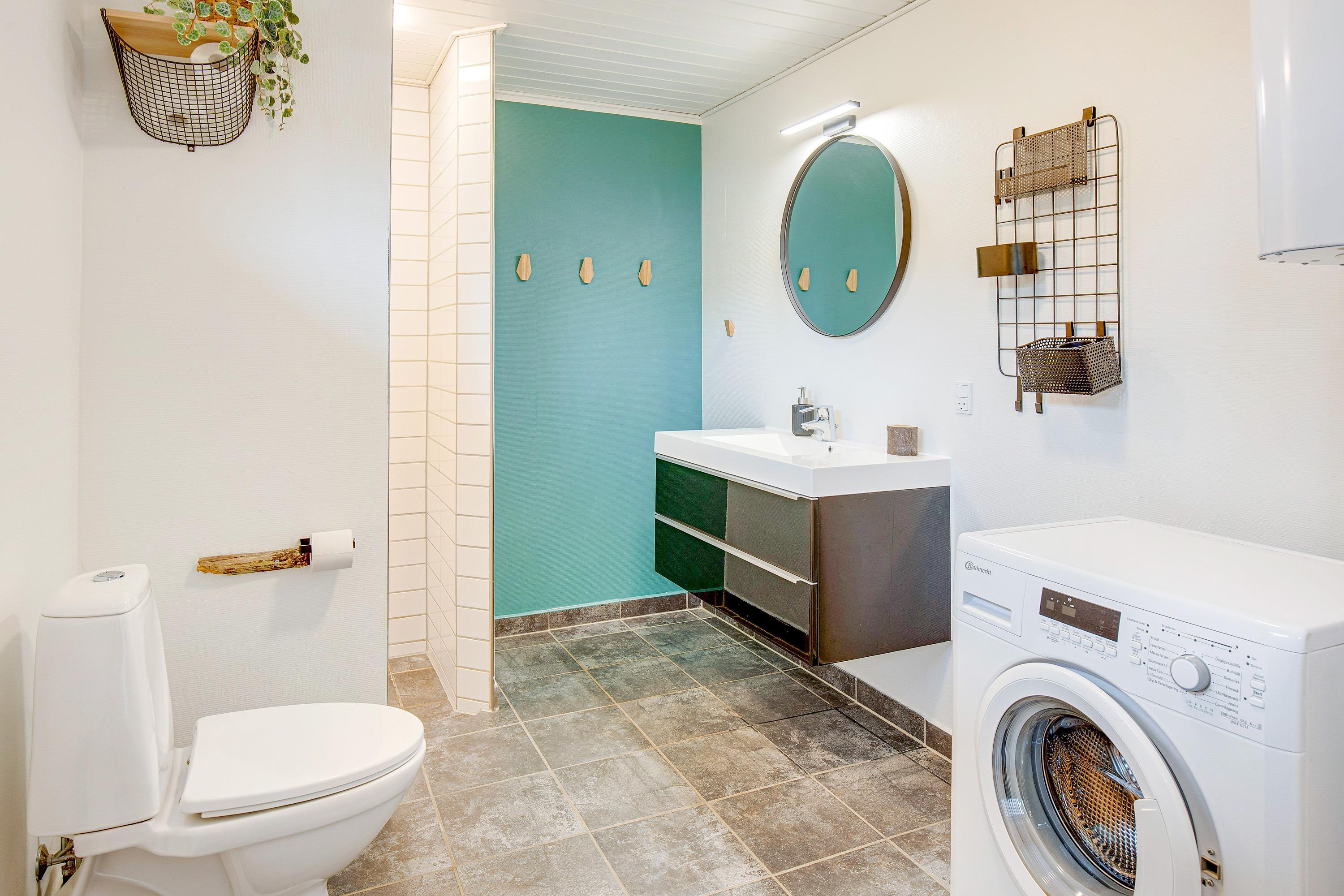 Husets flotte badeværelse har gulvvarme og her finder i også en vaskemaskine.
