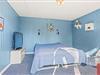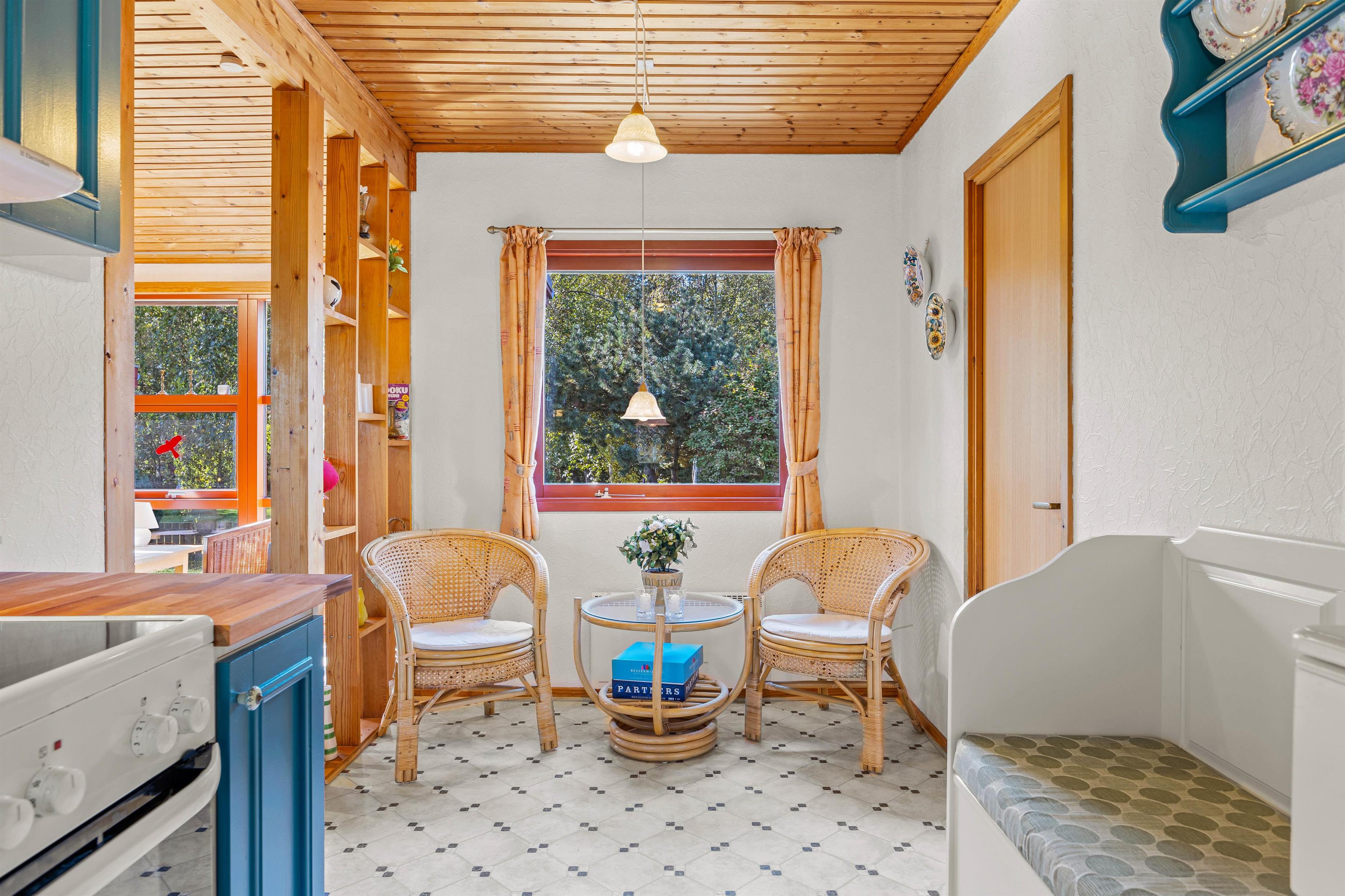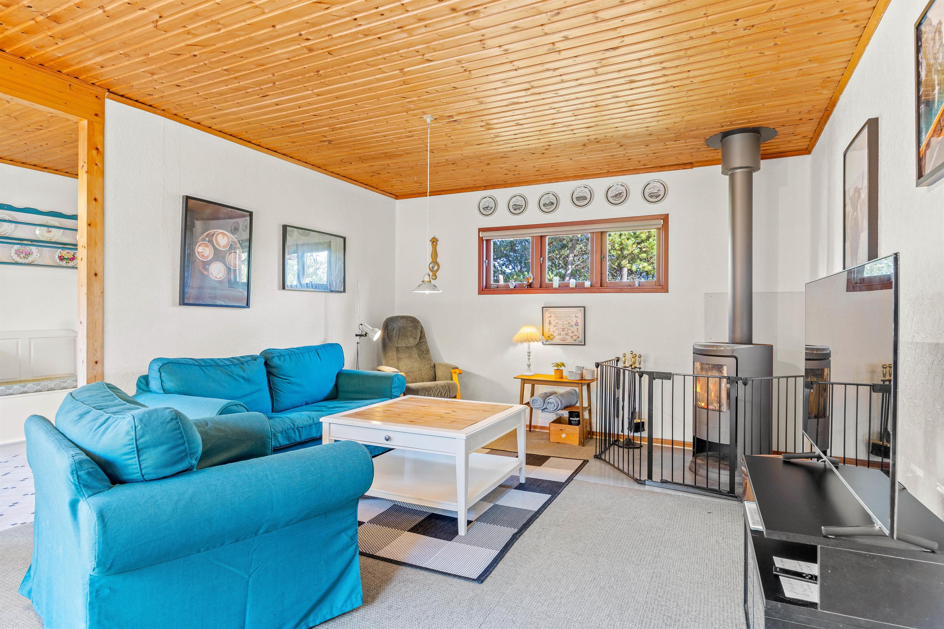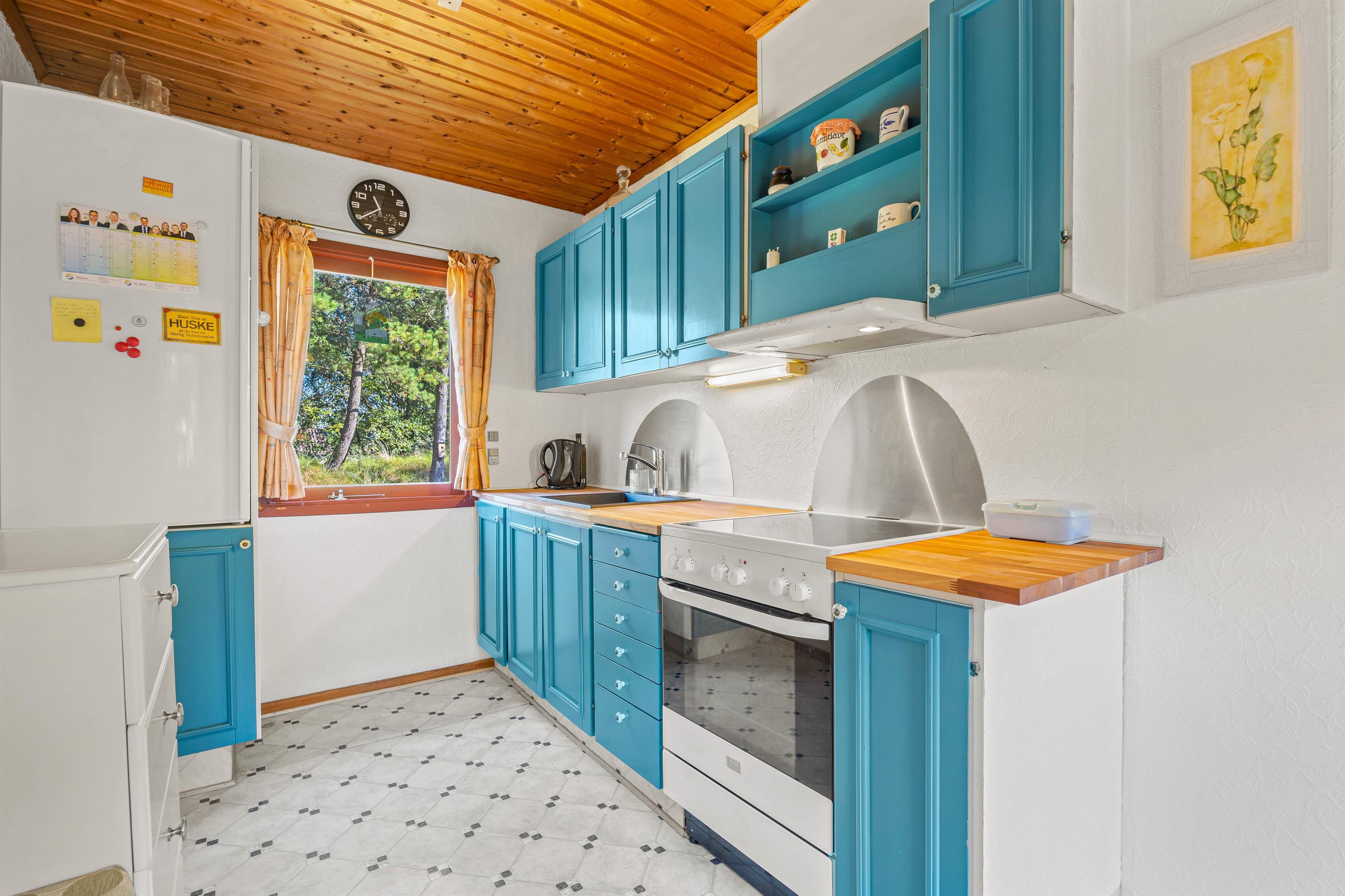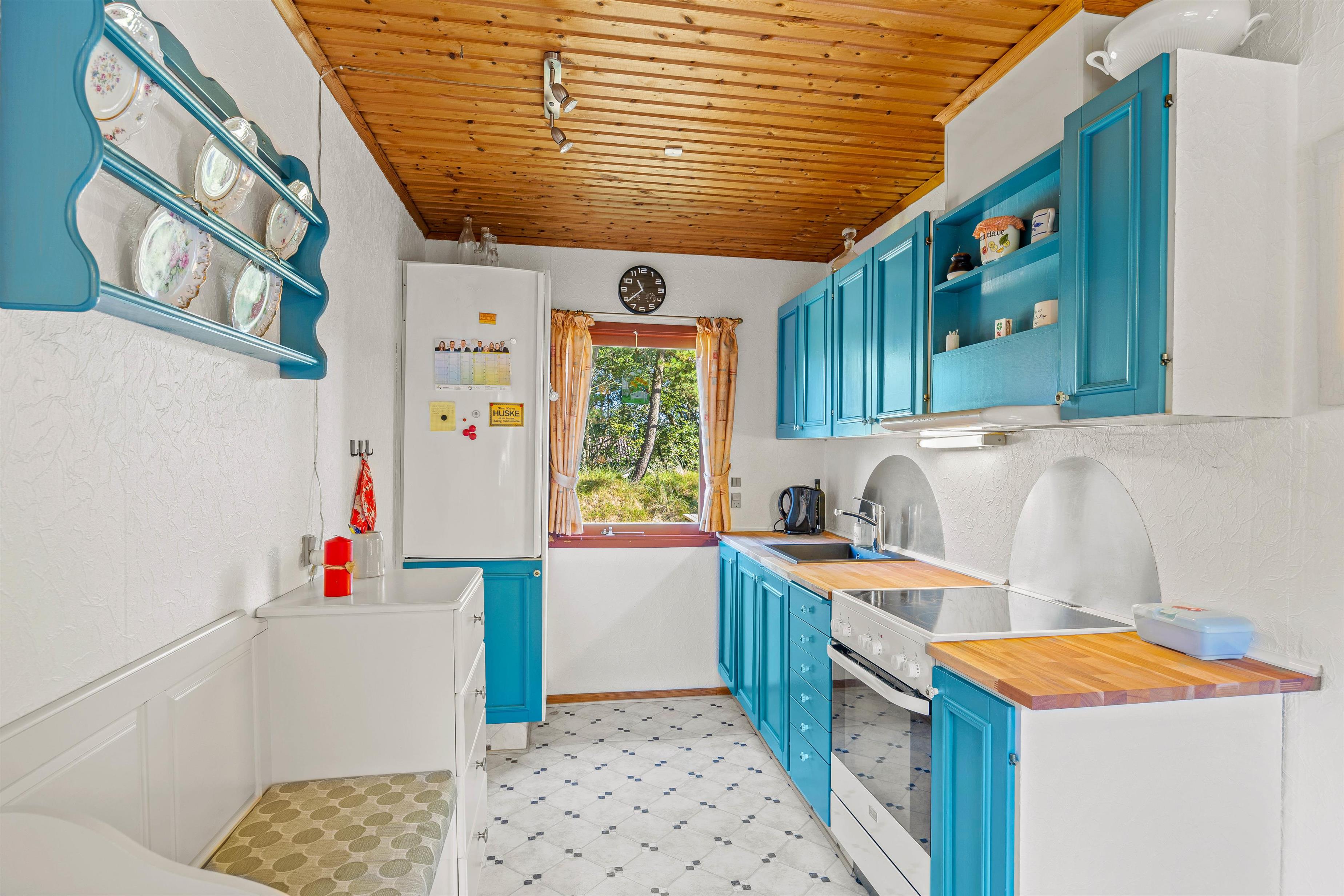 Det blå køkken understreger den personlige indretning med møbler i almuestil og mange små siddekroge. Her kan man nyde det dejlige lys fra de store vinduer, og den afskærmede brændeovn i opholdsstuen bidrager til hyggen, især i vinterhalvåret, når vestenvinden rusker i træerne, der omkranser den store grund.