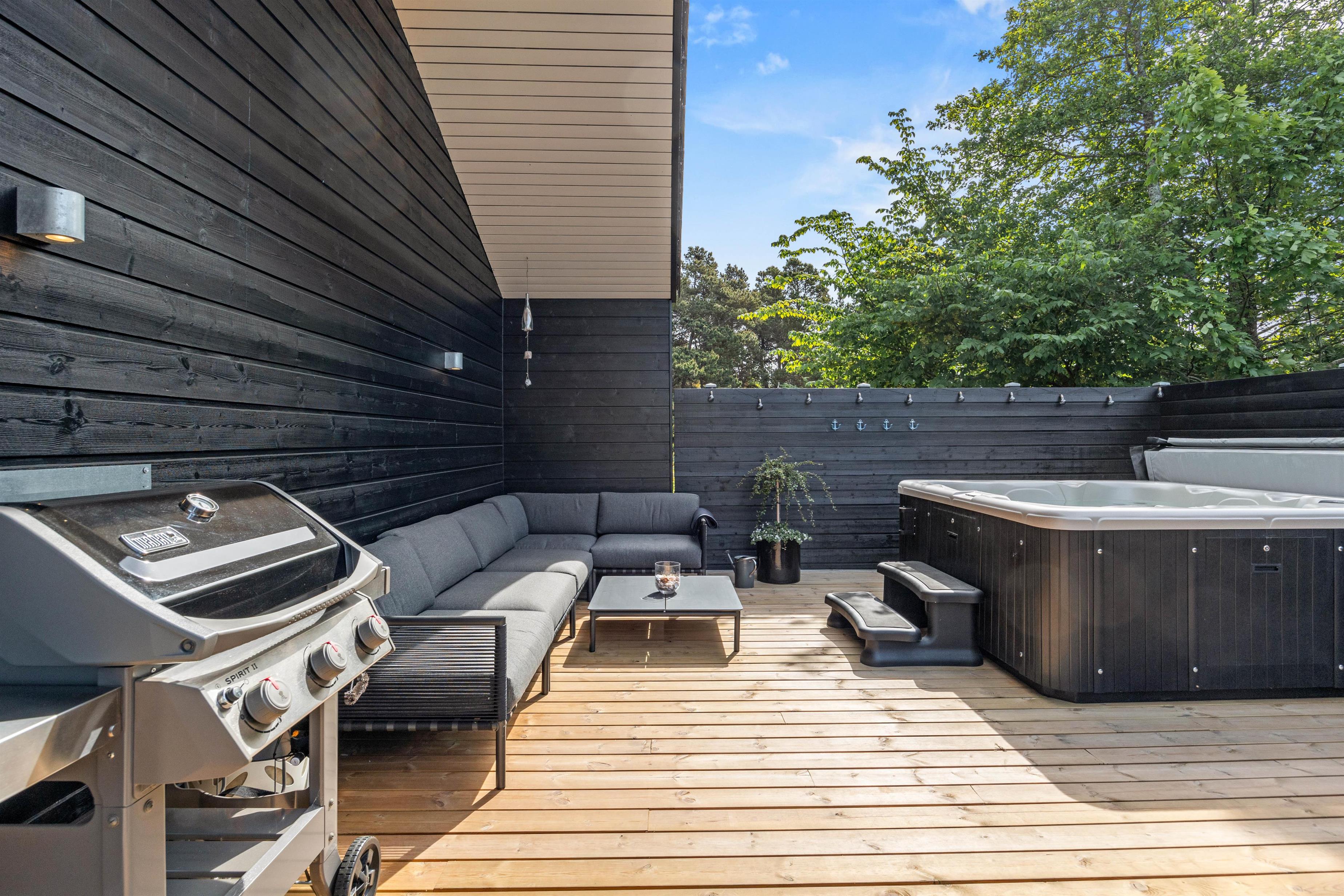 Fra stuen er der direkte udgang til terrassen, hvoraf en del er overdækket, hvis nu I ønsker at nyde frokosten udenfor i skyggen. Ellers kan I læne jer tilbage i kvalitetsmøblerne og nyde det gode vejr. Udenfor finder I også en udebruser, så I kan skylle sandet af efter en dejlig strandtur. Udebruseren kan benyttes fra 1. april til 31. oktober. På terrassen står også en stor grill, hvor I kan tilberede et lækkert måltid.