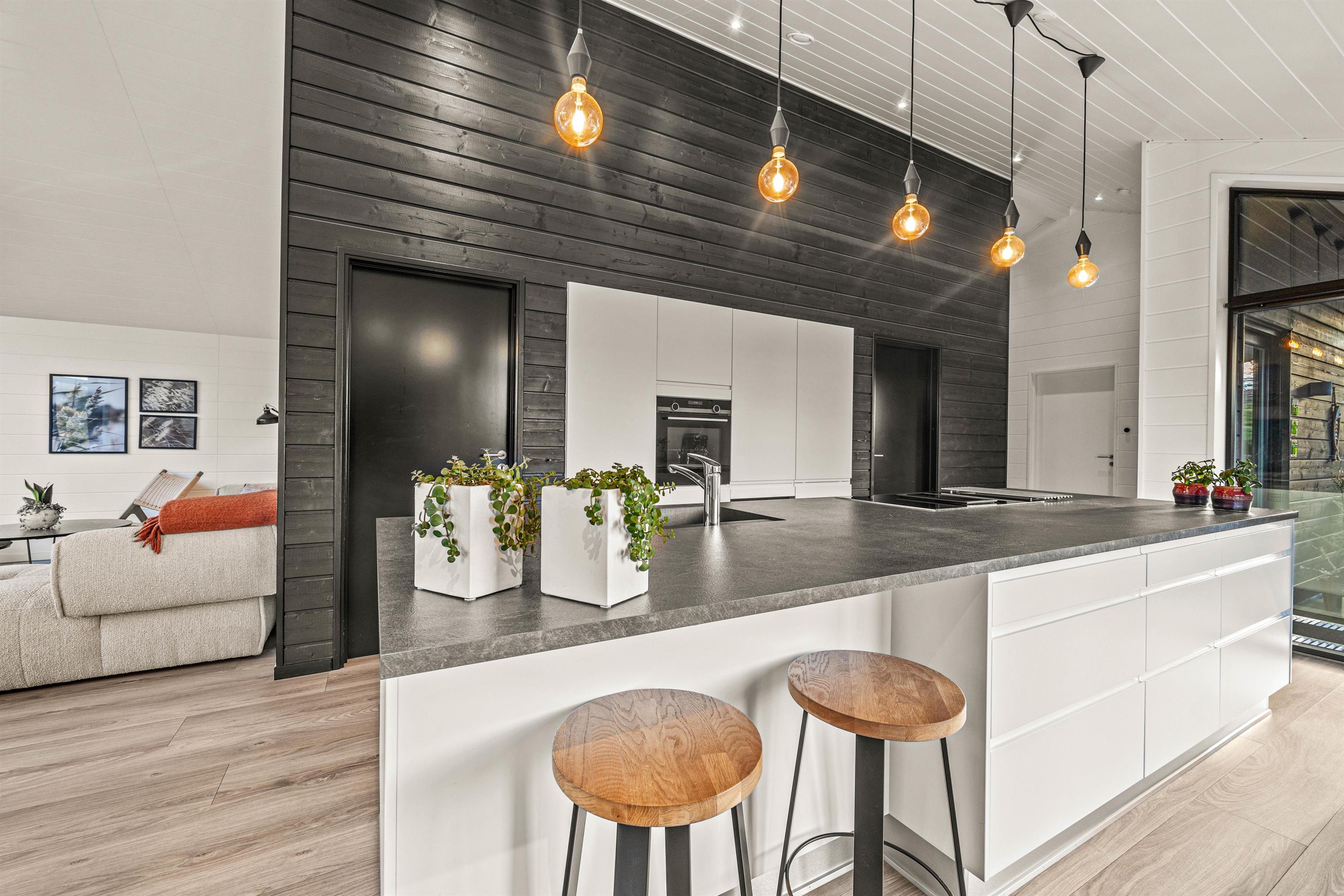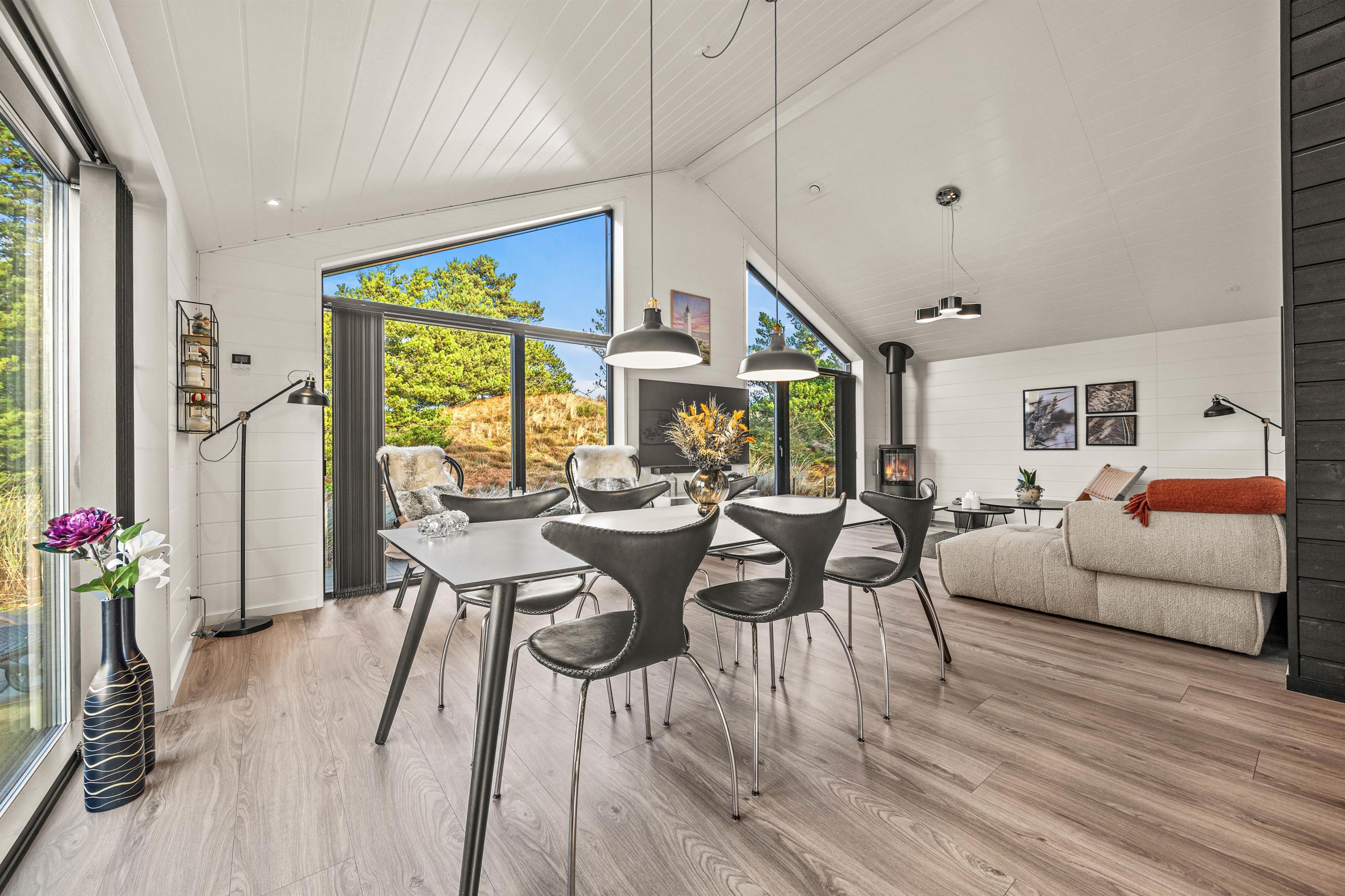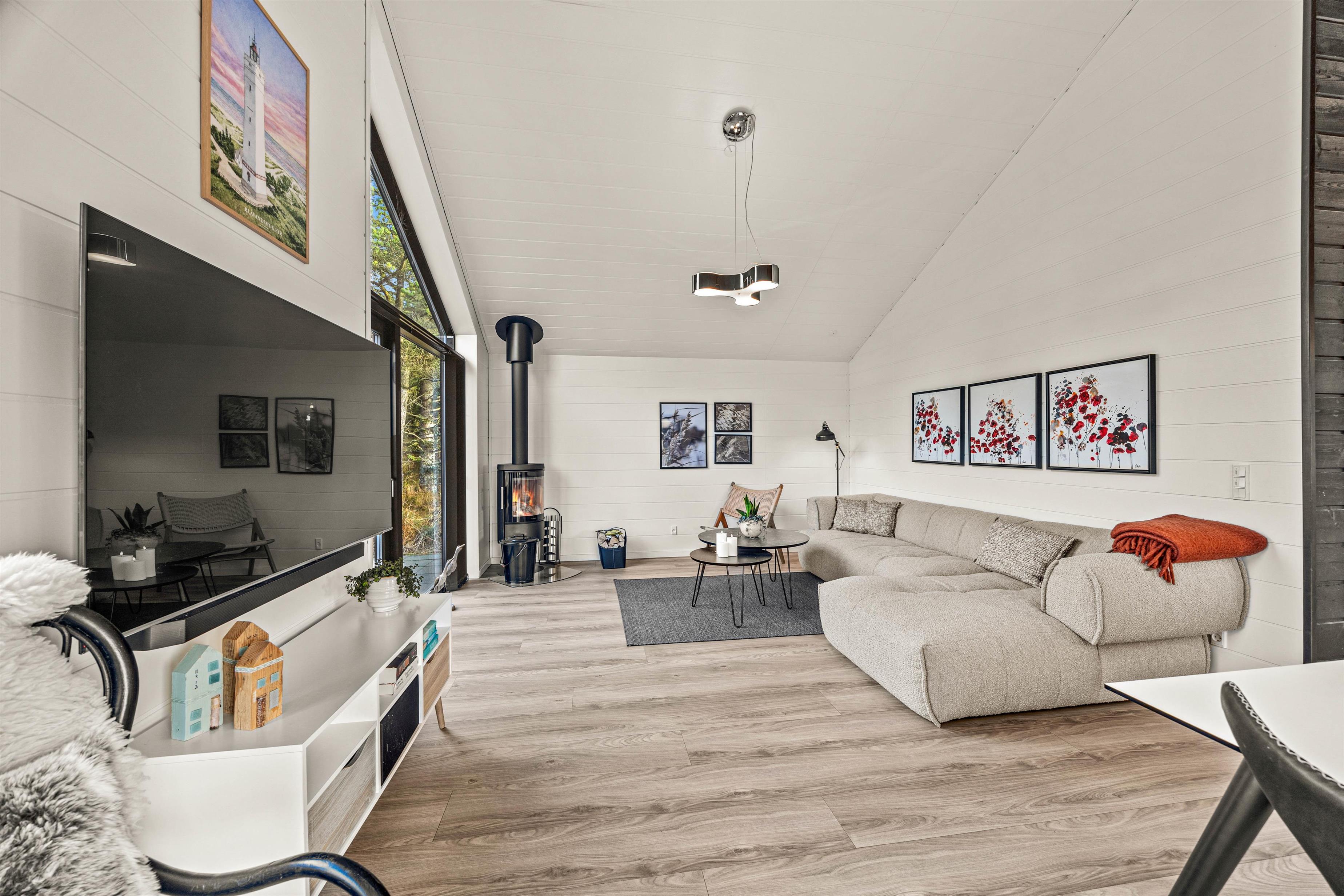 Så snart I træder indenfor døren, bliver I budt velkommen af de lyse og lækre omgivelser. Stue og køkken er i åben forbindelse, og skaber på den måde et stort rum. For enden af stuen er et stort vinduesparti, som sørger for et godt lysindfald, og der er desuden højt til loftet med loft-til-kip. Samtidig skaber brændeovnen en hyggelig feriestemning. Her er virkelig et sommerhus, hvor der er kræset for detaljerne og en god indretningsstil.