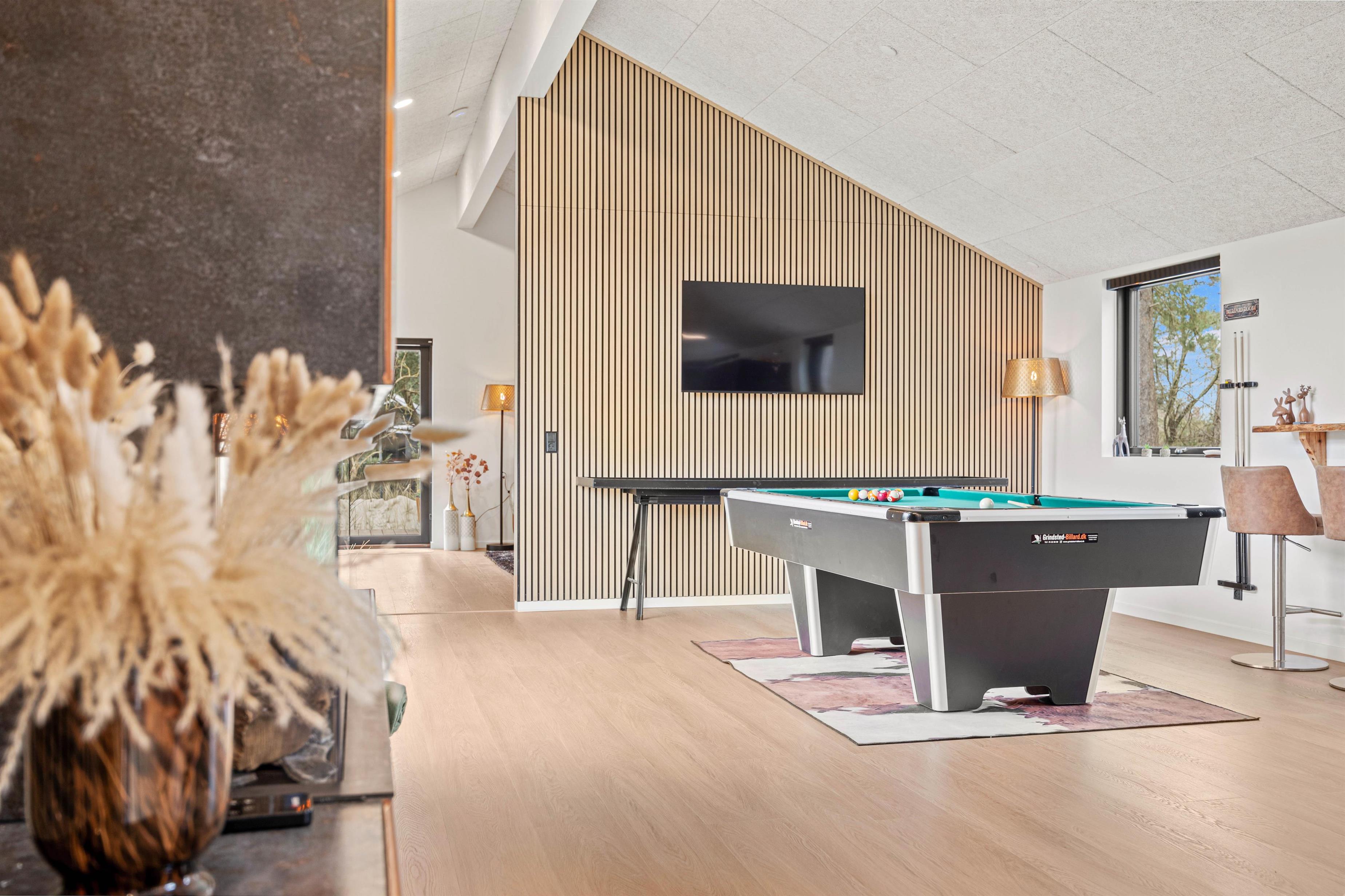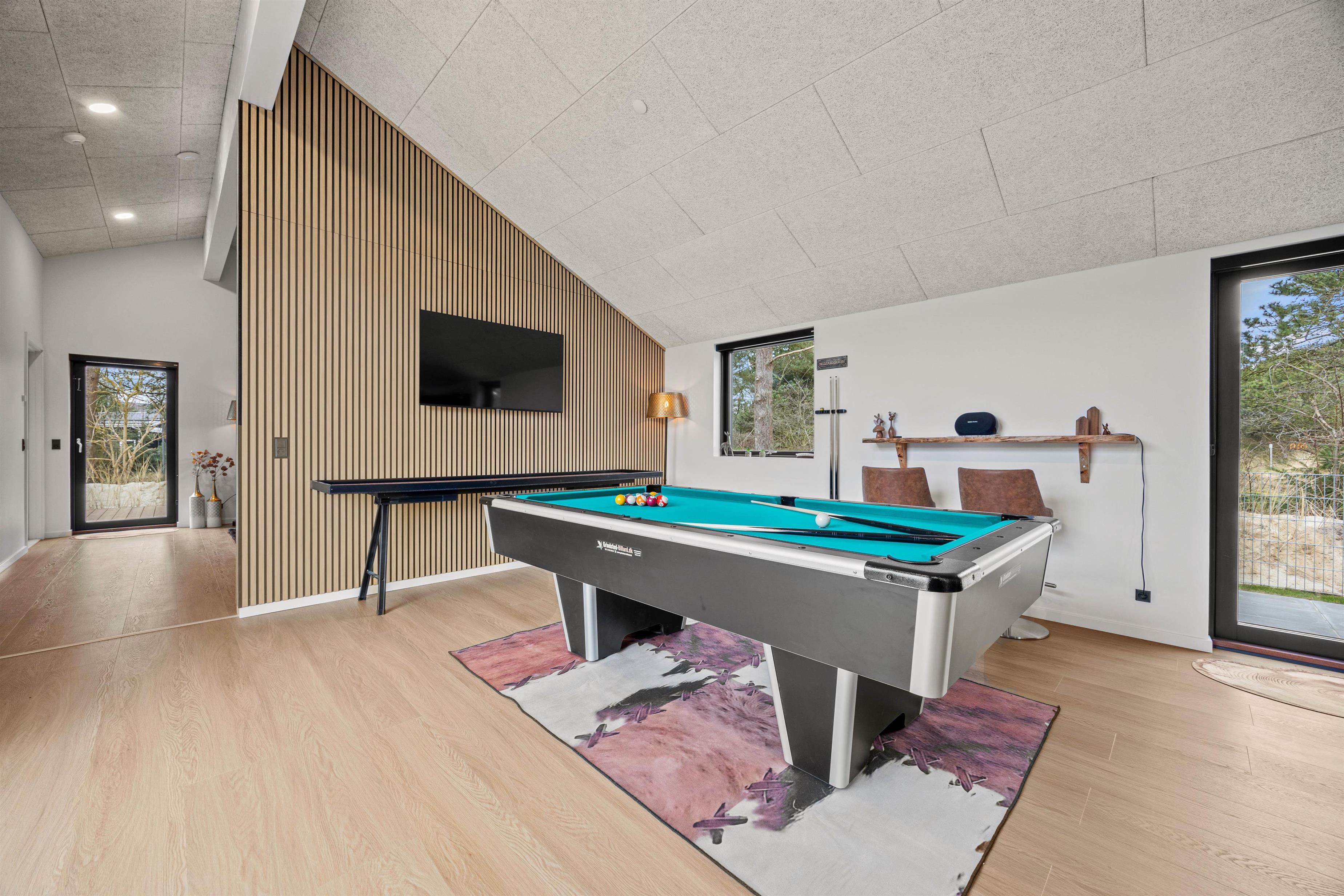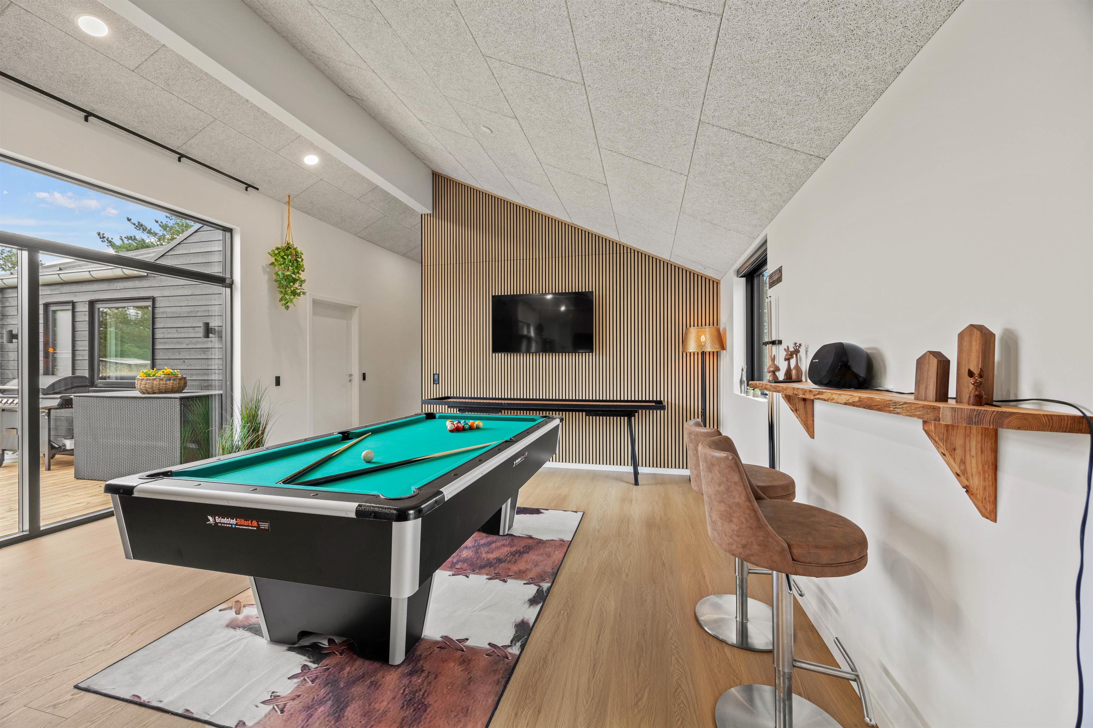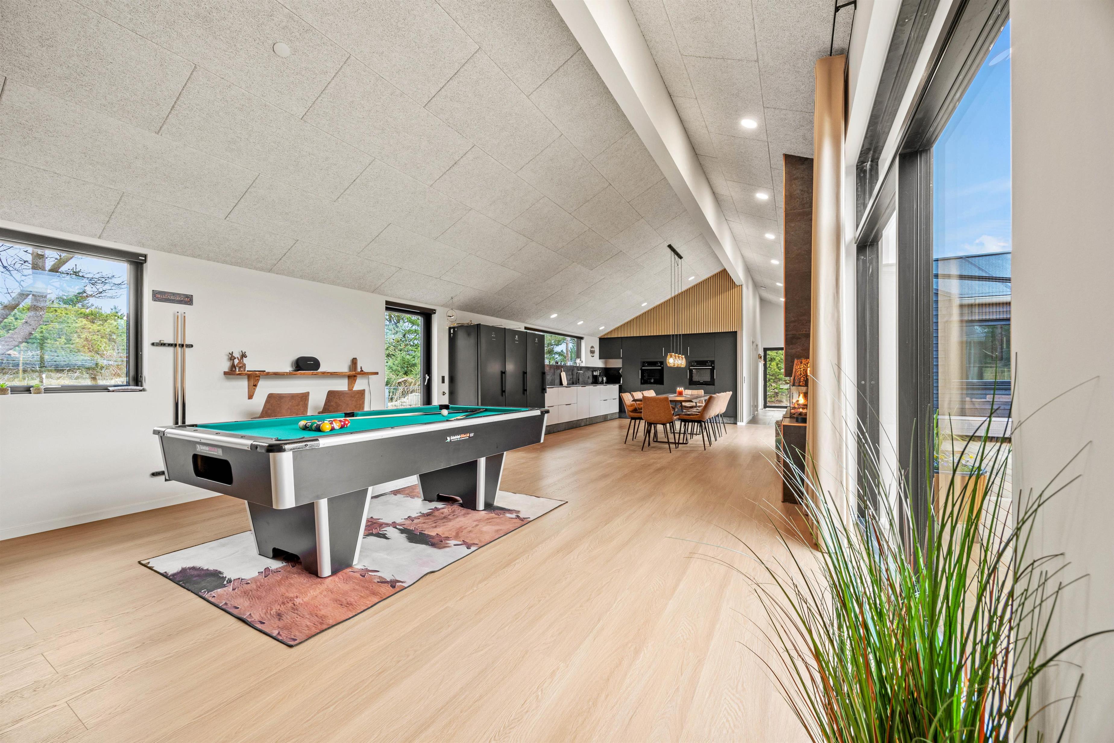 Det høje loft og den lyse indretning skaber en indbydende atmosfære, perfekt til afslappende stunder. Imens nogle af jer konkurrerer om point ved shuffle- eller billardbordet, kan andre hygge sig med madlavning i det rummelige køkken.