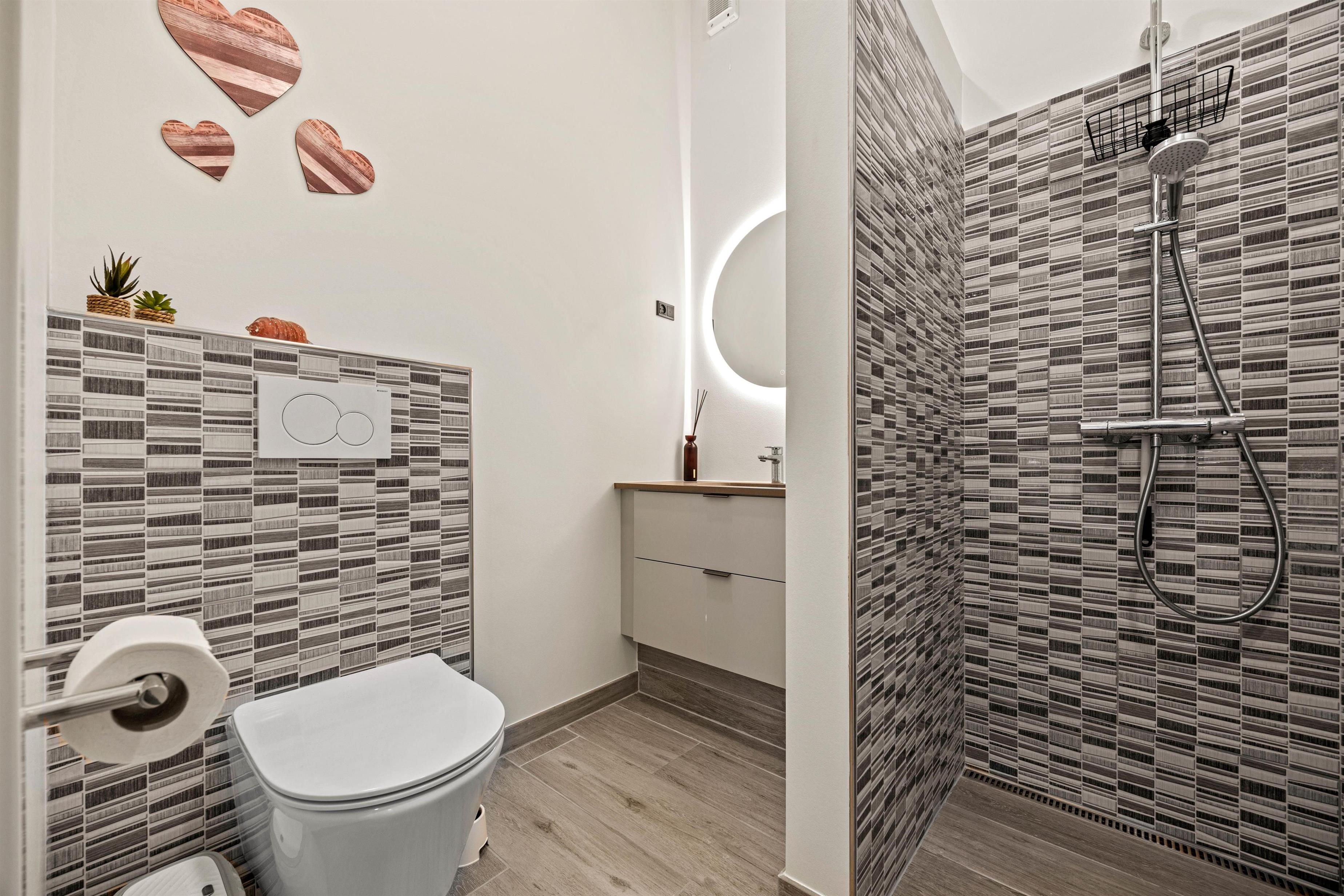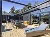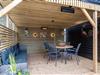 Den åbne terrasse er udstyret med alt, hvad I behøver for en aften med mad og hygge under åben himmel eller i skyggen fra den overdækkede terrasse og pergolaen. En markise gør det muligt at skabe en delvist overdækket terrasse, komplet med varmeelement, hvilket sikrer, at I kan bruge terrassen selv på køligere aftener.