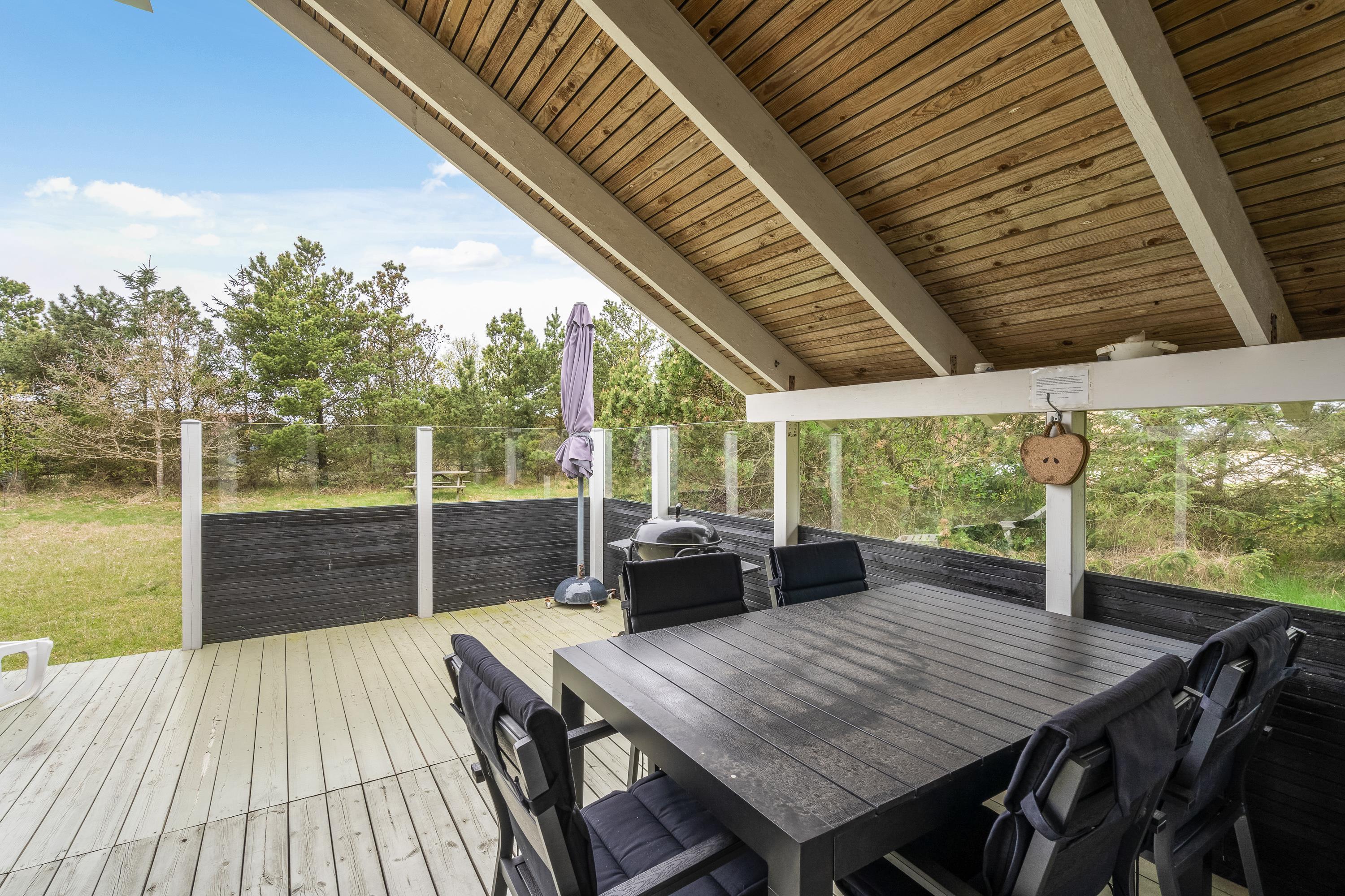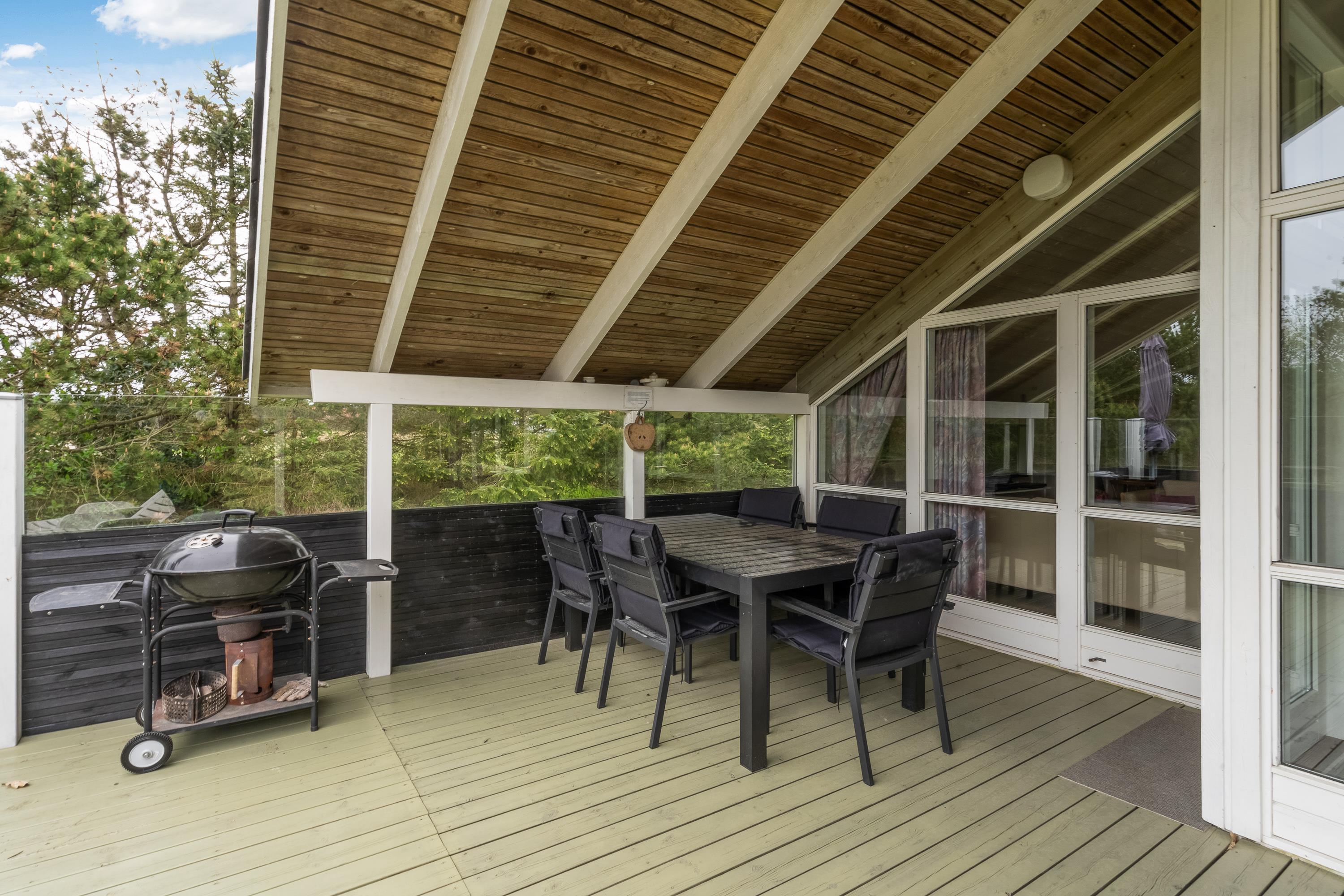 Mod syd har sommerhuset en dejlig terrasse, der er delvist overdækket. På terrassen kan I finde havemøblerne og liggestolene frem, så I rigtig kan slappe af i solen. Om aftenen står grillen klar, så I kan få jer en god middag med lækre bøffer.