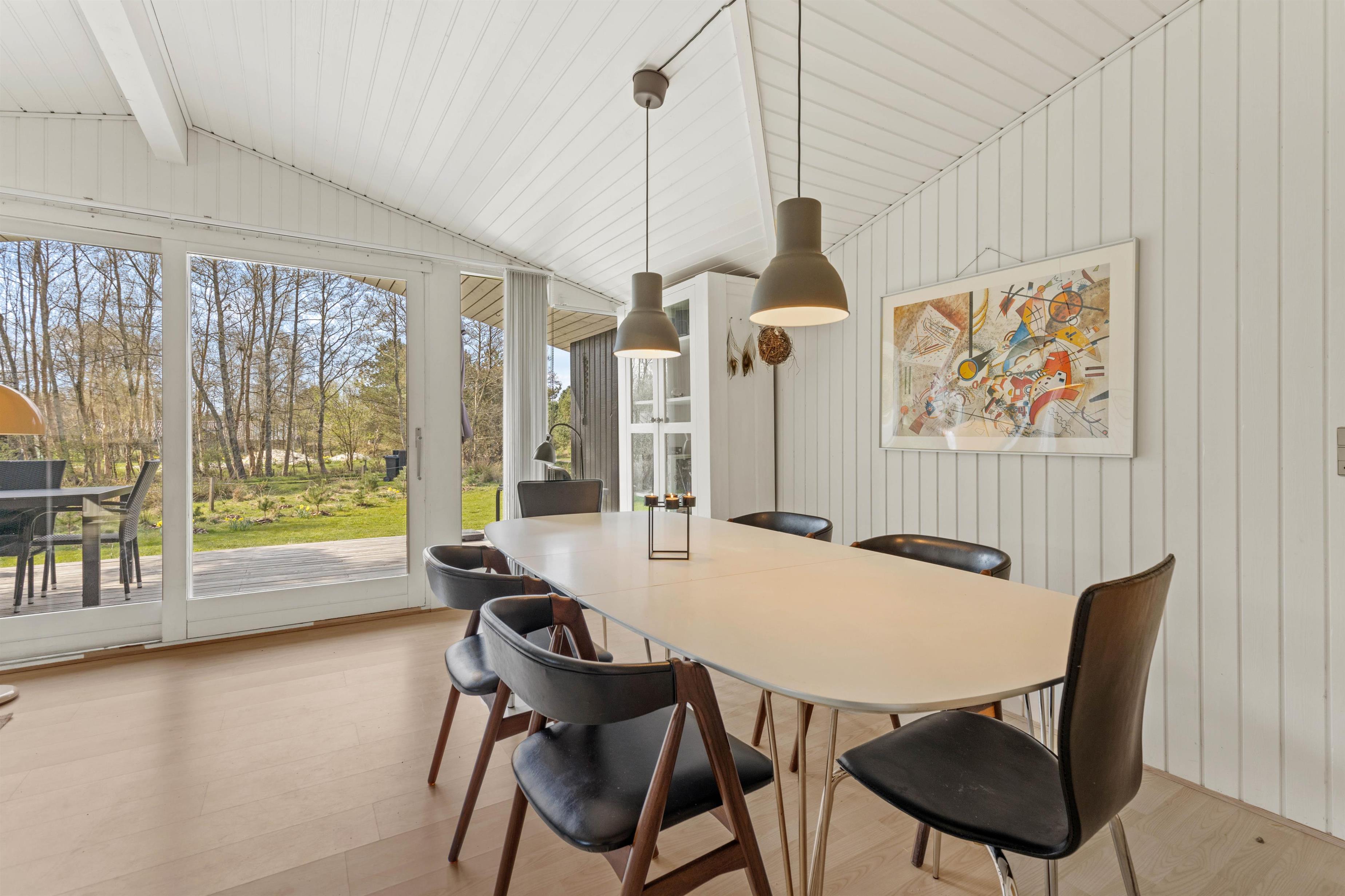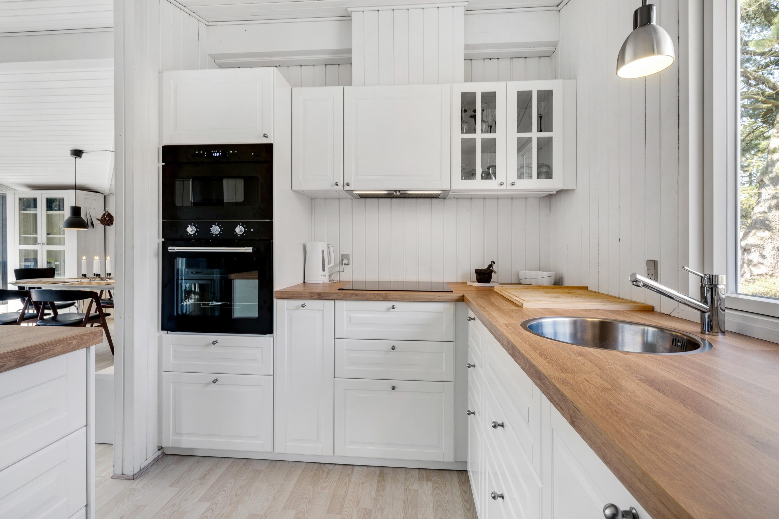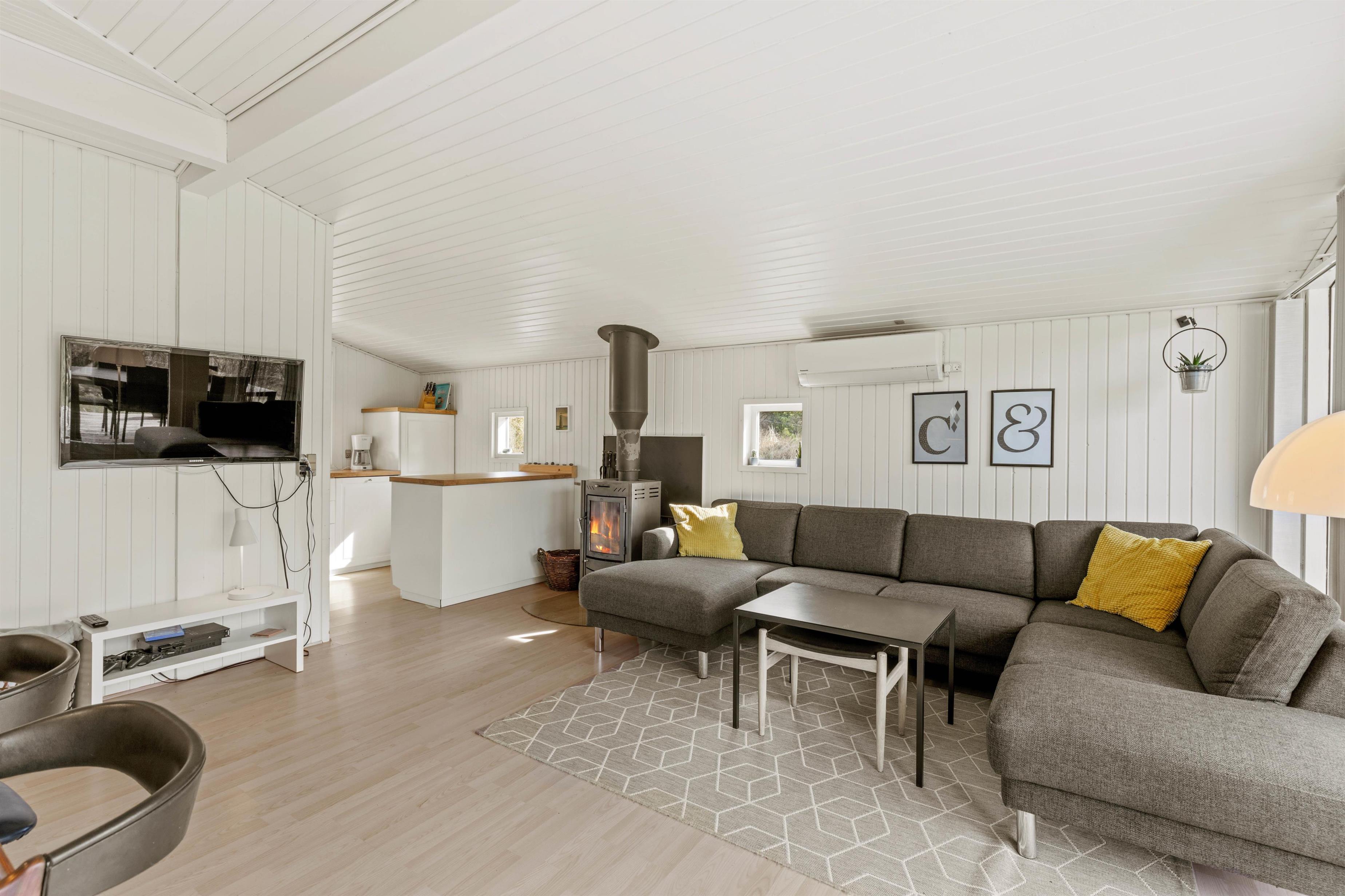 Sommerhuset er renoveret i 2020 og er indrettet lyst og venligt. Den store kombinerede køkken-, stue- og spiseafdeling er perfekt til socialt samvær. I kan lave mad samtidig med, at I holder øje med, om der bliver snydt i ”500” nede foran den gode brændeovn.
