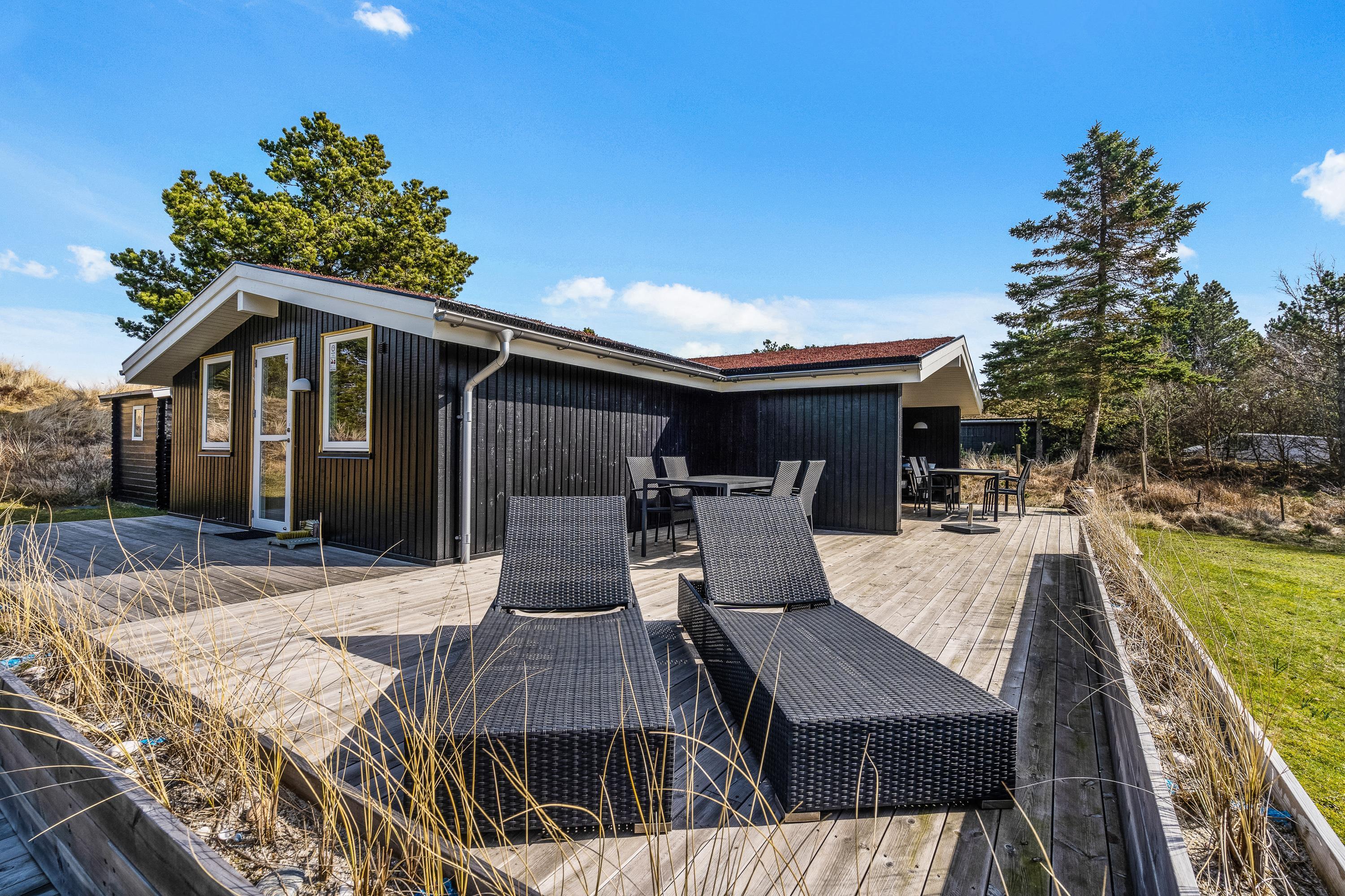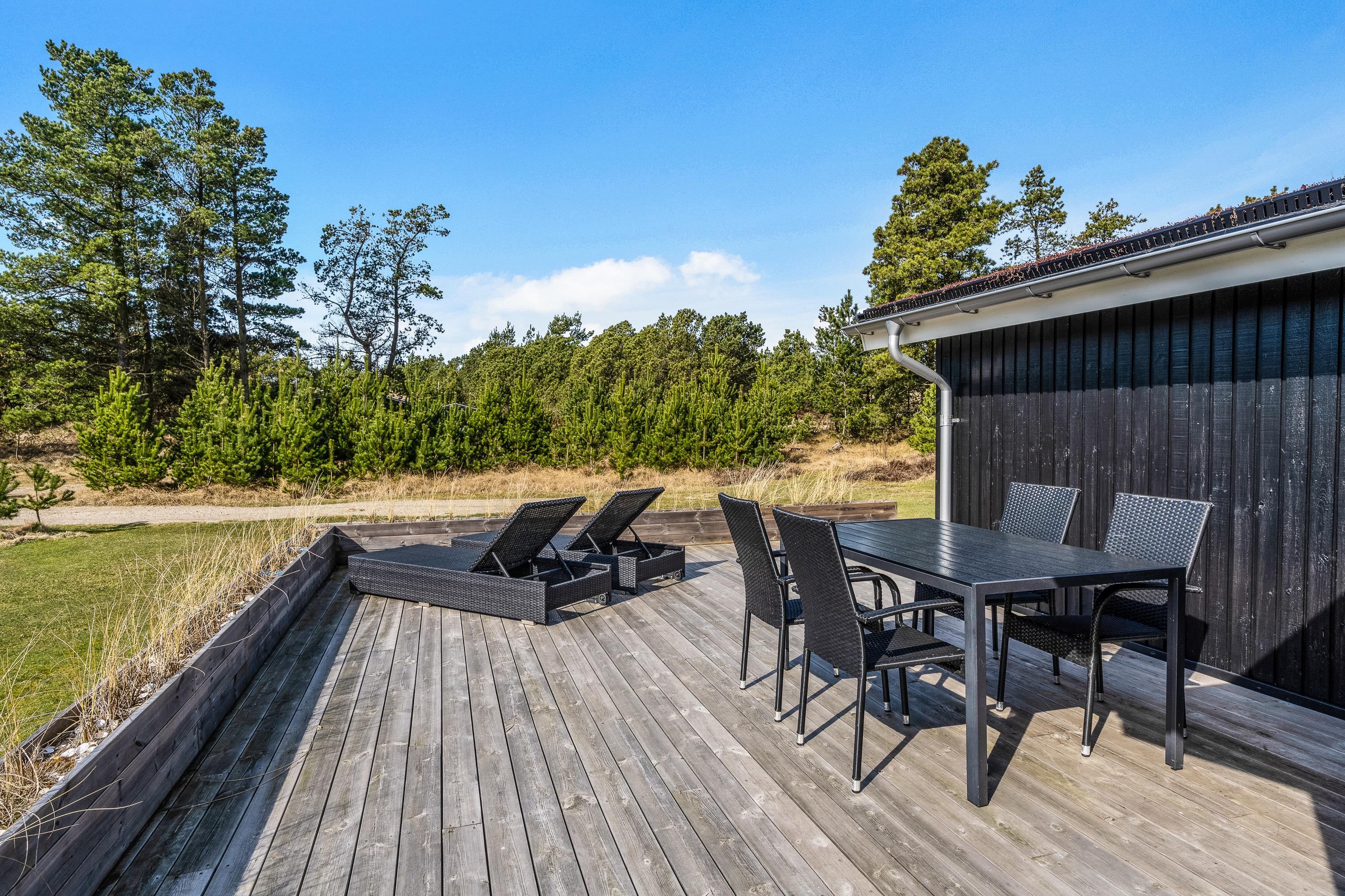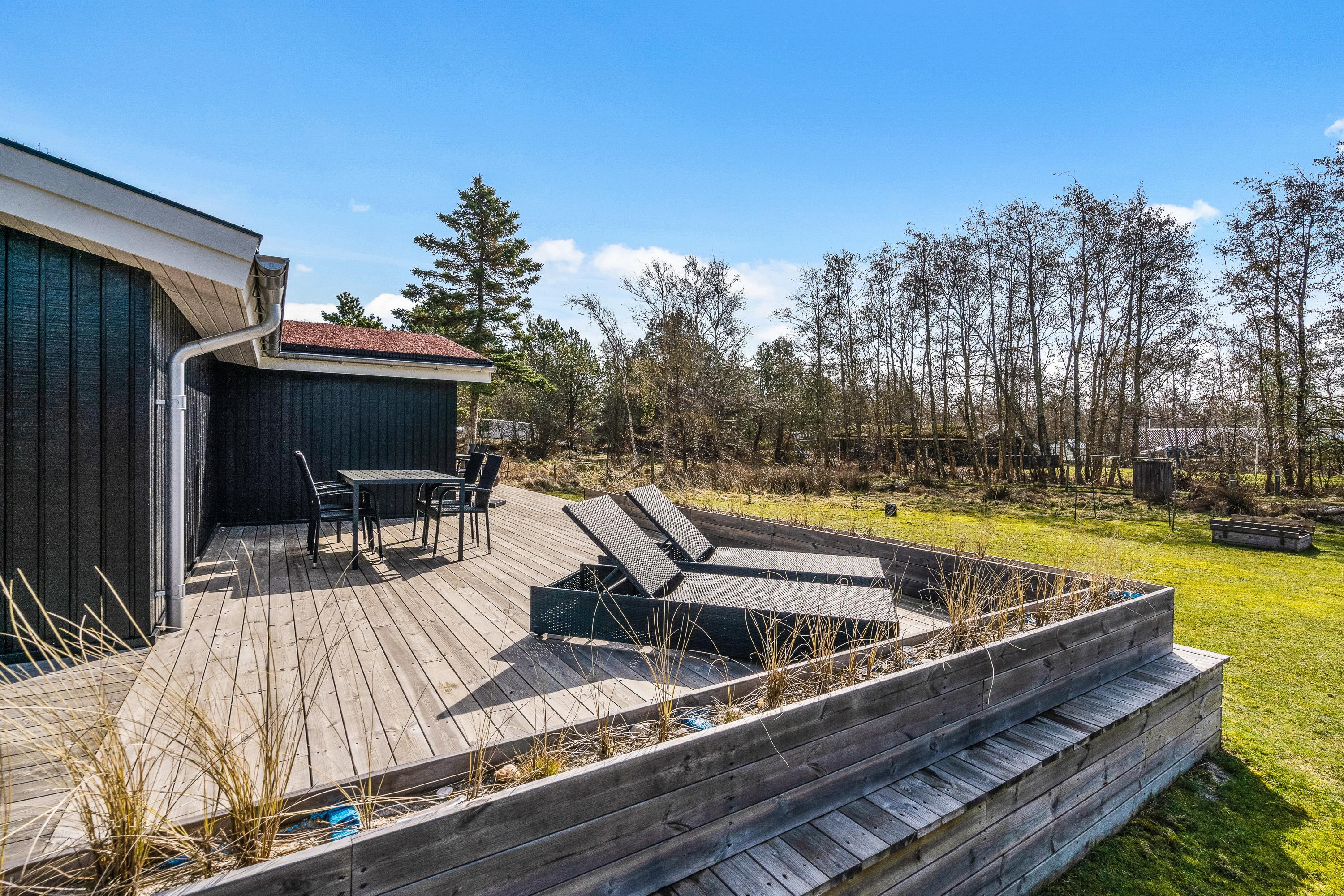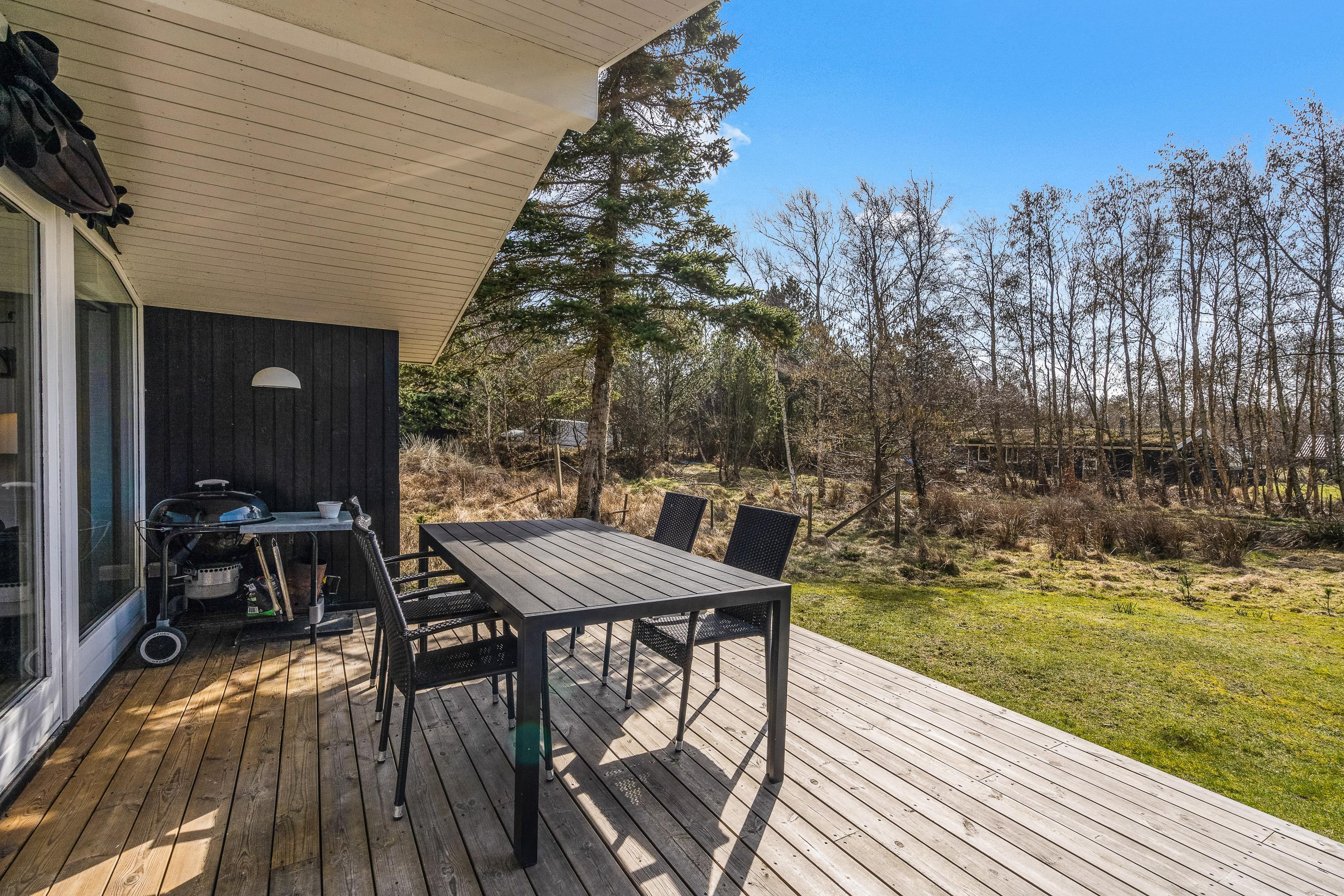 Når alle er udmattede efter en god feriedag i den friske luft, kan I slappe af på en liggestol på den skønne, solrige terrasse. Den vender mod sydvest, så I kan finde en solstråle det meste af dagen. På en ferie i det vestjyske er en solnedgang på terrassen et ”must” – solnedgangen kunne jo nydes med et godt glas rosé i anledningen af ferien, og hvem ved - måske kigger noget af det lokale vildt forbi.