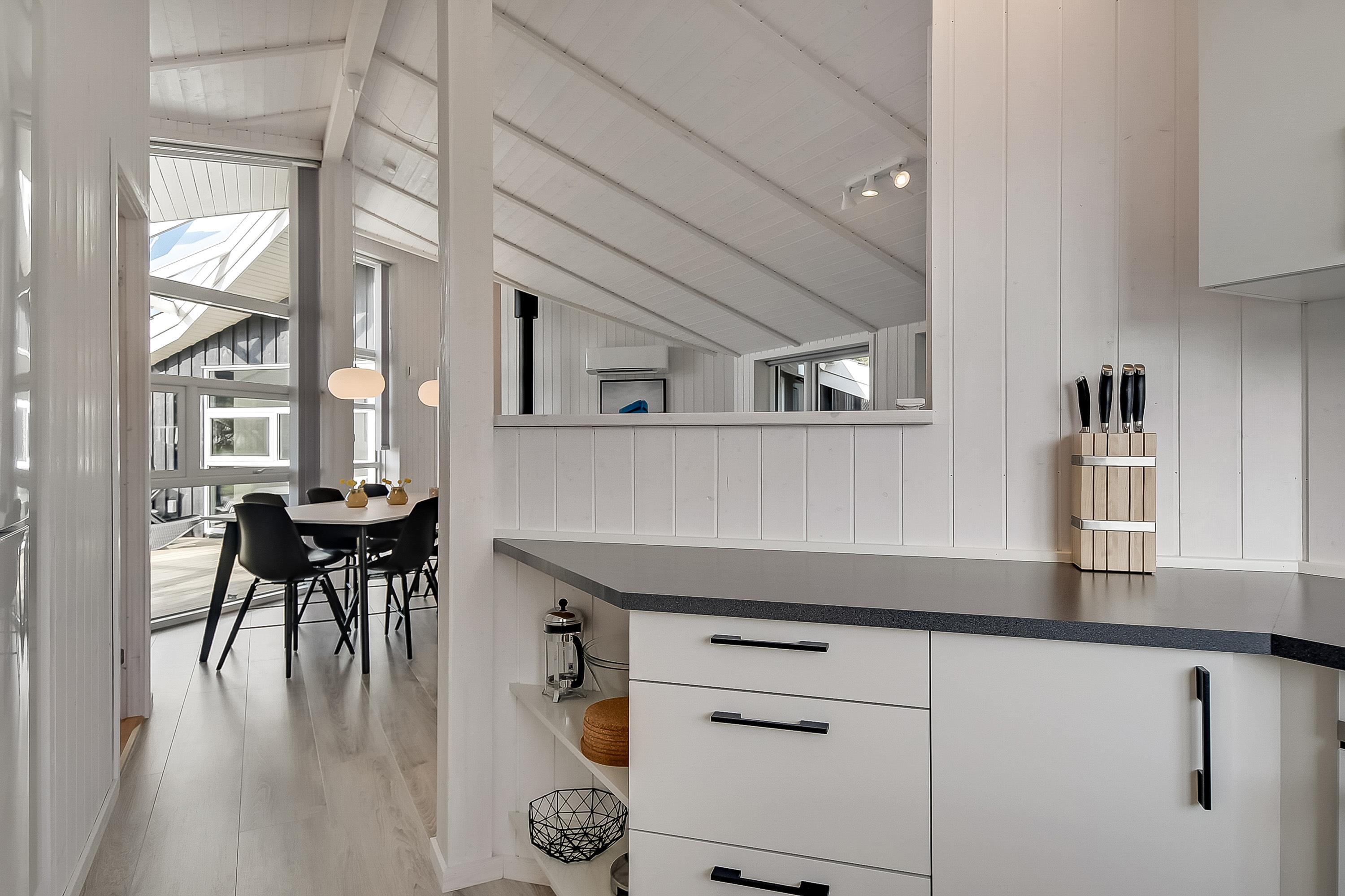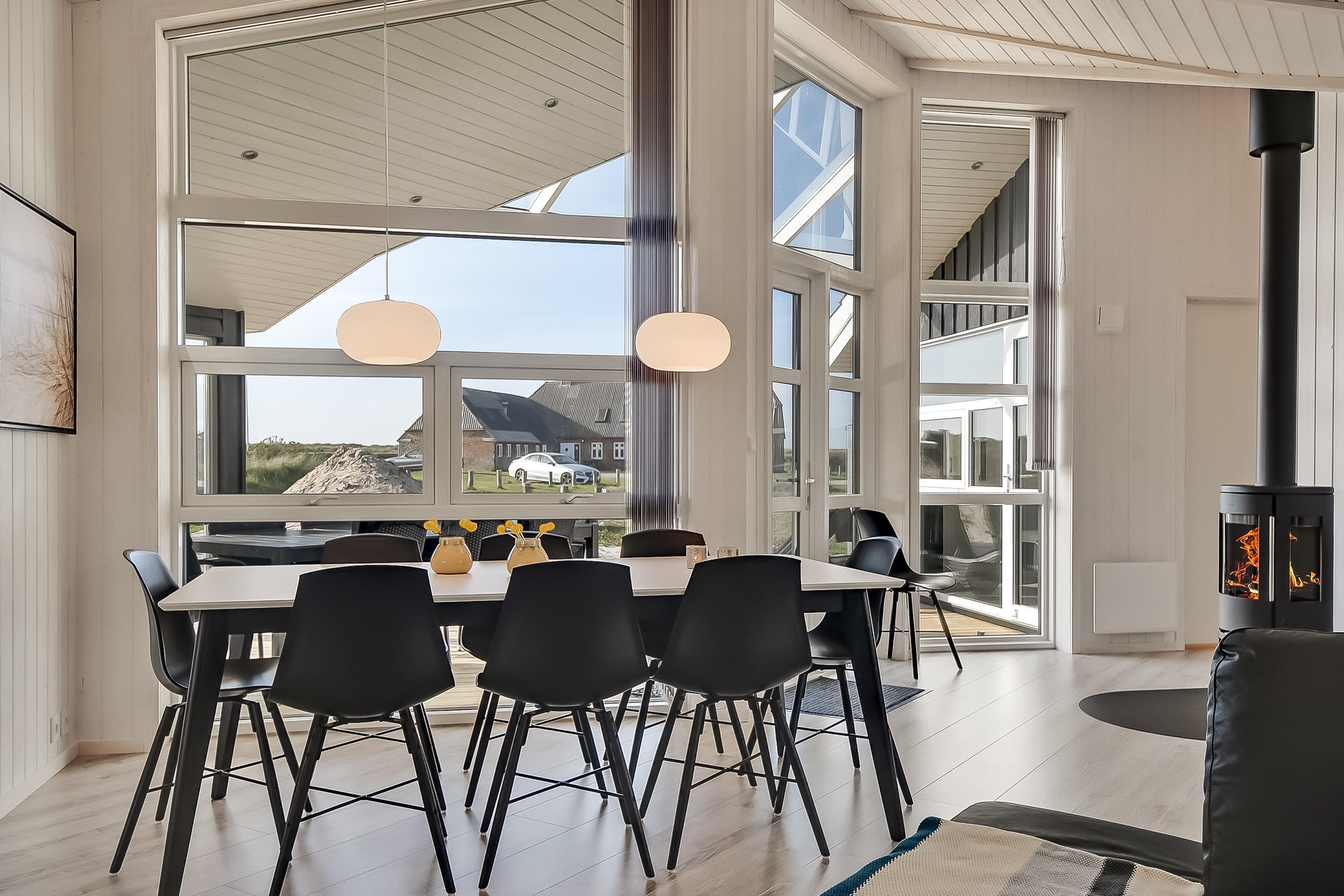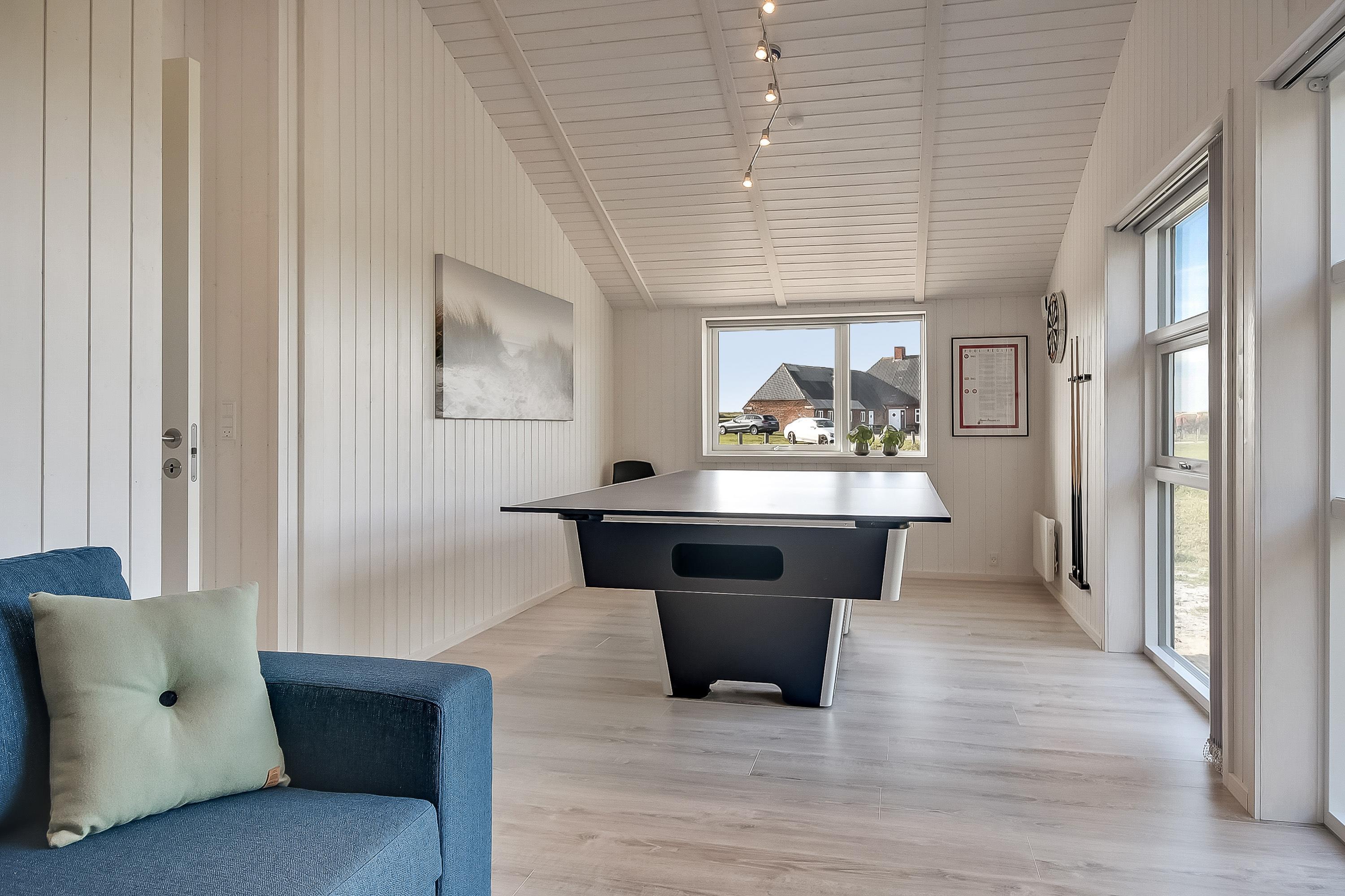 I det moderne køkken kan I nemt trylle lækre feriemåltider, som kan nydes ved det store spisebord. For ekstra hyggestemning sørger den uundværlige brændeovn. Der er masser af plads til leg og hygge i det store aktivitetsrum, og med 2 fladskærm-fjernsyn er familiefreden sikret. Når vinden suser udenfor og havet viser tænder, så er det tid til rigtigt at forkæle sig selv inden døre. Tænd op i husets spa og den store sauna og nyd jeres helt private wellness-oase.