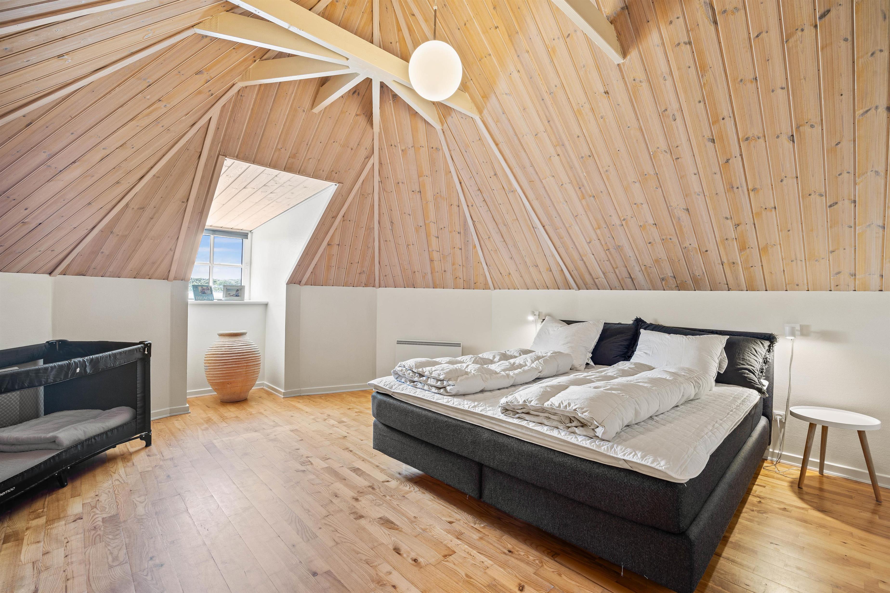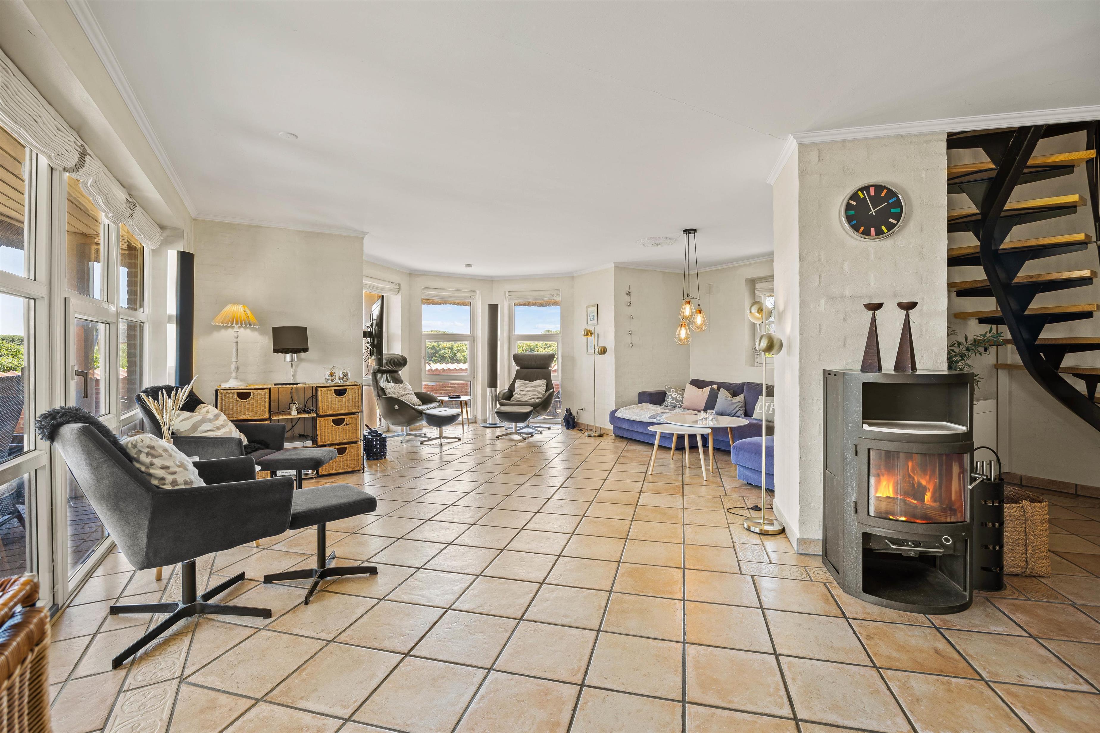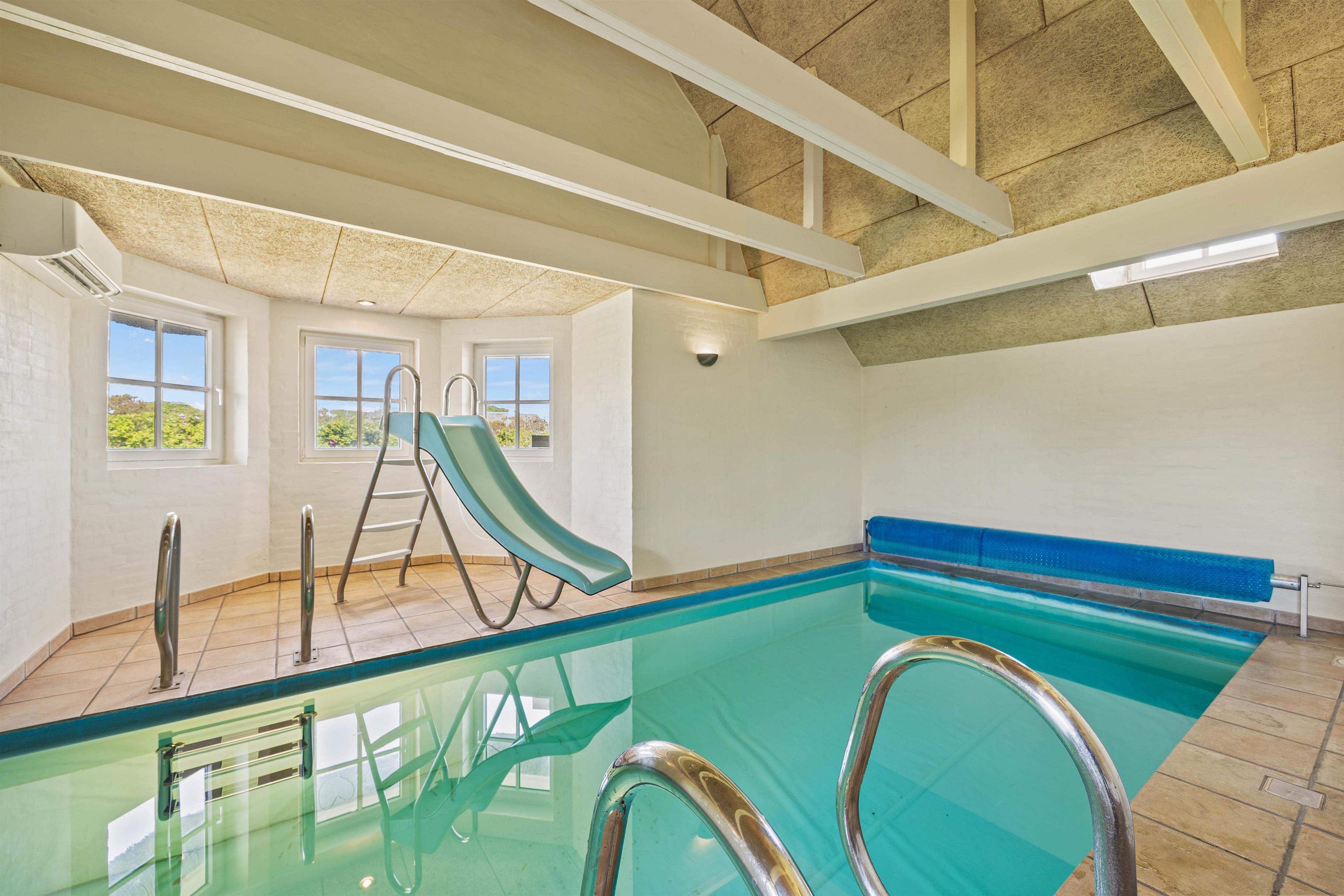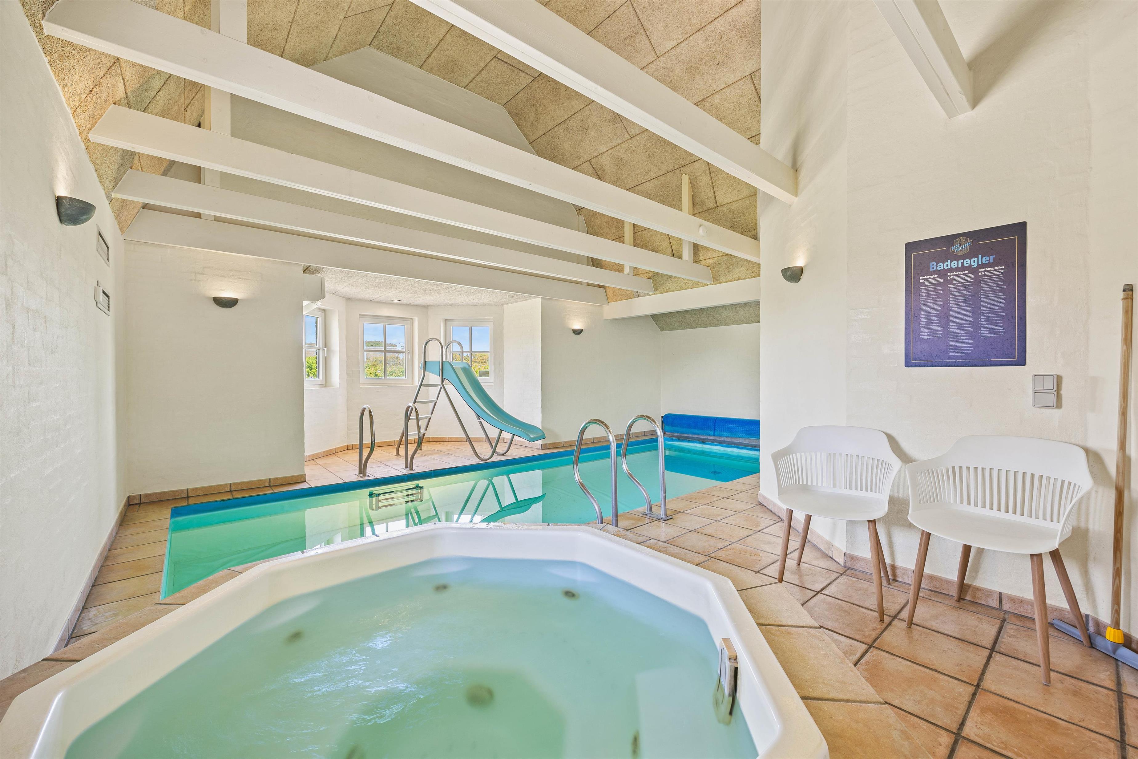 Højdepunkterne i sommerhuset er det åbne alrum, der forener stue og køkken, eller poolafdelingen. Alrummet er hyggeligt og venligt indrettet - her er plads til hele flokken og en hyggelig brændeovn er prikken over iét. Her er der plads til fællesskabet, afslapning, fælles madlavning og hyggelige spilleaftner. I poolrummet står den både på leg og afslapning med spa og sauna. I den lange pool er I, uanset vejret, sikret mange gode stunder med alverdens lege og vandplaskeri!