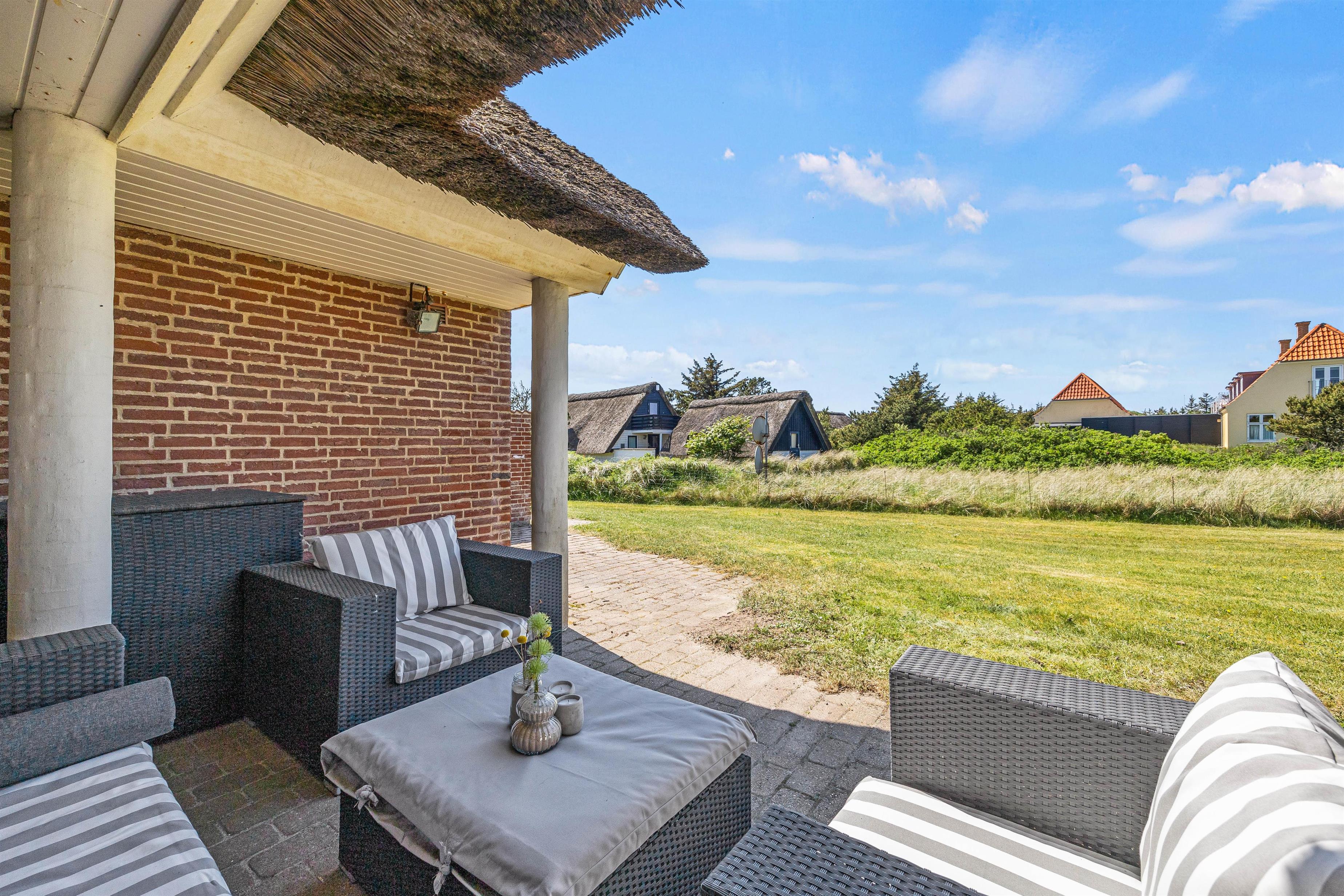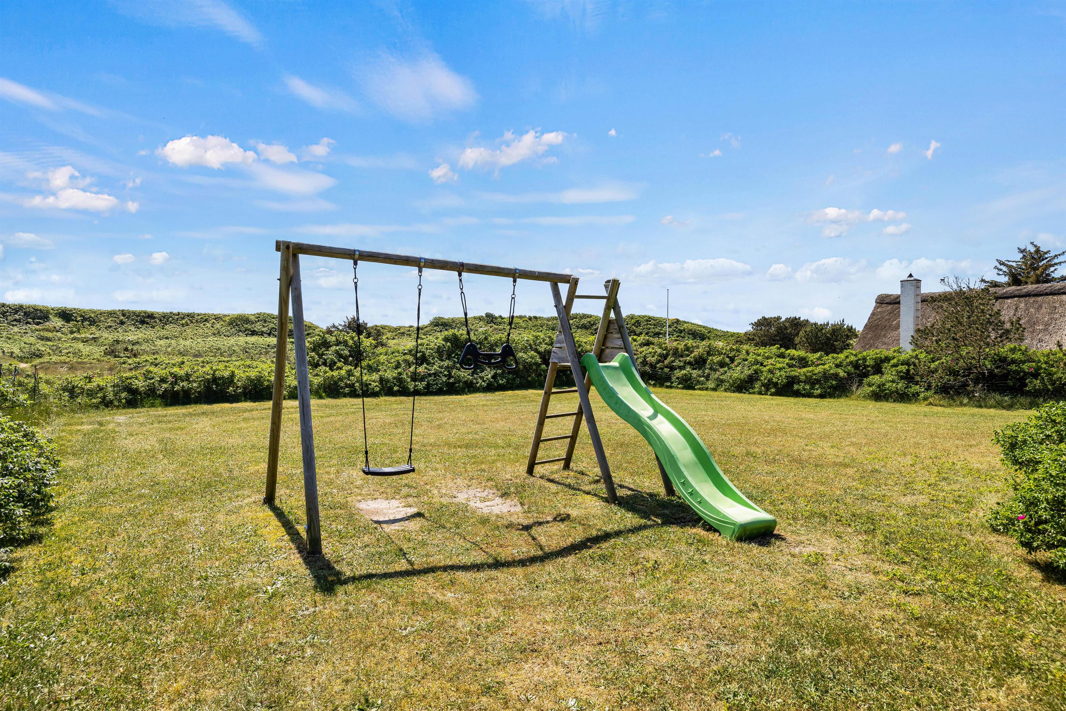 Udover de fine faciliteter indendørs er her også meget at byde på udenfor. Sommerhuset på Fyrvej 77B er beliggende på en stor naturgrund kun 100 meter fra det brusende Vesterhav. På grunden er god plads til udfoldelse, leg og boldspil - til de mindste er her også en gynge.