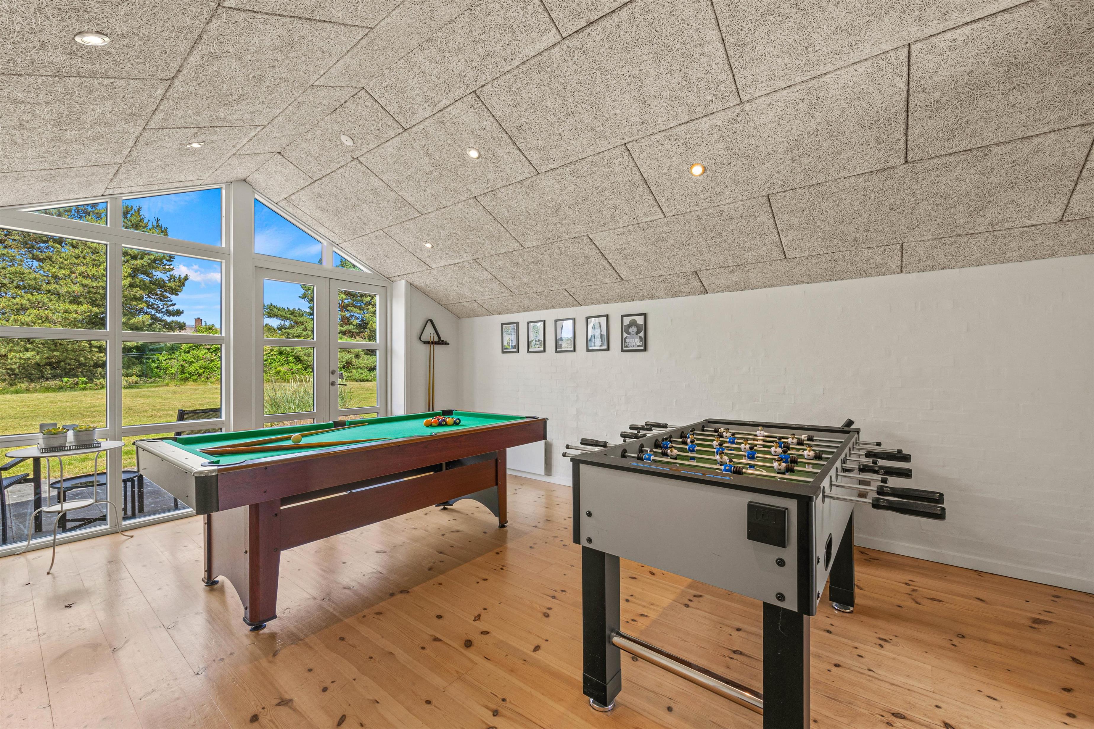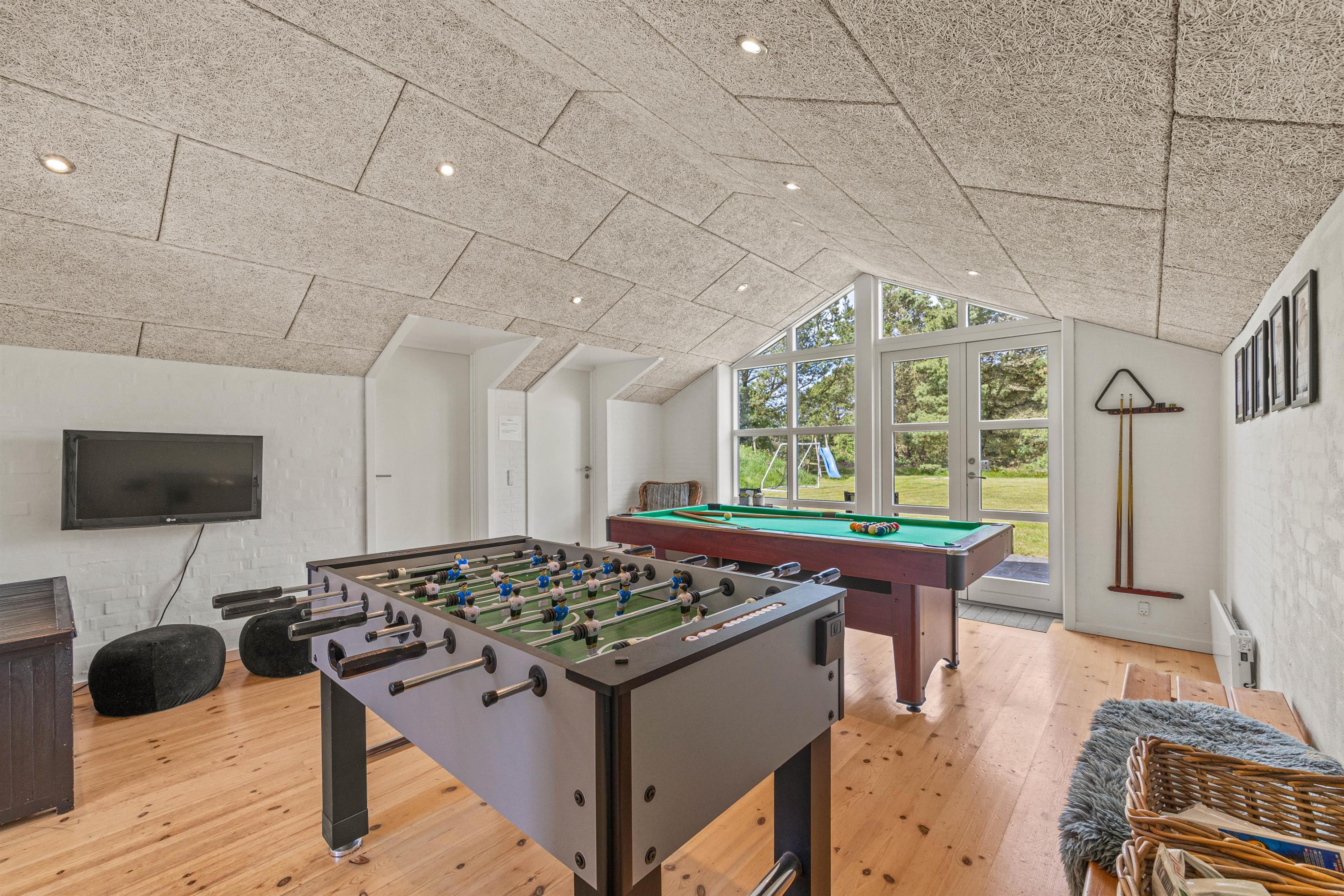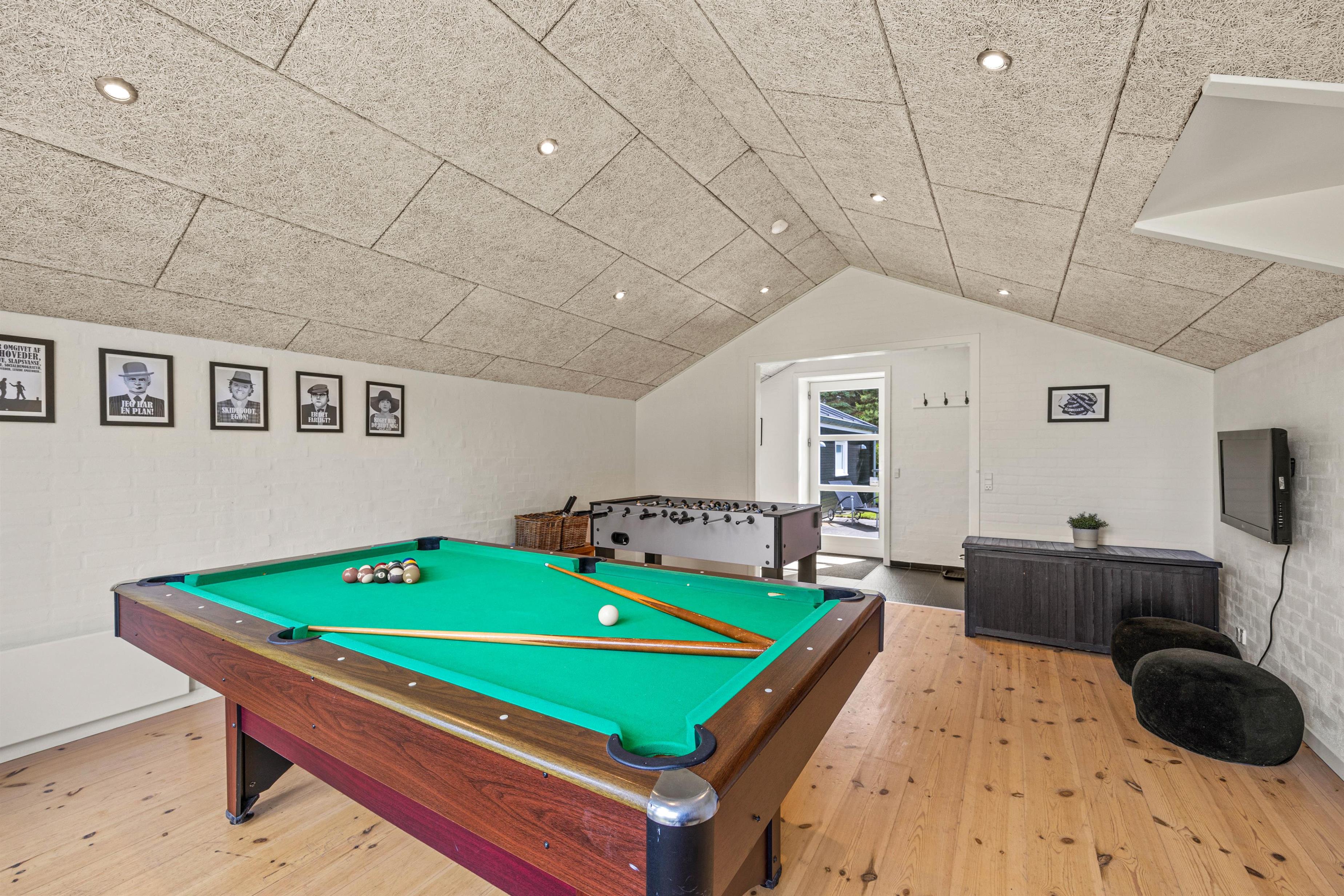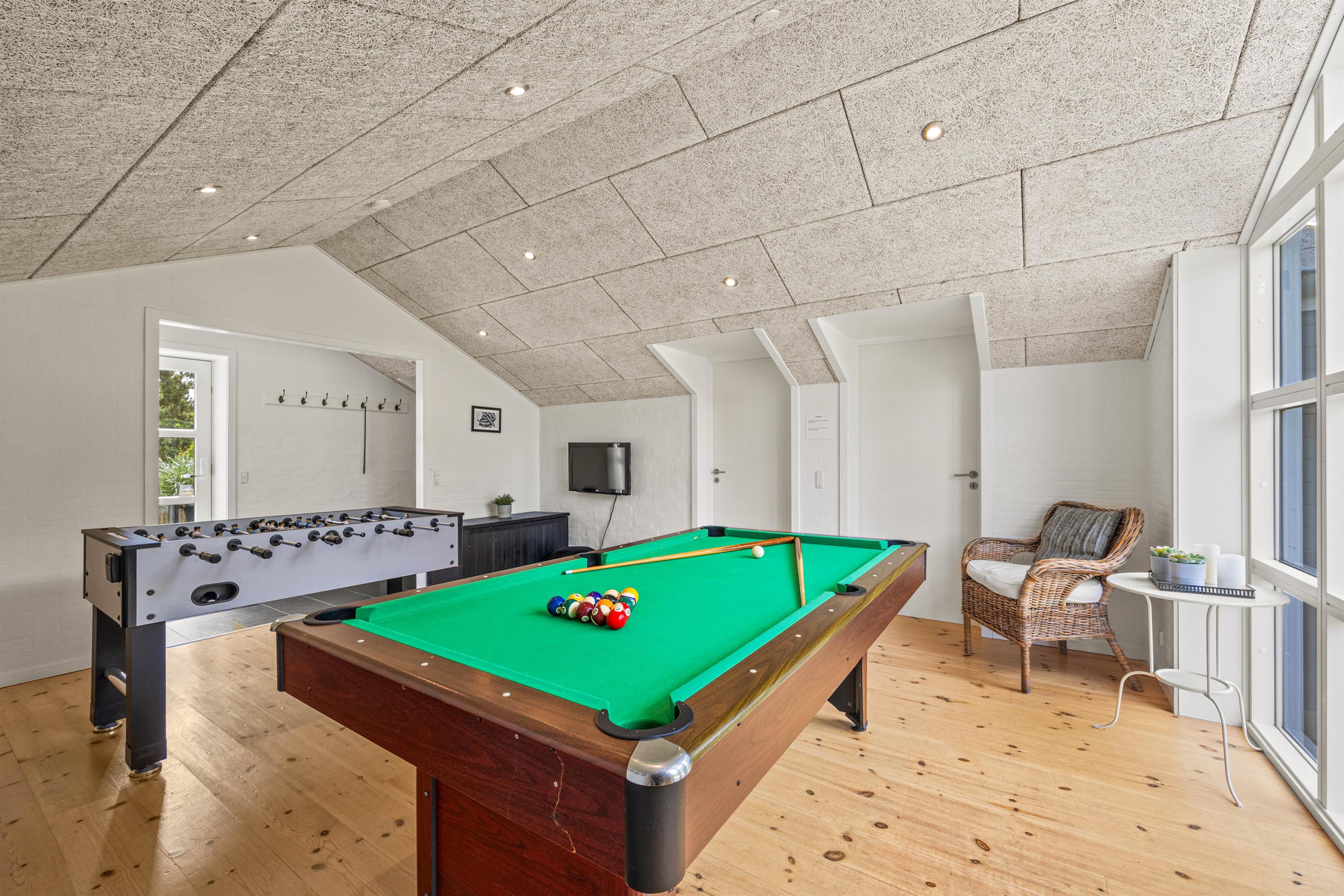Det rummelige køkken er udstyret med alt, hvad du behøver for at tilberede lækre måltider sammen, og også en opvaskemaskine, vaskemaskine og tørretumbler er tilgængelige i huset, så du kan lade maskinerne gøre arbejdet med vask af service og tøj. Den hyggelige opholdsstue byder på afslappede aftener foran brændeovnen, mens aktivitetsrummet inviterer til en omgang billard.