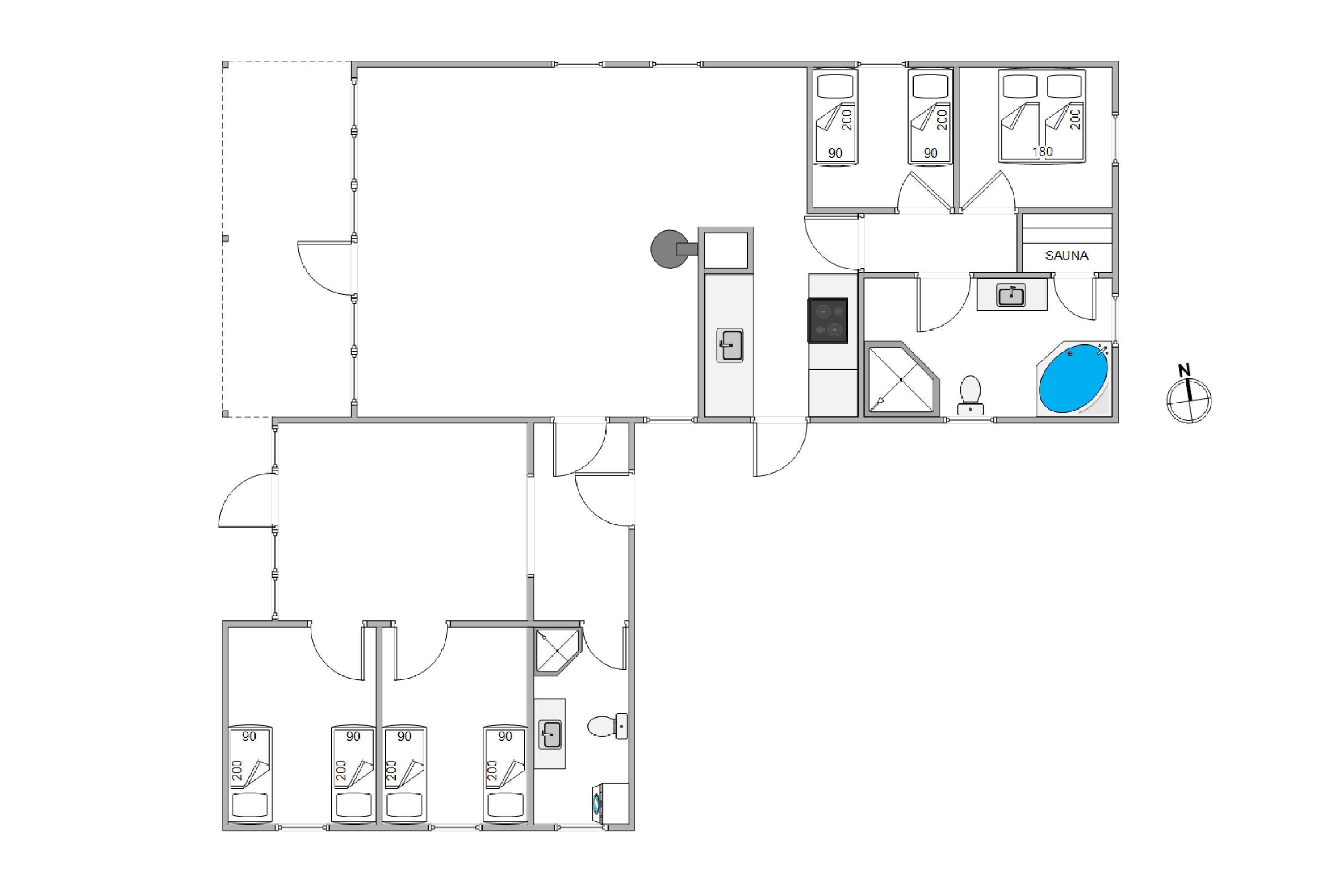 Med plads til op til 8 personer har dette sommerhus 4 rummelige soveværelser, hvoraf et er med 1 dobbeltseng og de øvrige 3 med i alt 6 enkeltsenge. Også 2 store badeværelser med gulvvarme står til jeres rådighed, og efter en lang dag ved stranden kan du slappe af i spaen eller saunaen og lade bekymringerne sive væk.